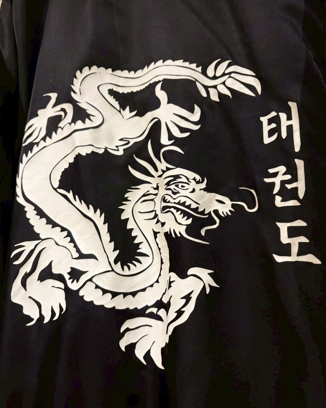 背面には韓国語で書かれた「テコンドー(태권도)」の文字と、力強い龍のグラフィックプリントを大胆に配置。フロント、バック共に重厚なデザインが映えています。