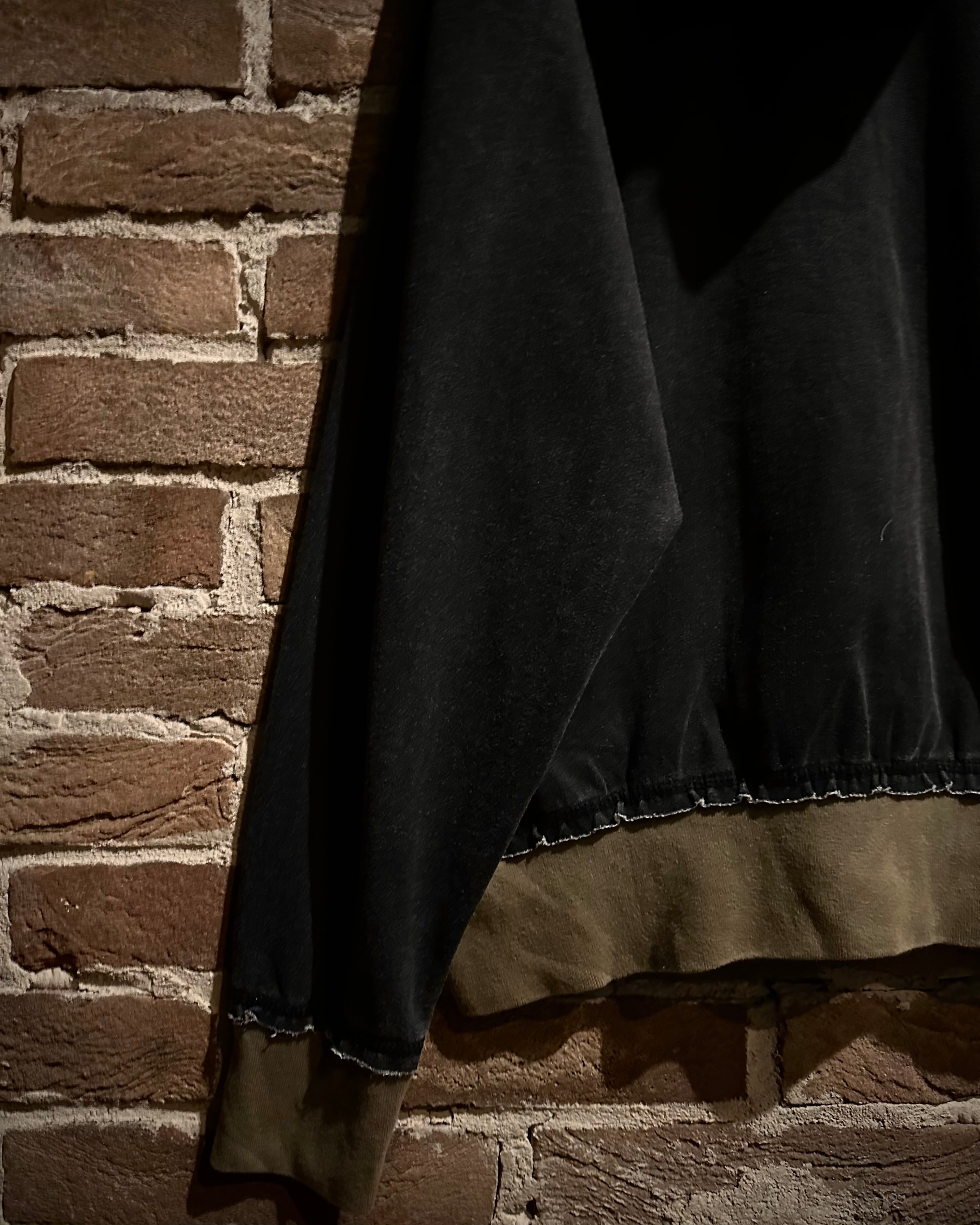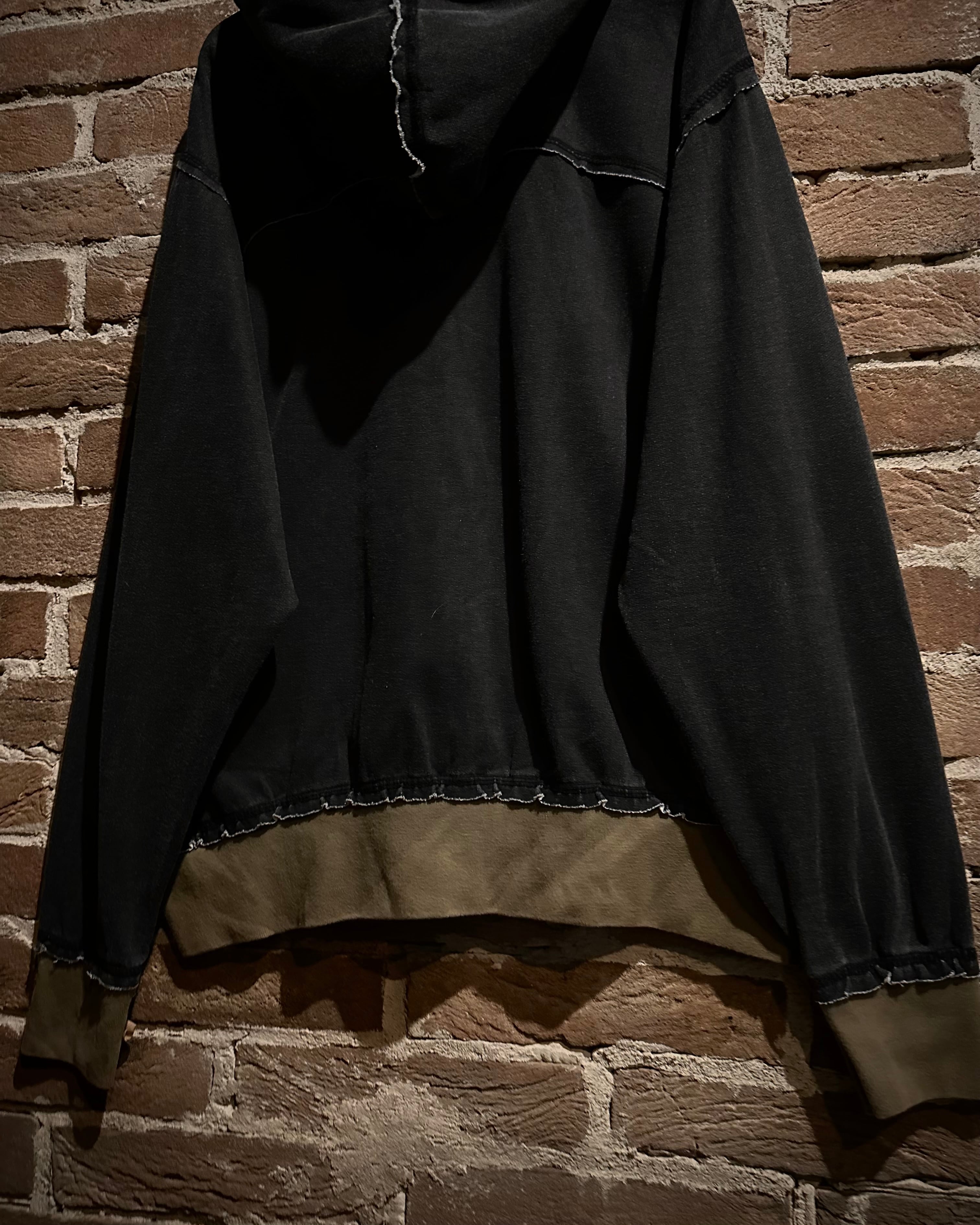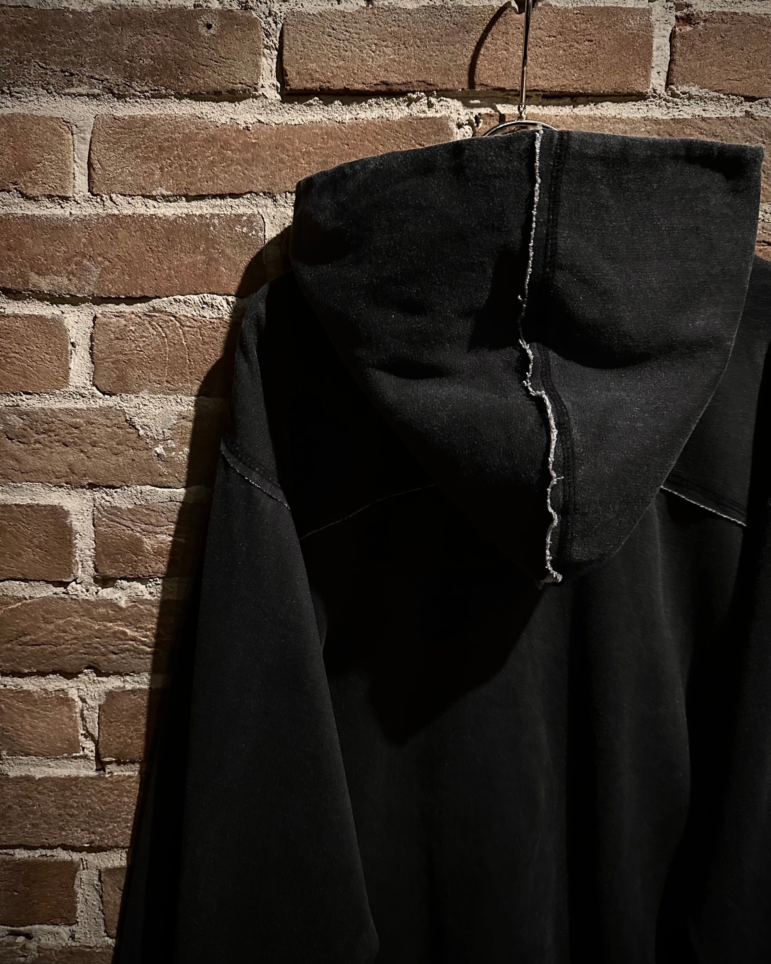 さらに最大のキーポイントは、随所に施されたインサイドアウトのディテール。フードのセンターシームや裾、袖口のほつれ感、そしてリブの切り替わりまでもがデザインの一部となり、独特のムードを醸しています。