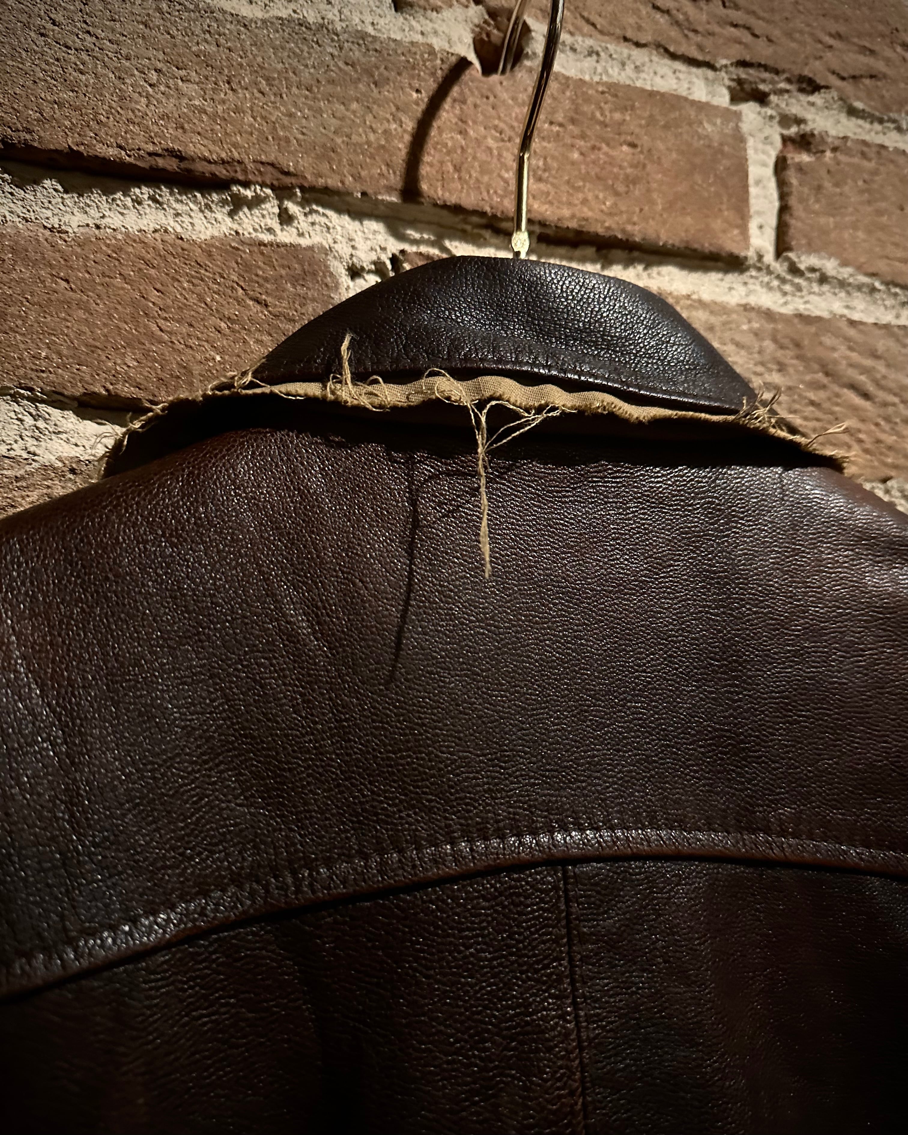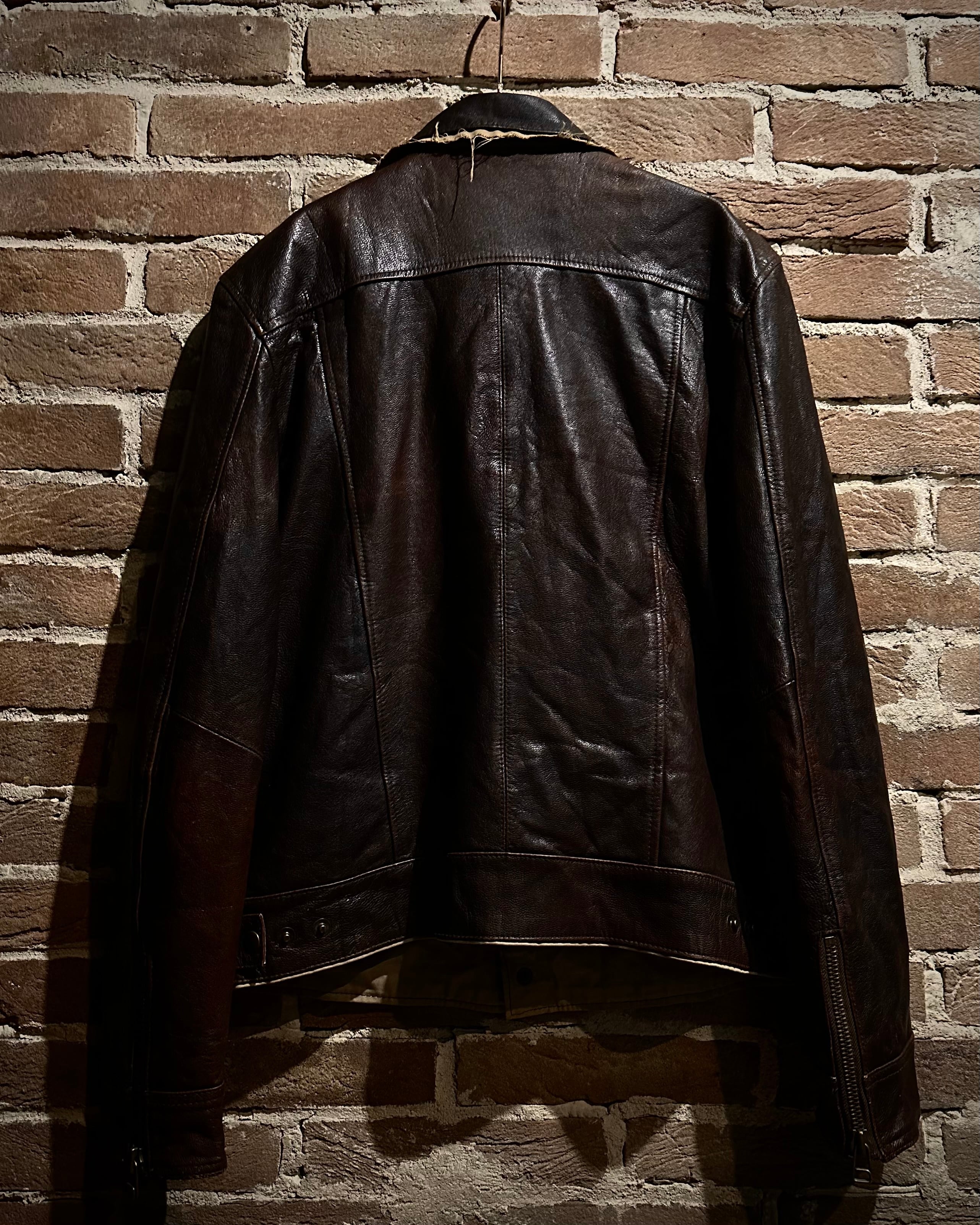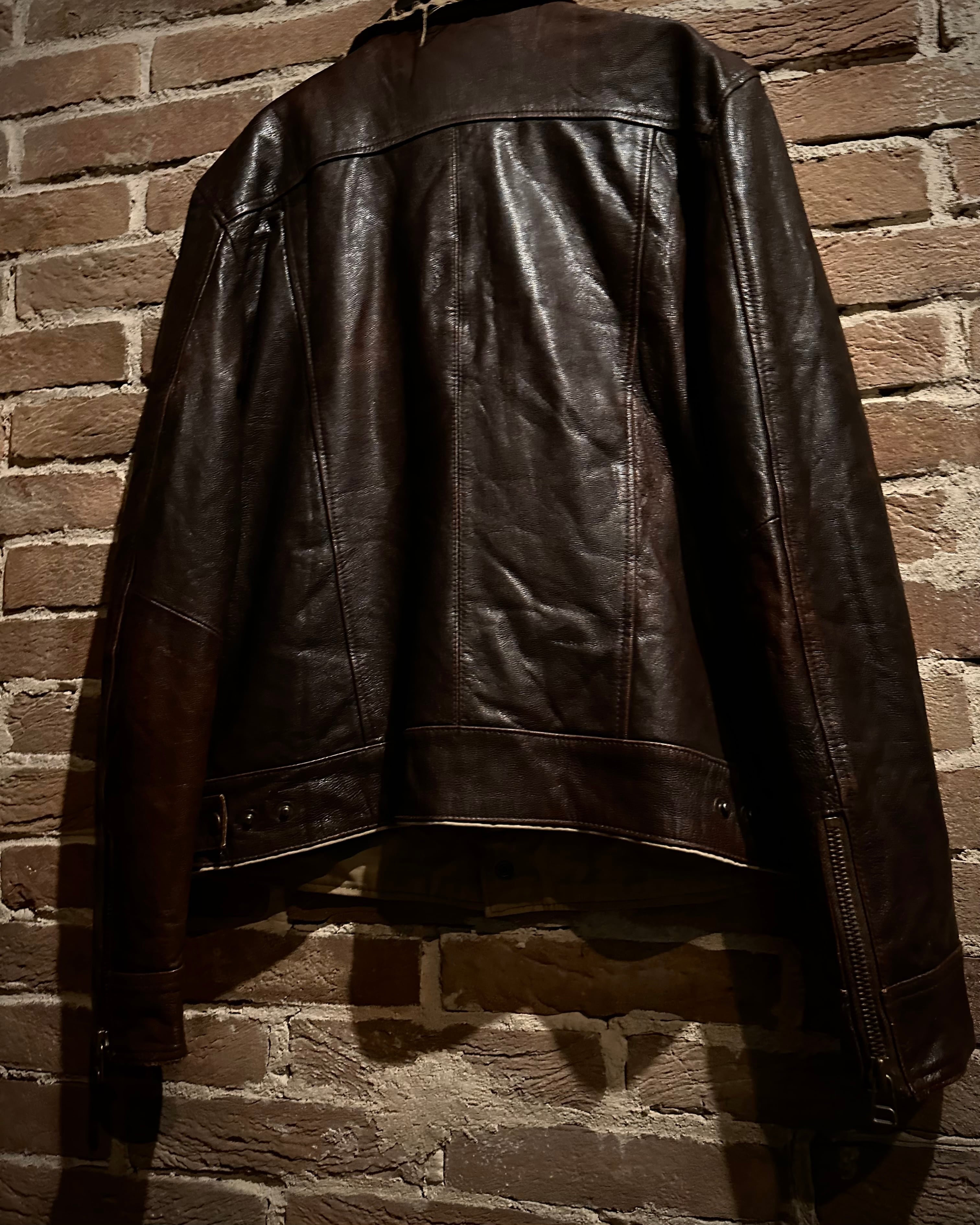 襟元、前立て、ポケットフラップの断ち切りデザインがエイジングと相まって唯一無二の雰囲気を形成。長年着込まれたことで生まれたシボの表情、レザーの陰影、ヤレ感。そのすべてがデザインよ一員として機能しています。