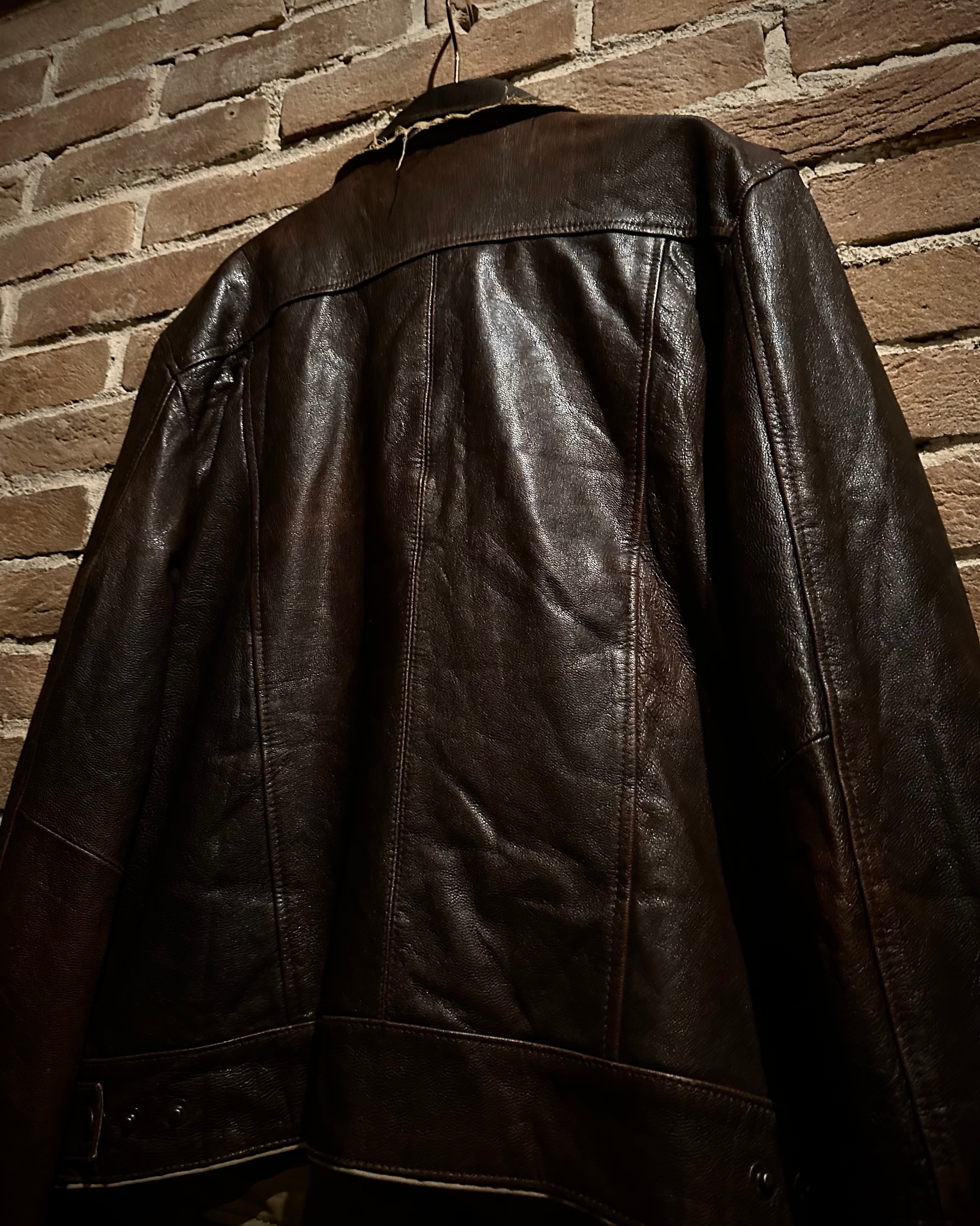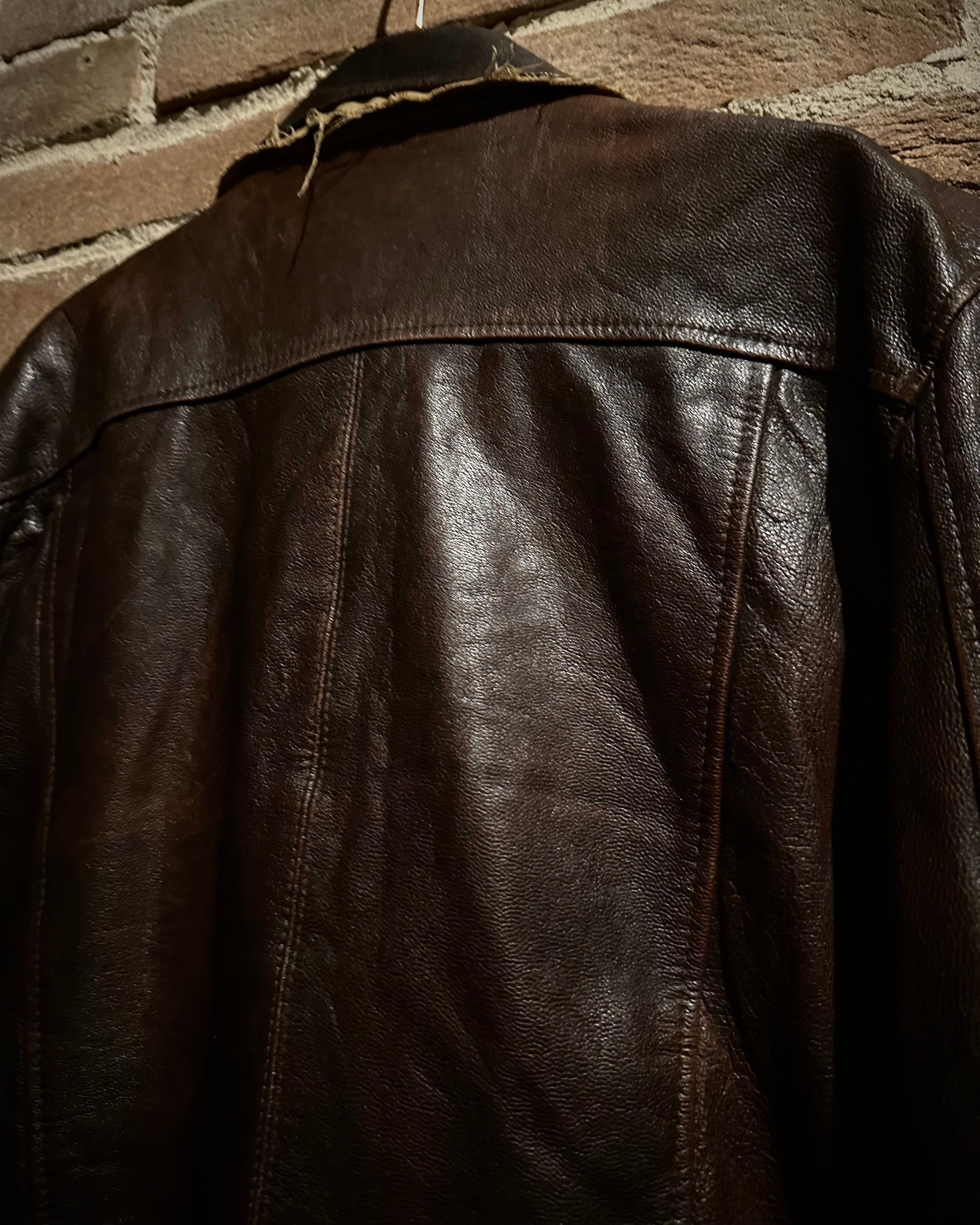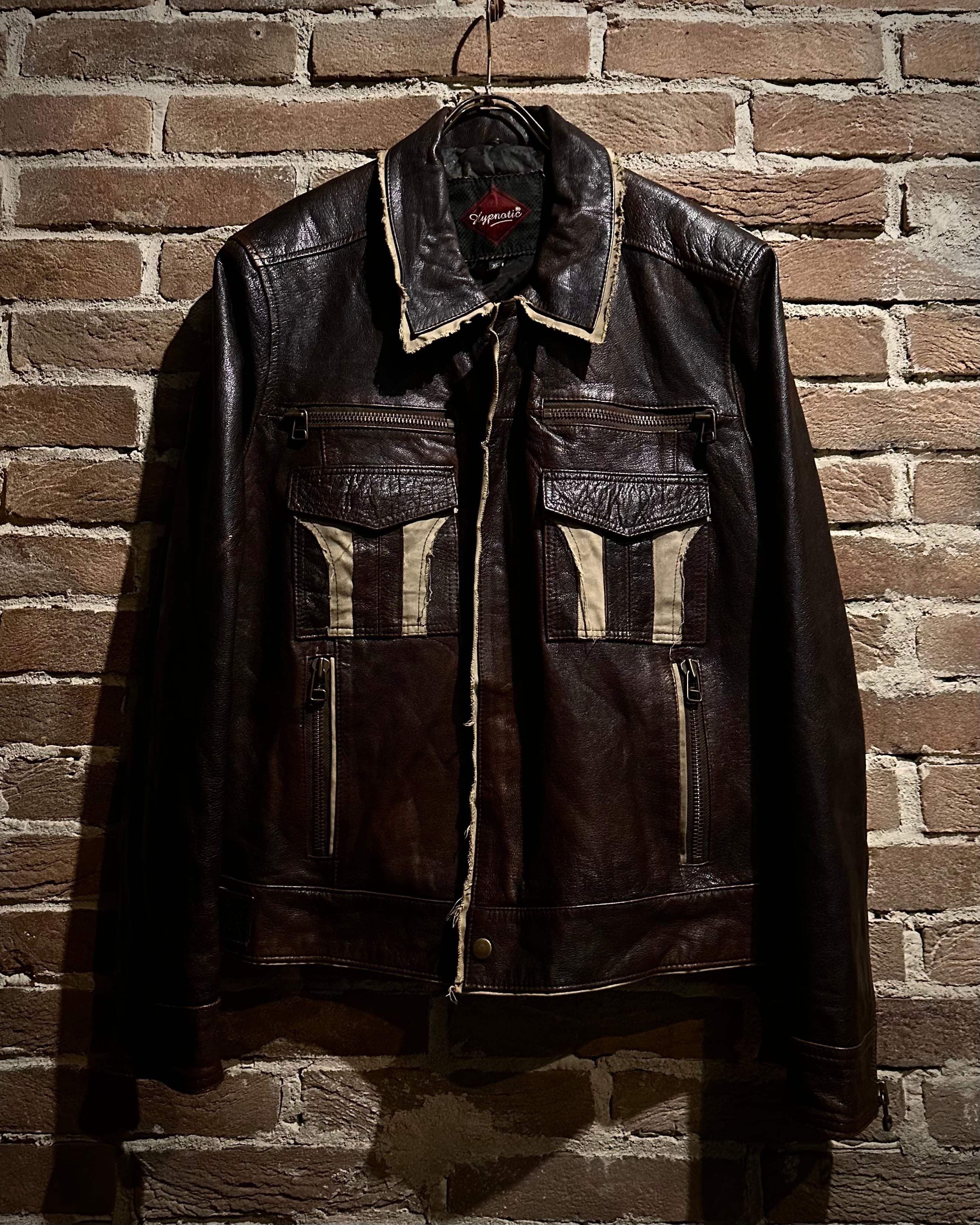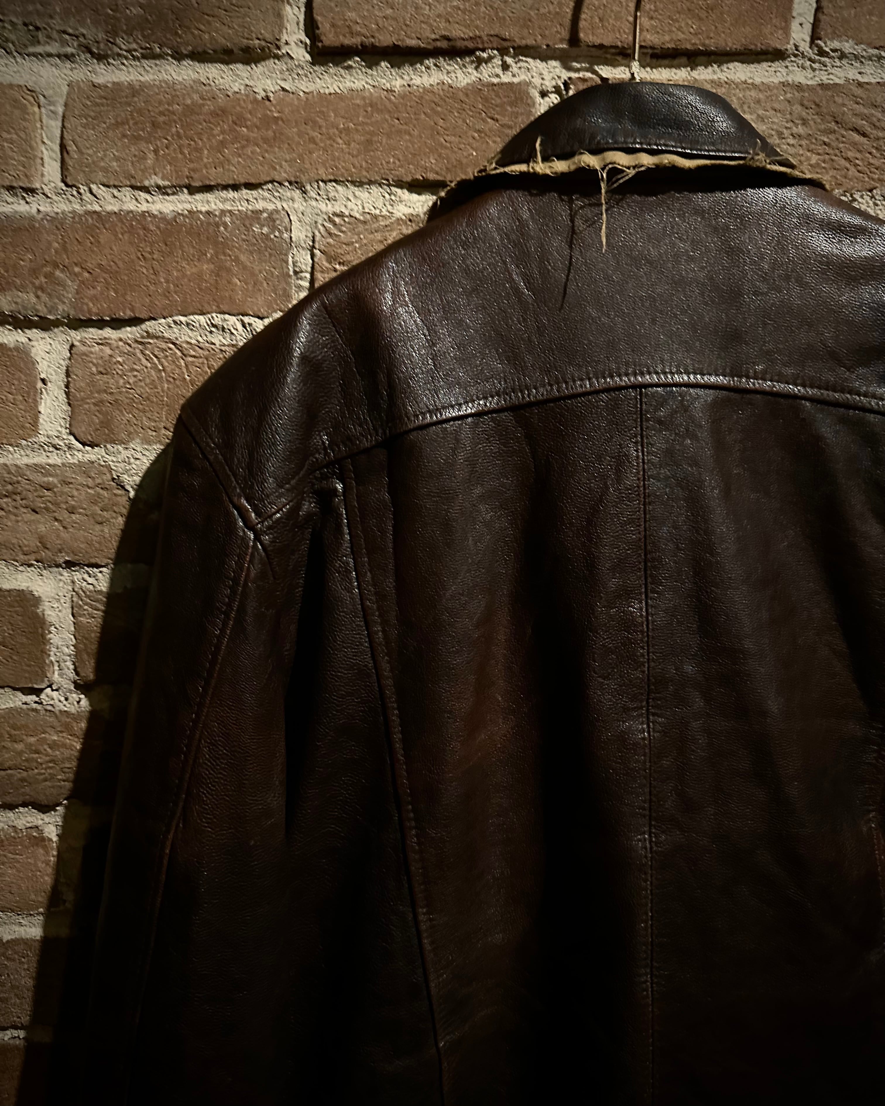 襟元、前立て、ポケットフラップの断ち切りデザインがエイジングと相まって唯一無二の雰囲気を形成。長年着込まれたことで生まれたシボの表情、レザーの陰影、ヤレ感。そのすべてがデザインよ一員として機能しています。