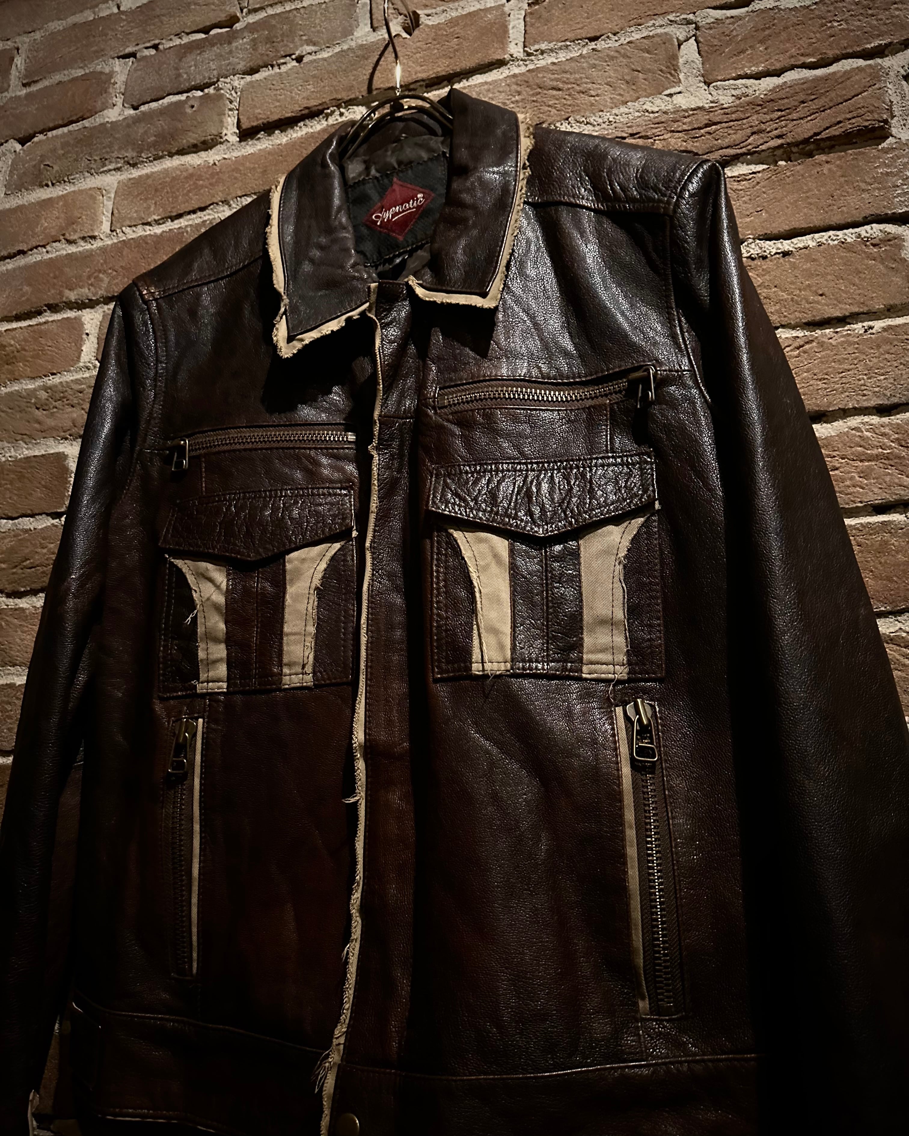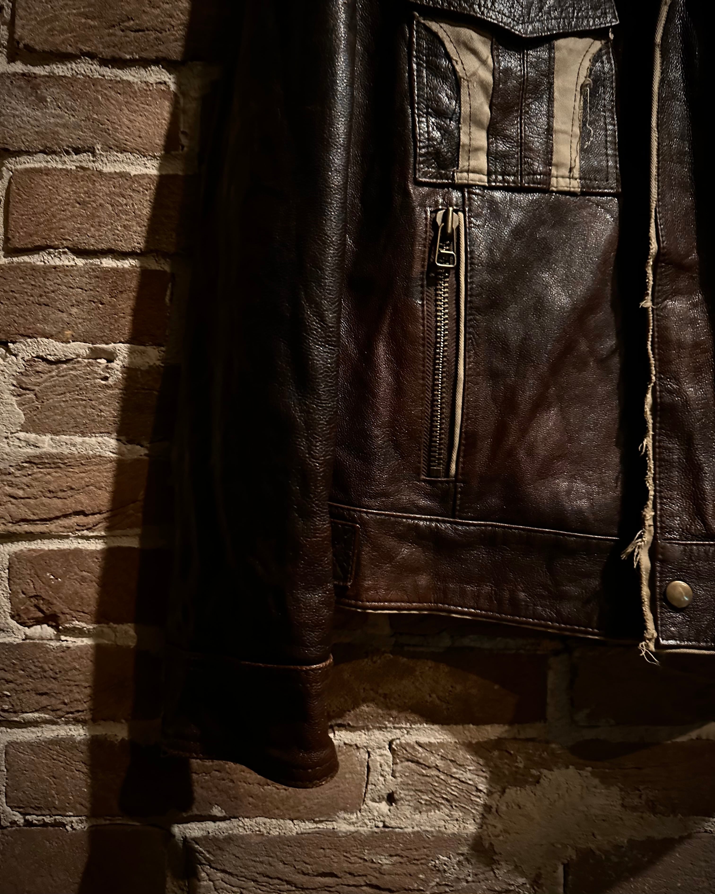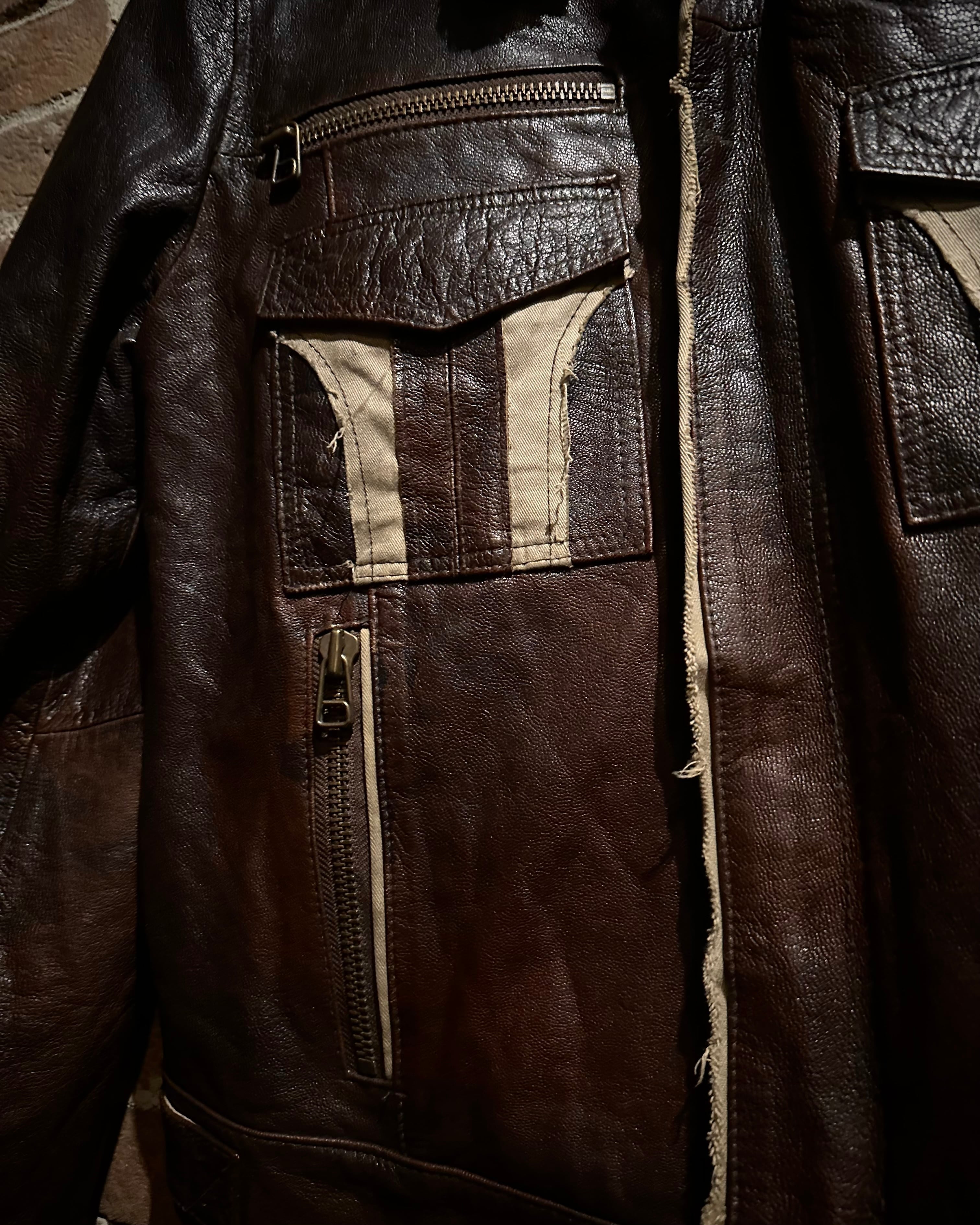 艶の残るダークブラウンレザーをベースに、フロントにはベージュの異素材パネルを切り替えたレザージャケット。