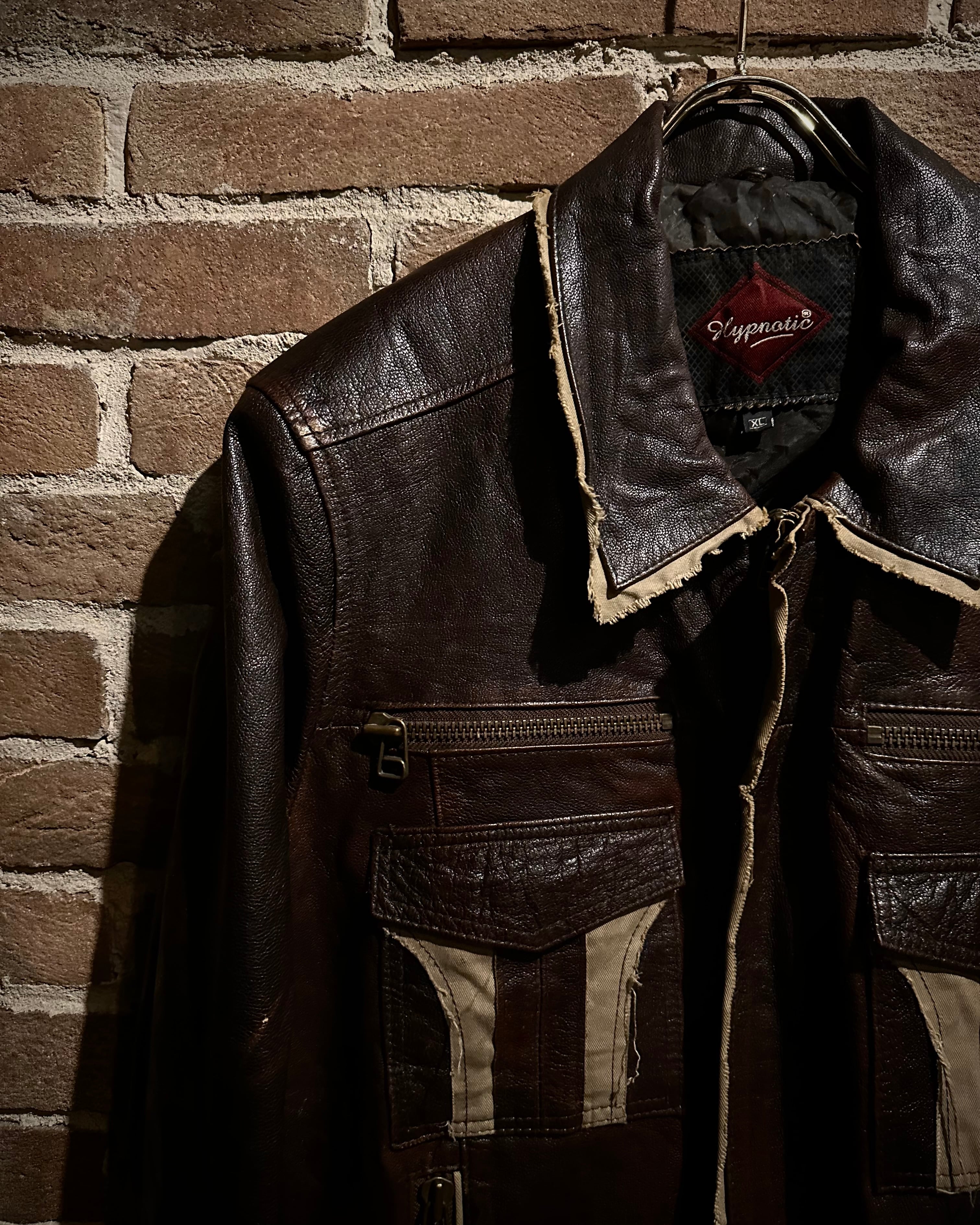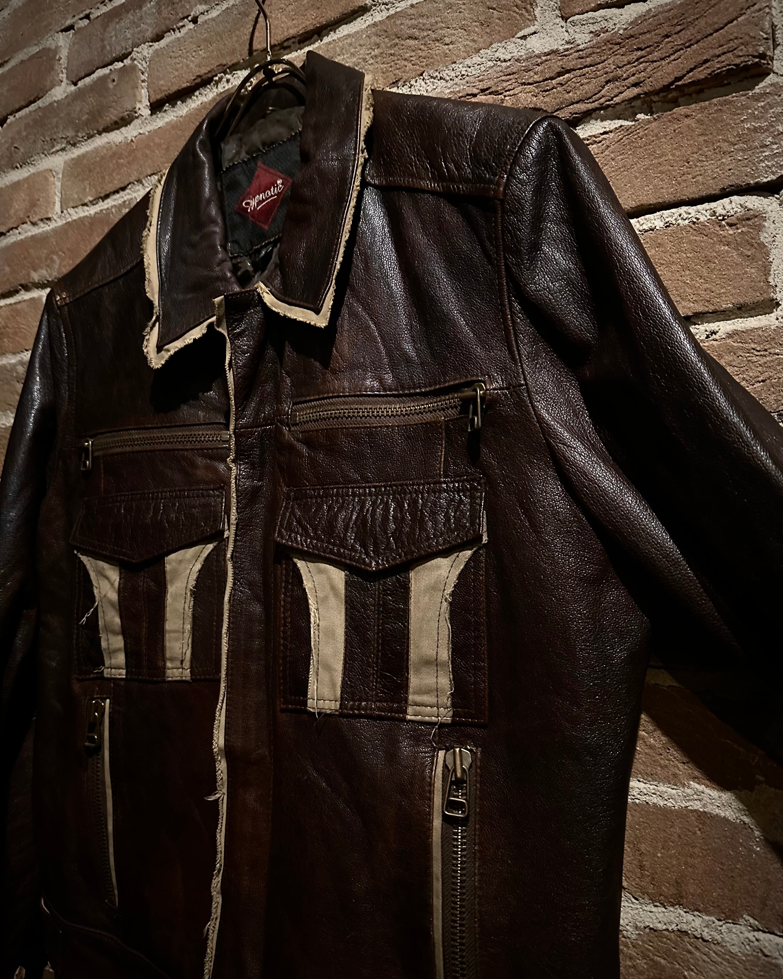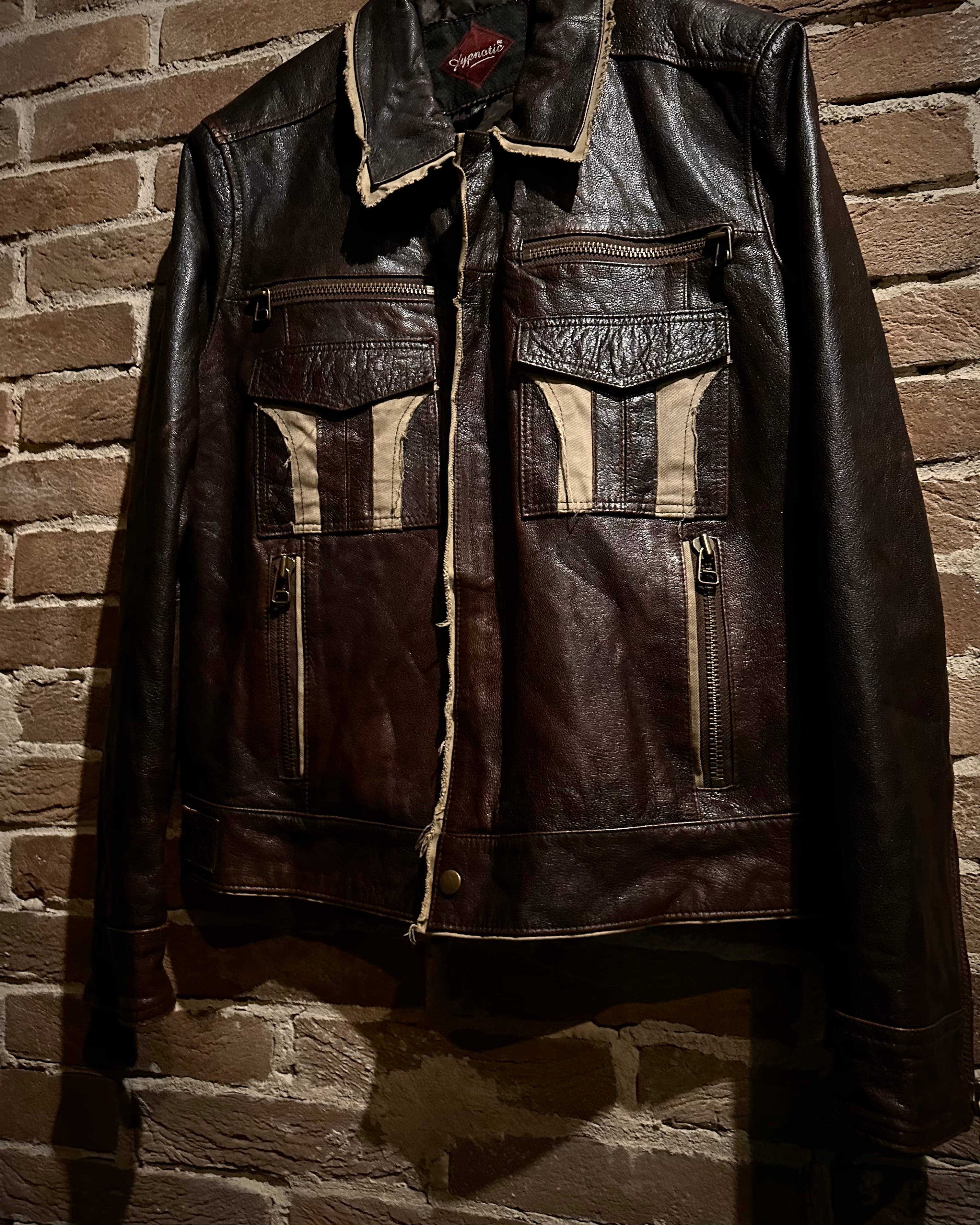 艶の残るダークブラウンレザーをベースに、フロントにはベージュの異素材パネルを切り替えたレザージャケット。