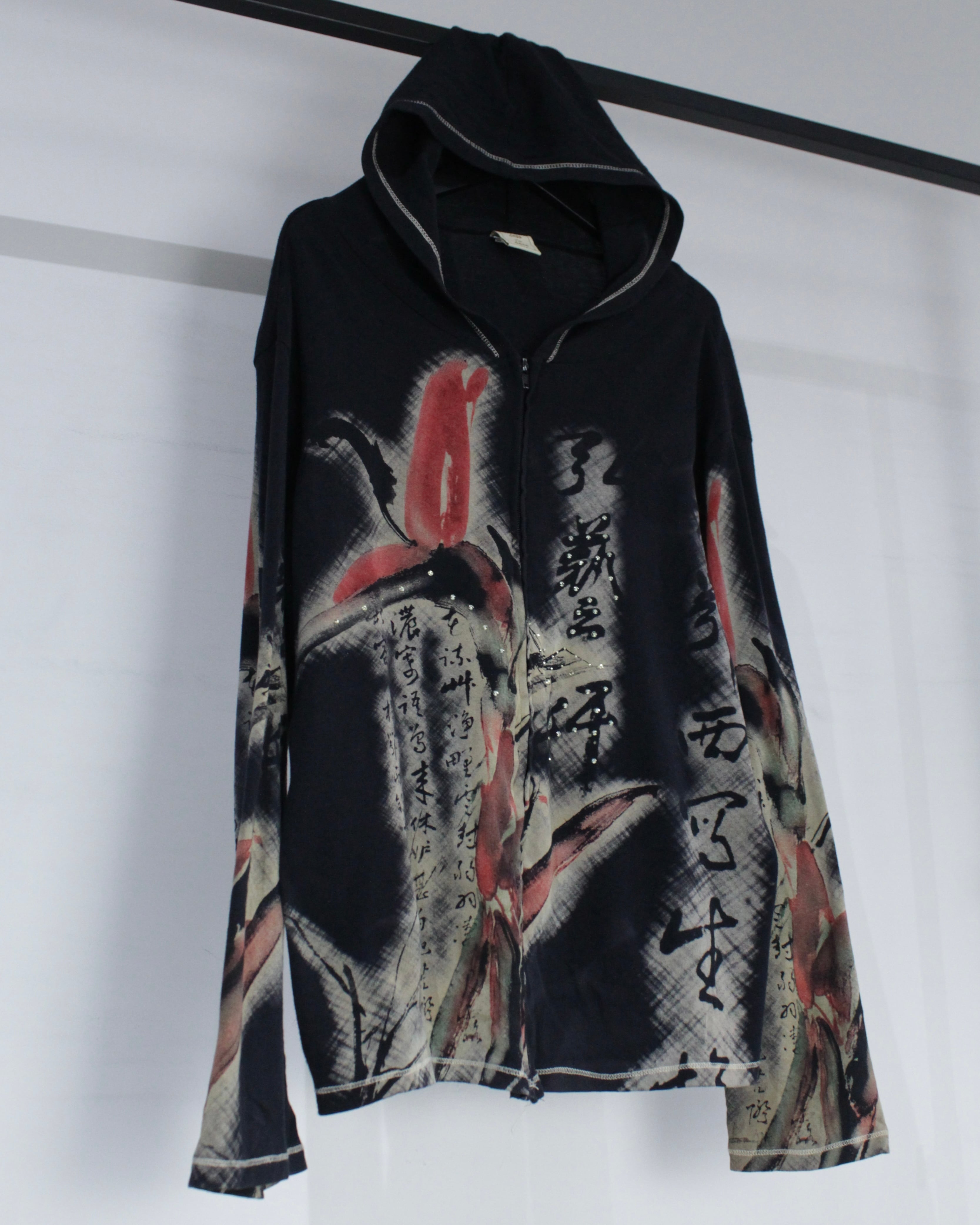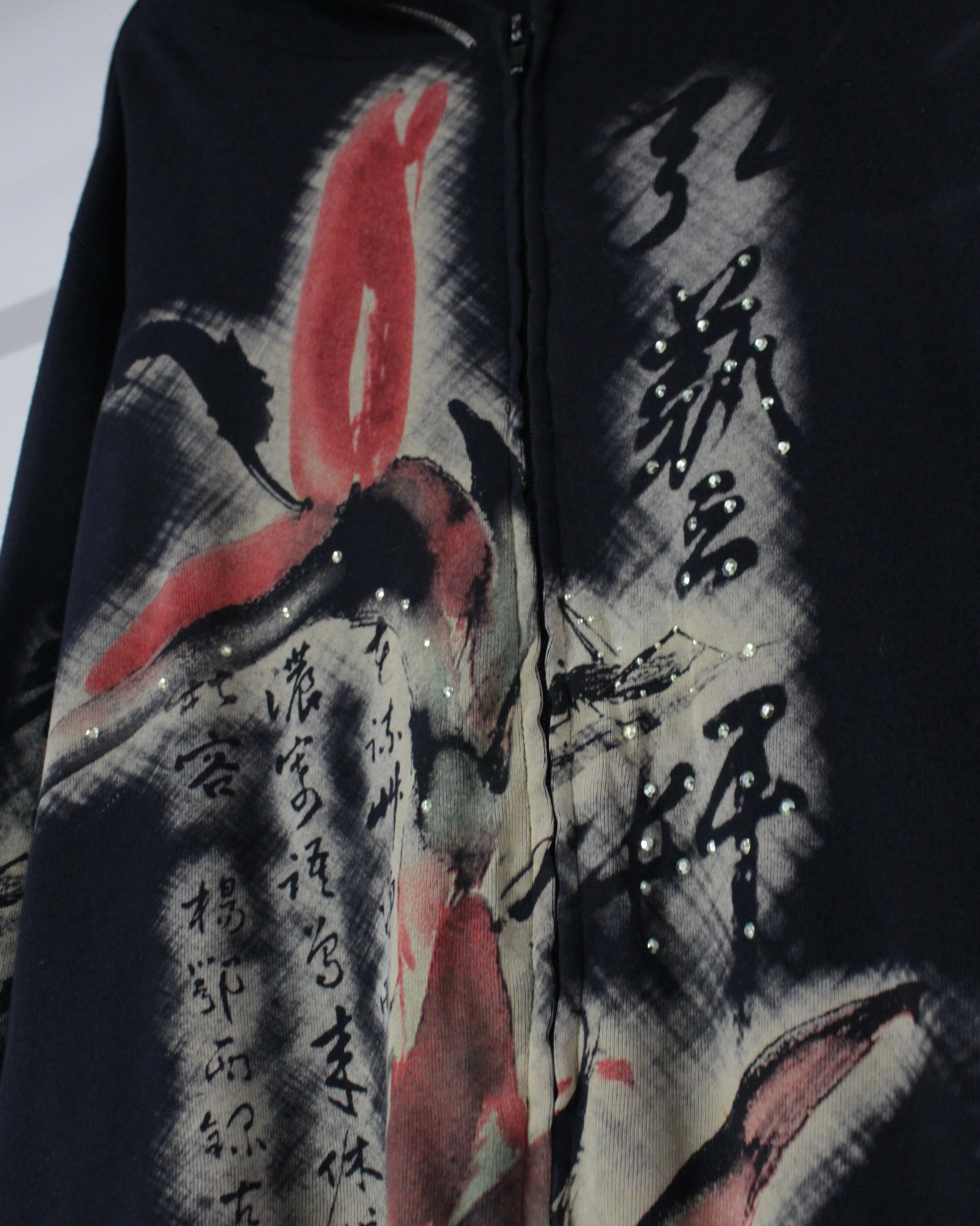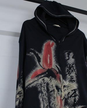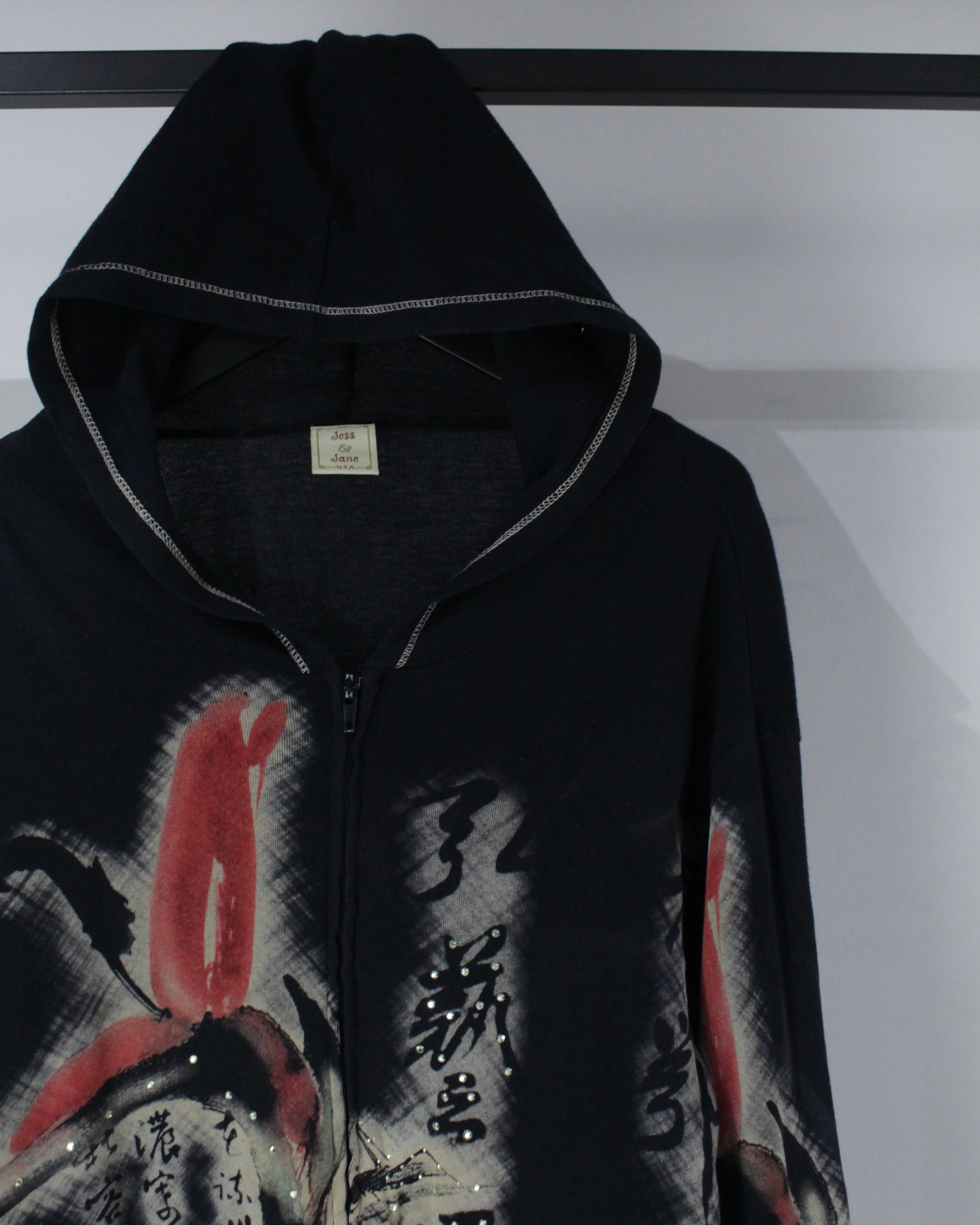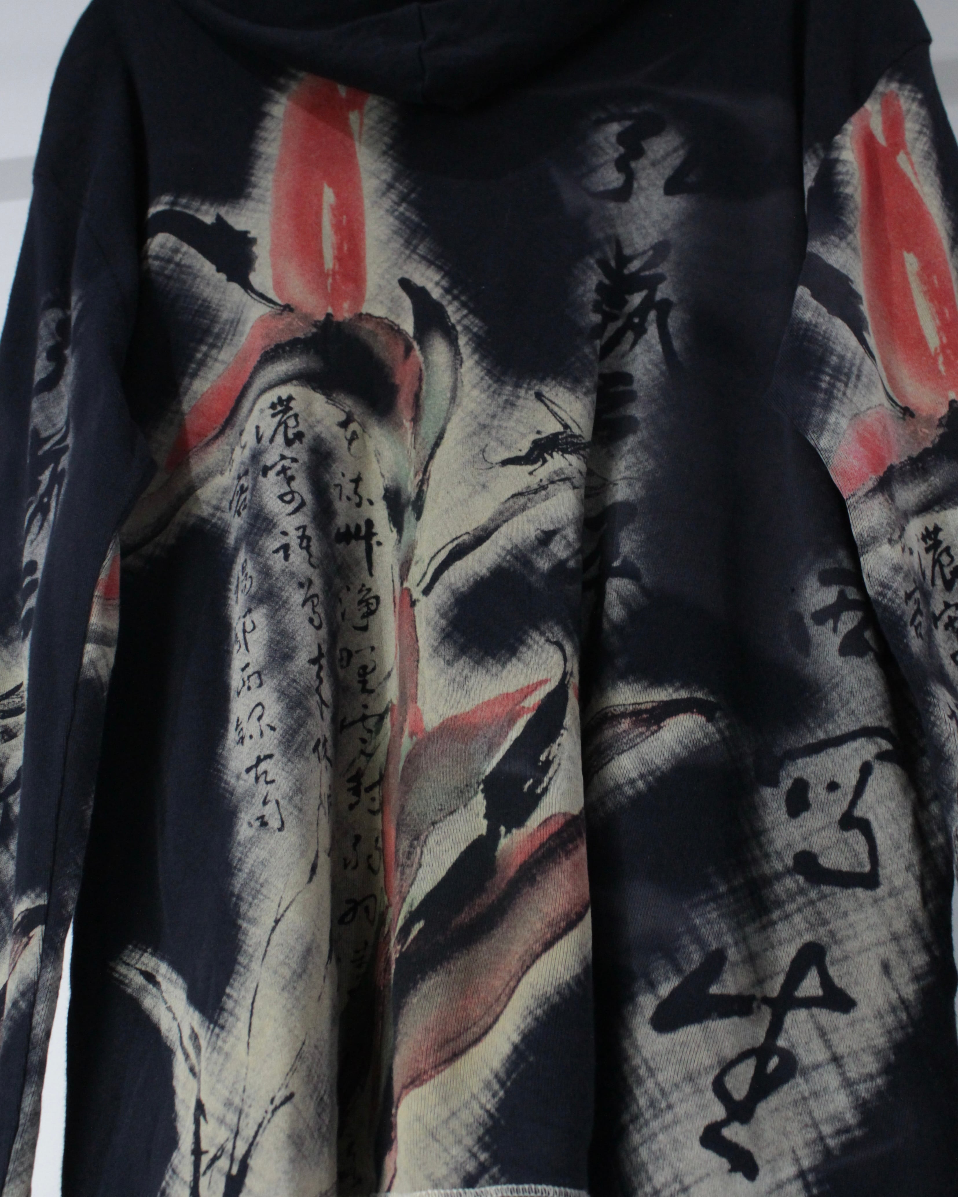 和の筆致を思わせる書体と、大胆に描かれたフラワーモチーフが雰囲気を漂わせジップアップフーディ。