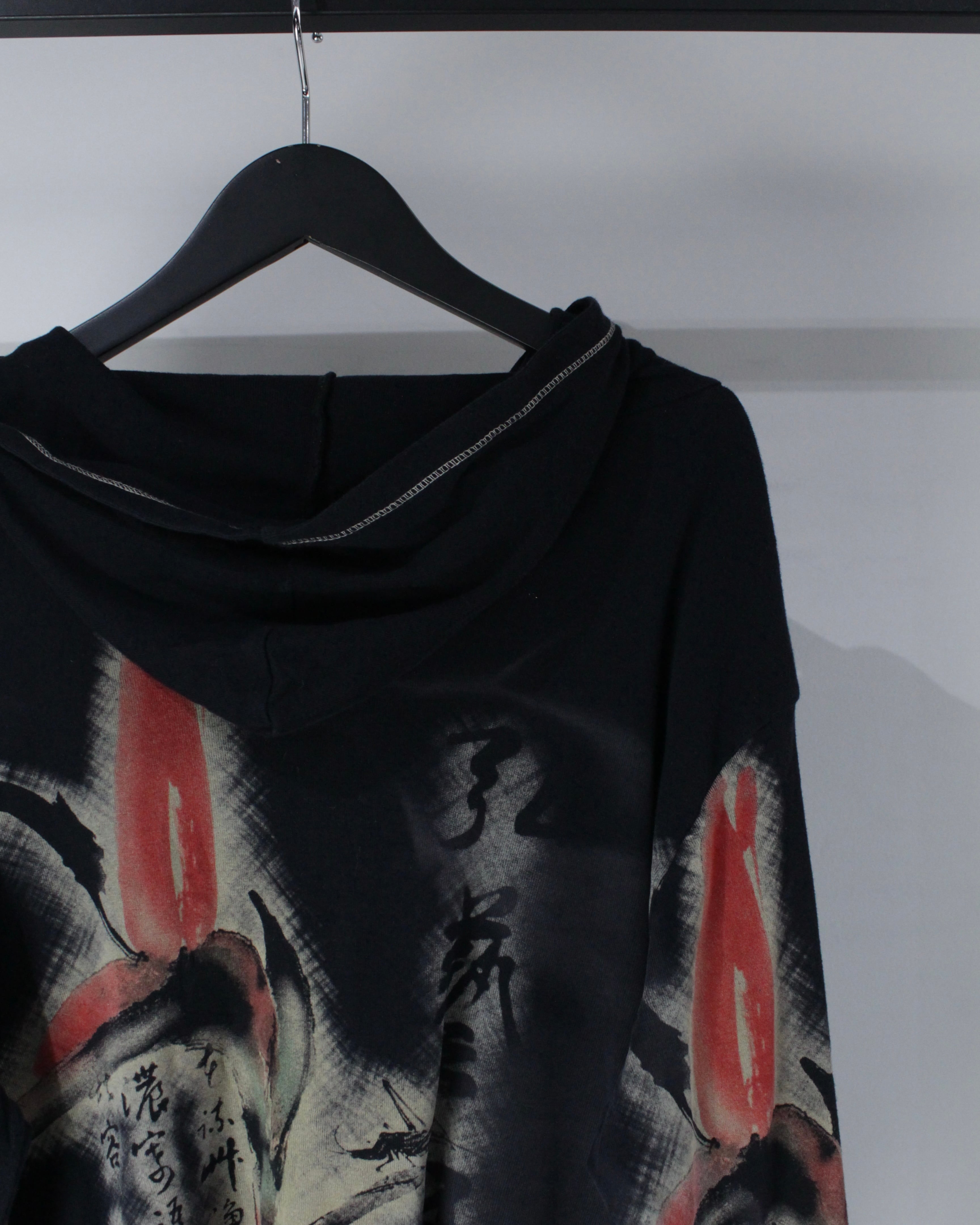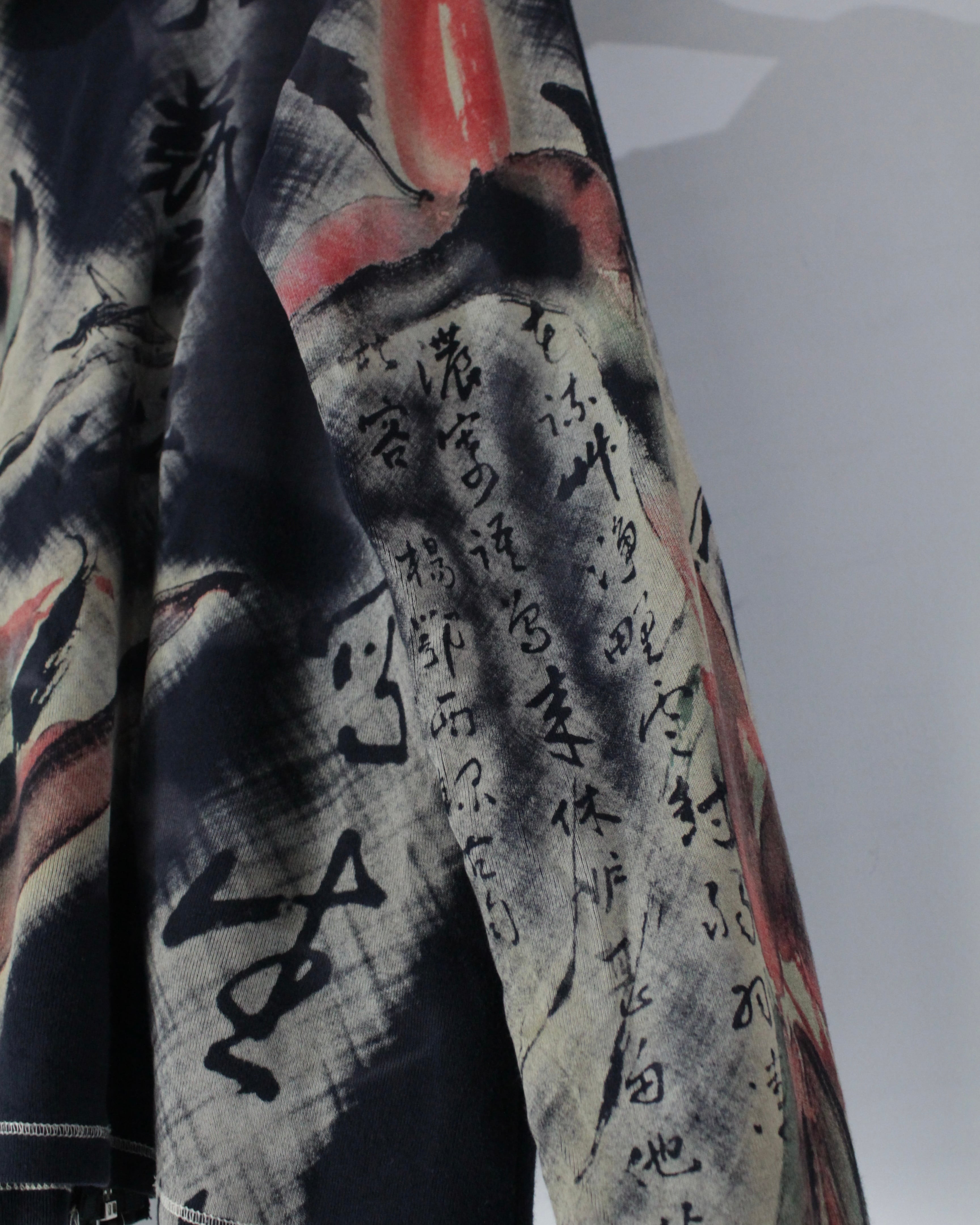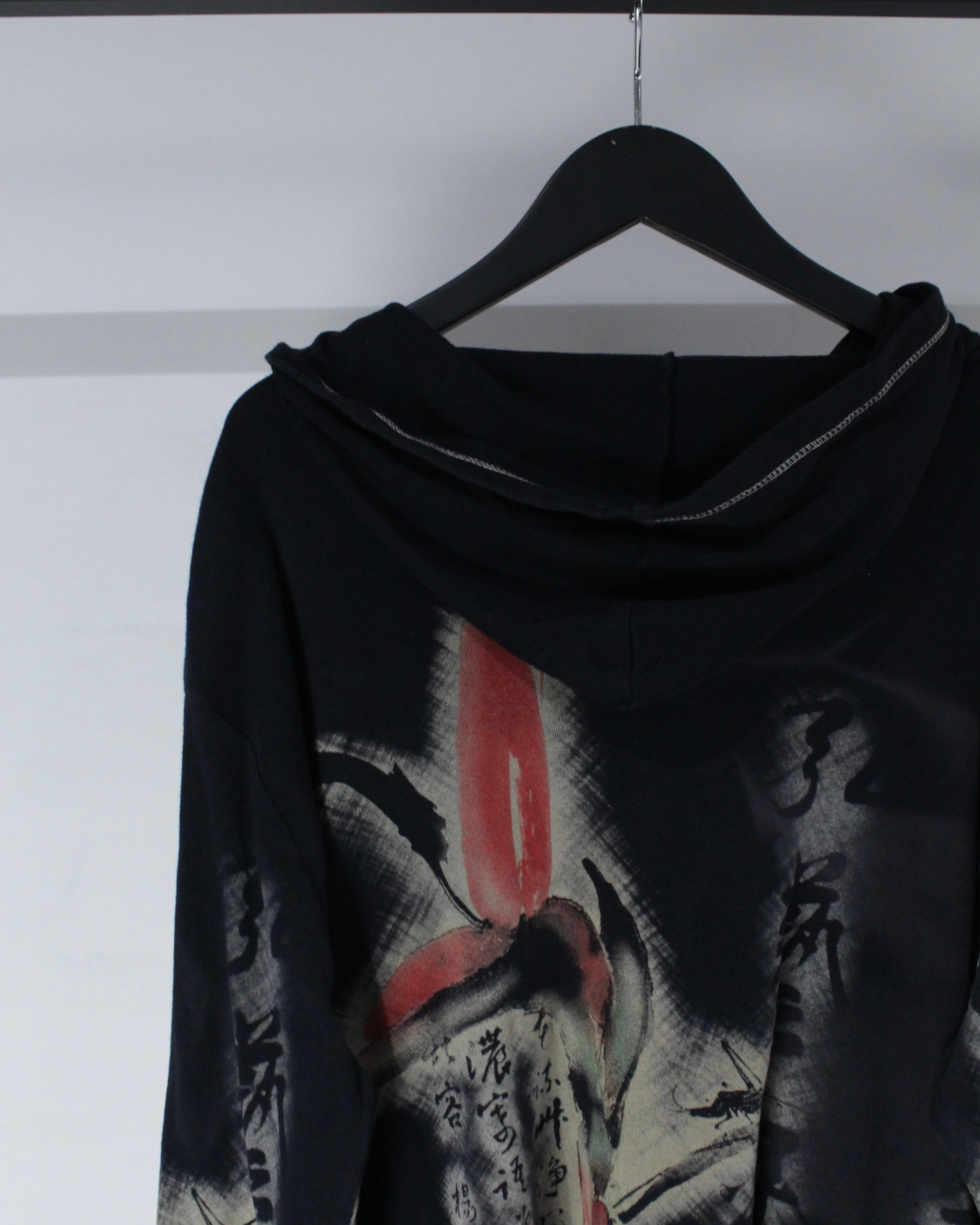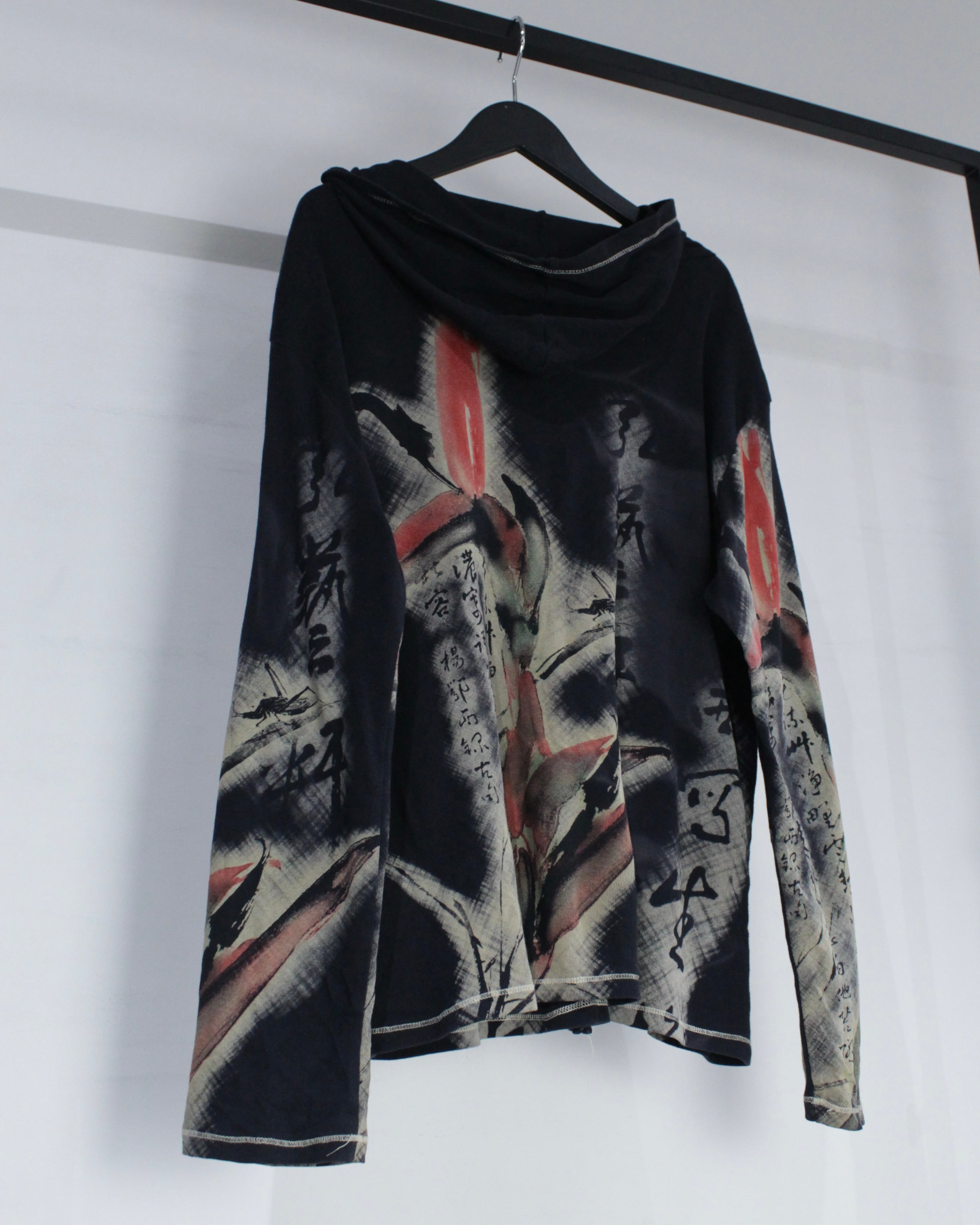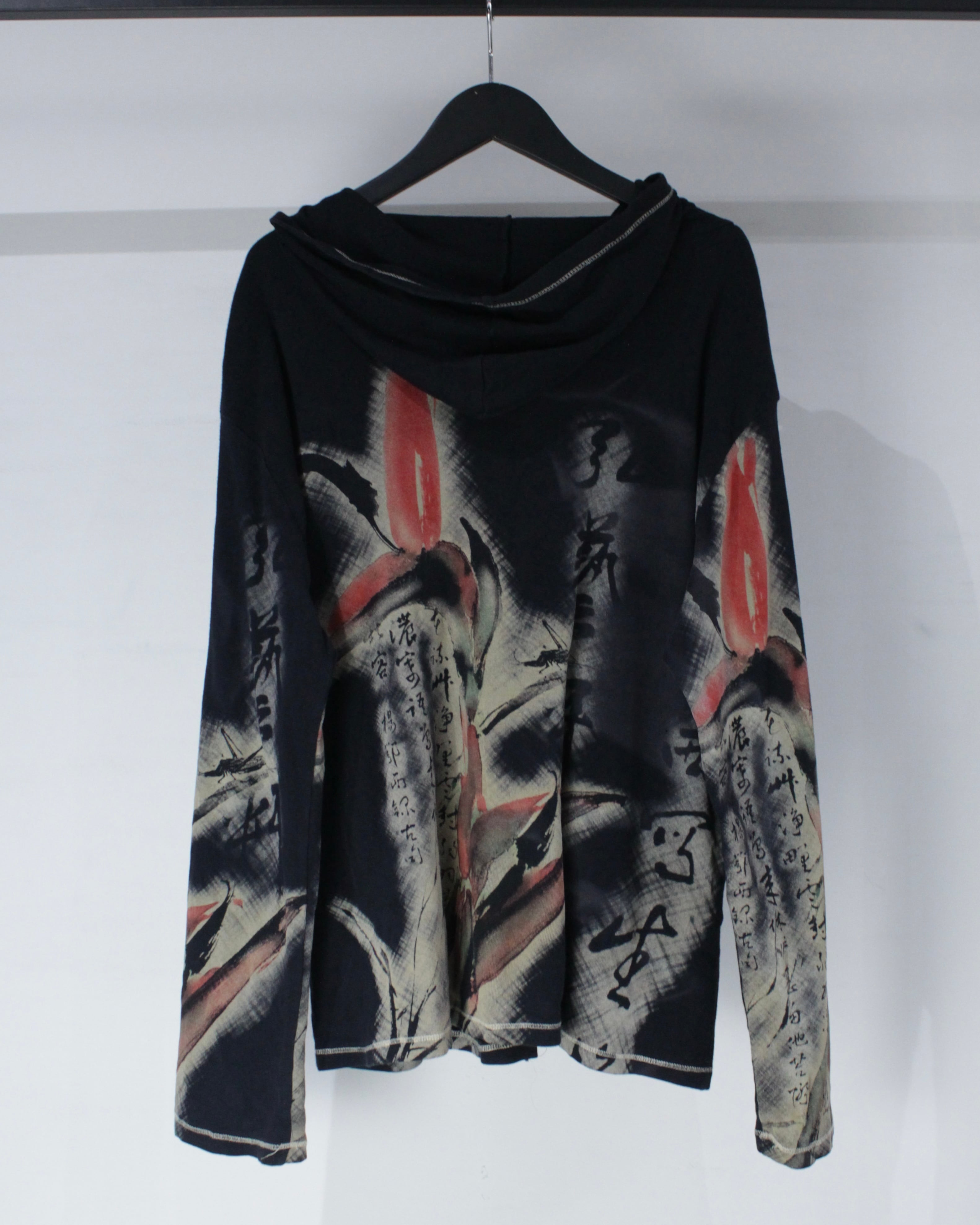 和の筆致を思わせる書体と、大胆に描かれたフラワーモチーフが雰囲気を漂わせジップアップフーディ。