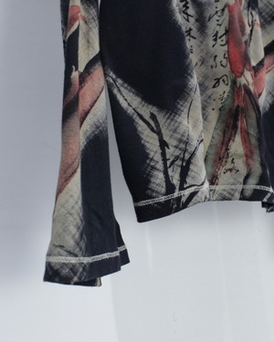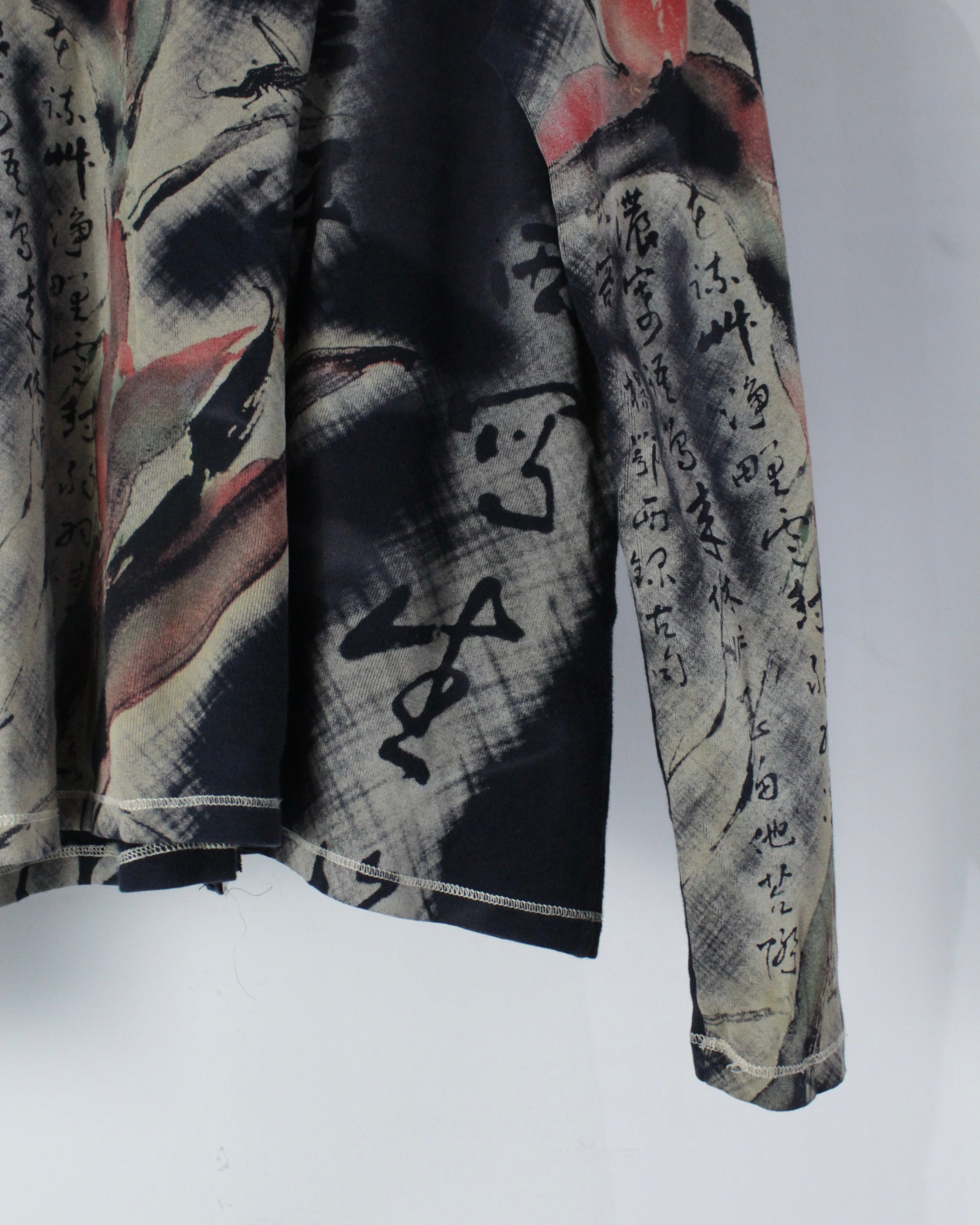 レッドやベージュのトーンがブラックベースに映え、東洋的な美学とモードな雰囲気を同時に纏うことができます。