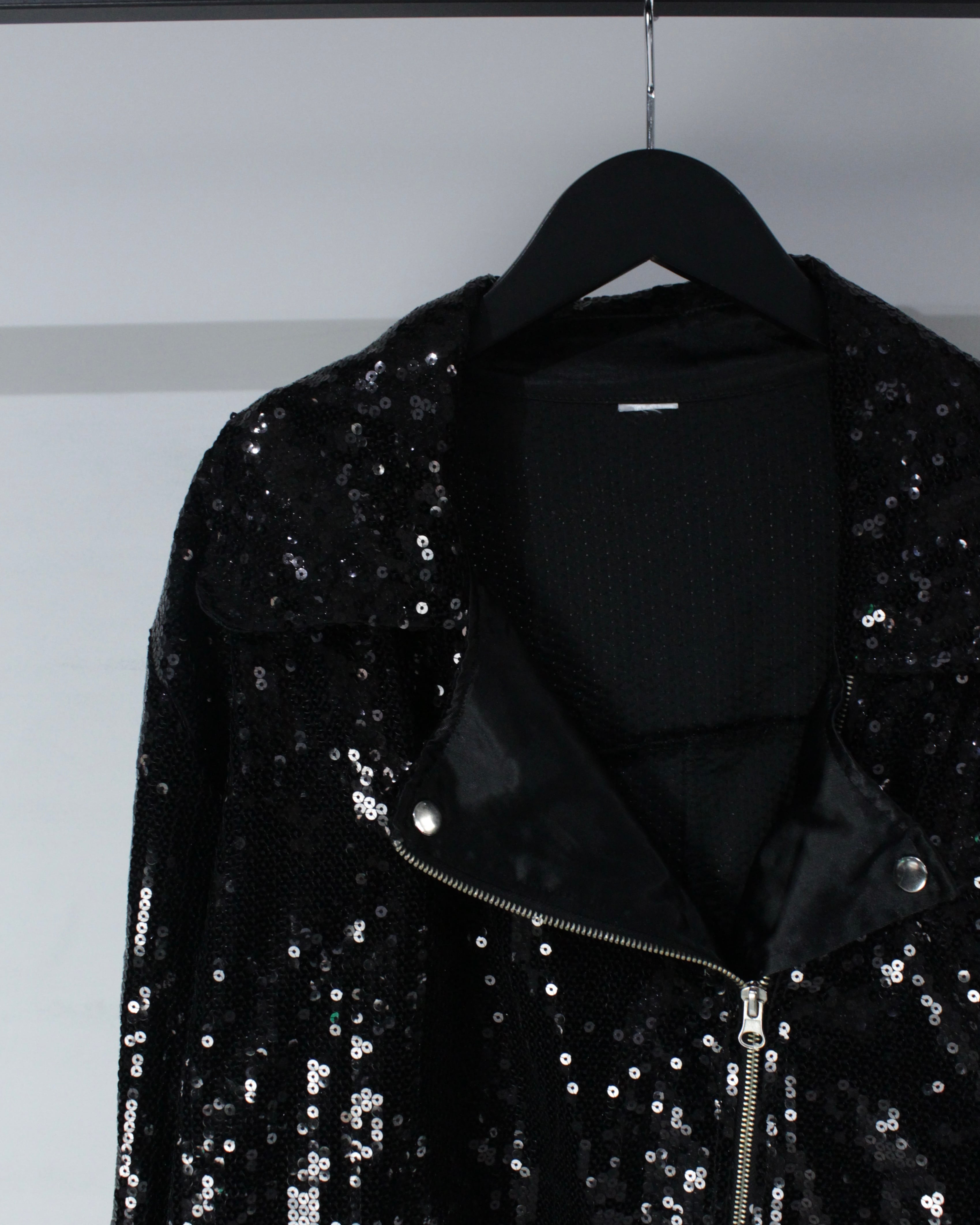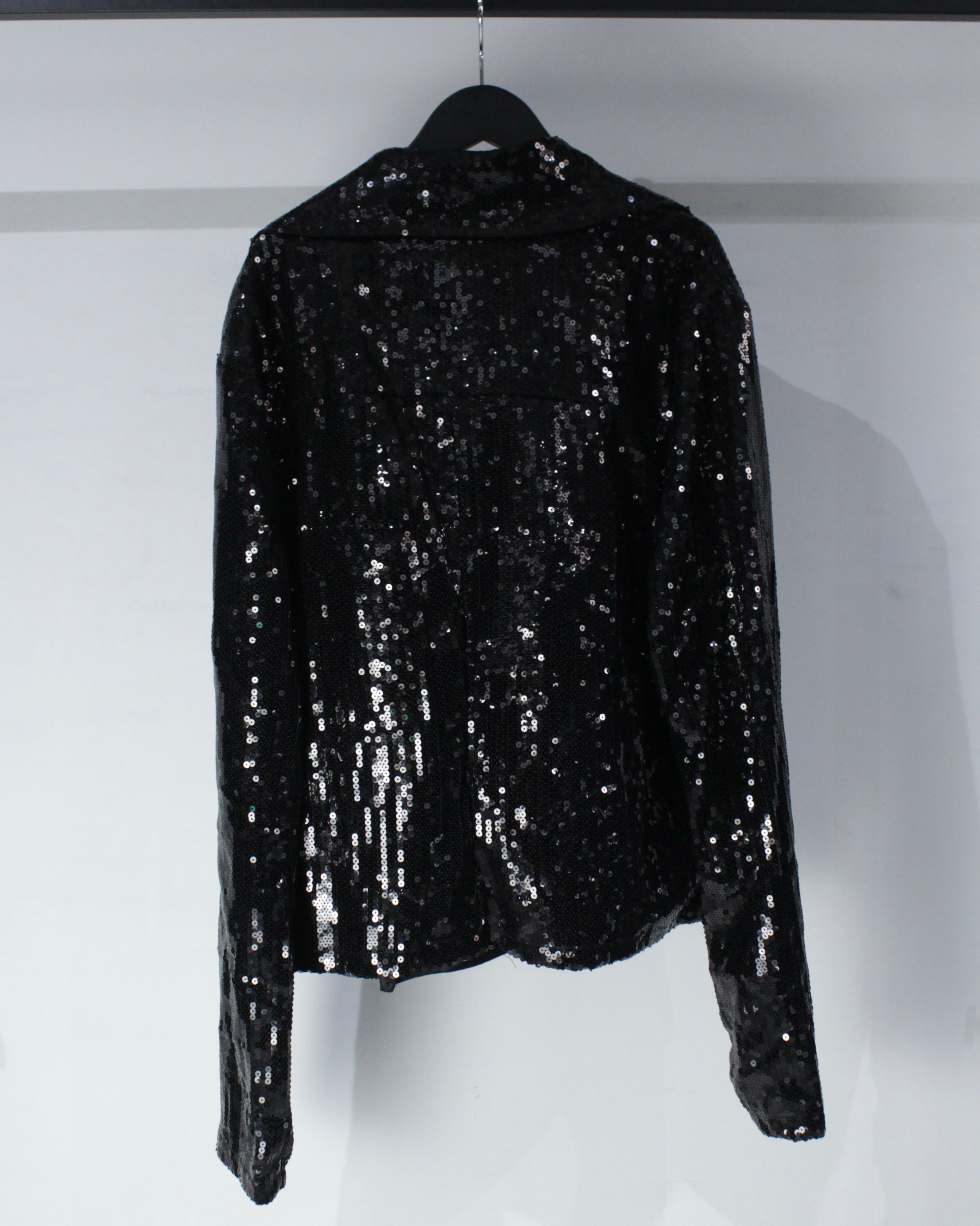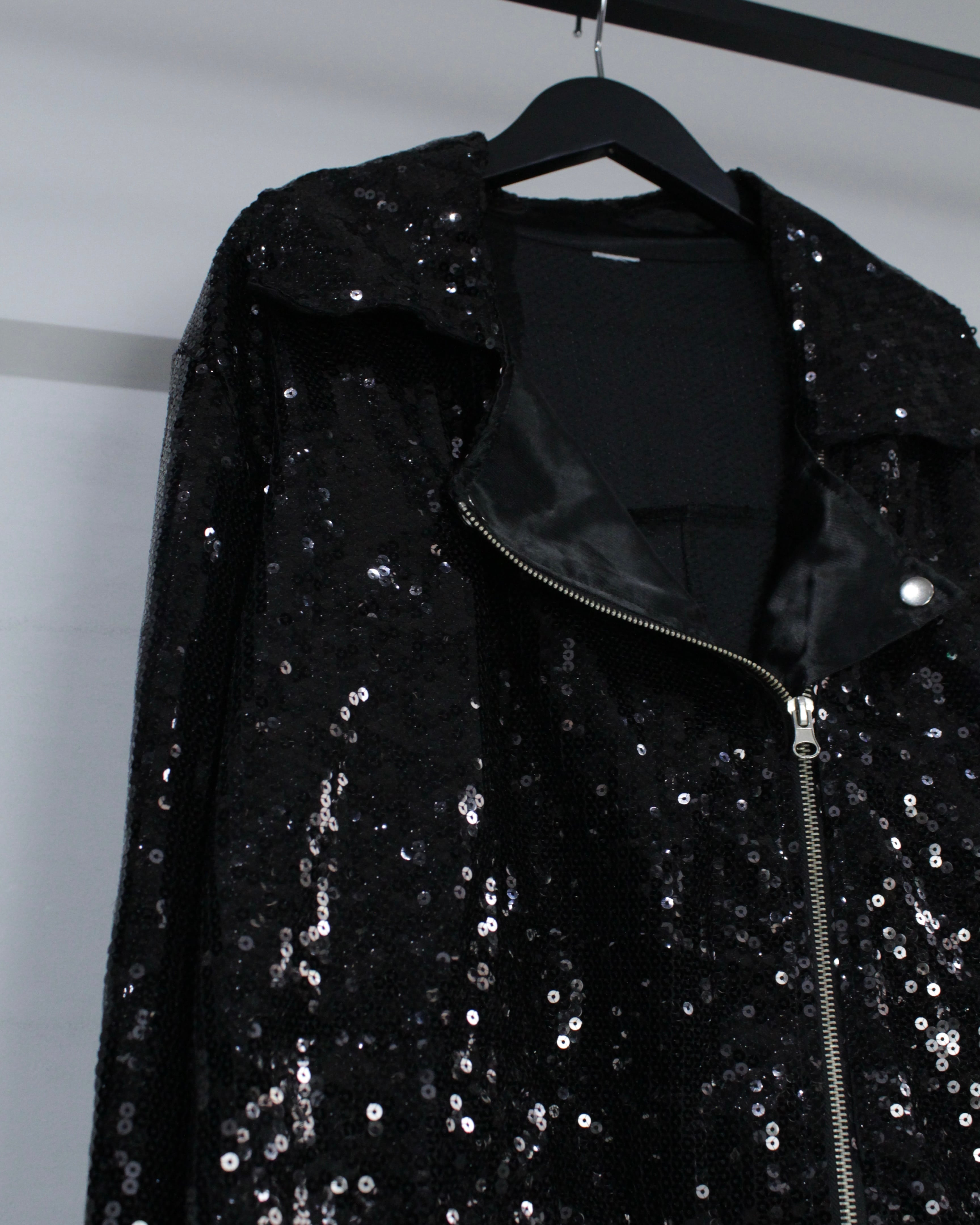 光を受けて細やかに輝くスパンコールが、動きとともに陰影を生み出し、クラシックなライダースシルエットに華やかさとモードな深みを加えた仕上がりに。