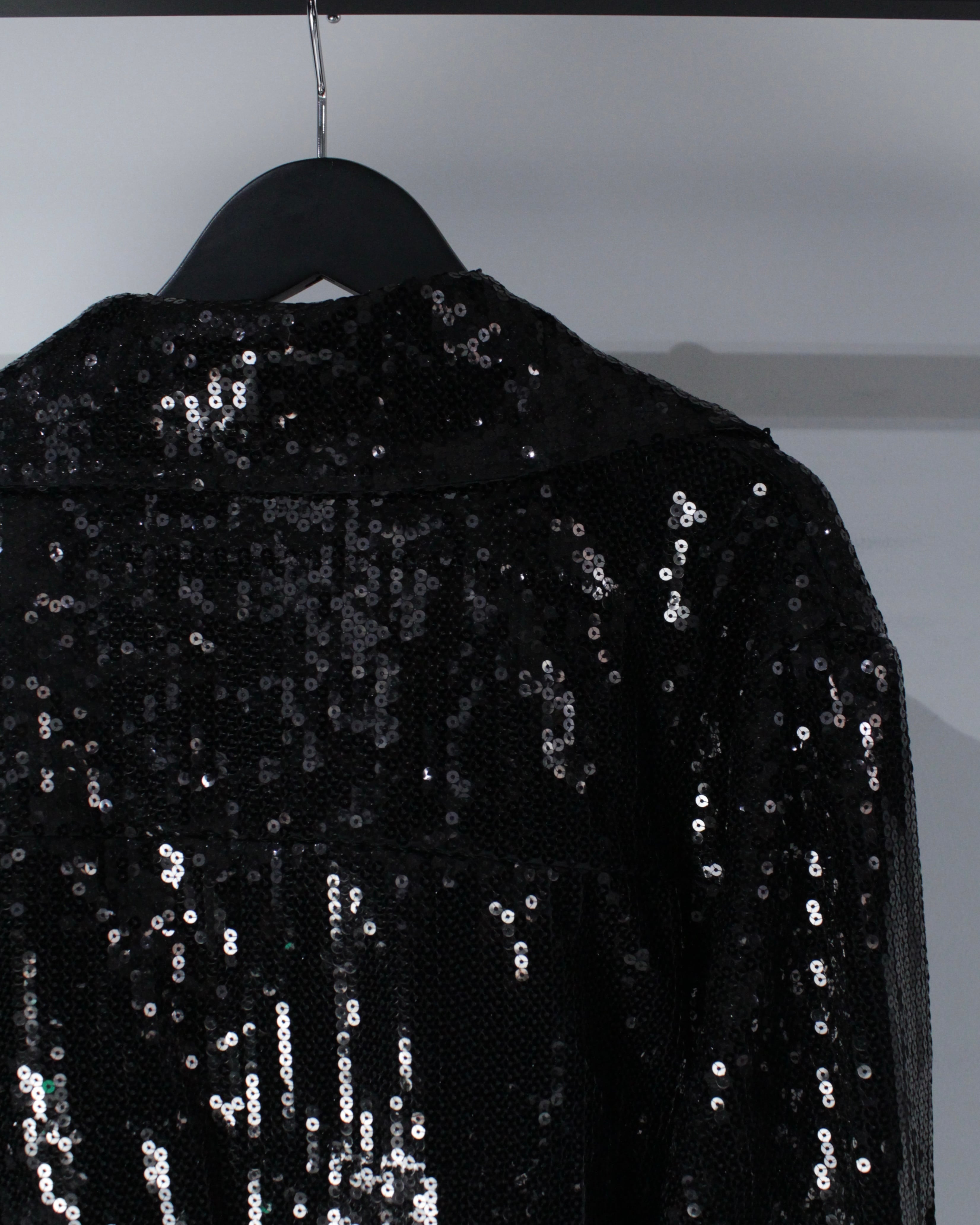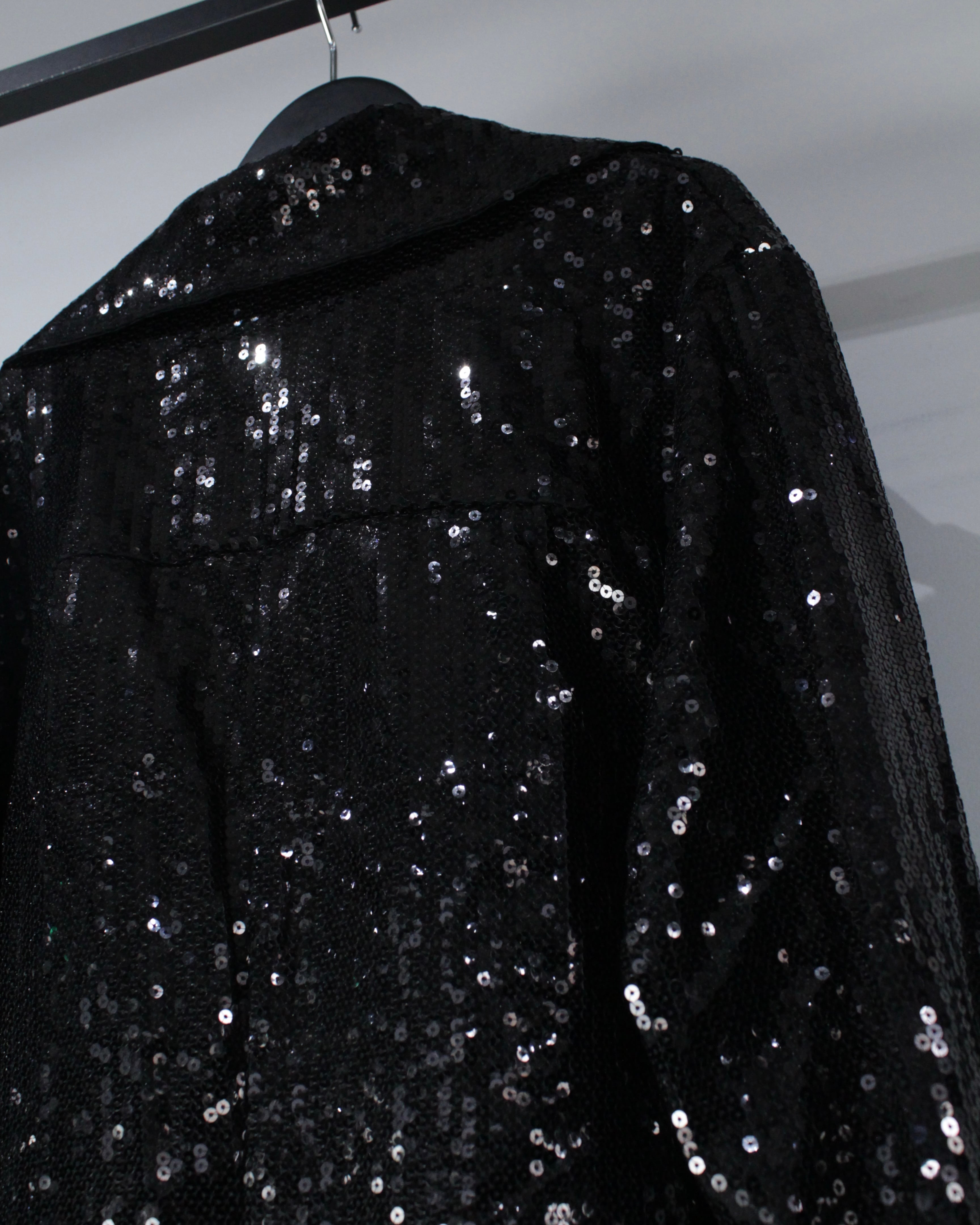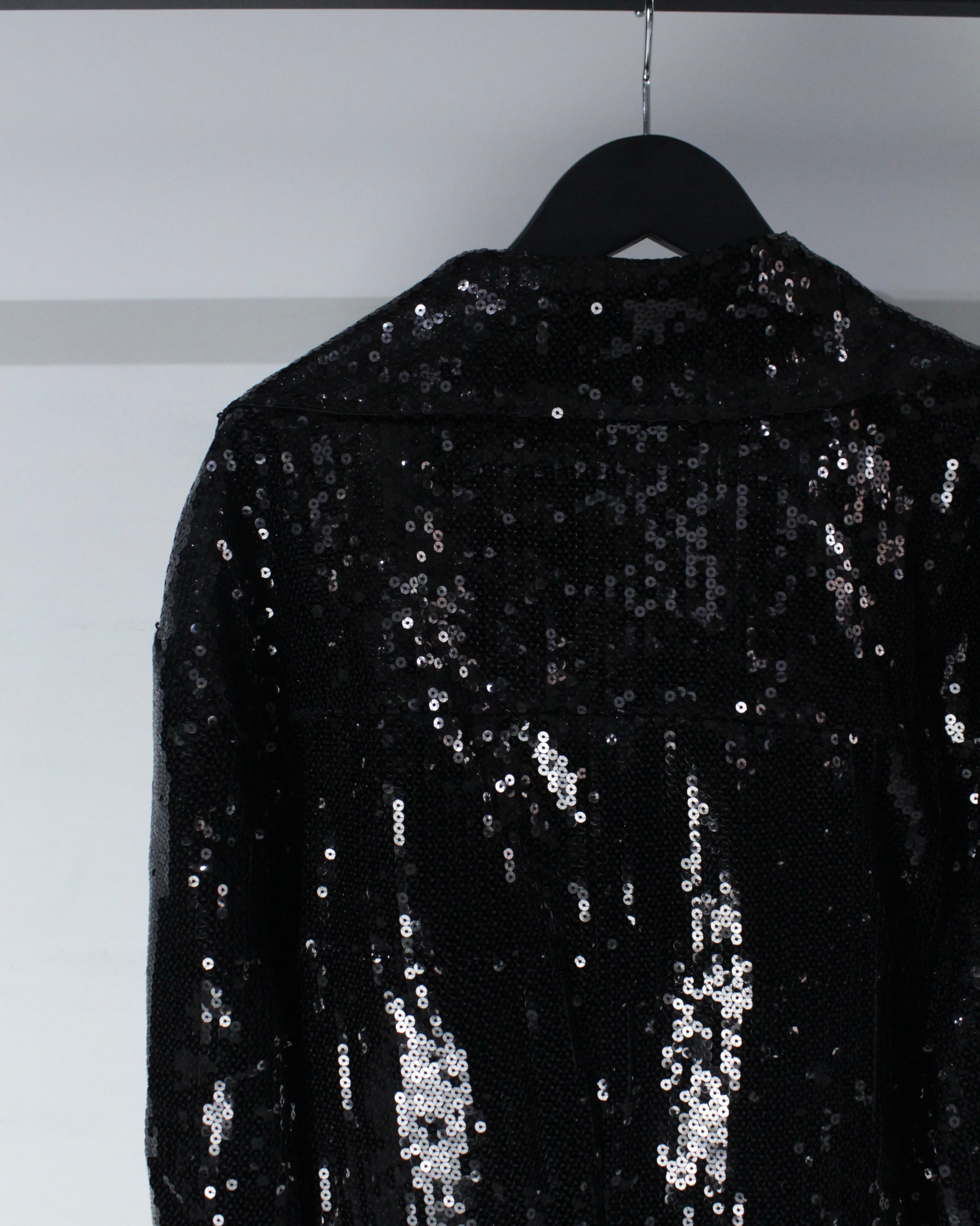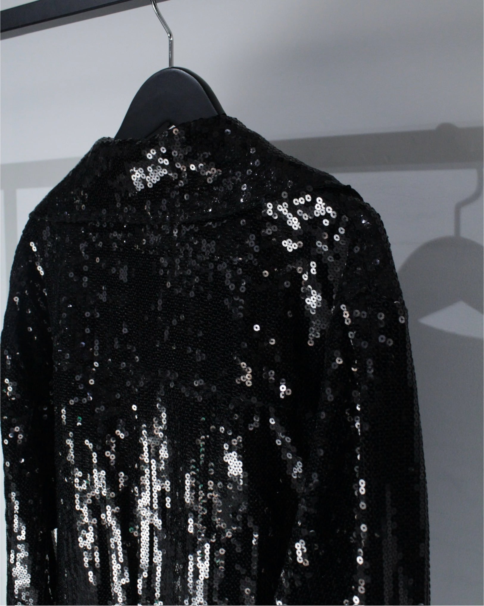 光を受けて細やかに輝くスパンコールが、動きとともに陰影を生み出し、クラシックなライダースシルエットに華やかさとモードな深みを加えた仕上がりに。