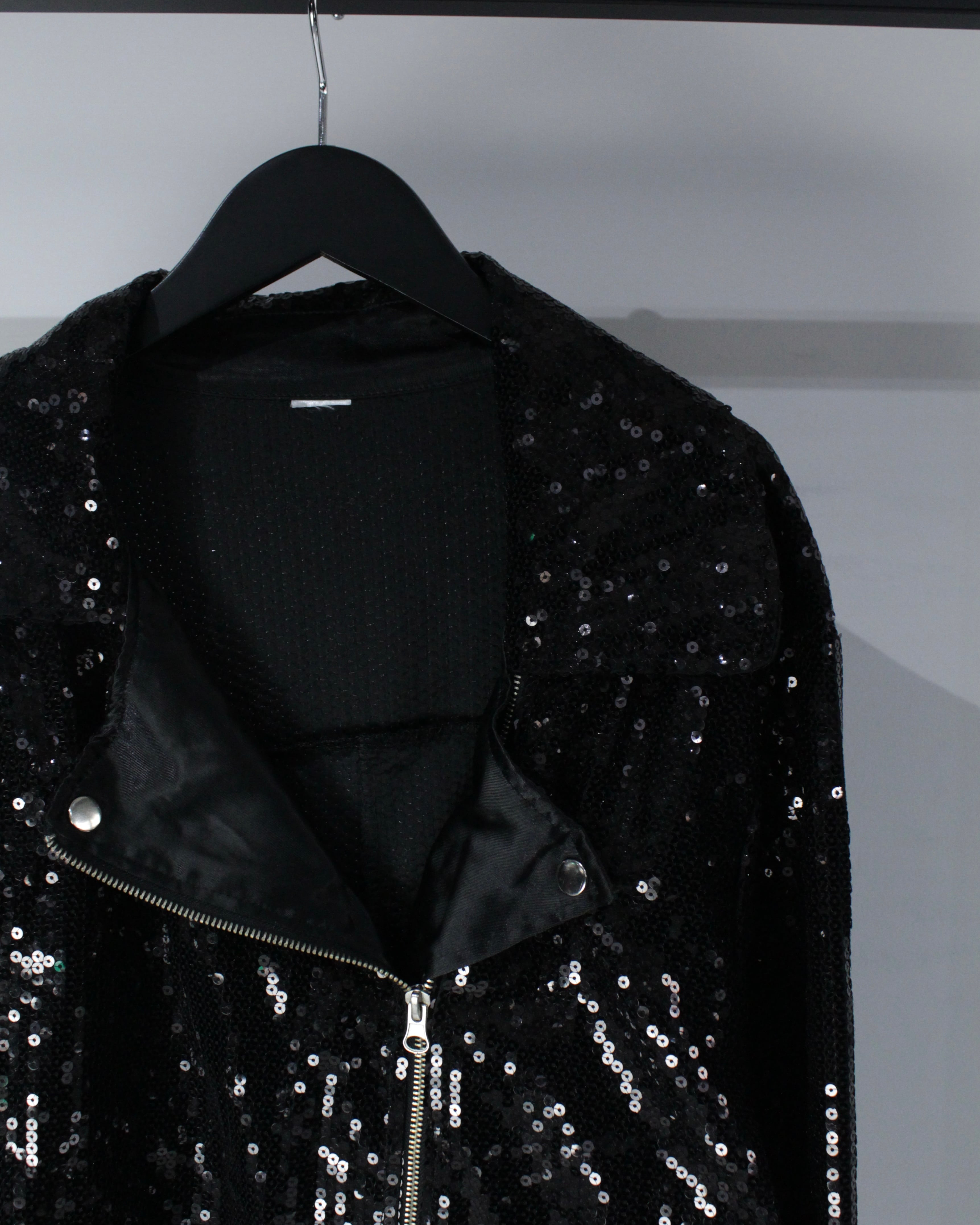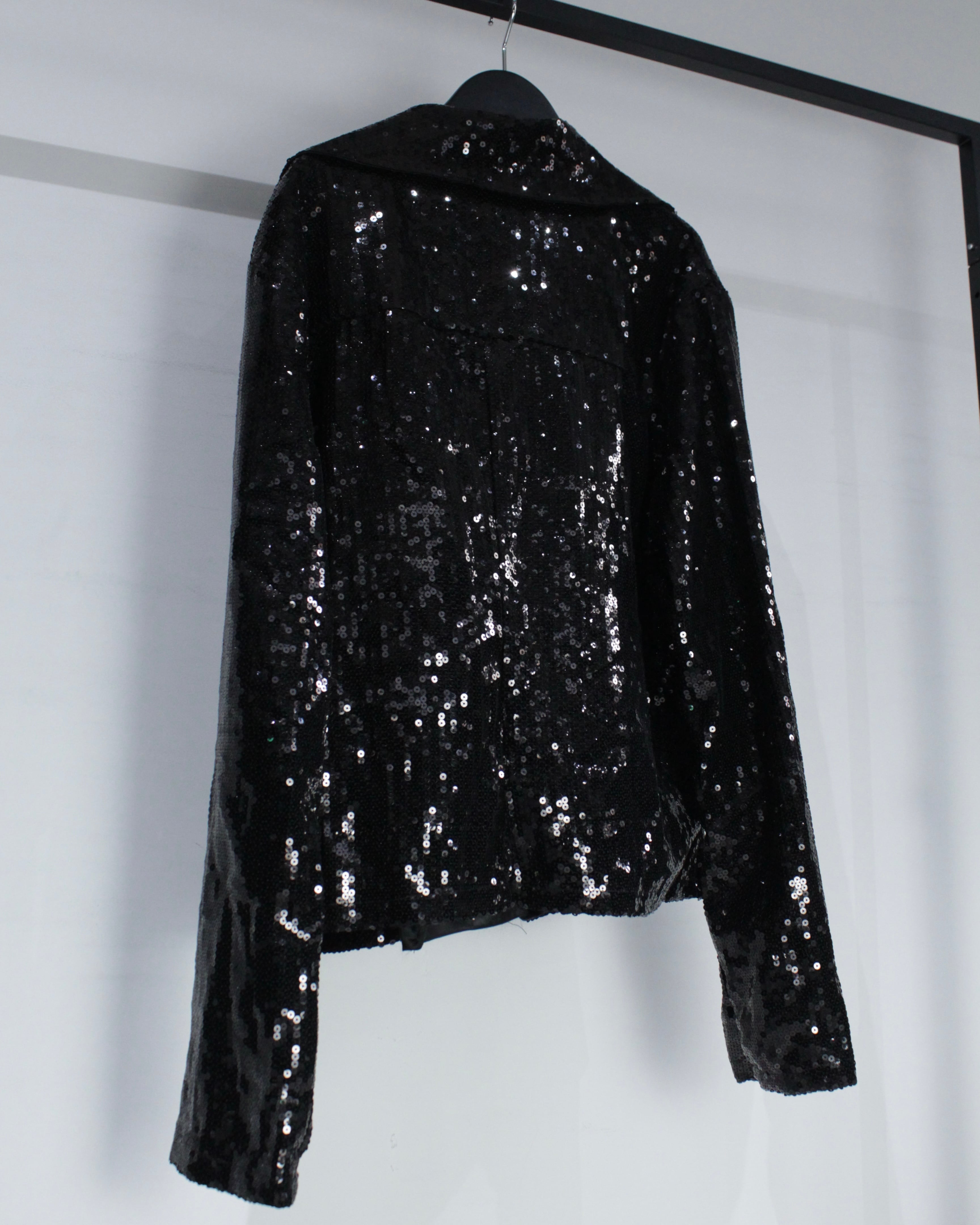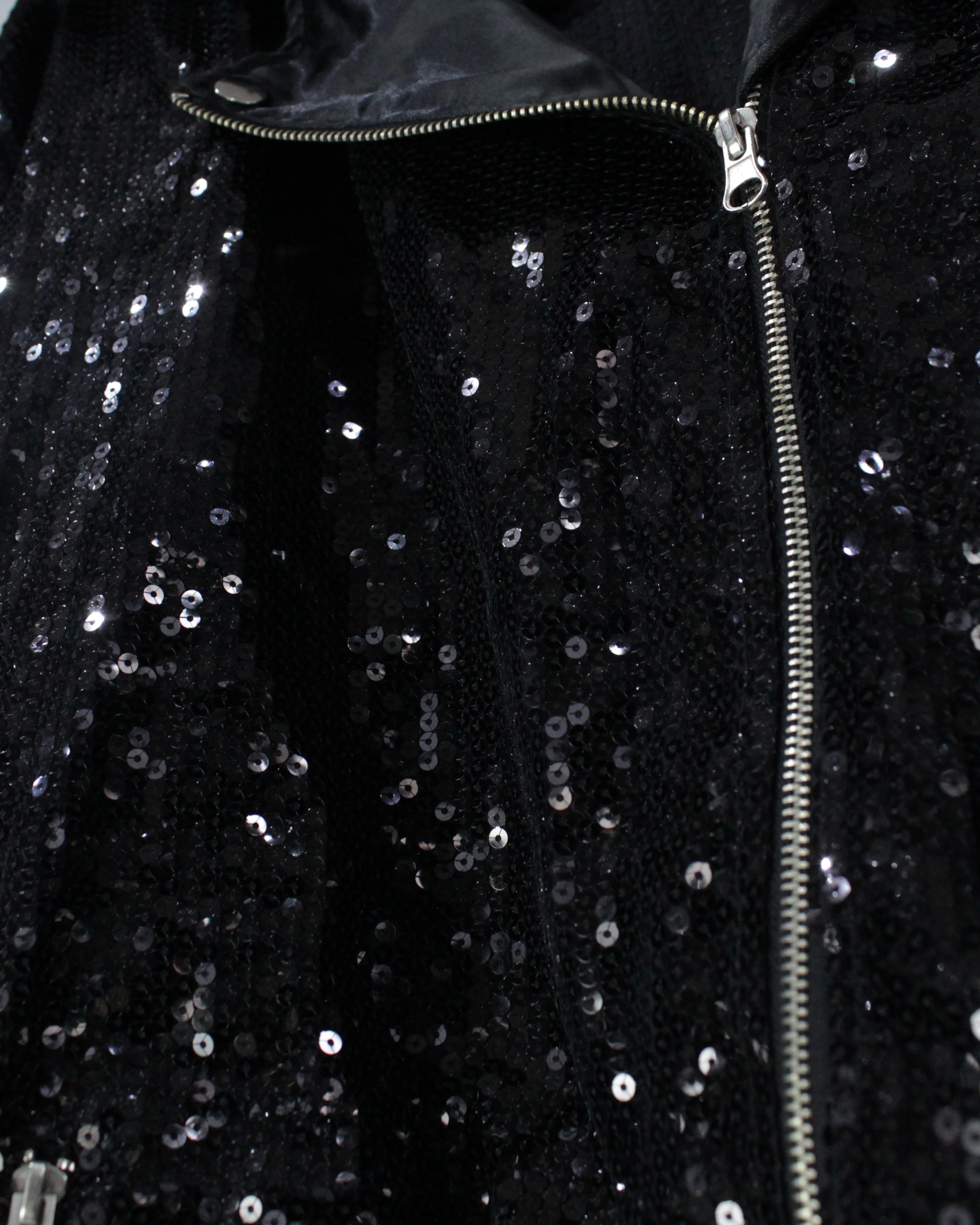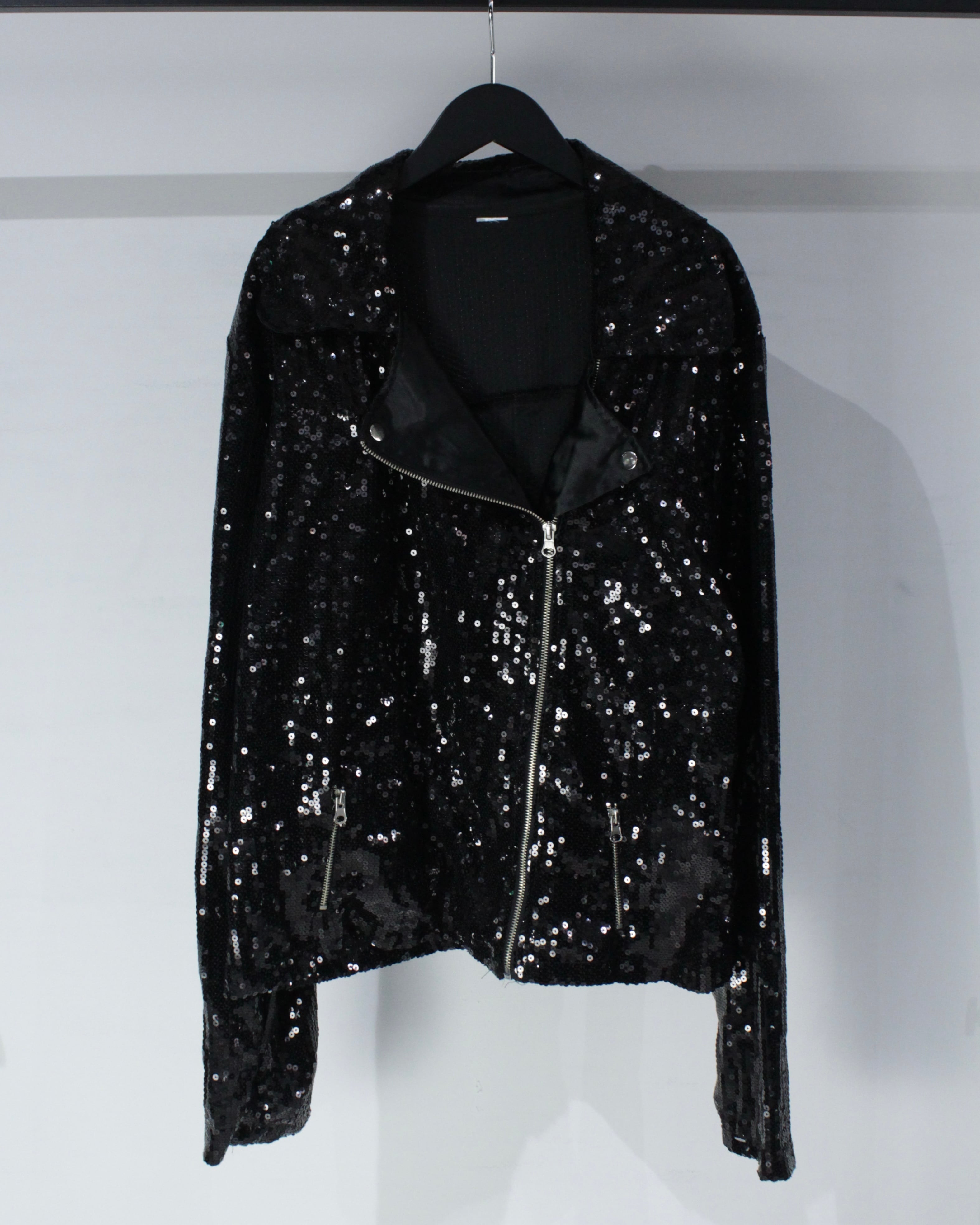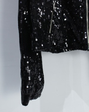 全面にびっしりとスパンコールを敷き詰めた、ラグジュアリーな存在感を放つブラックのダブルライダース型ジャケット。
