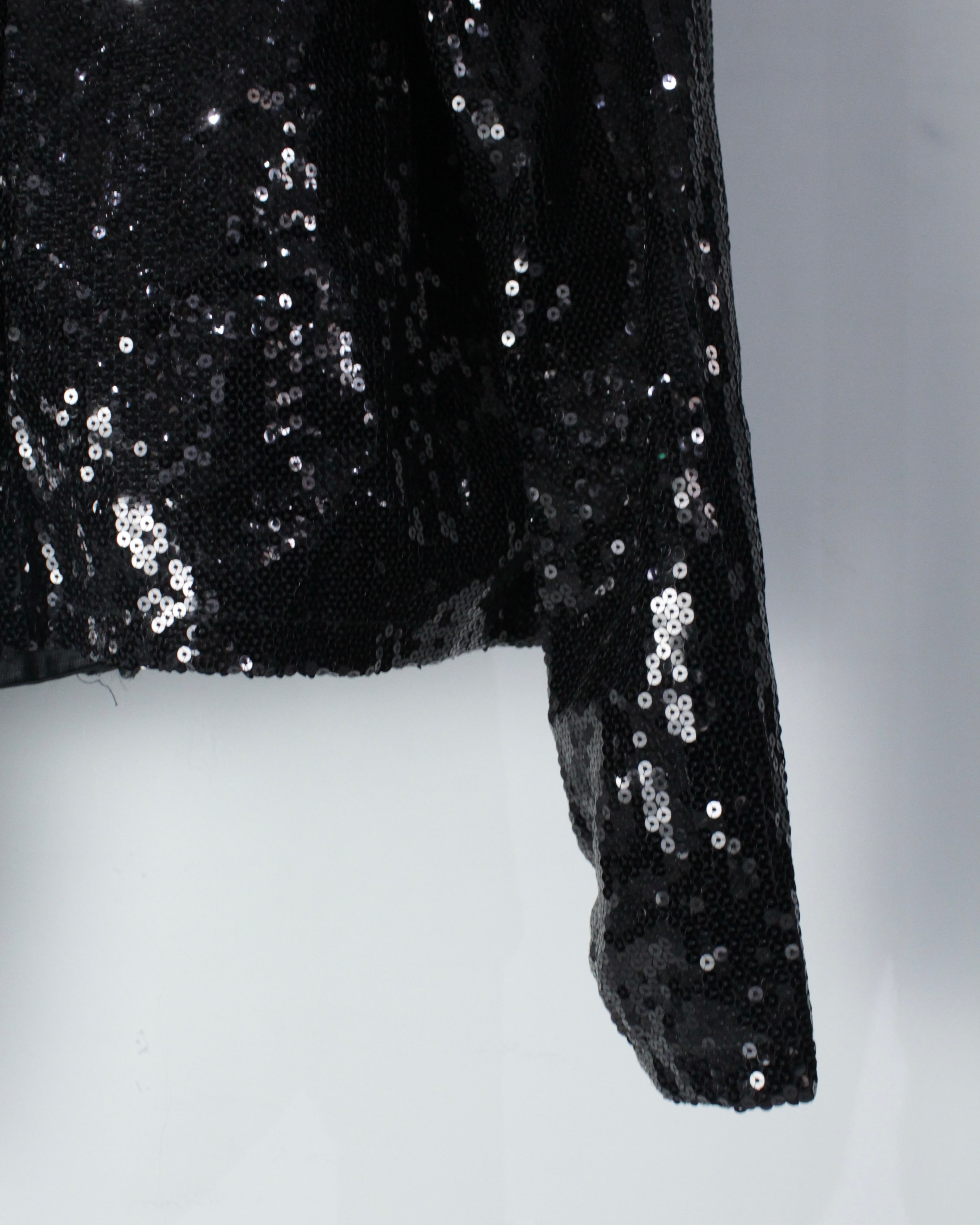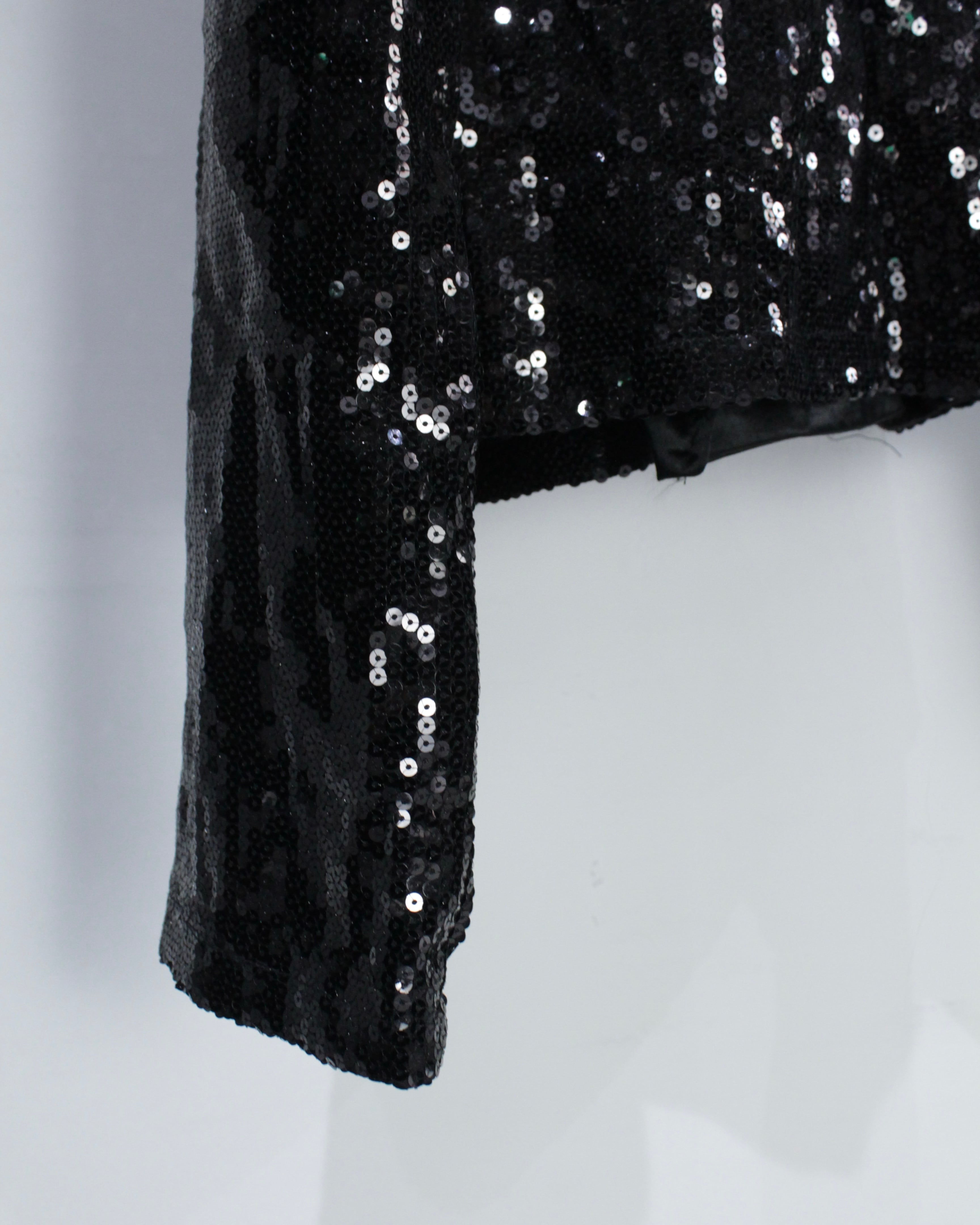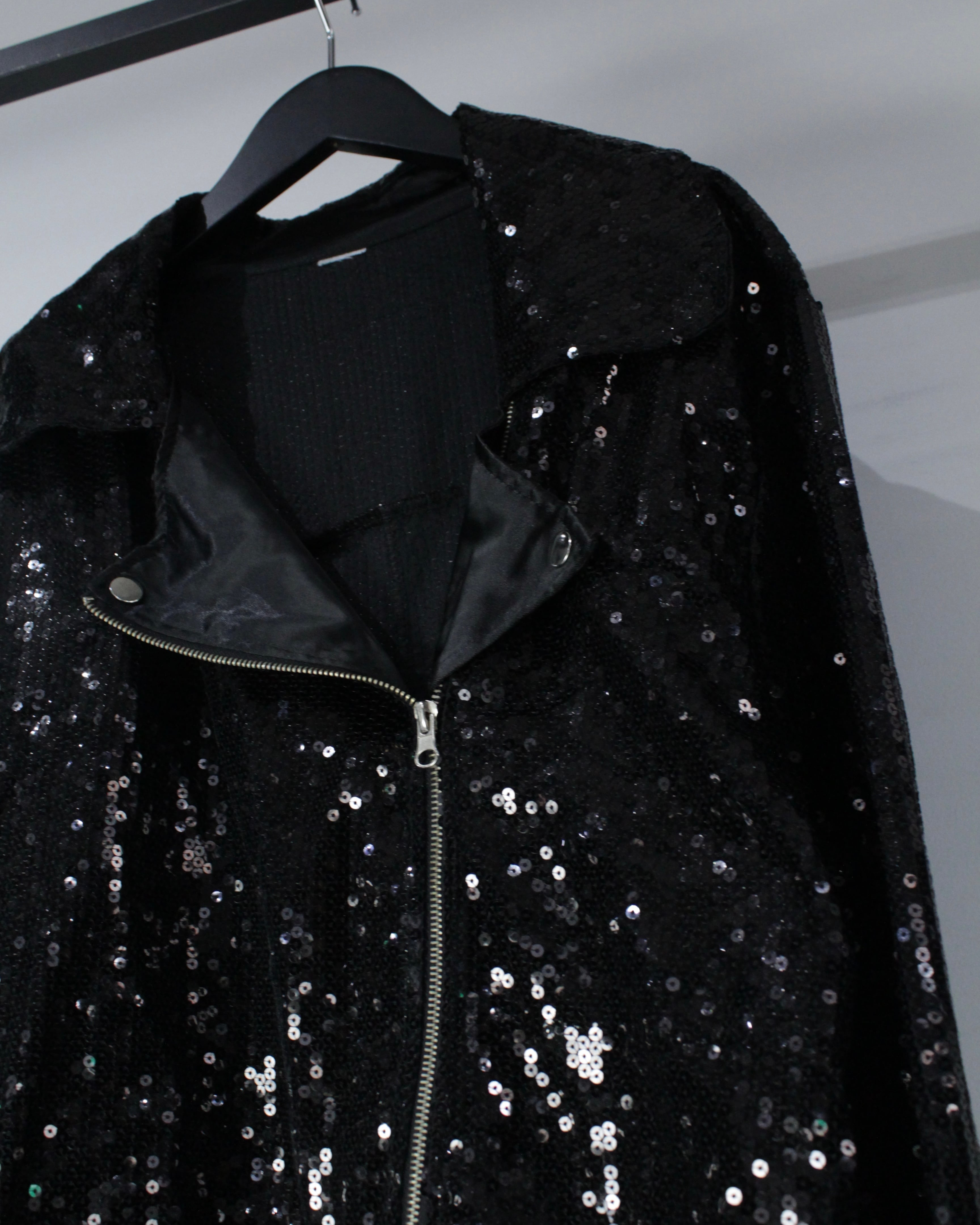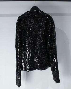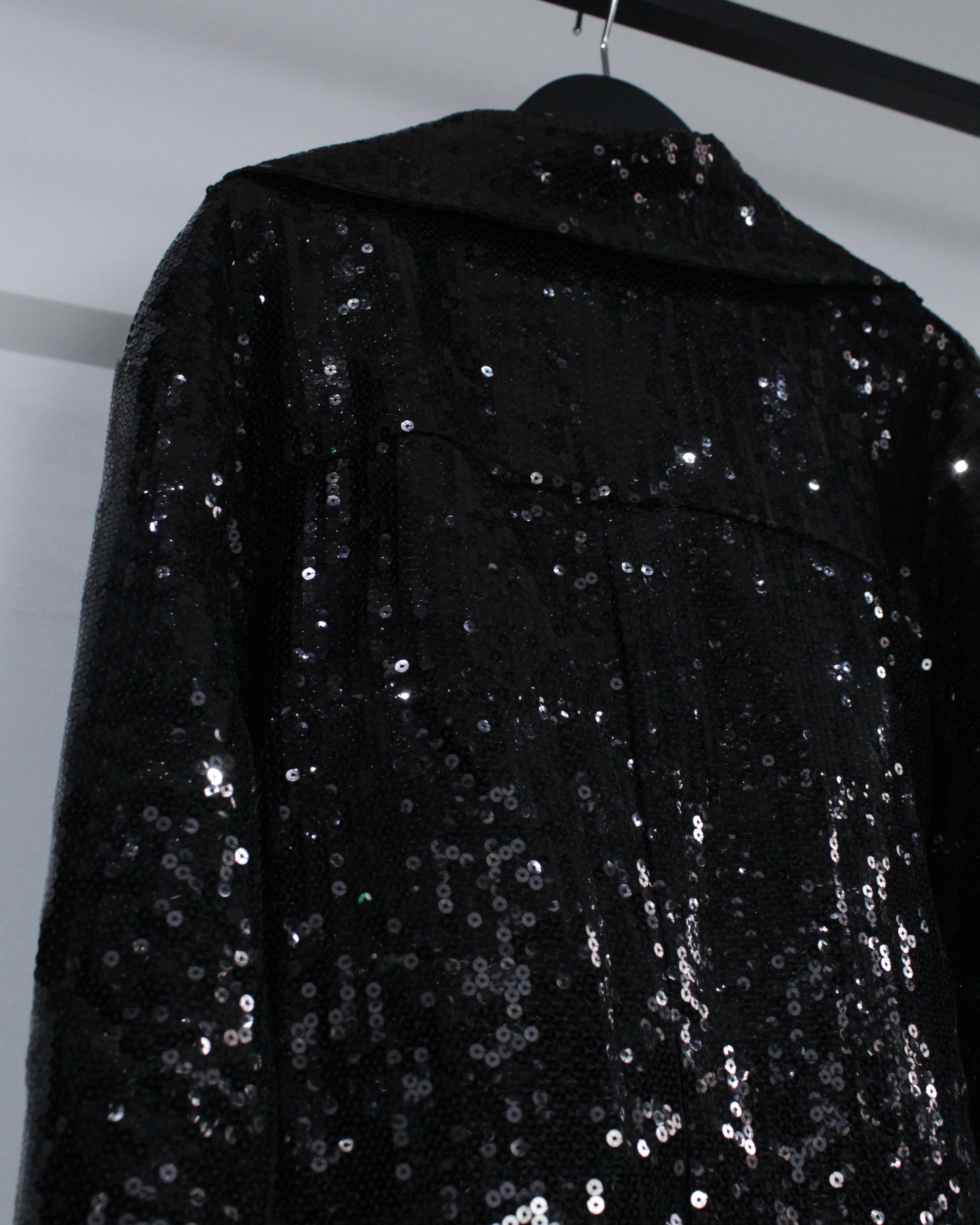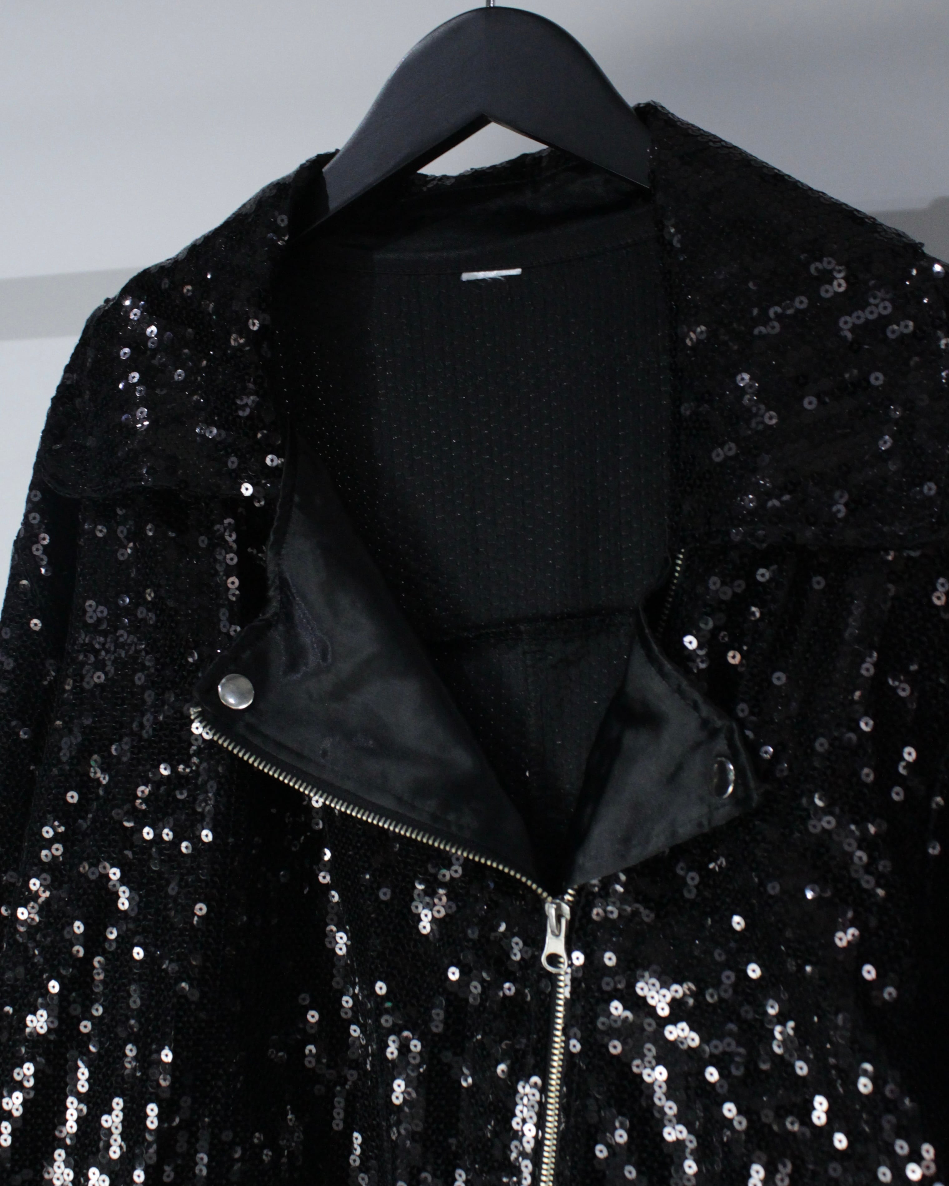 全面にびっしりとスパンコールを敷き詰めた、ラグジュアリーな存在感を放つブラックのダブルライダース型ジャケット。