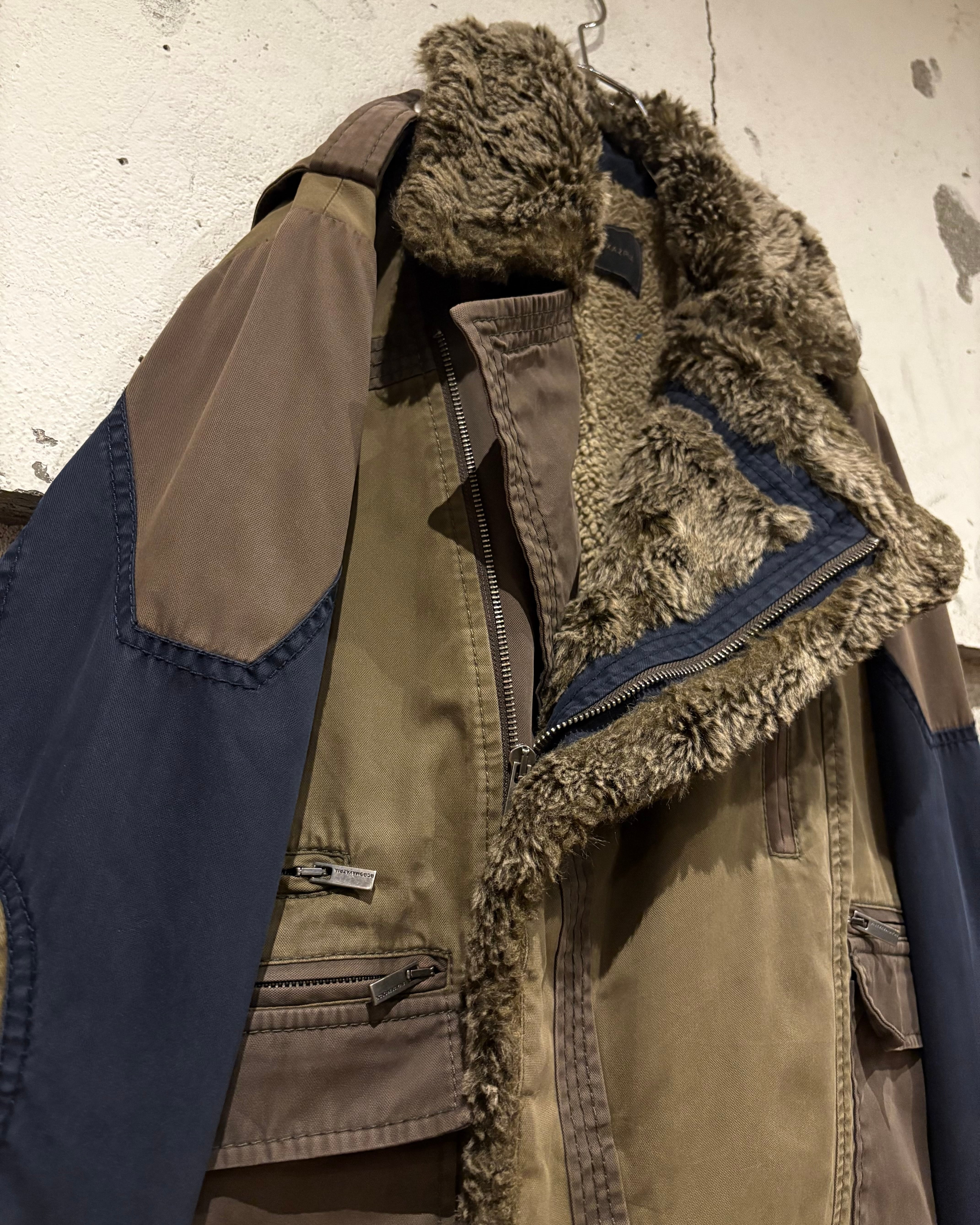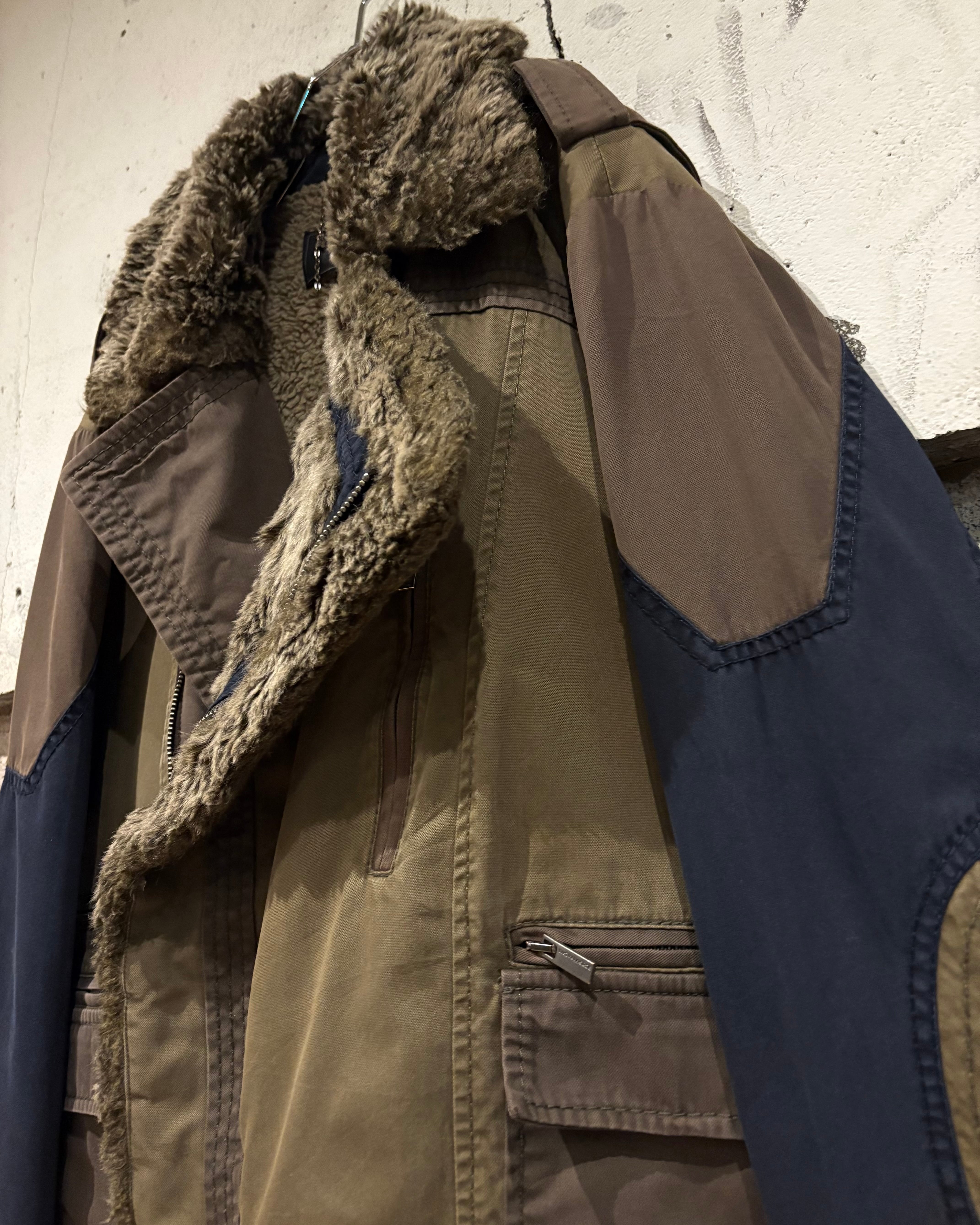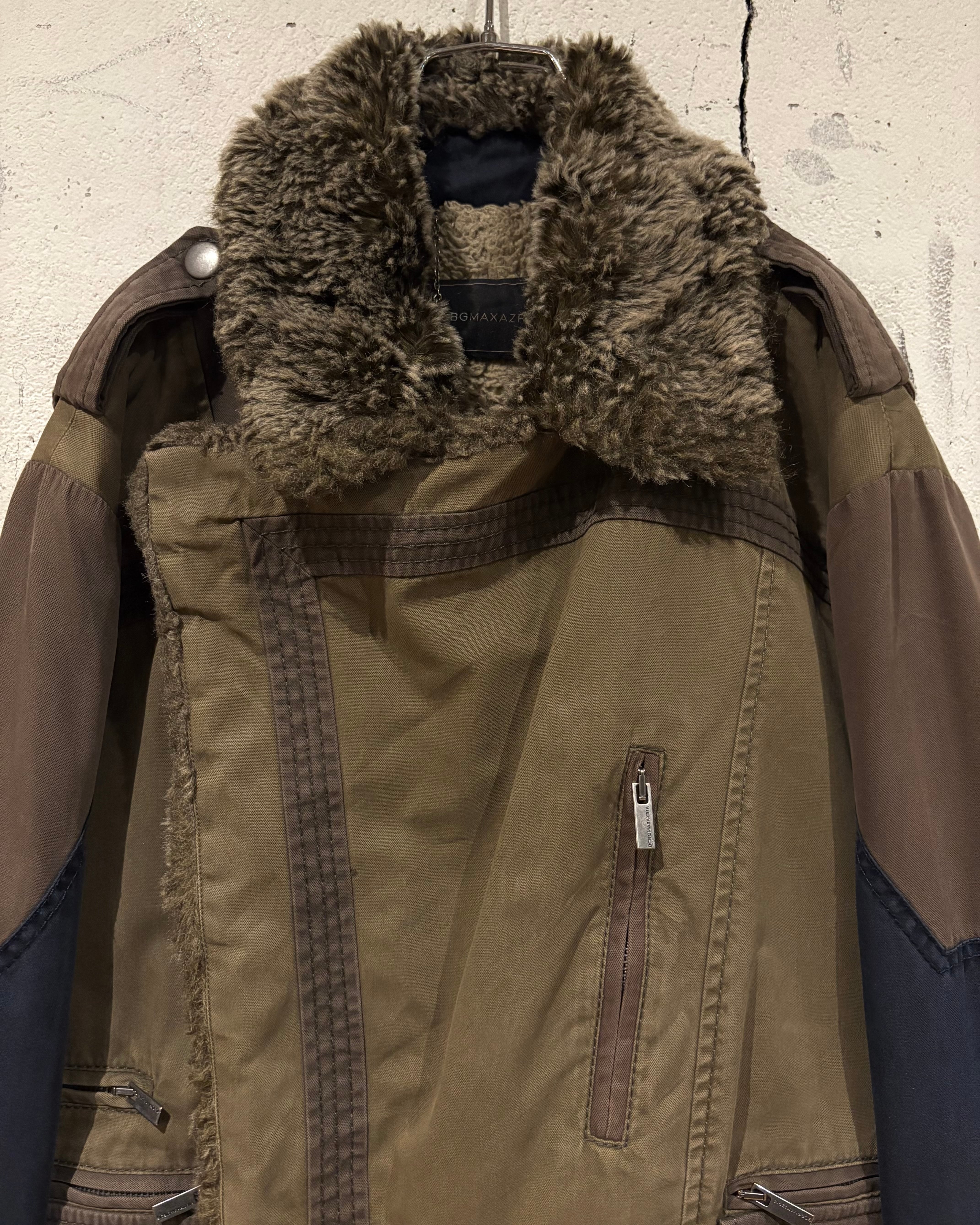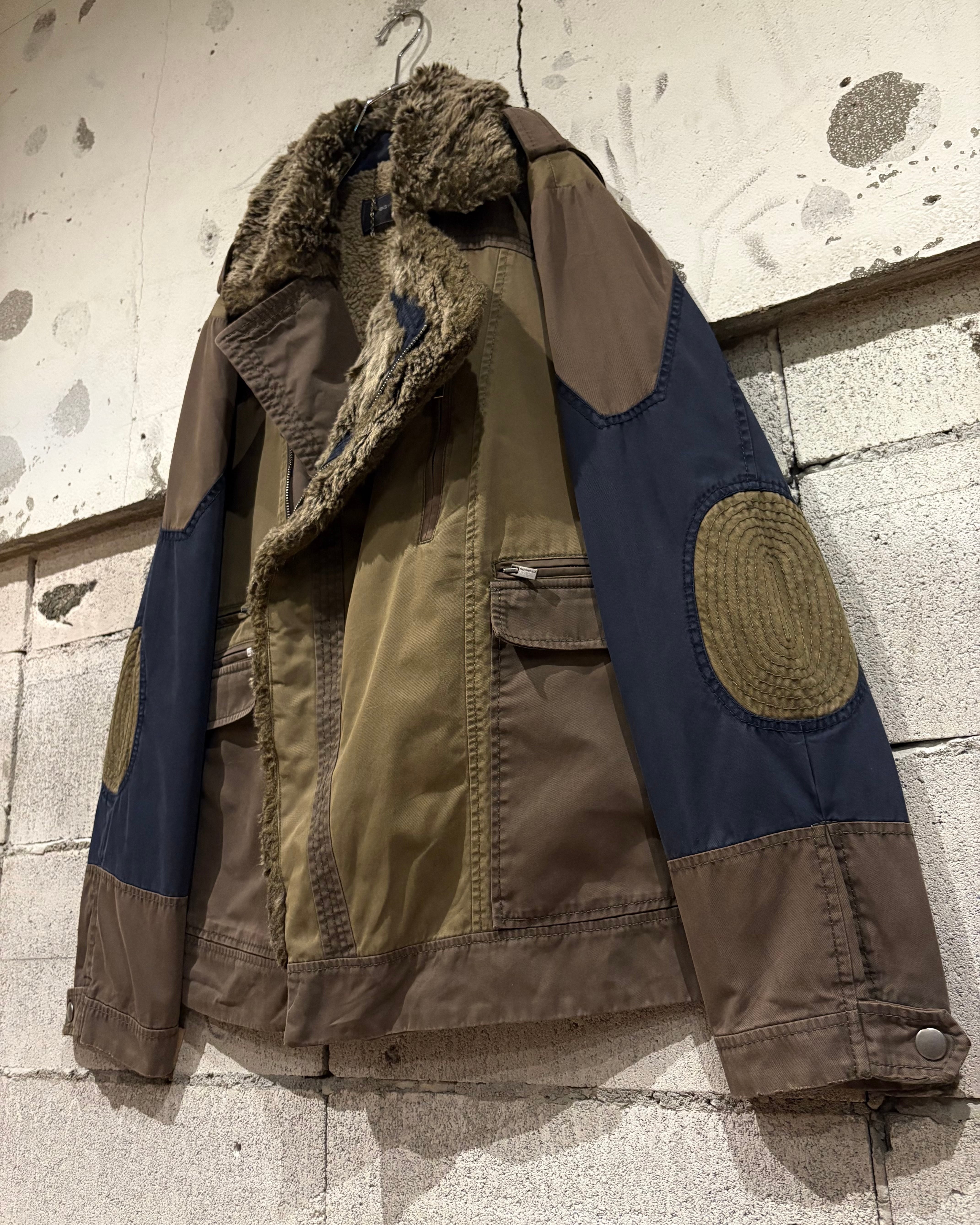 ダブルライダース特有の武骨さに、カラー切り替えのモード感、そしてボアの存在感が合わさった唯一無二の1着。冬のスタイリングの主役として間違いなく活躍する逸品です。