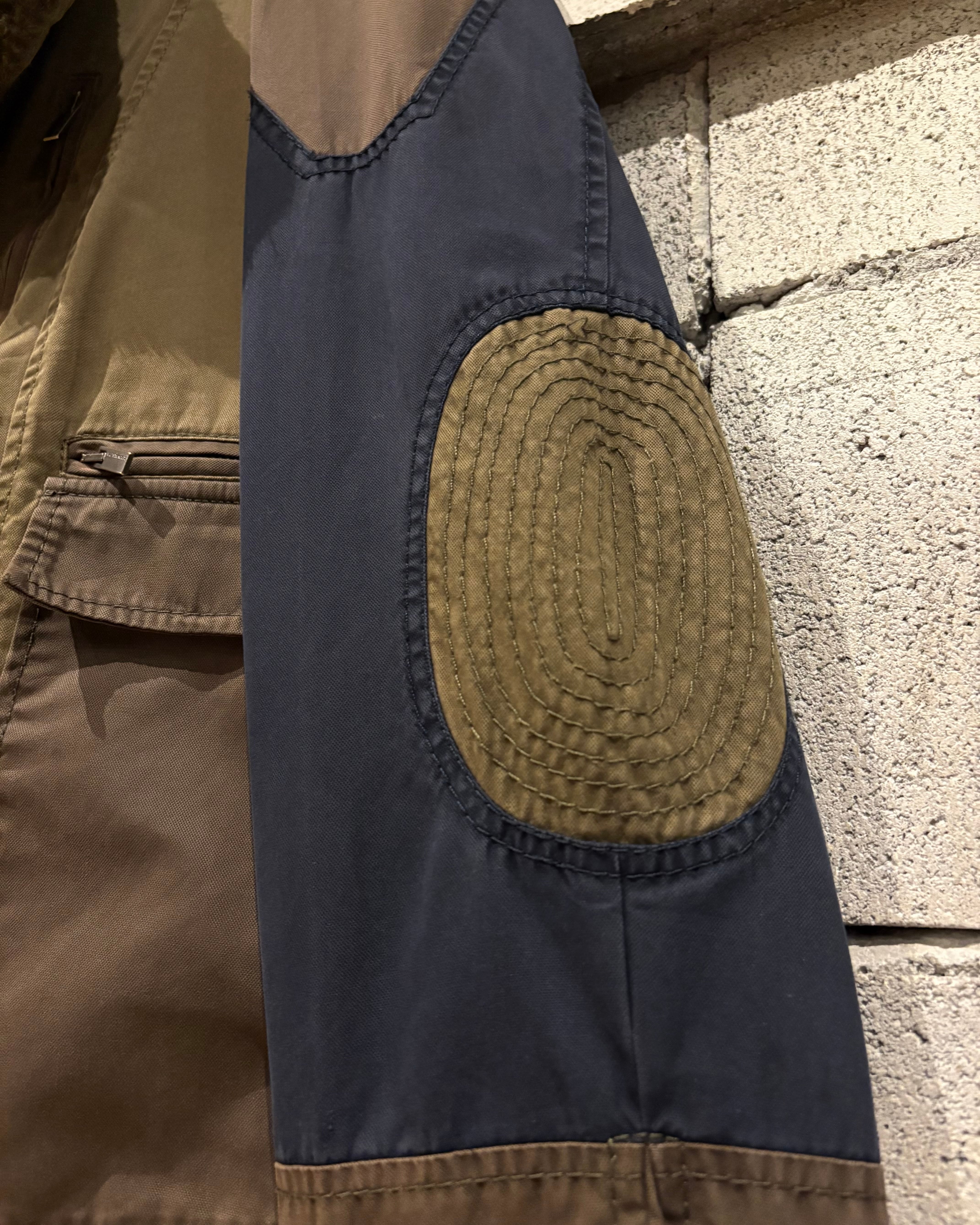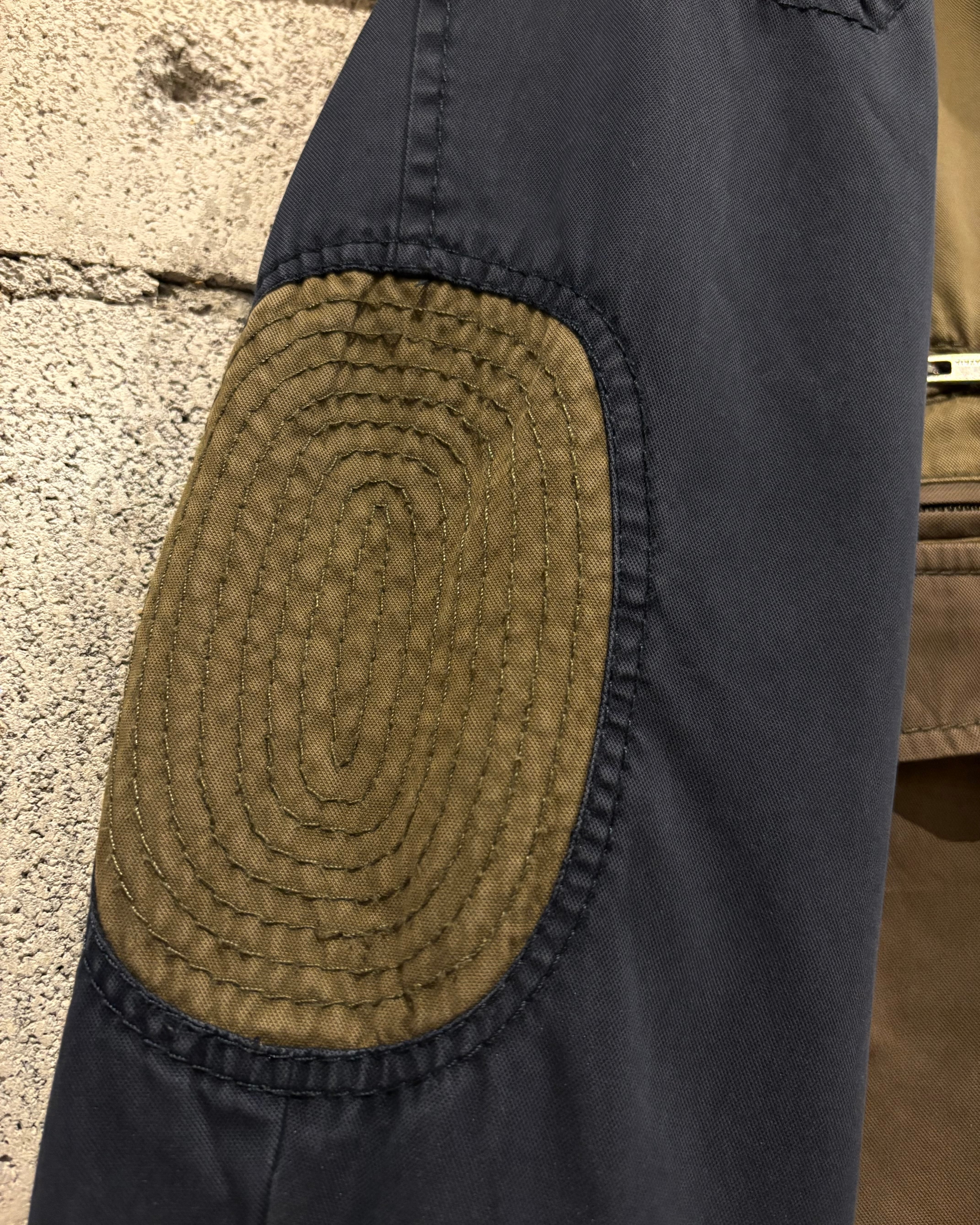 ブラウン、カーキ、ネイビーを切り替え、ダークトーンで統一感を保ちながら立体感と奥行きを生み出した1着。