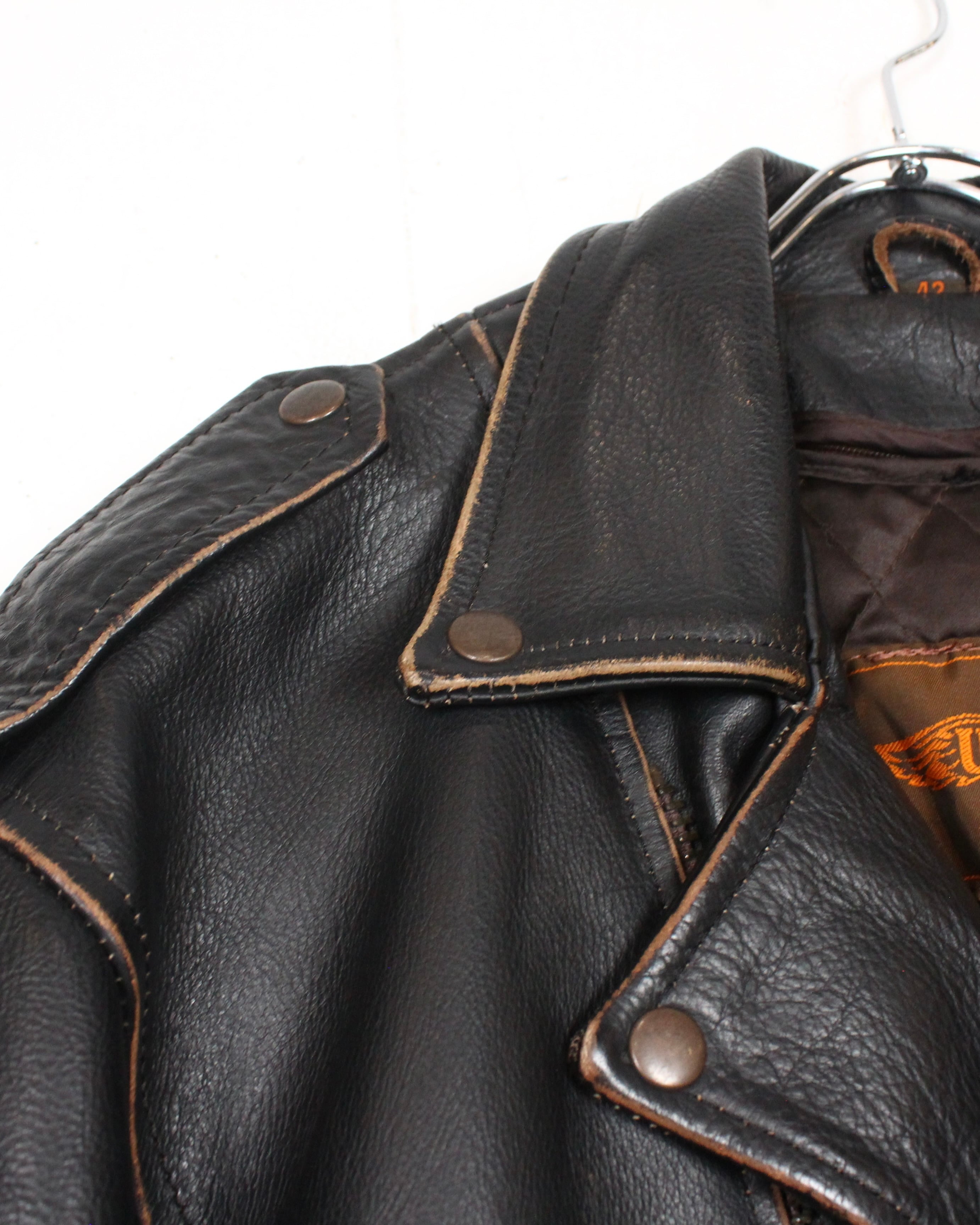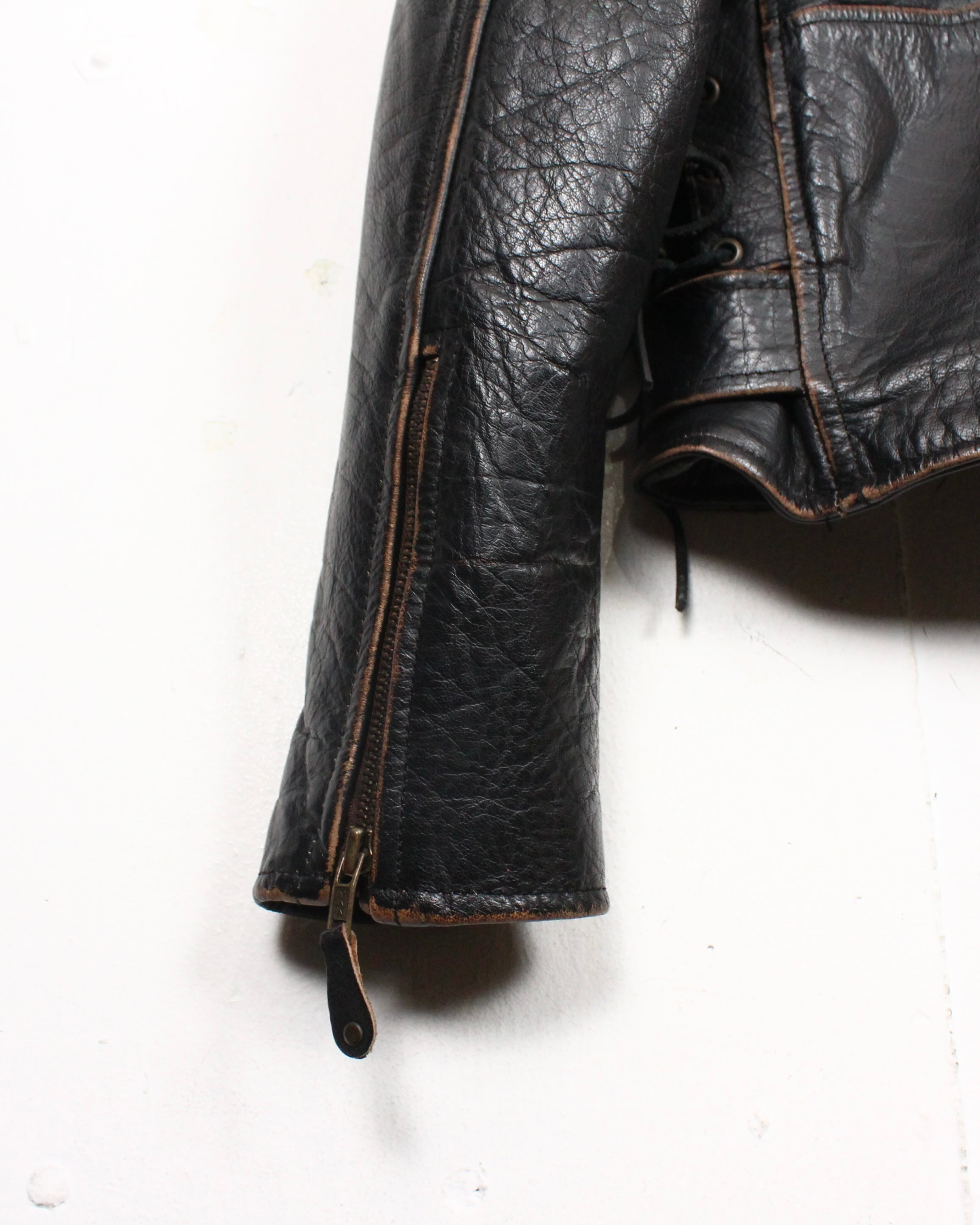 レザーは分厚くタフなカウレザーで、魅力的なポイントは長年の着用によって自然と生まれた深いエイジング。ステッチ周りやシームラインに沿って浮かぶブラウンの色抜けが、ブラックレザーに立体的な陰影を生み、独特の味として強烈な魅力を放っています。