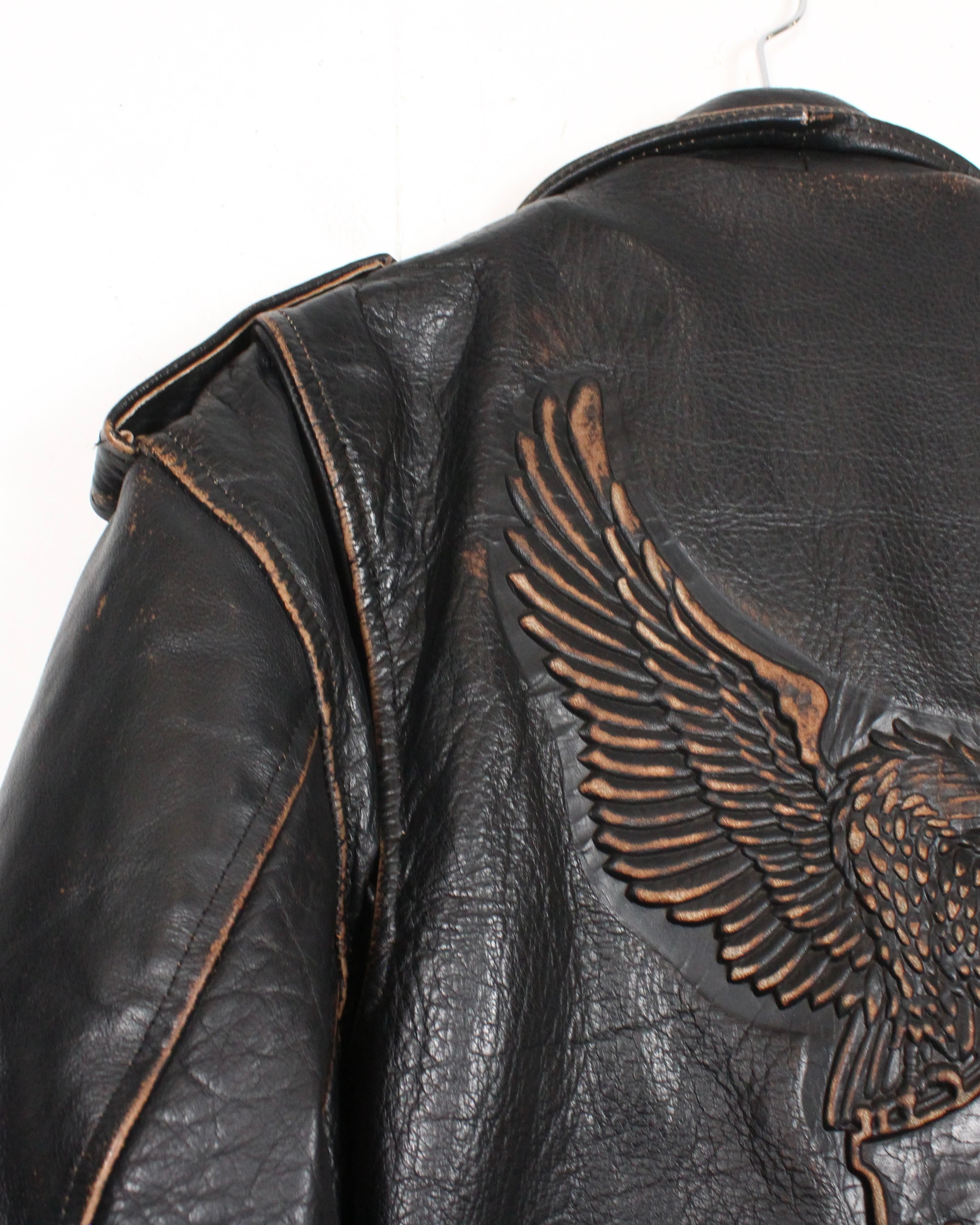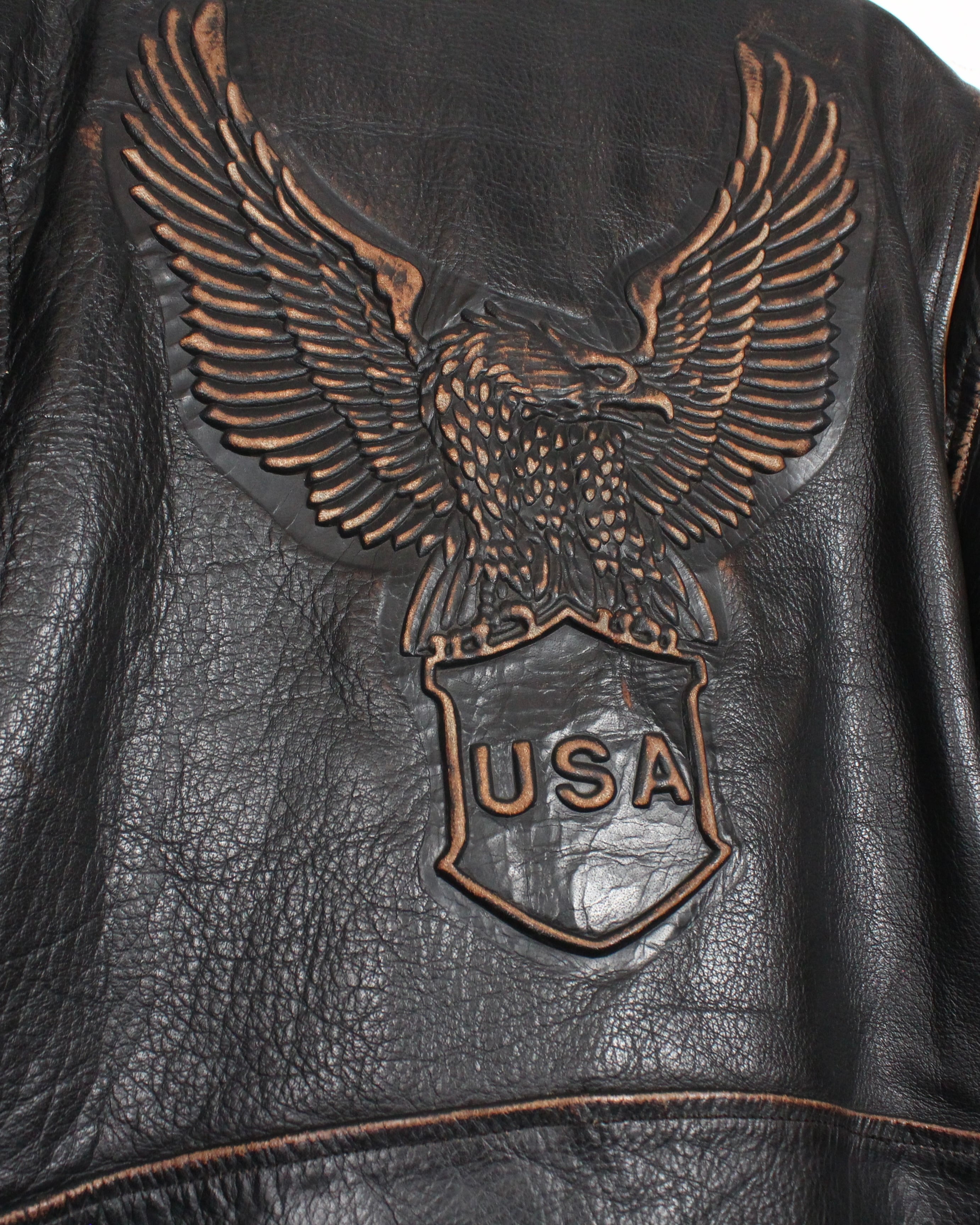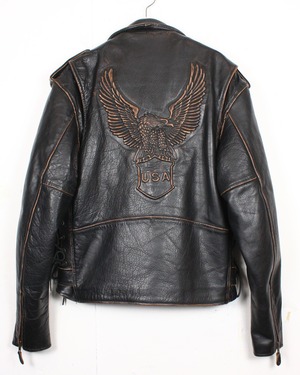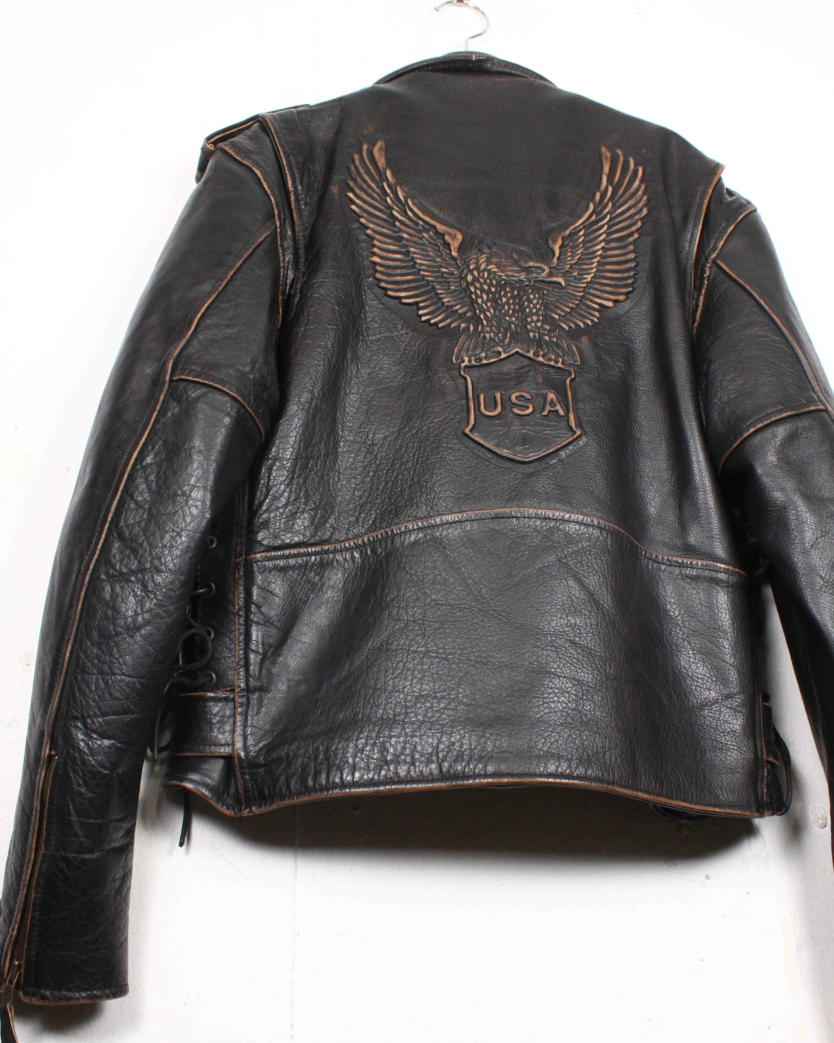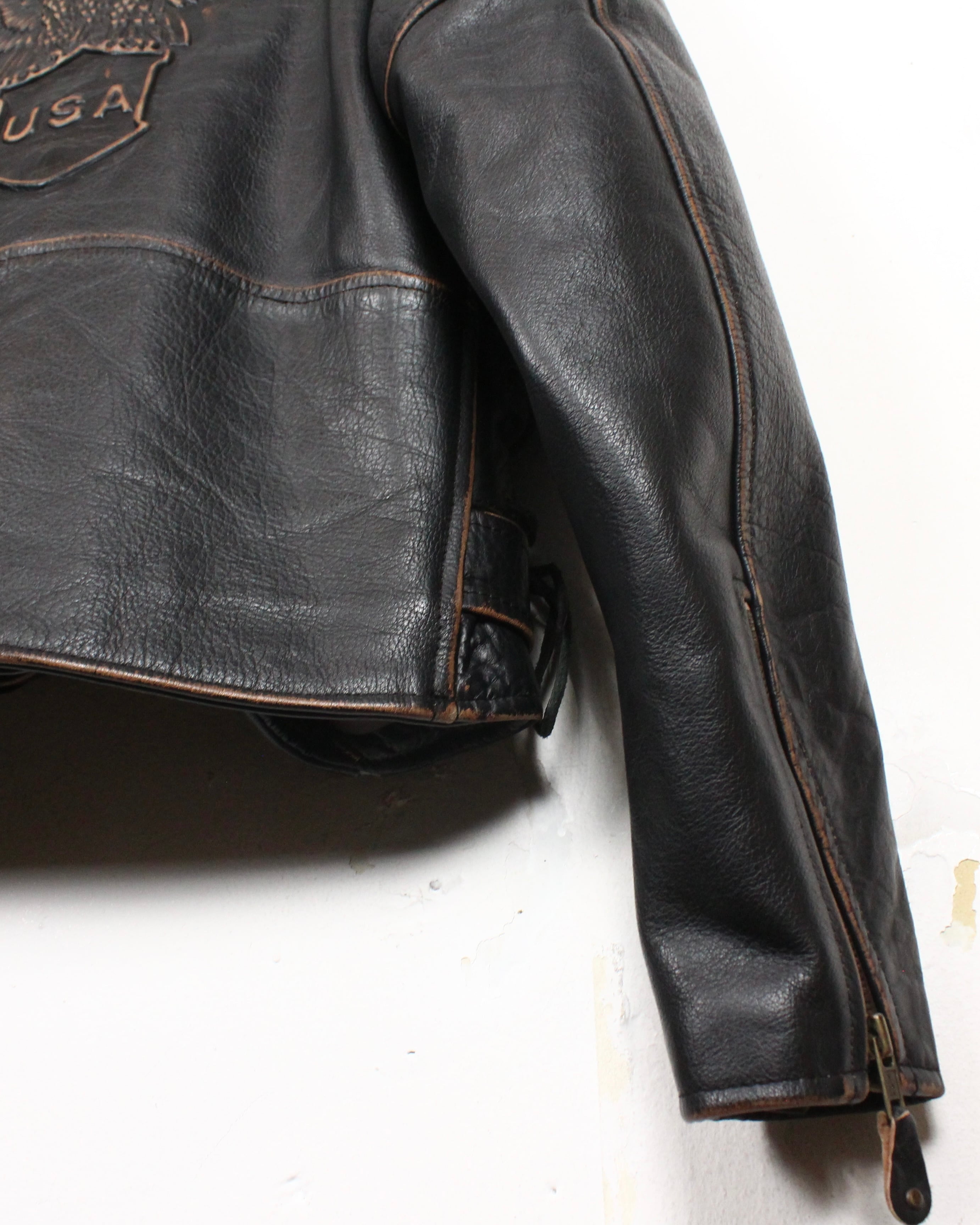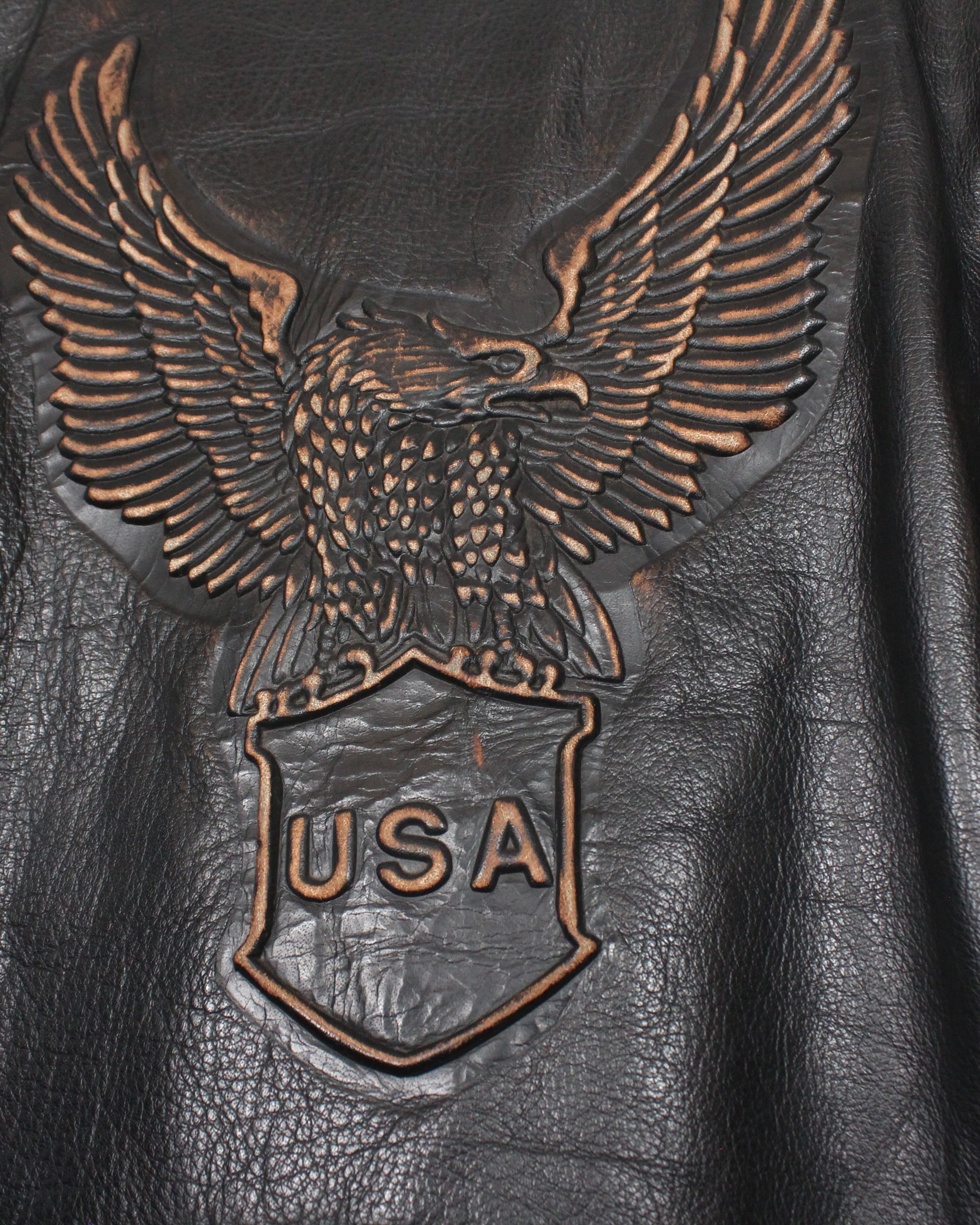 背面に巨大イーグル×USAロゴシールドのエンボスを大胆に配置した、象徴的かつ圧倒的な存在感を放つダブルライダースジャケット。