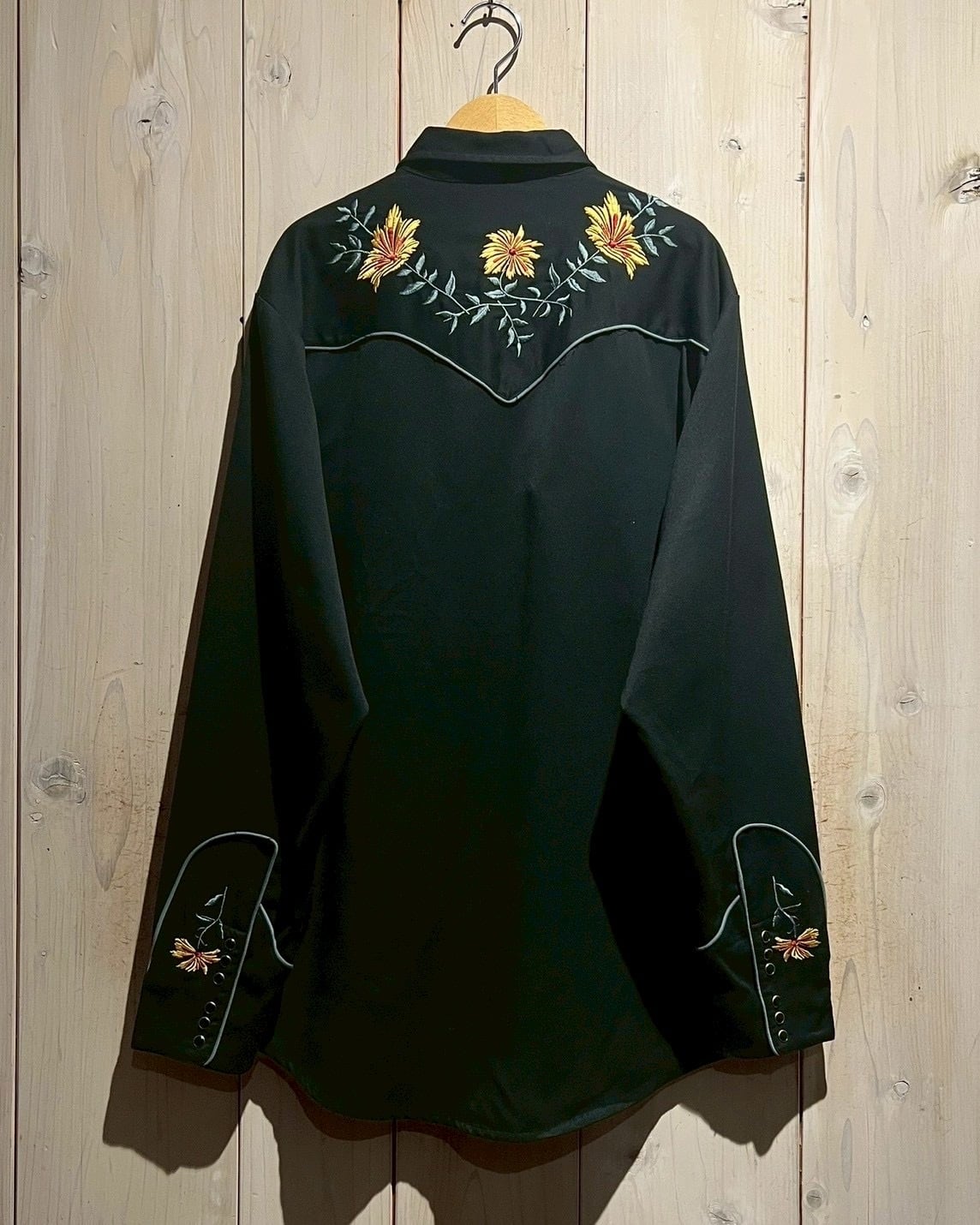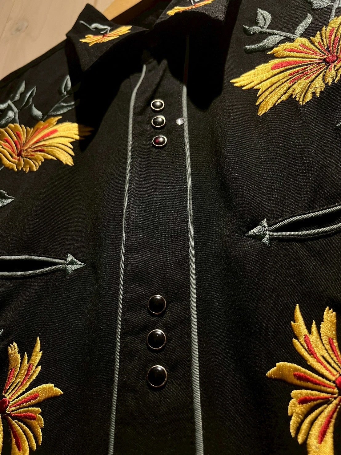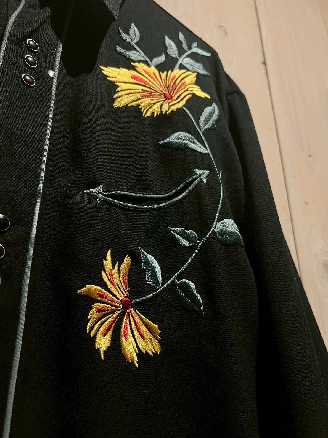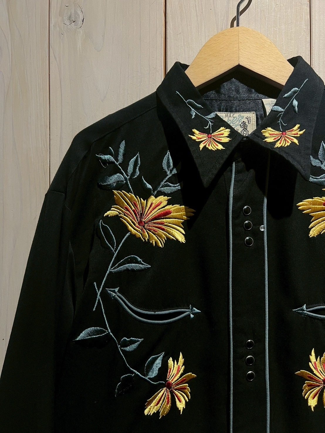 ハリのあるツイル織りのブラックボディをベースに、ゴールドの花の刺繍をフロント、バックヨーク、カフスへ贅沢に配したウエスタンシャツ。