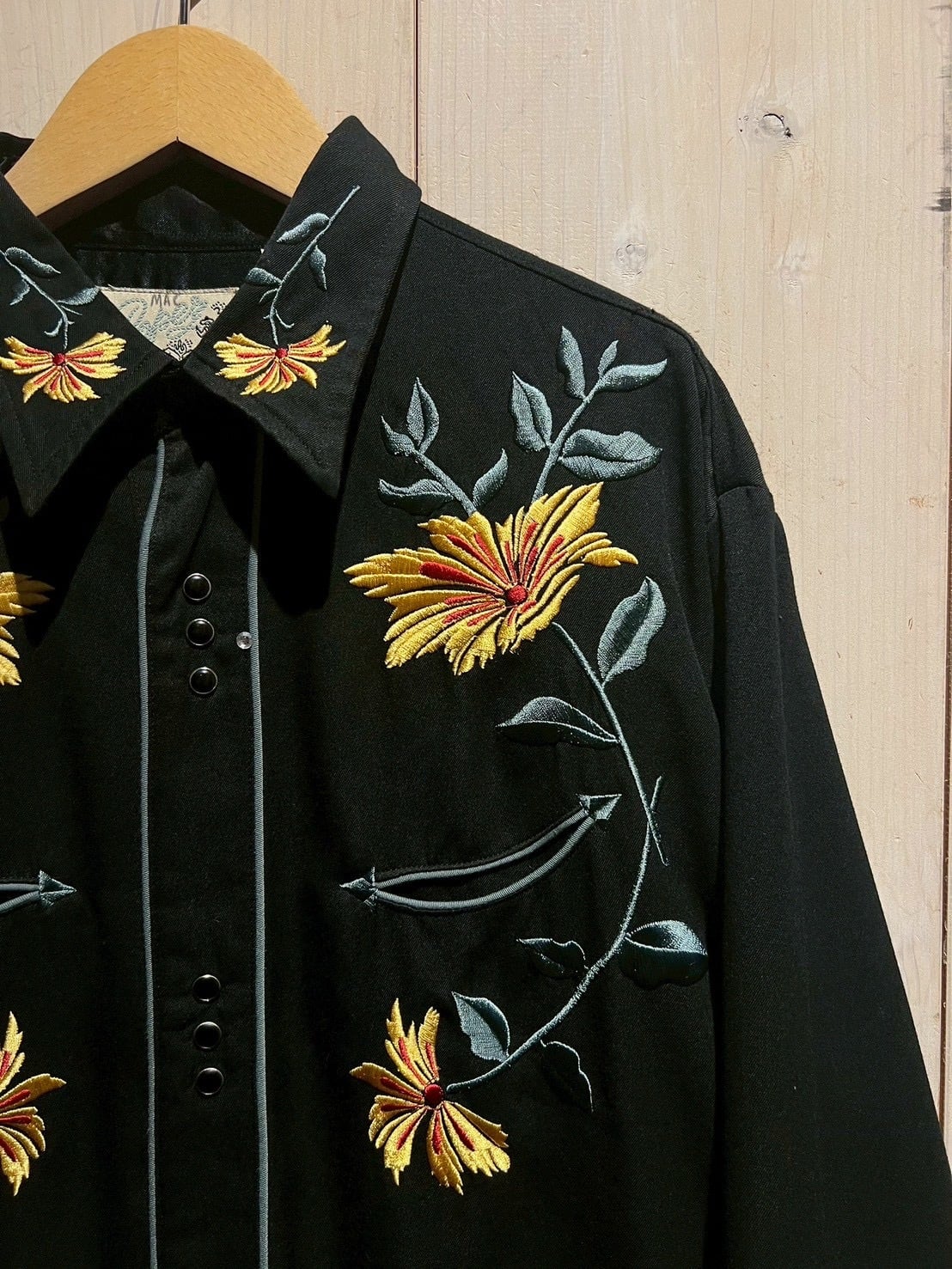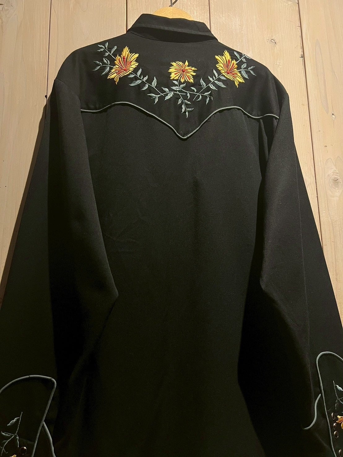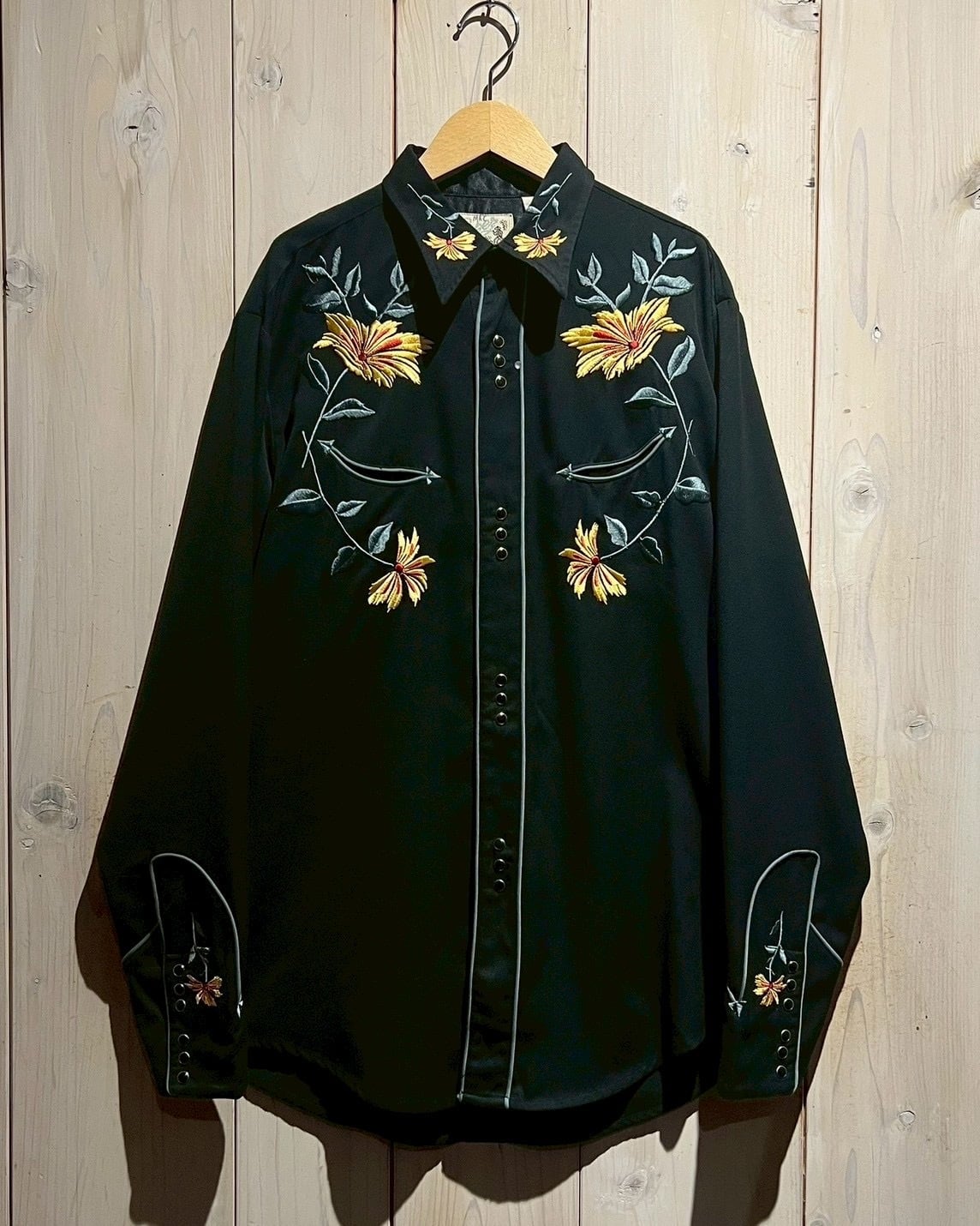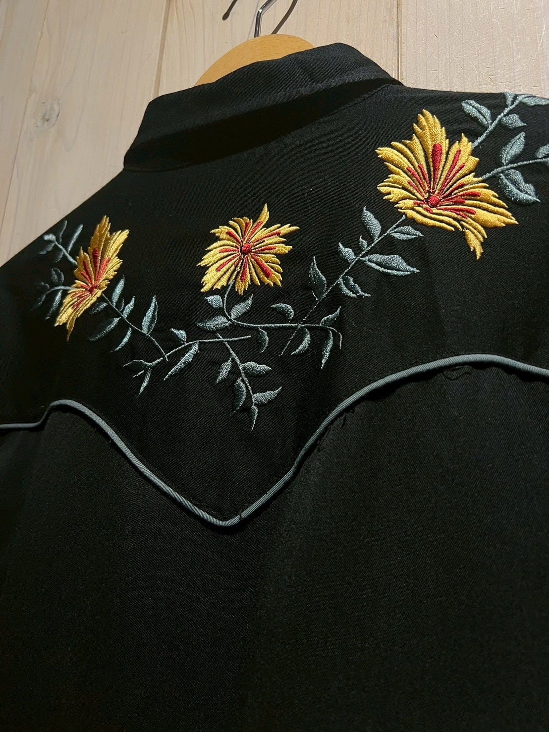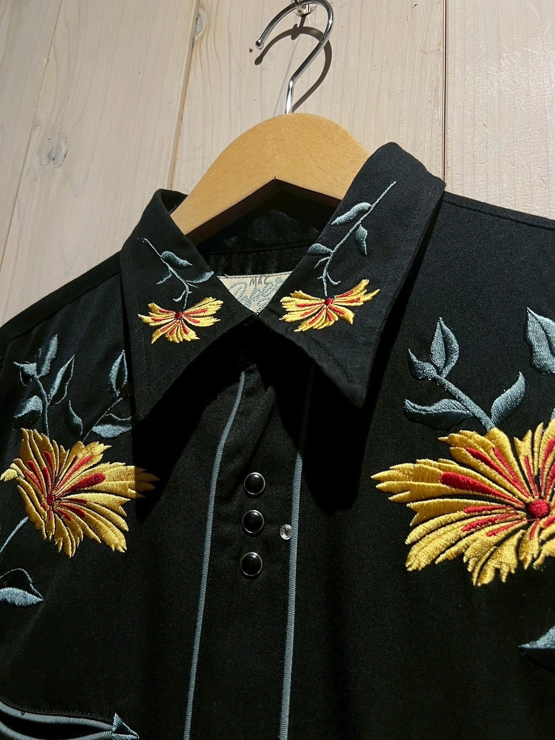 ハリのあるツイル織りのブラックボディをベースに、ゴールドの花の刺繍をフロント、バックヨーク、カフスへ贅沢に配したウエスタンシャツ。