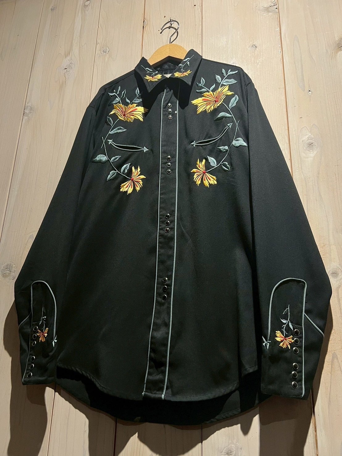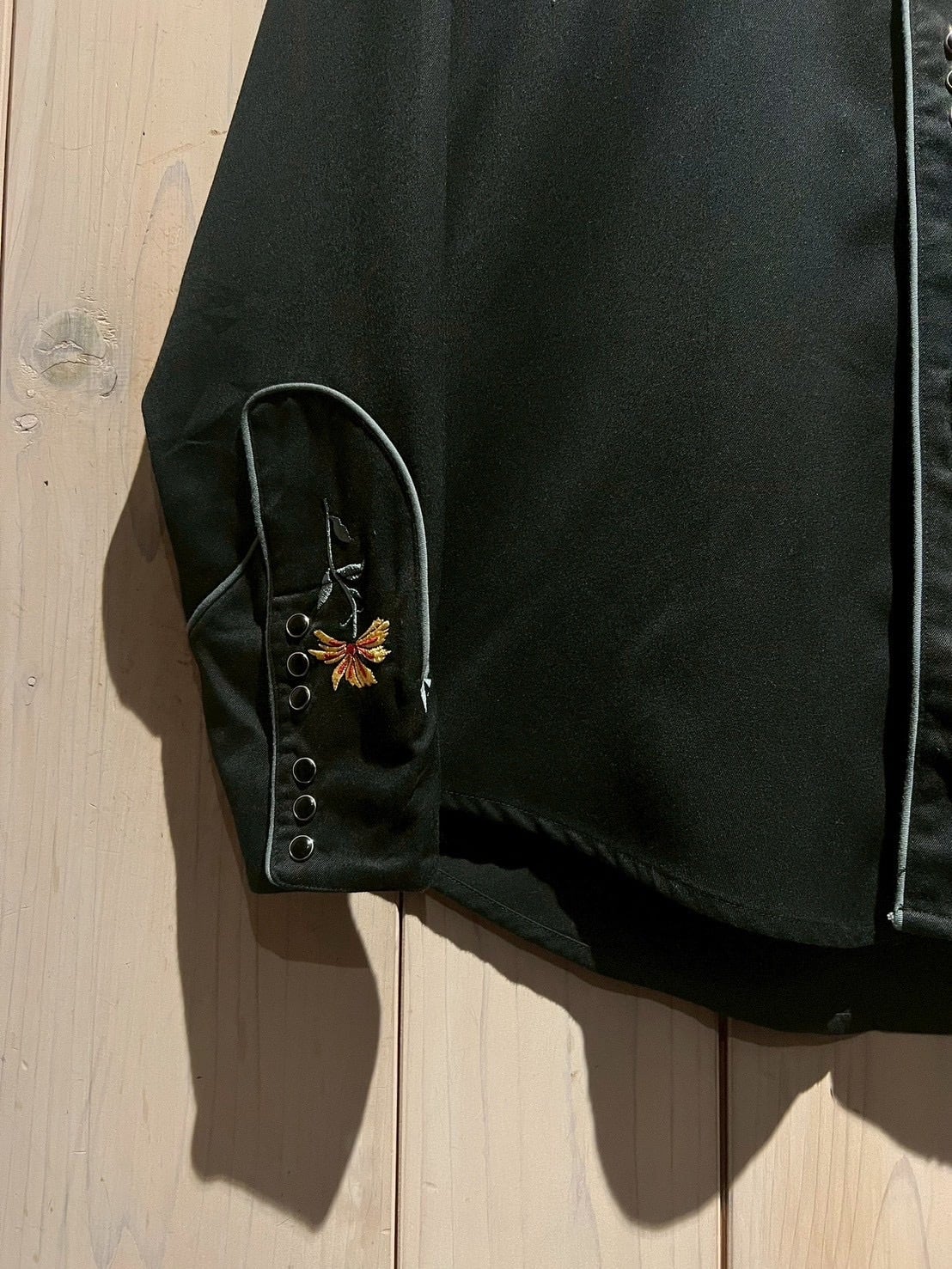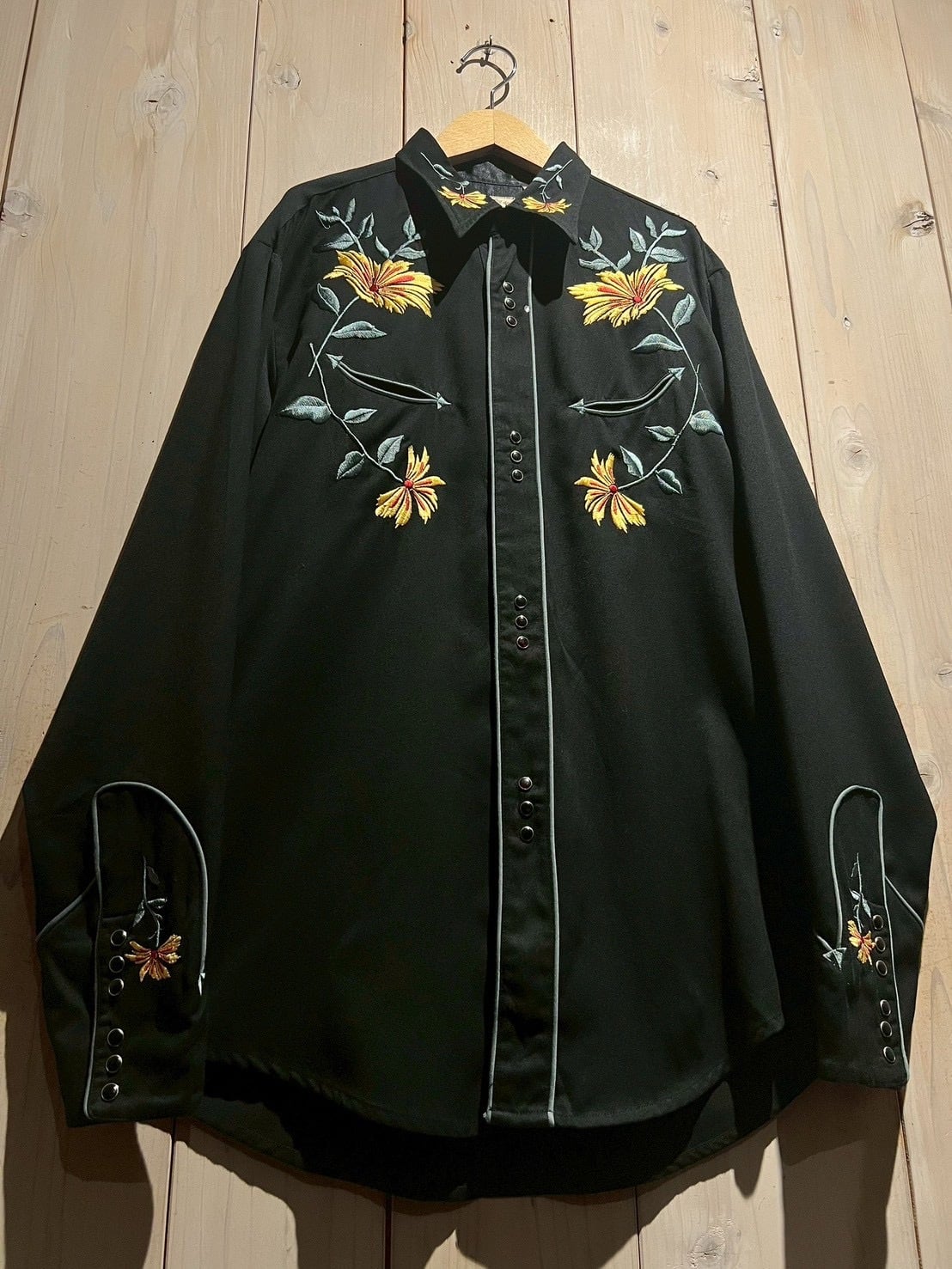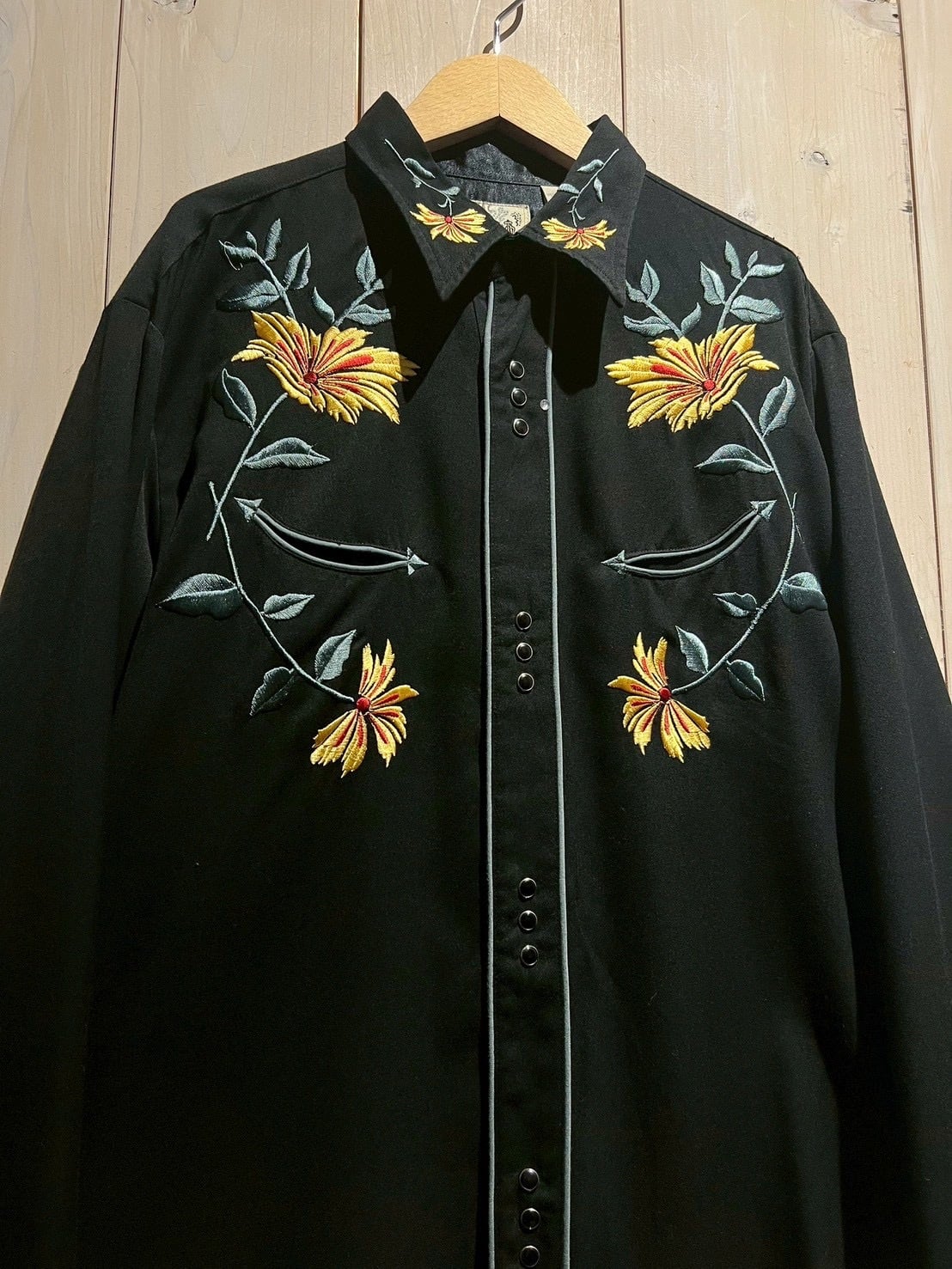 ハリのあるツイル織りのブラックボディをベースに、ゴールドの花の刺繍をフロント、バックヨーク、カフスへ贅沢に配したウエスタンシャツ。