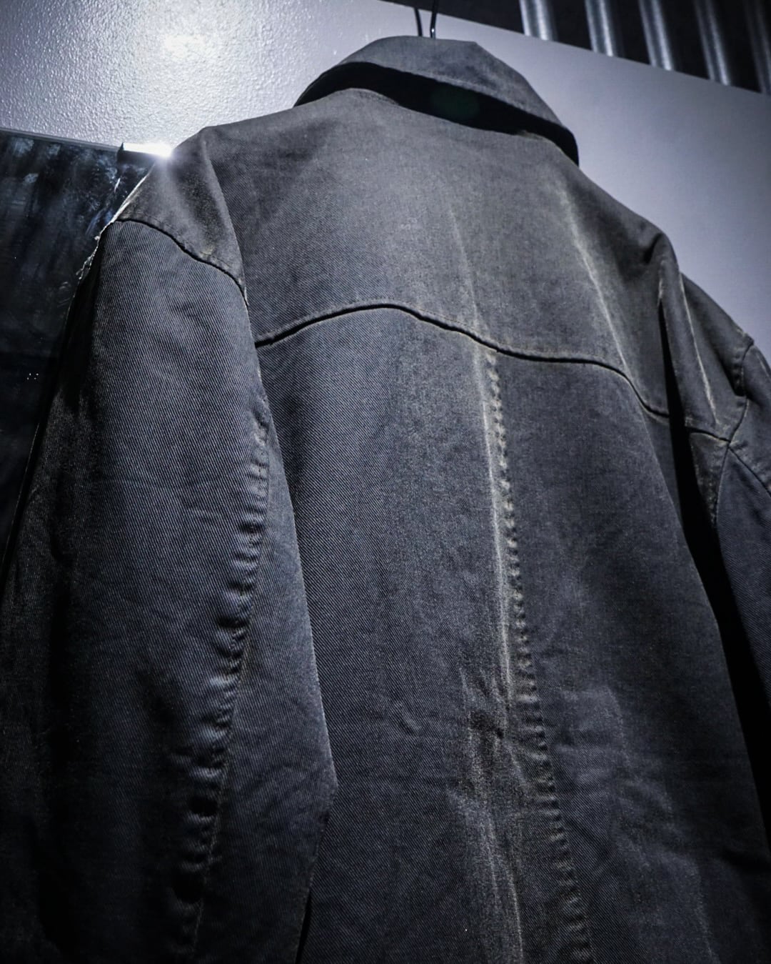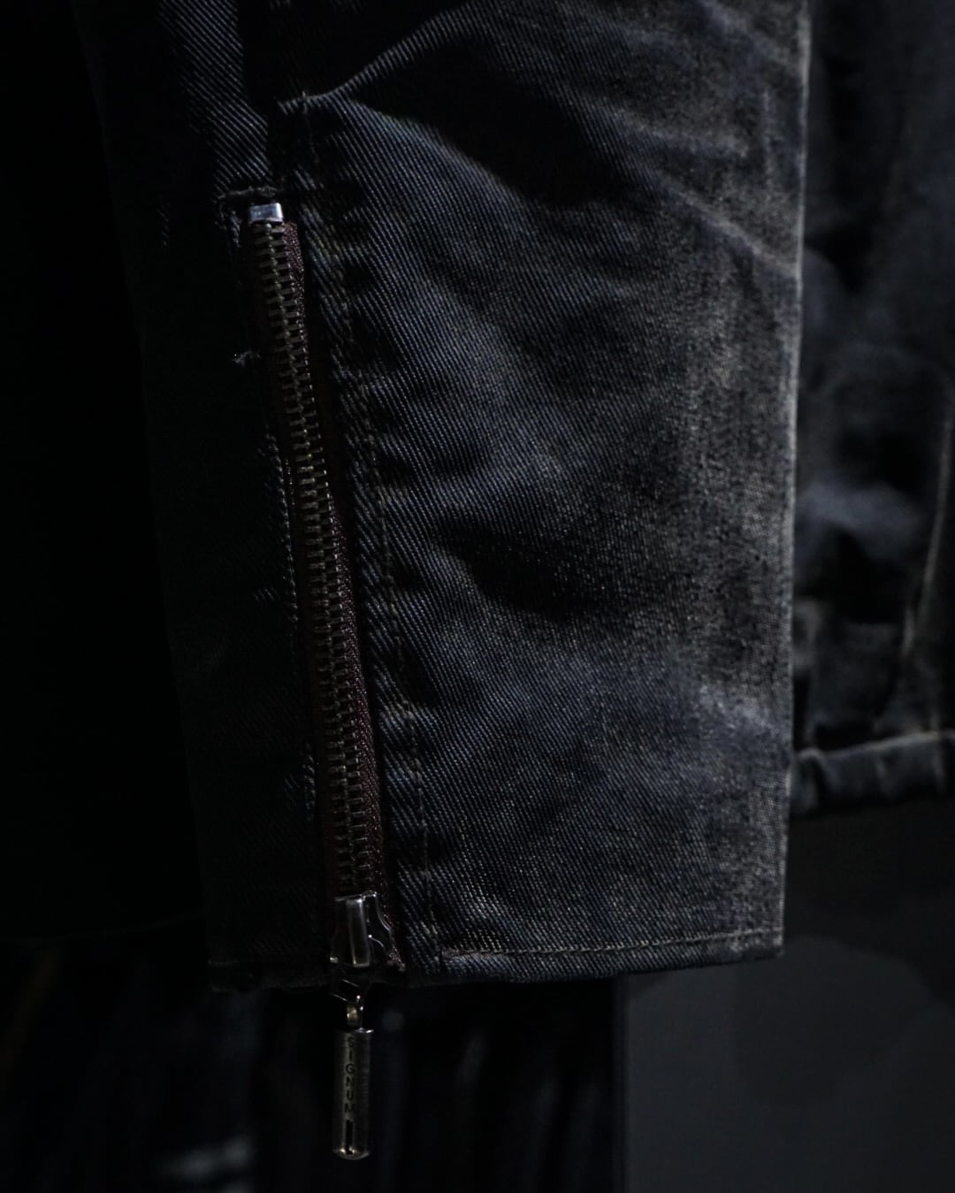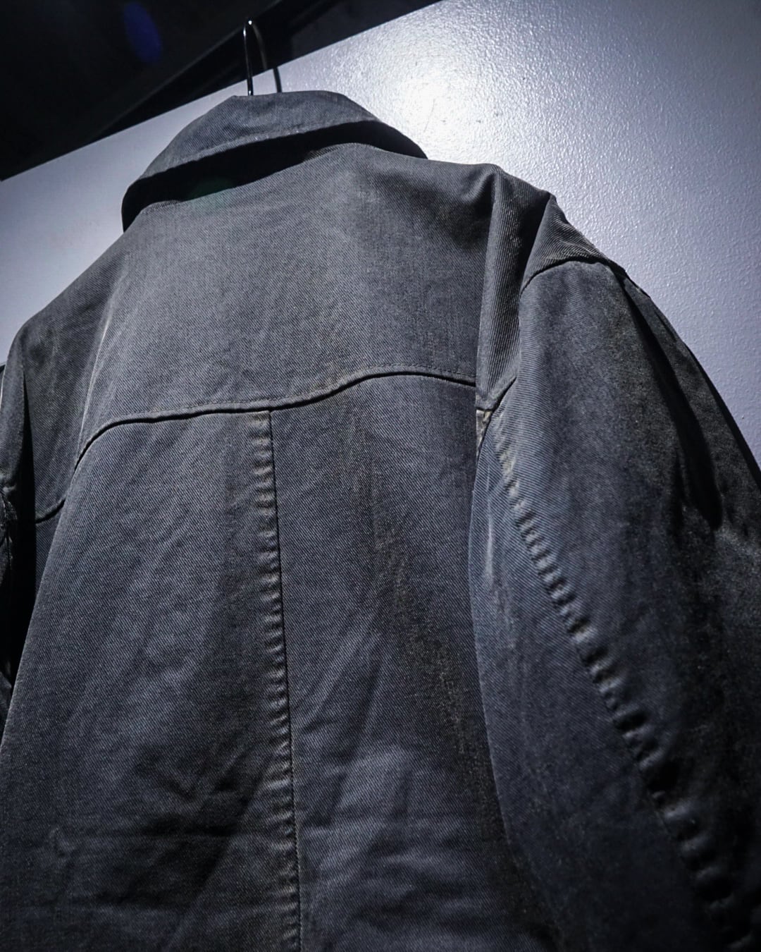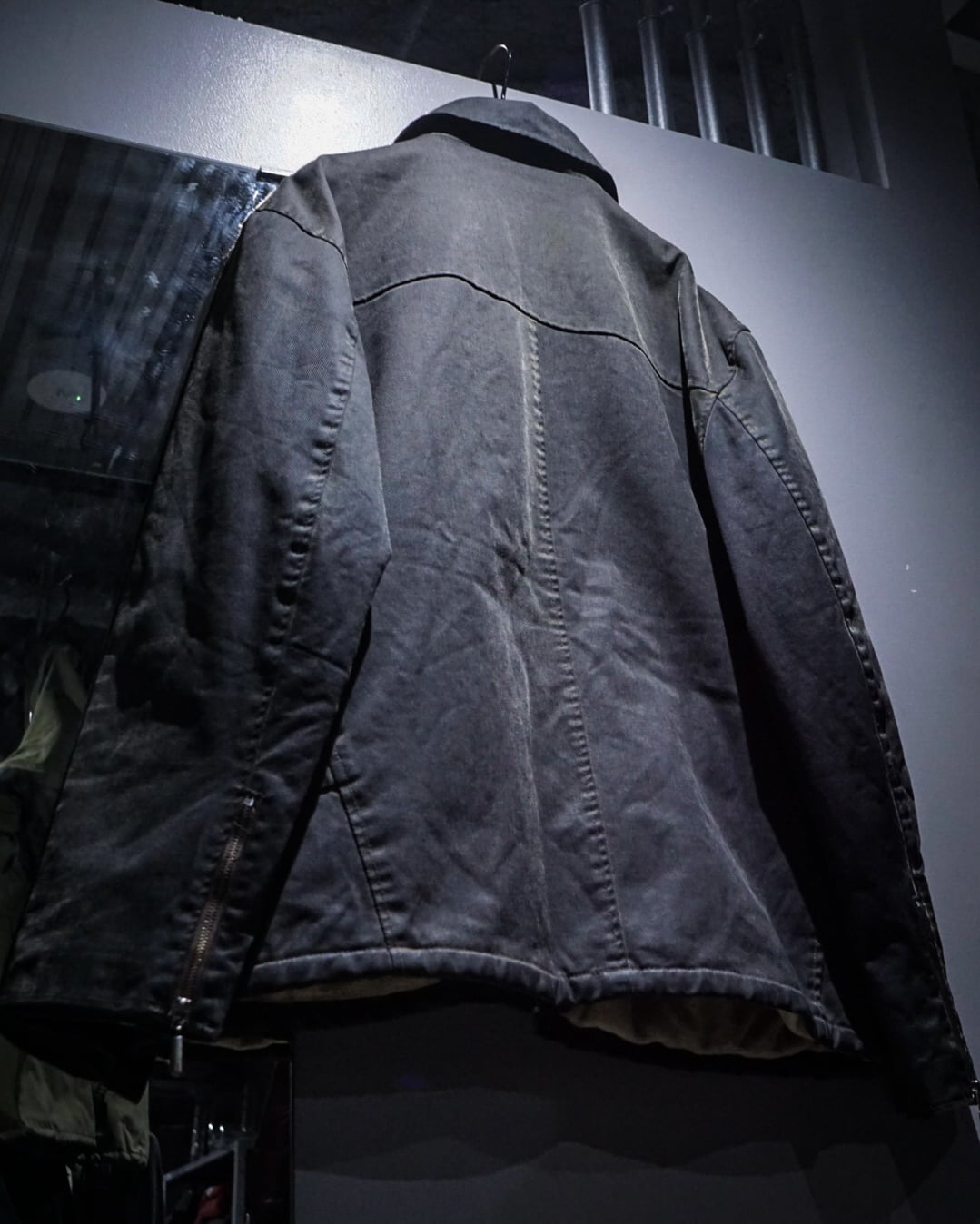 ハリのあるコットンのボディに、コーティングが施されたジャケット。光の当たり方でレザーのような鈍い艶をまとい、無骨ながら上品な雰囲気を漂わせています。