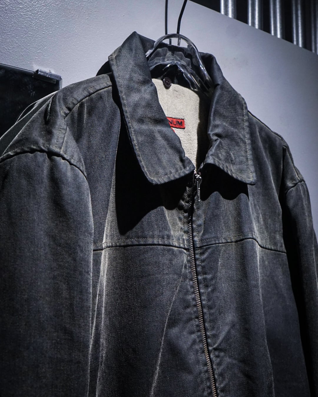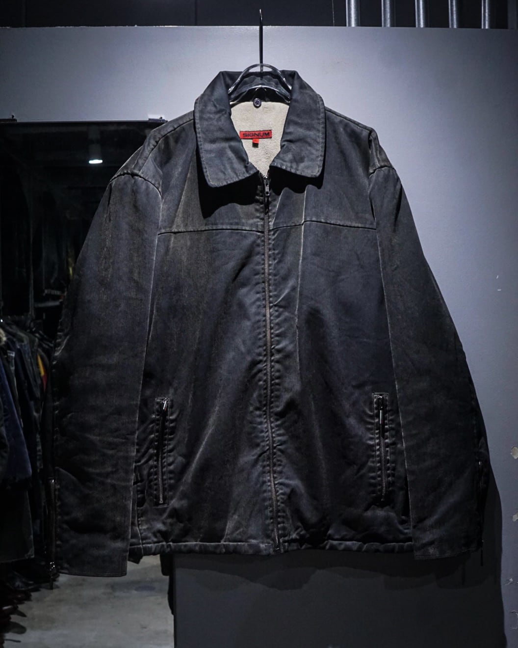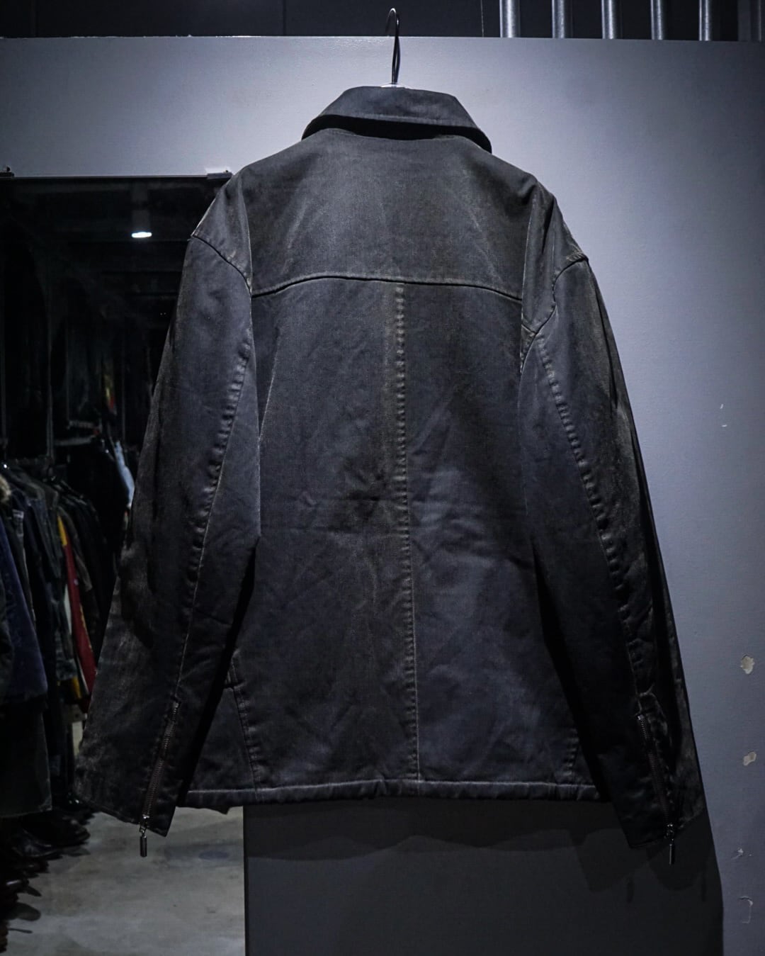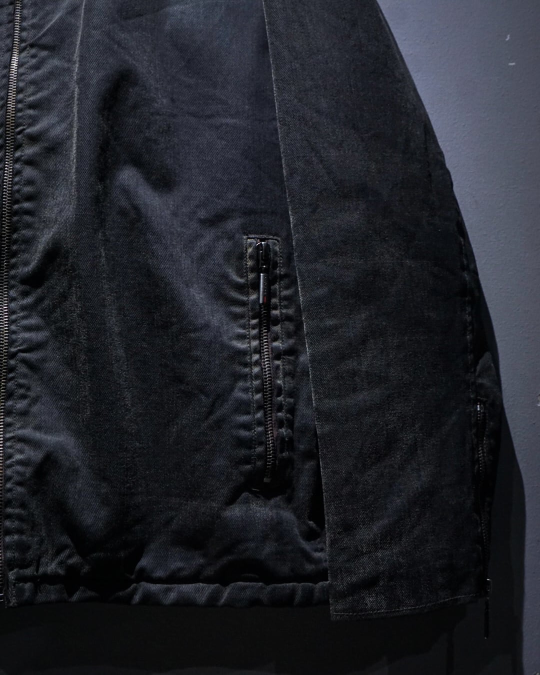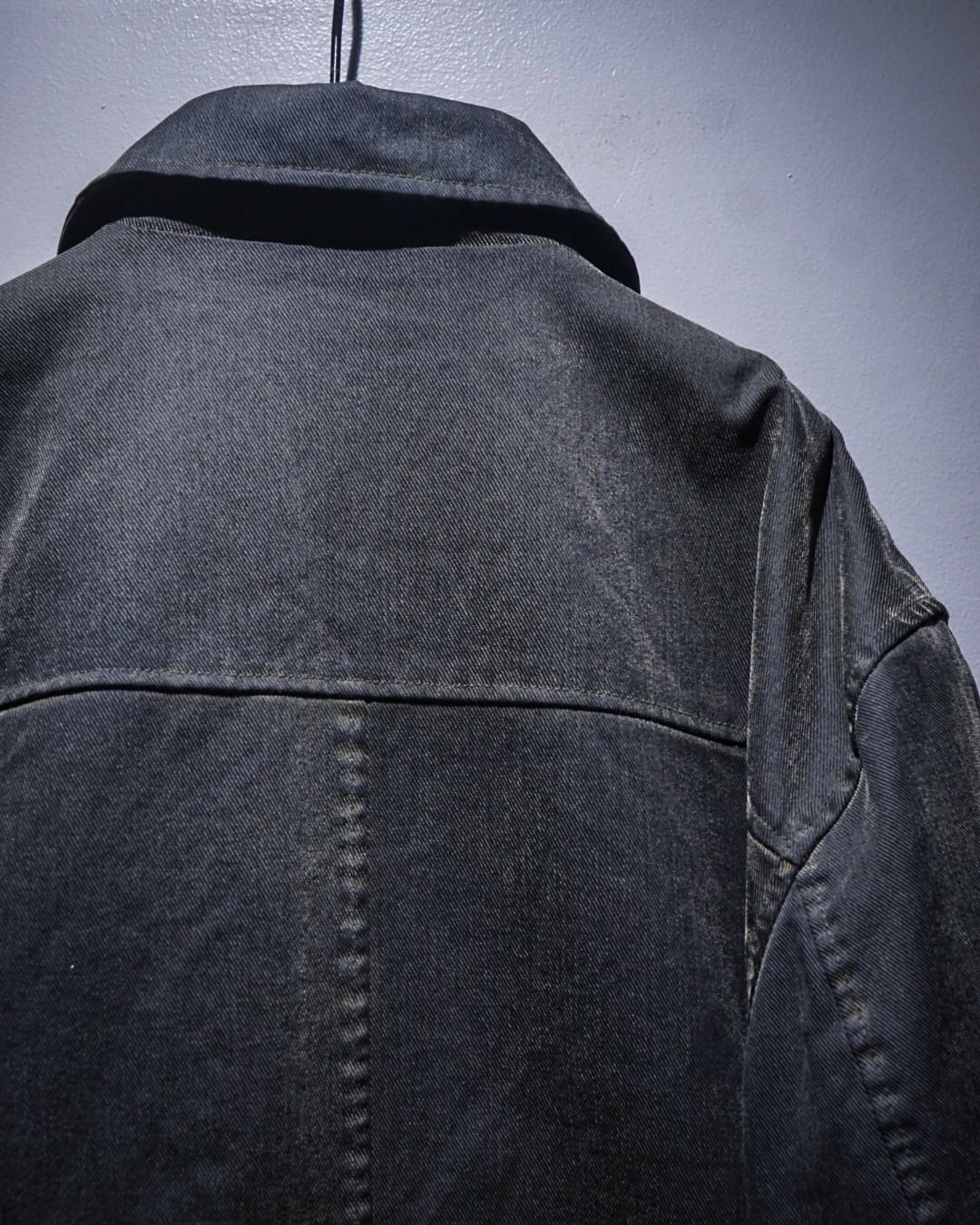 ハリのあるコットンのボディに、コーティングが施されたジャケット。光の当たり方でレザーのような鈍い艶をまとい、無骨ながら上品な雰囲気を漂わせています。