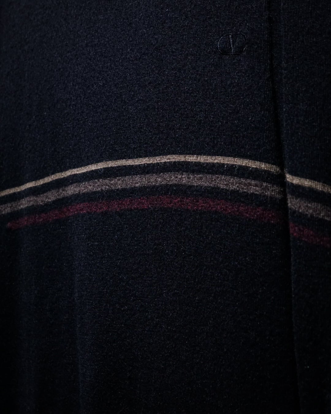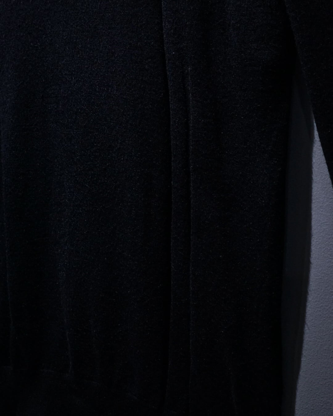 黒のボディに、胸元でさりげなく走るボーダーラインがアクセントとして効く1着。主張しすぎないミニマルな切り替えながら、立体感のある編地と相まって、ラグジュアリーブランドならではの洗練された佇まいに仕上がっています。