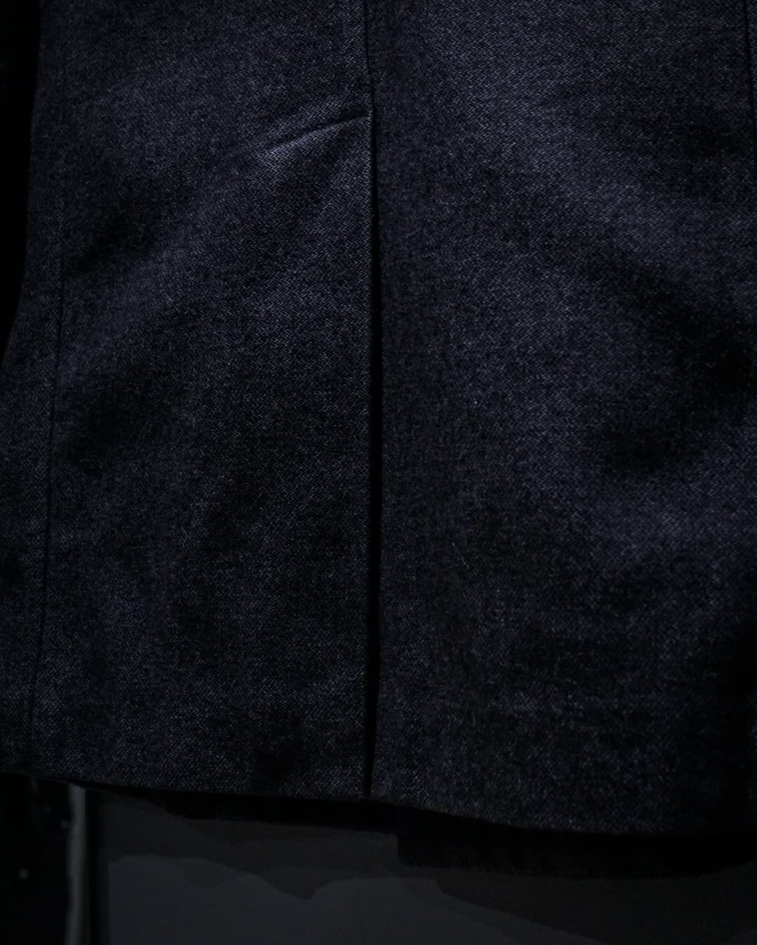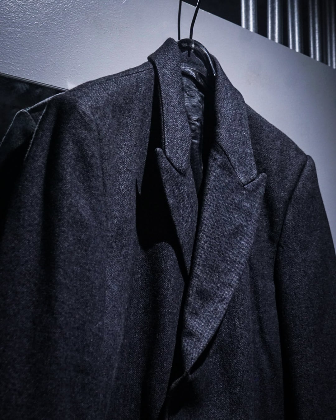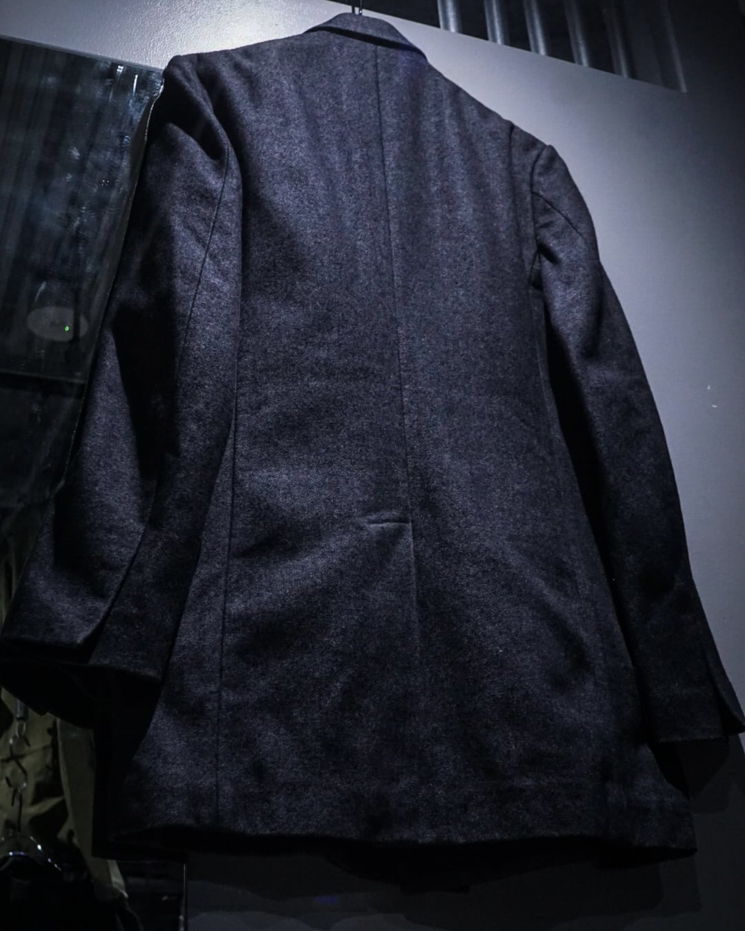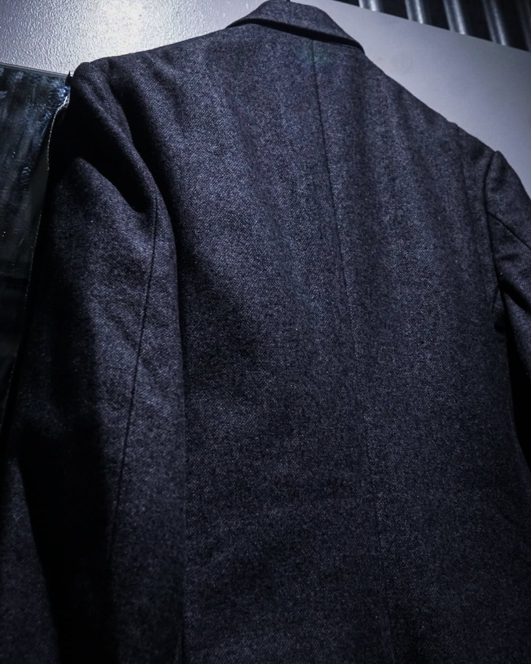 深みのあるチャコールトーンをベースに、直線的かつ洗練されたカッティングで仕立てられた1着。