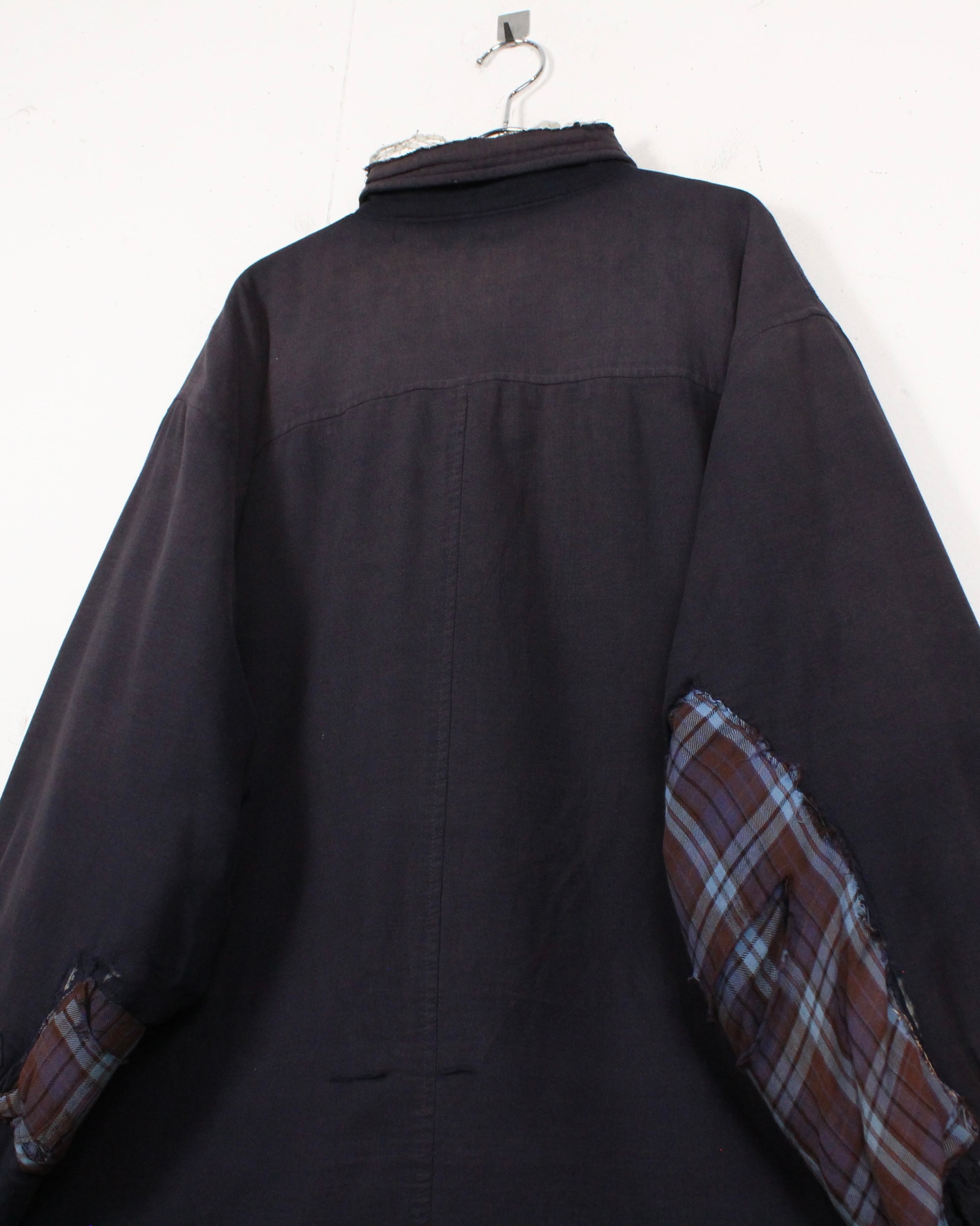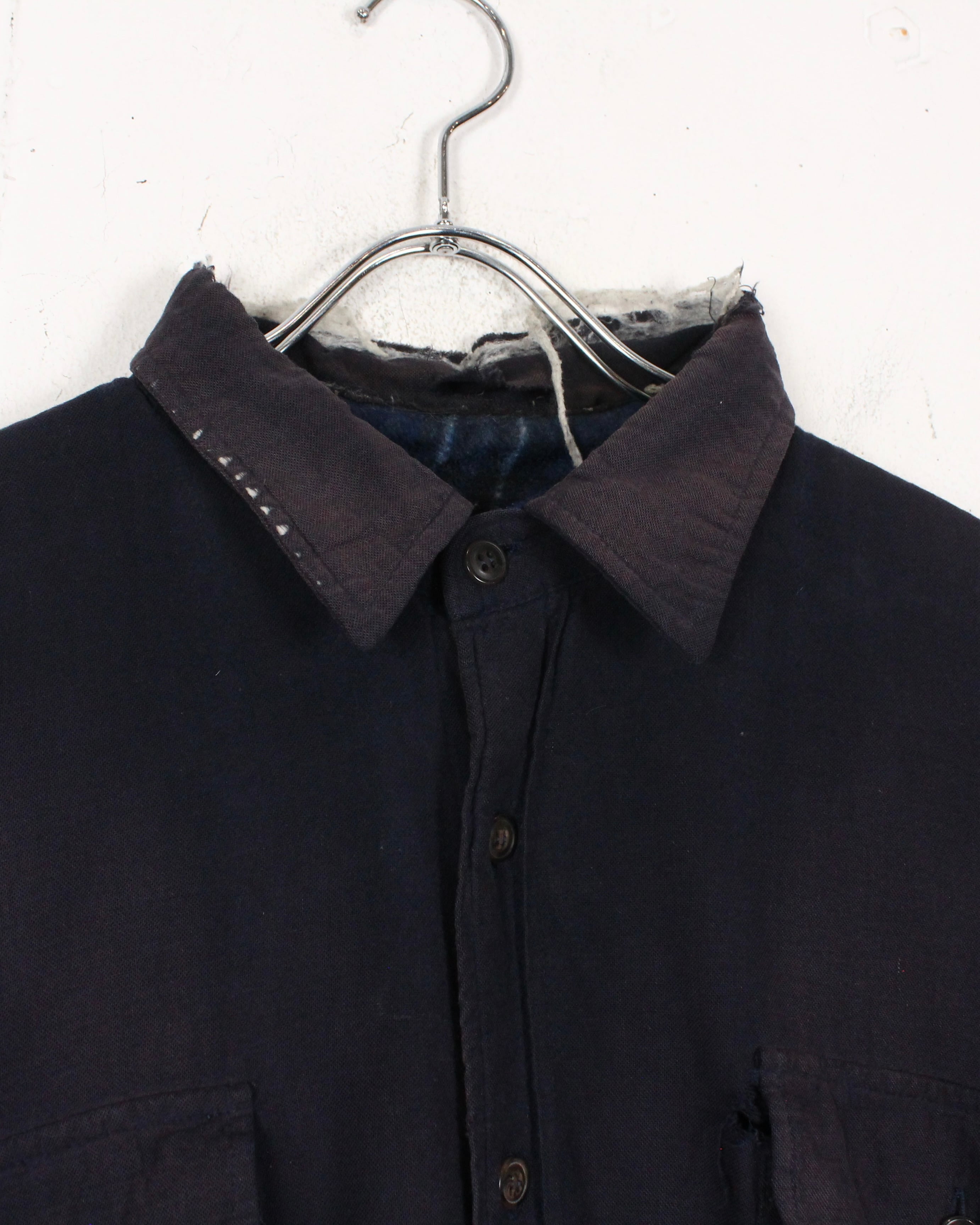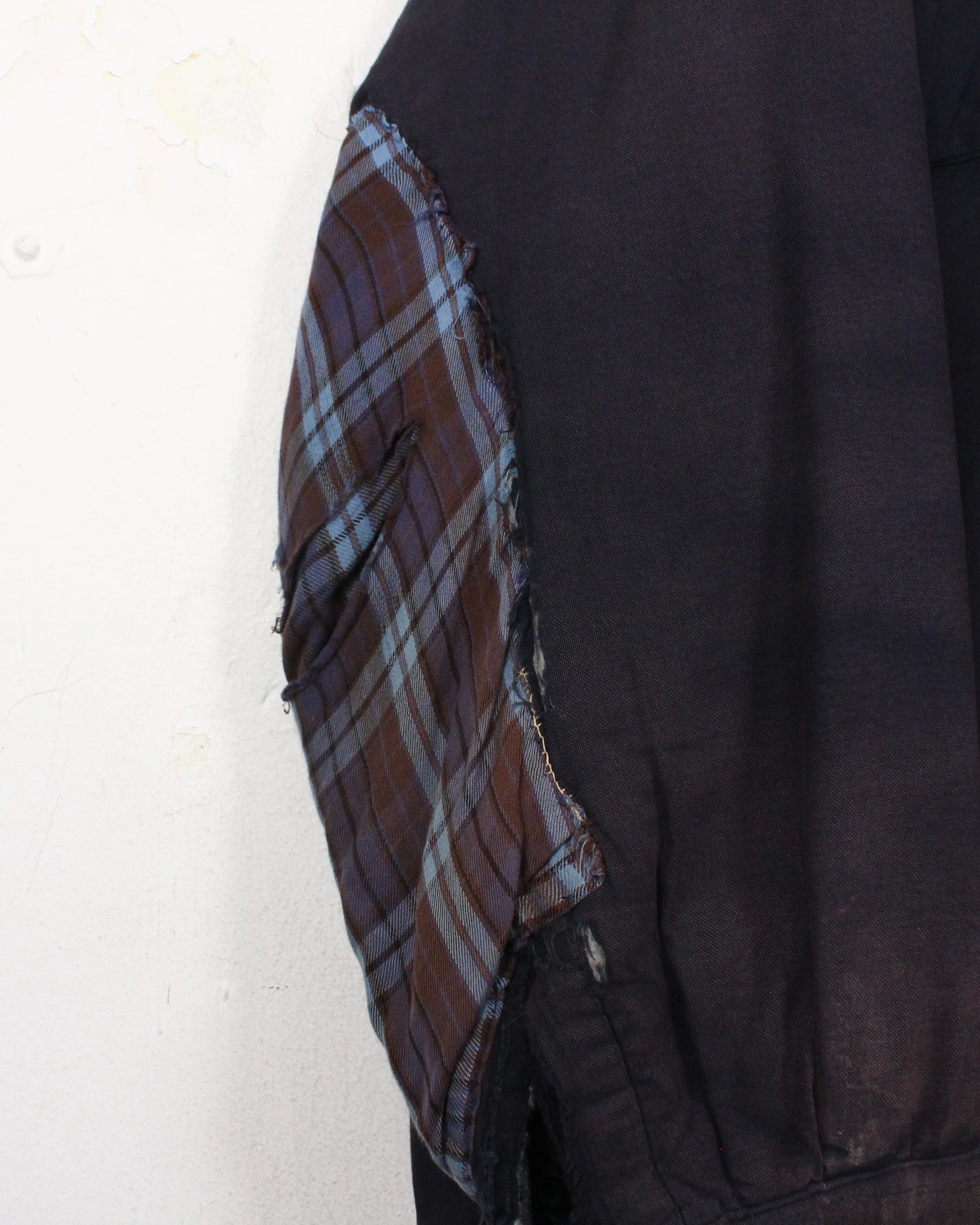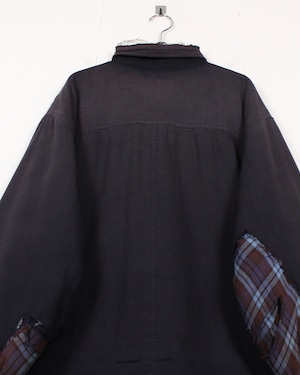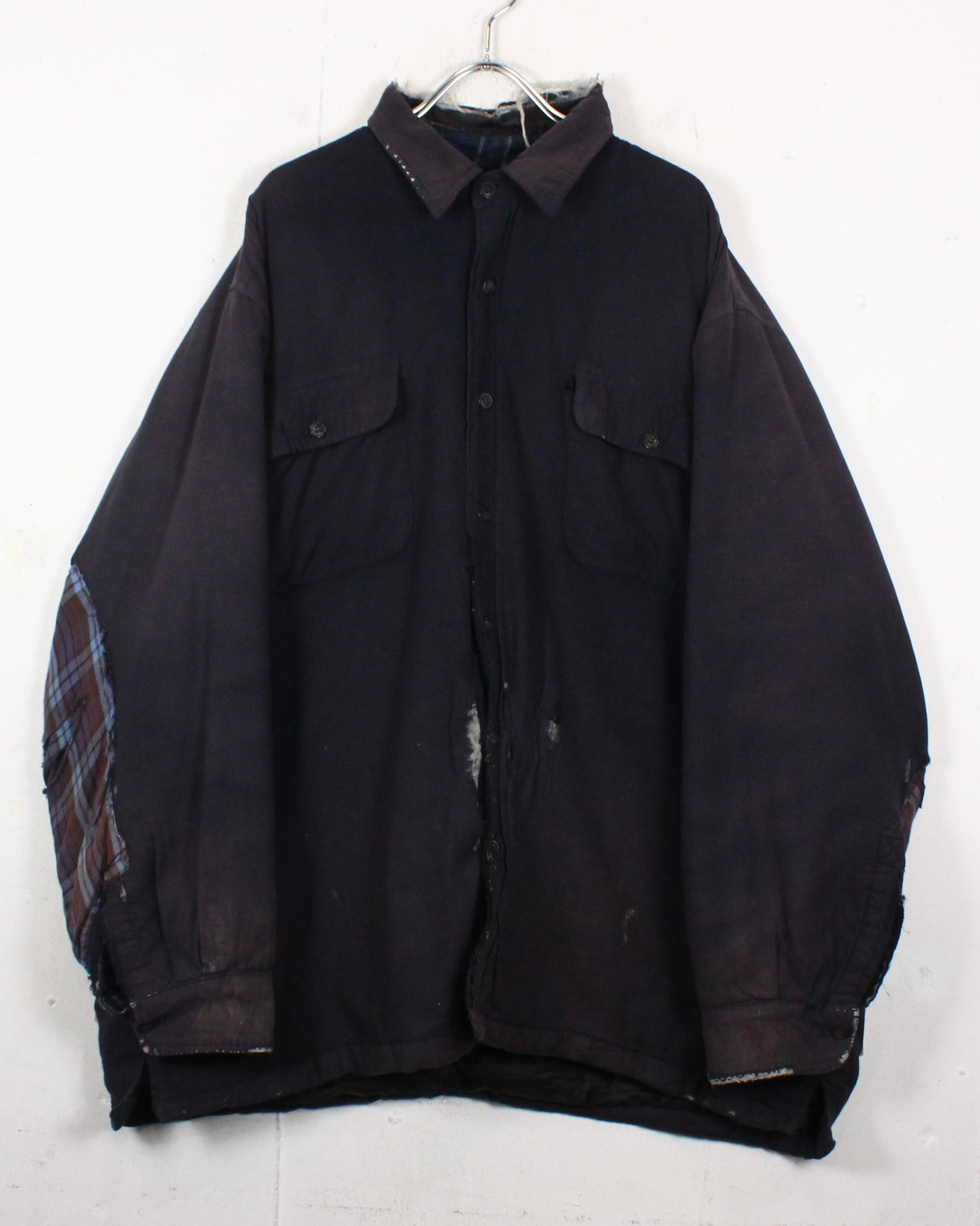 全体に広がる退色は長年の着用を重ねて生まれたリアルな経年変化で、袖に走るチェック生地のリペア跡がさらに温度感とクラフト感を引き立てています。