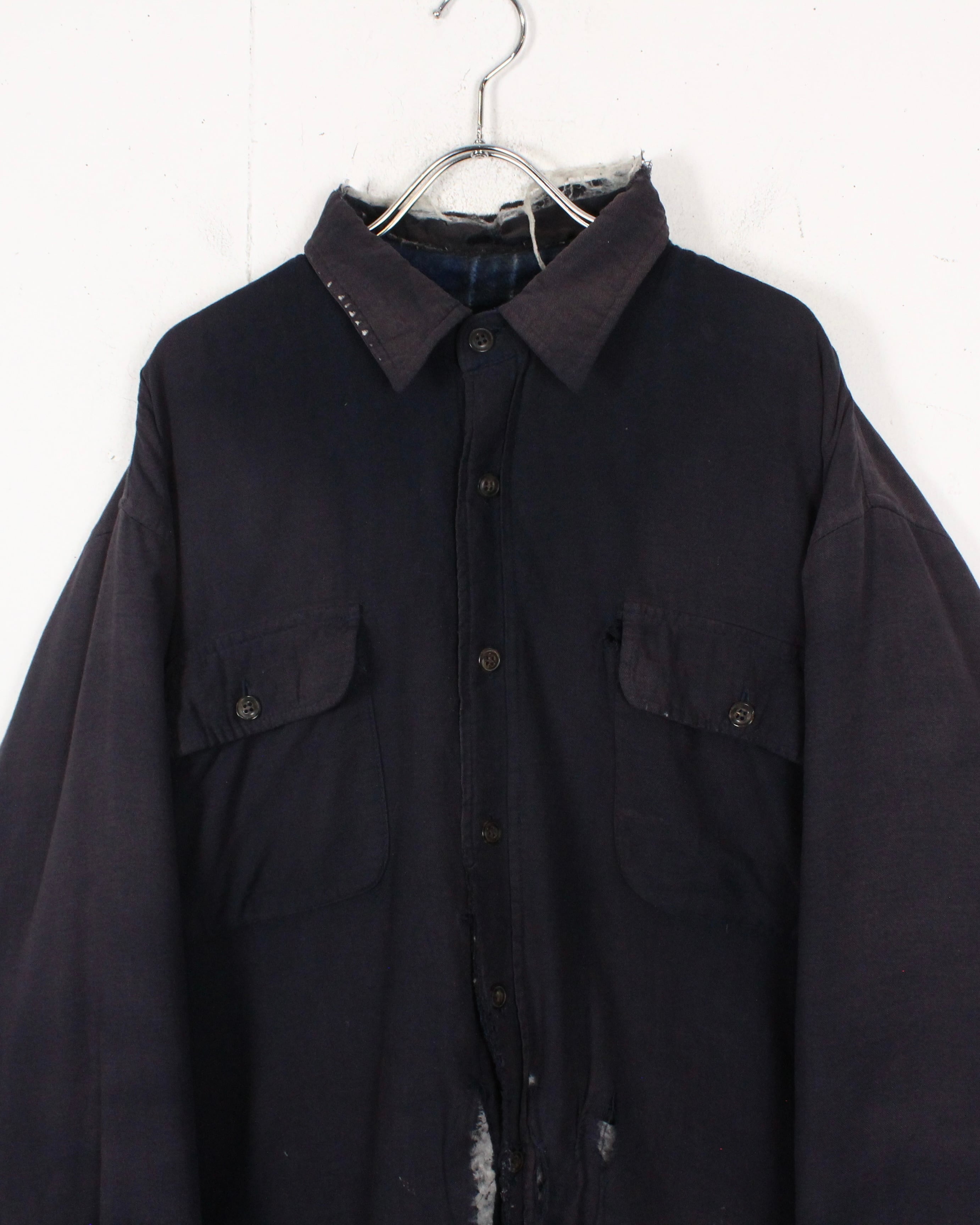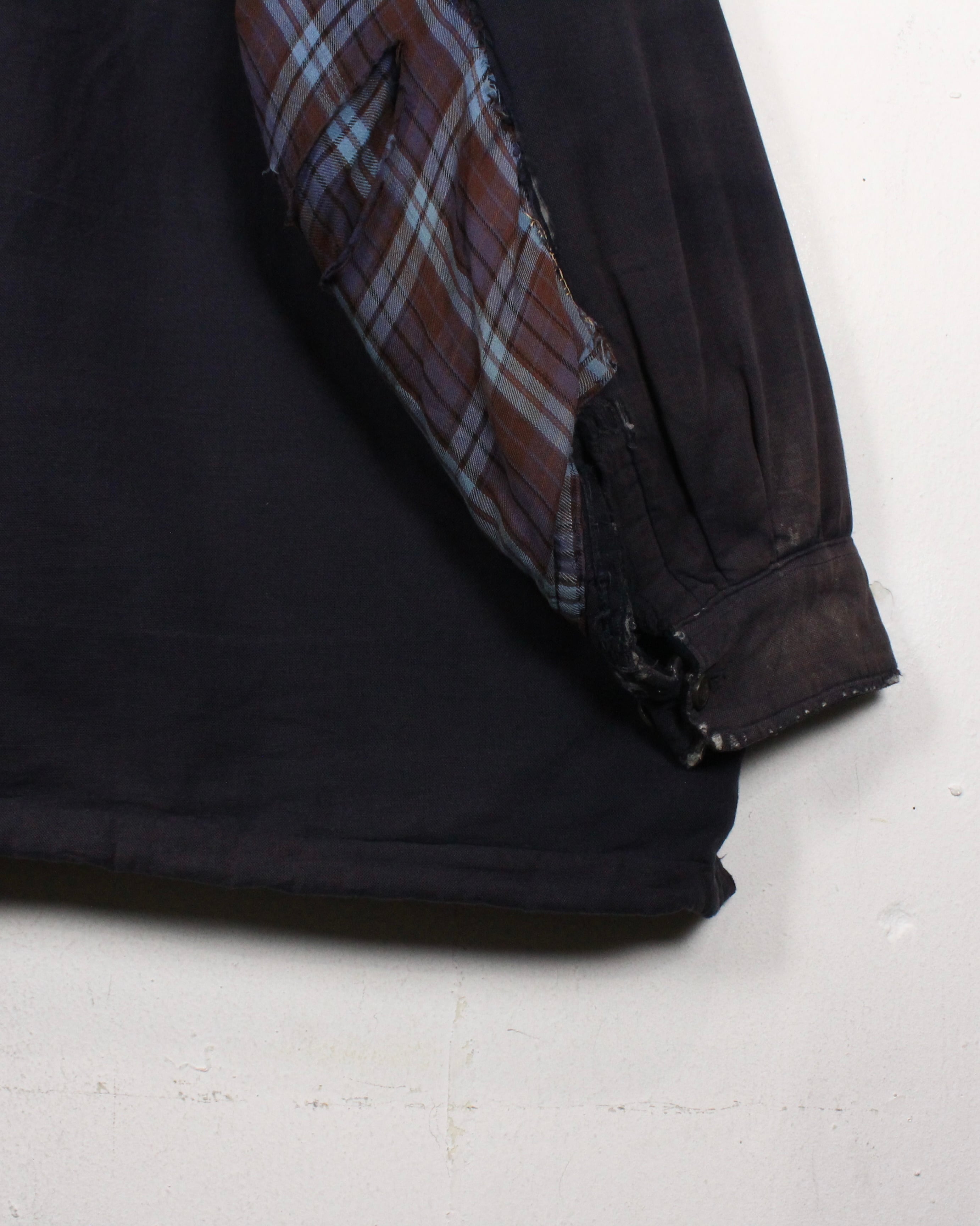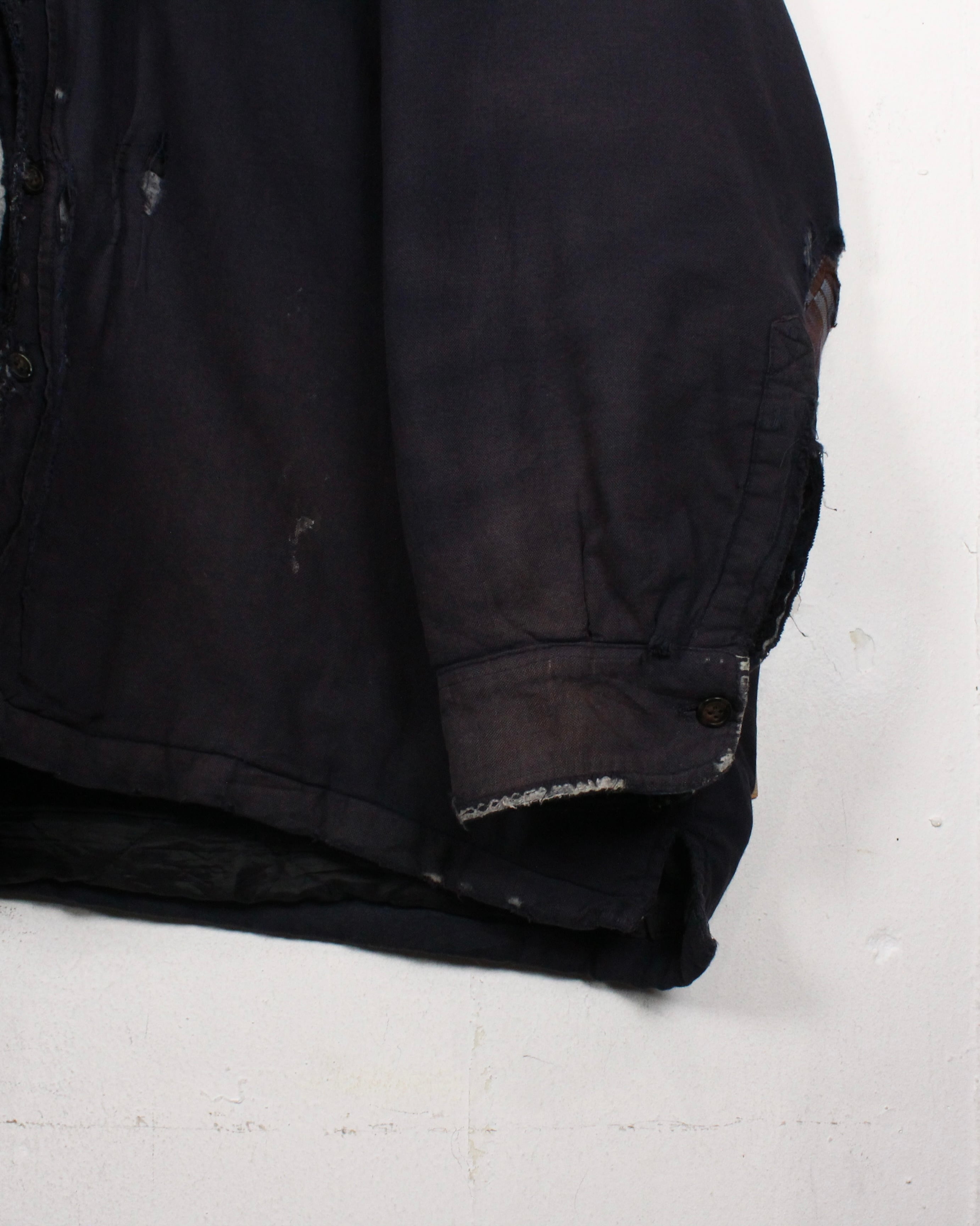 全体に広がる退色は長年の着用を重ねて生まれたリアルな経年変化で、袖に走るチェック生地のリペア跡がさらに温度感とクラフト感を引き立てています。