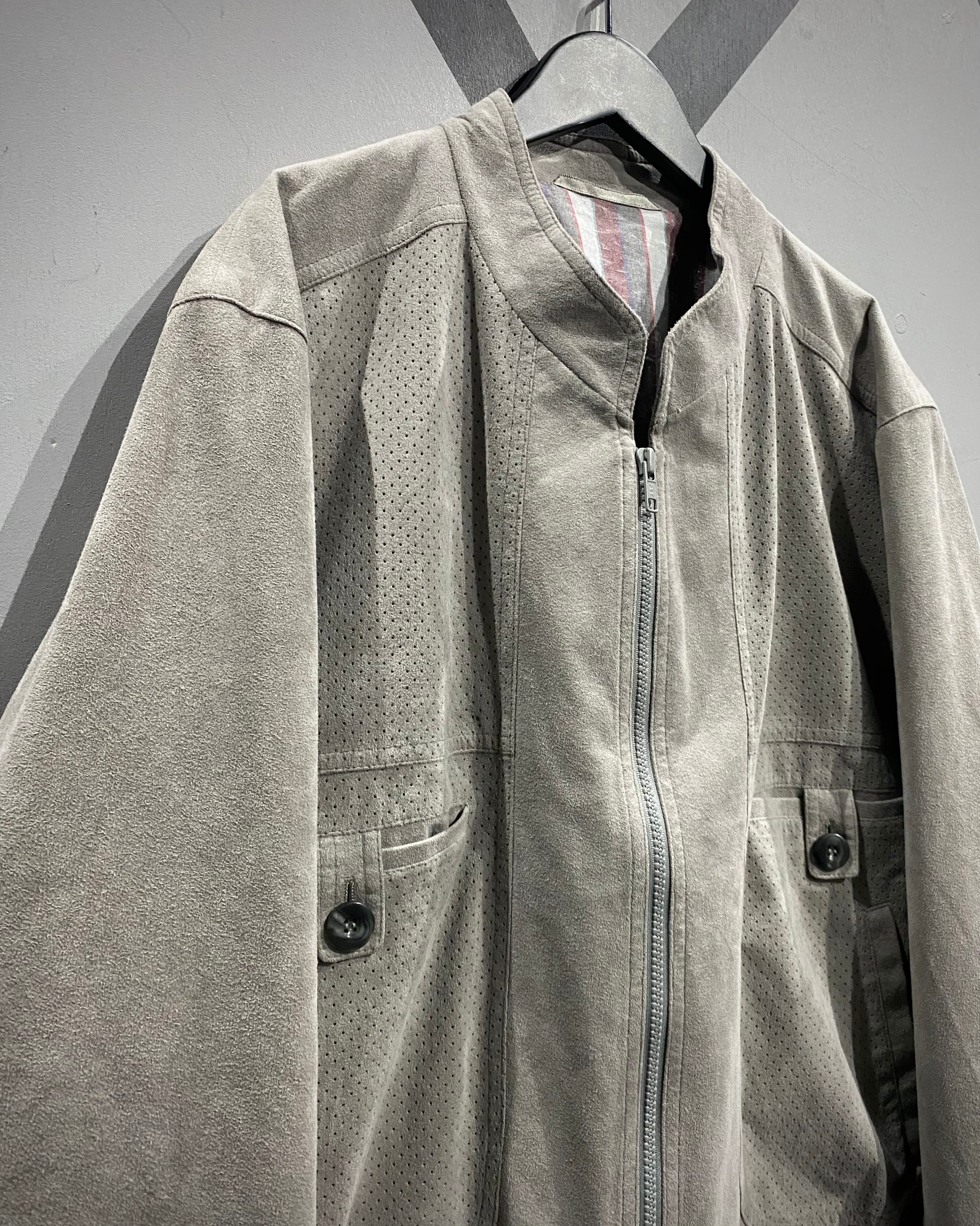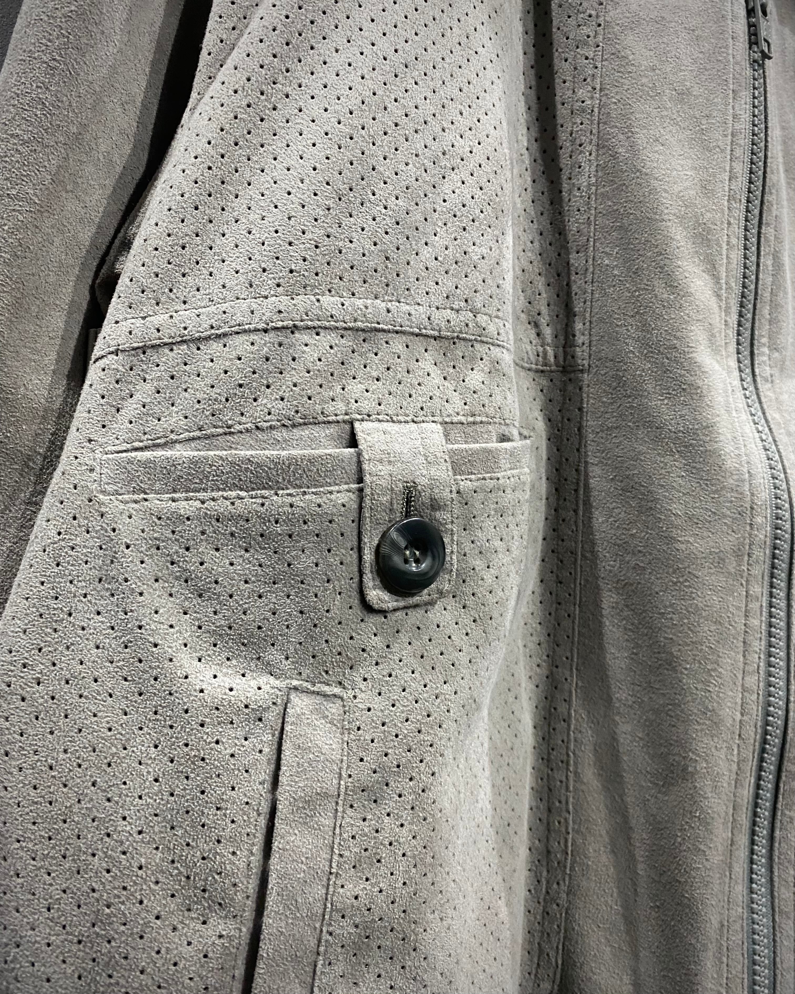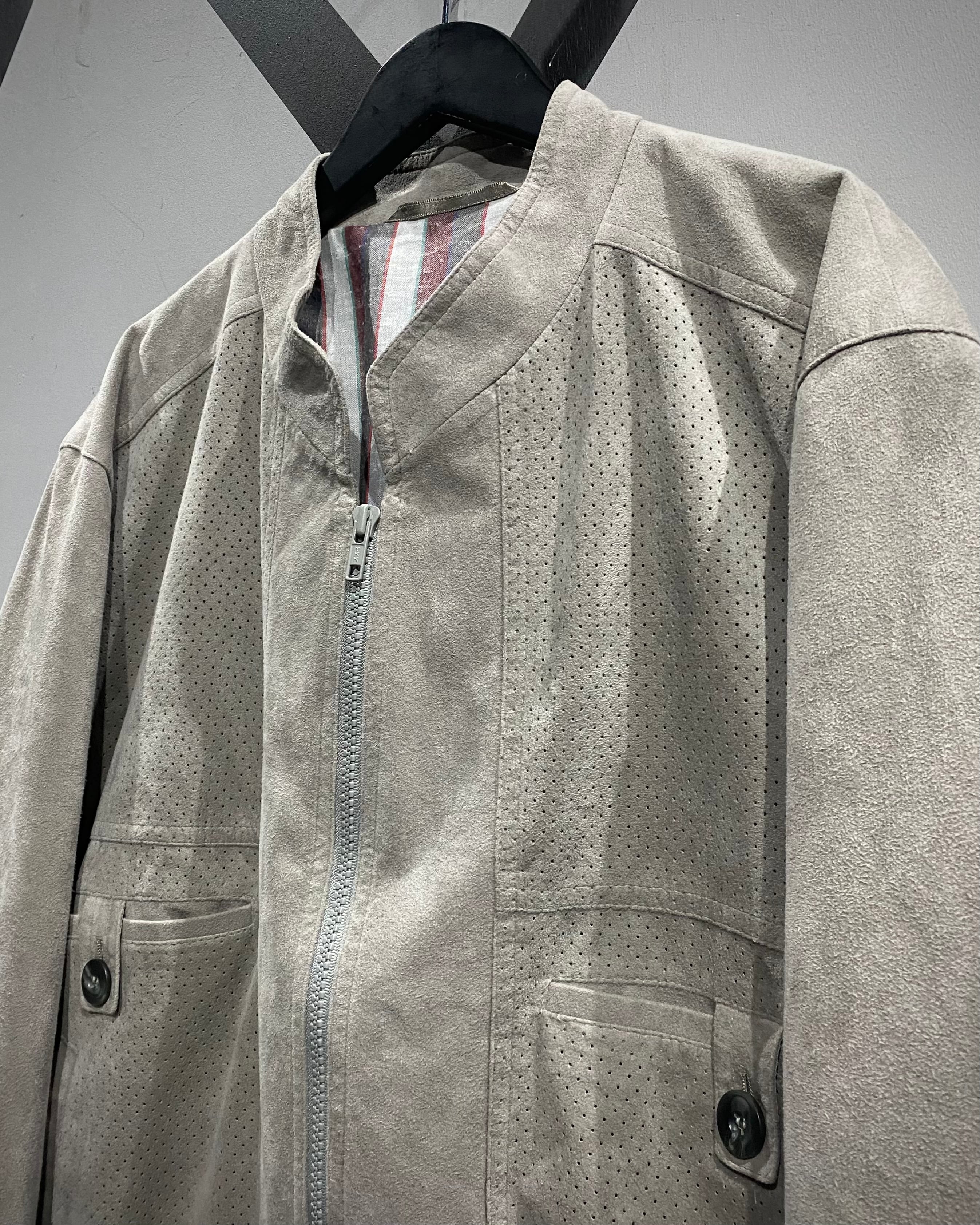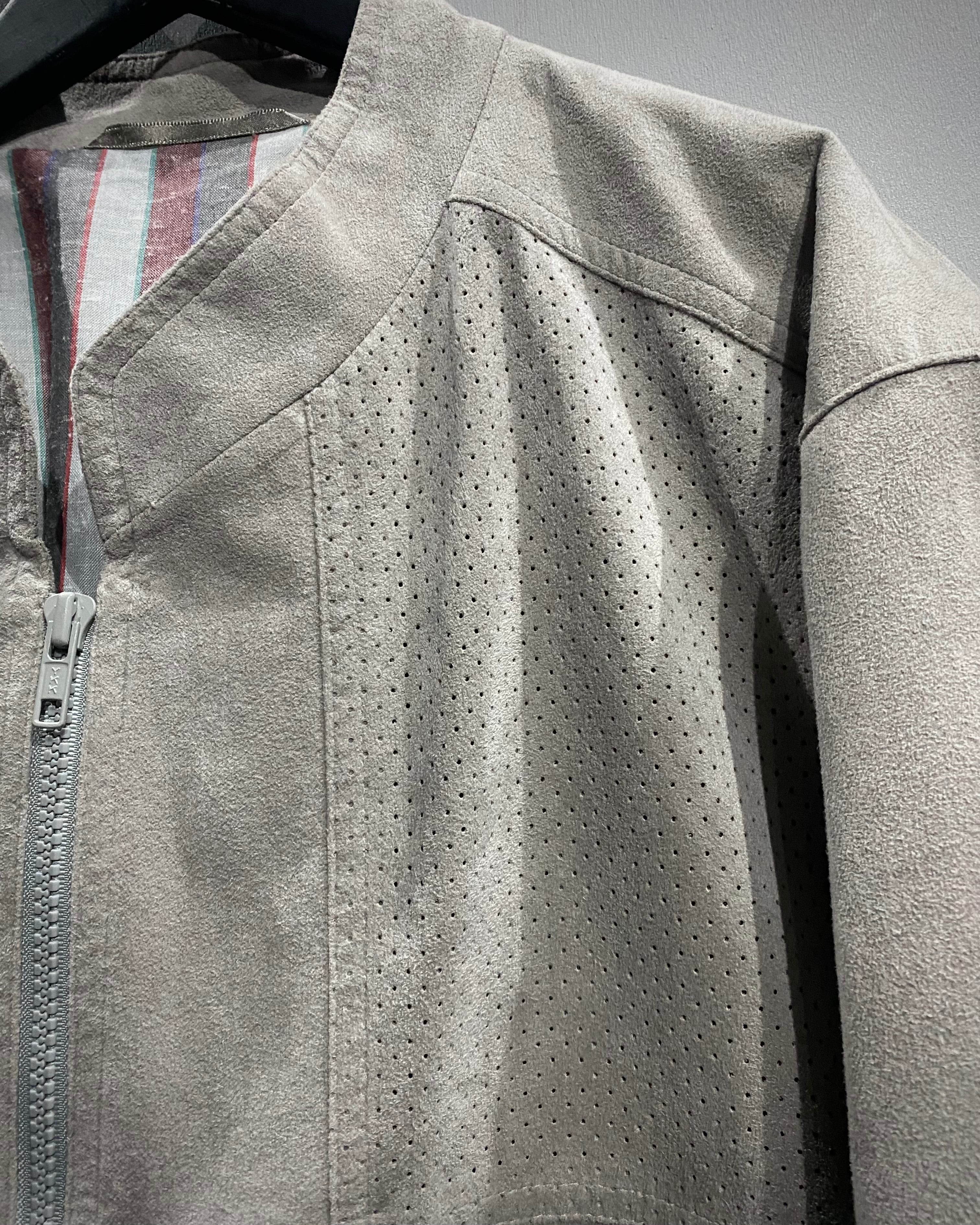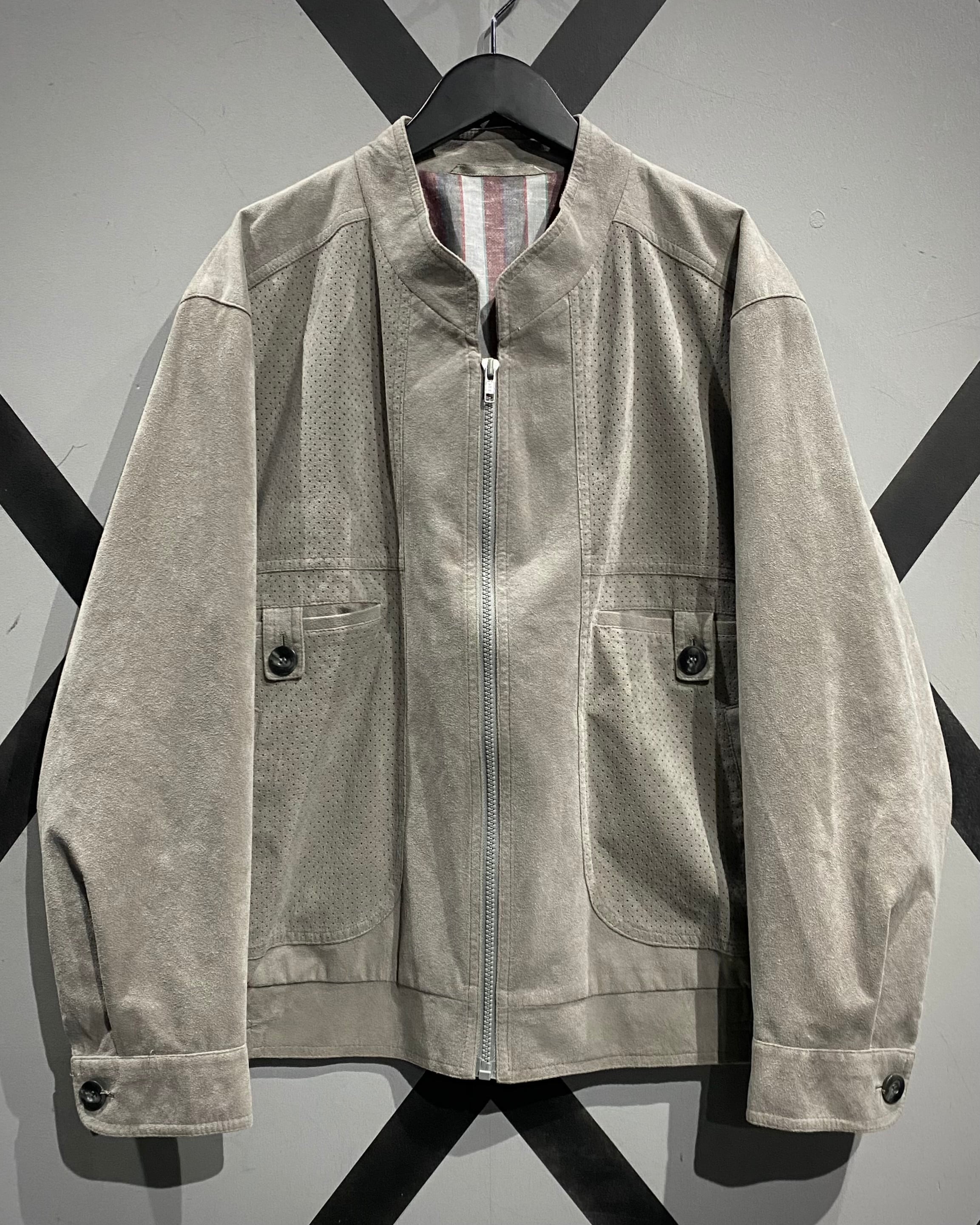 フロントに施されたパンチングデザインが、陰影のある立体感を生み出し無地では出せない奥行きある表情を形成。無駄を削ぎ落としたスタンドカラーが、全体をよりモードに仕上げています。