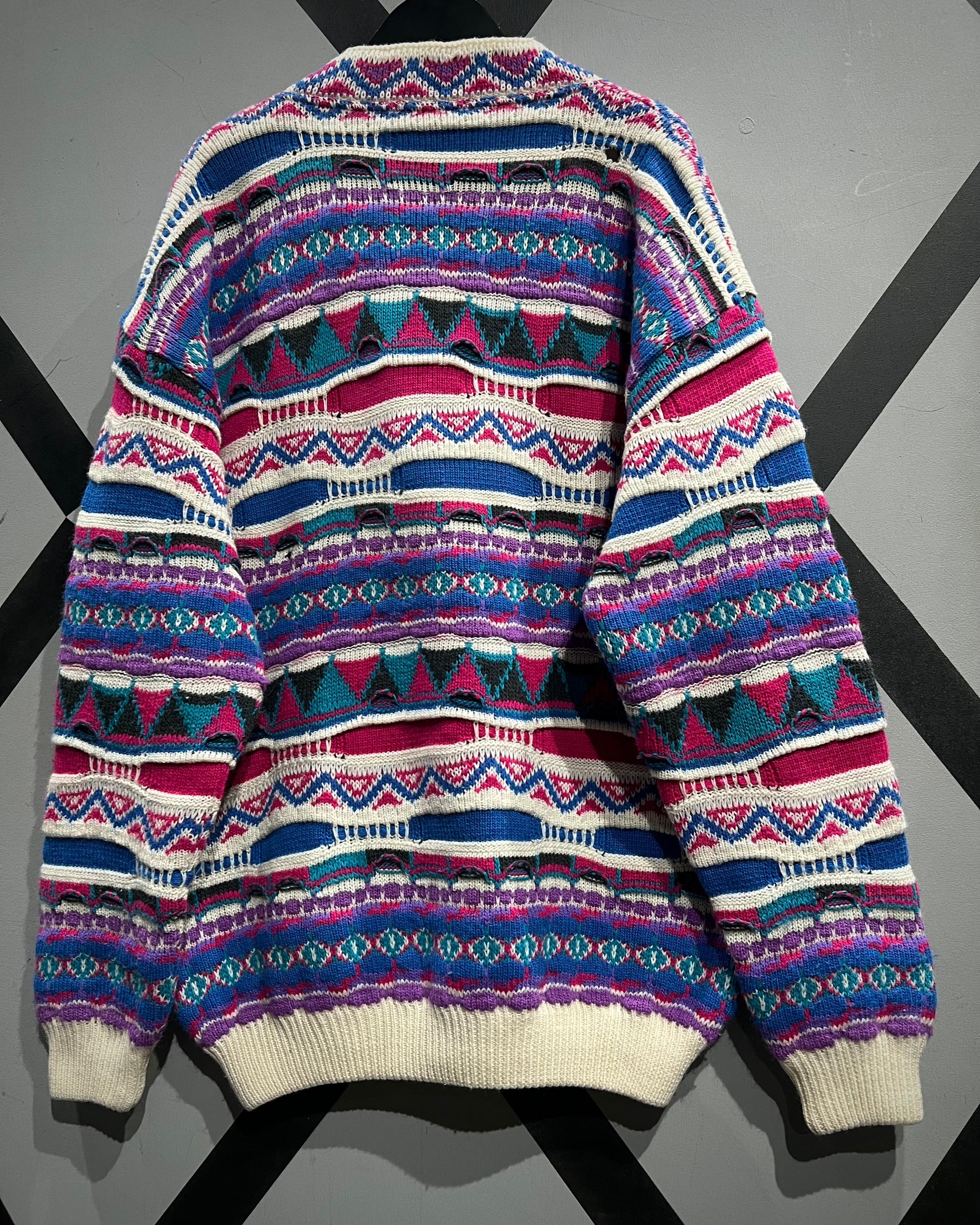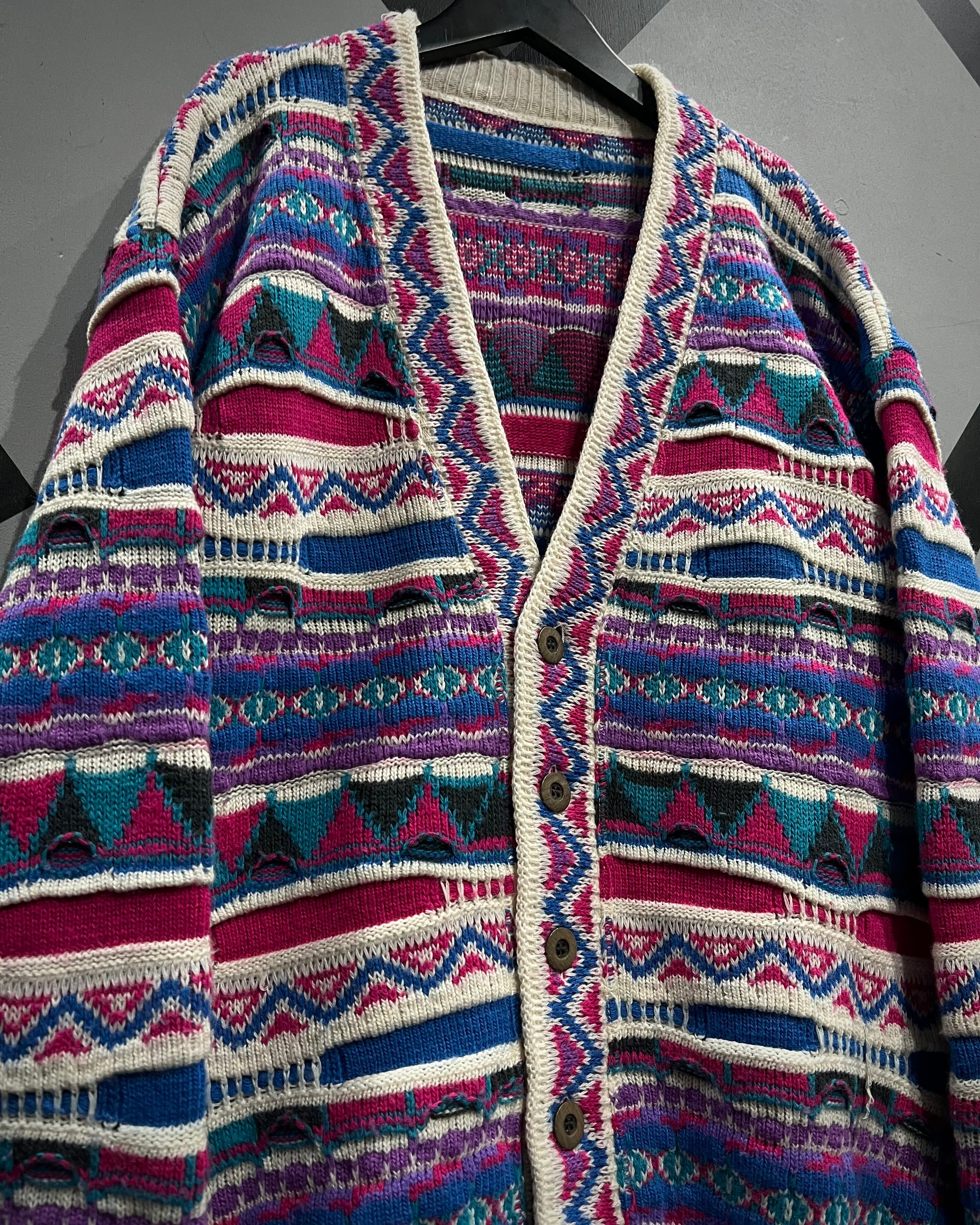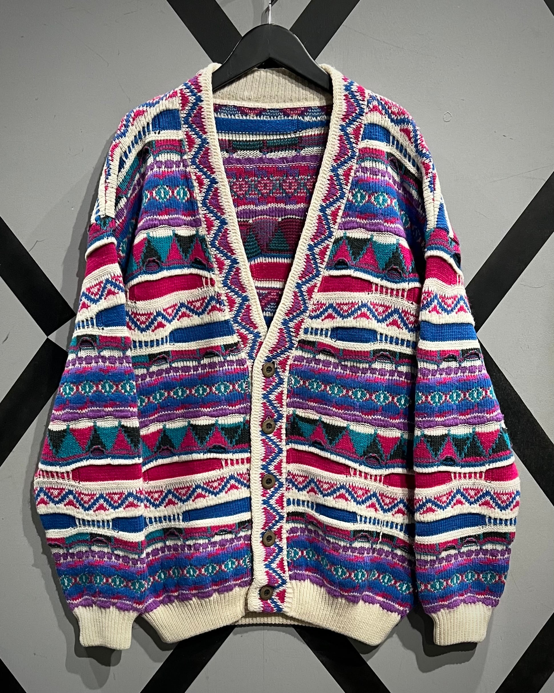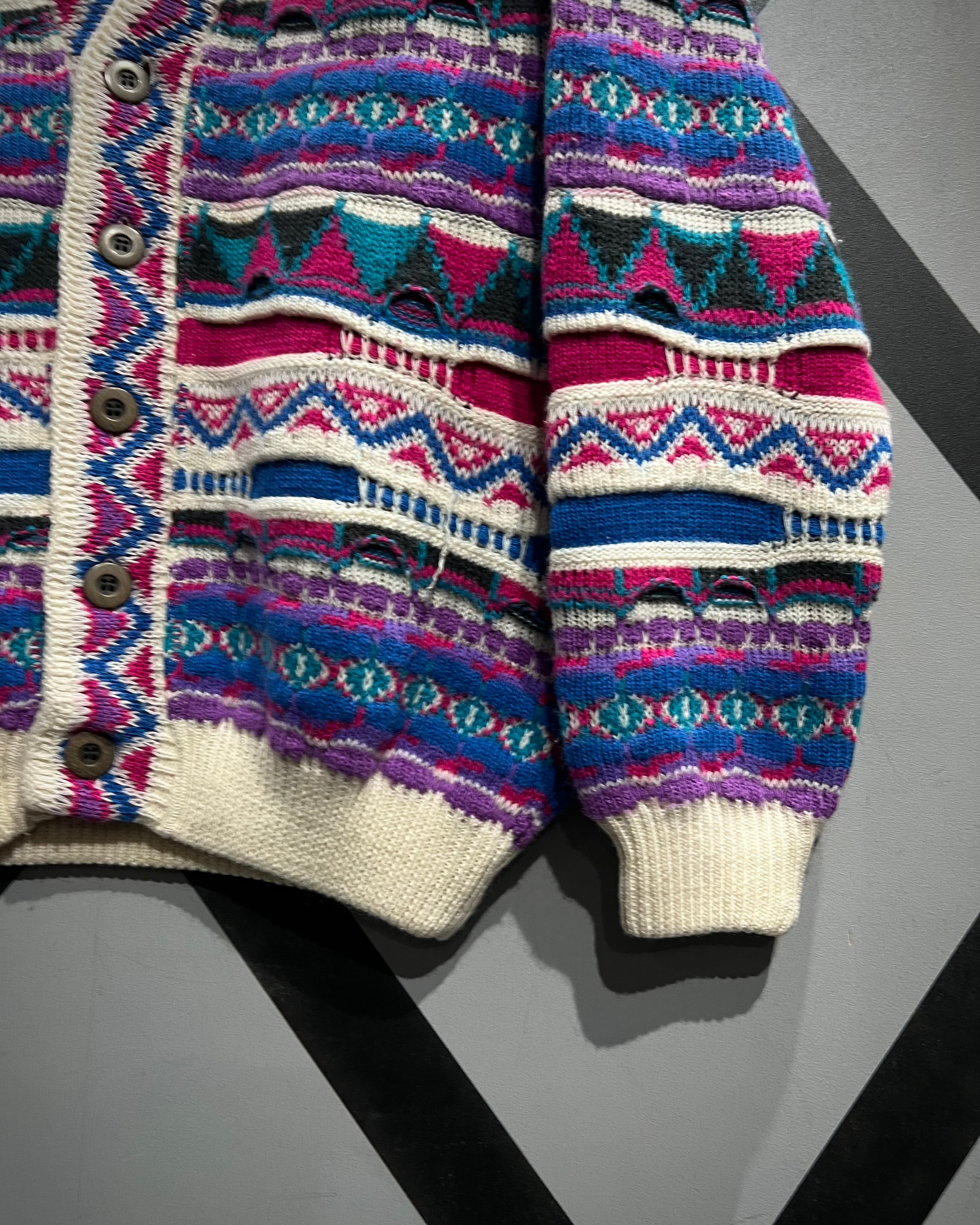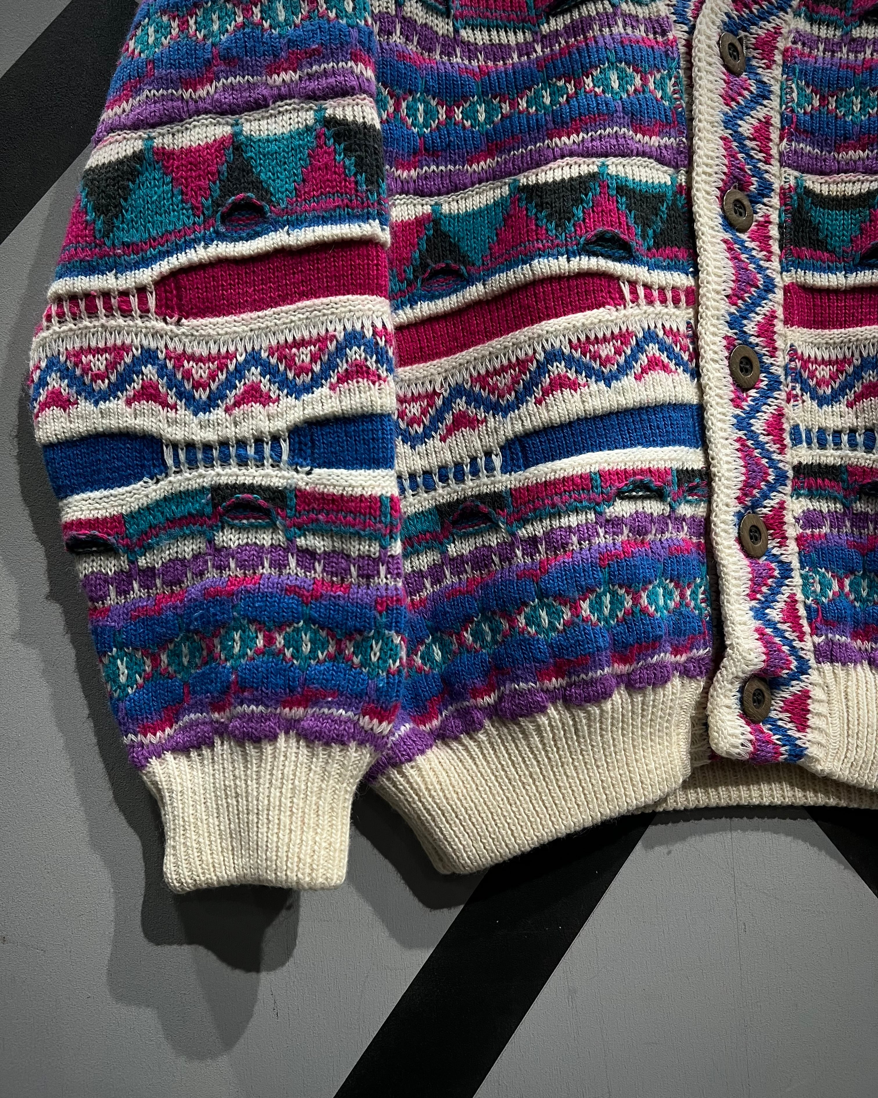 インパクト抜群のカラーリングと立体的な編み地が特徴の、イタリーメイドの3Dニットカーディガン。