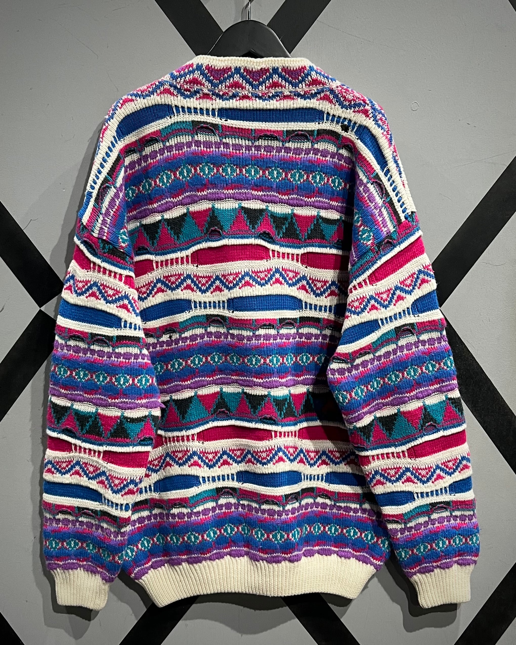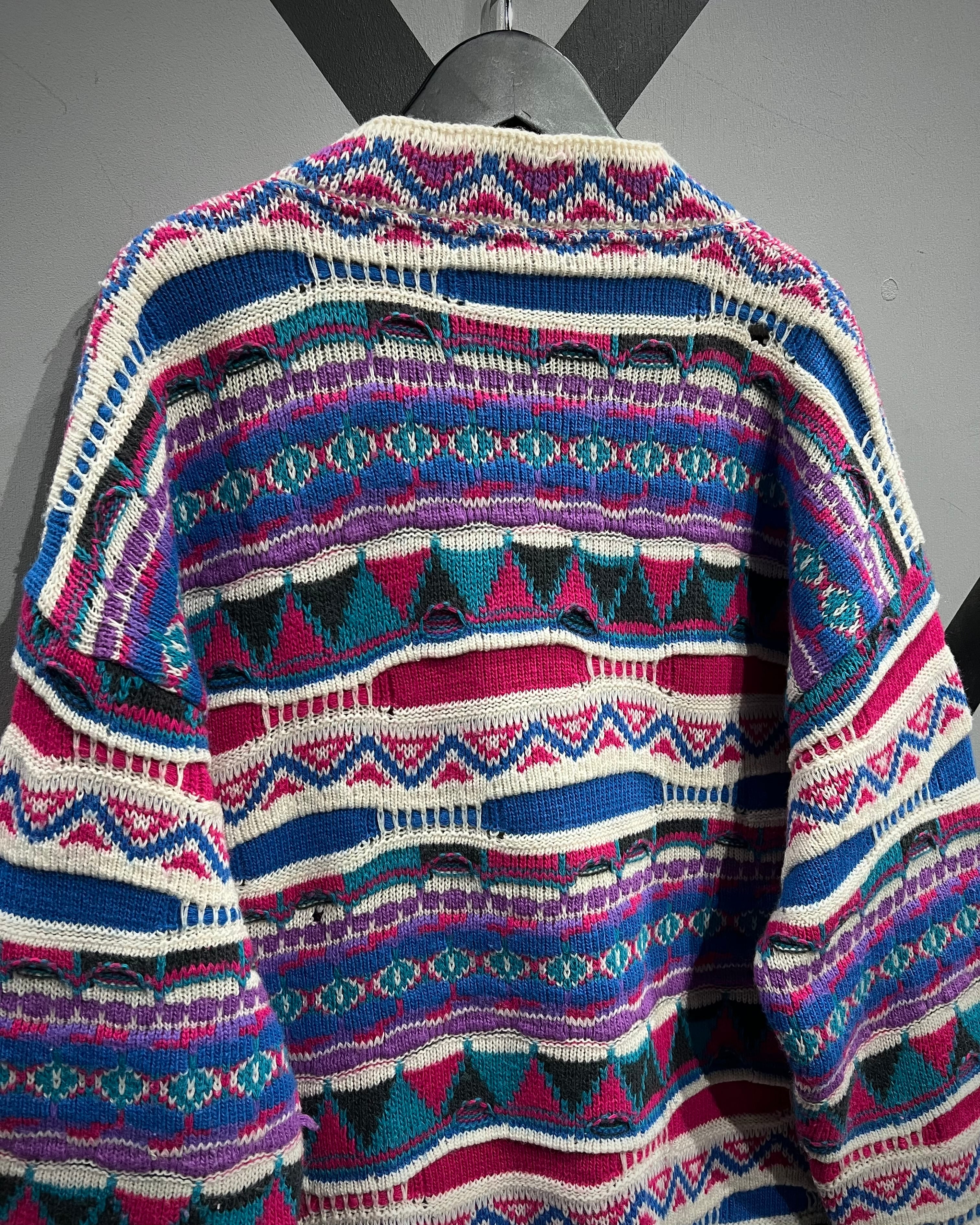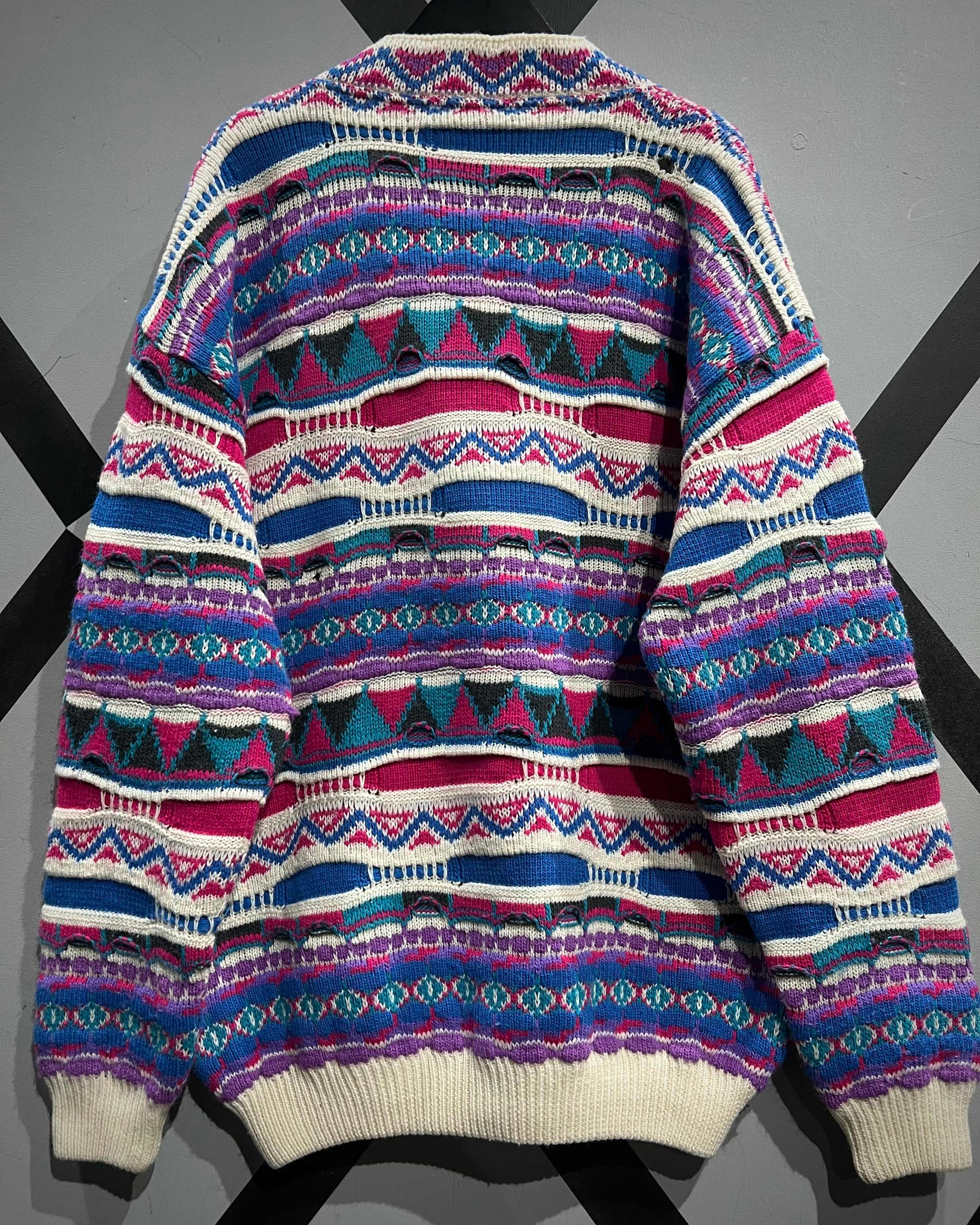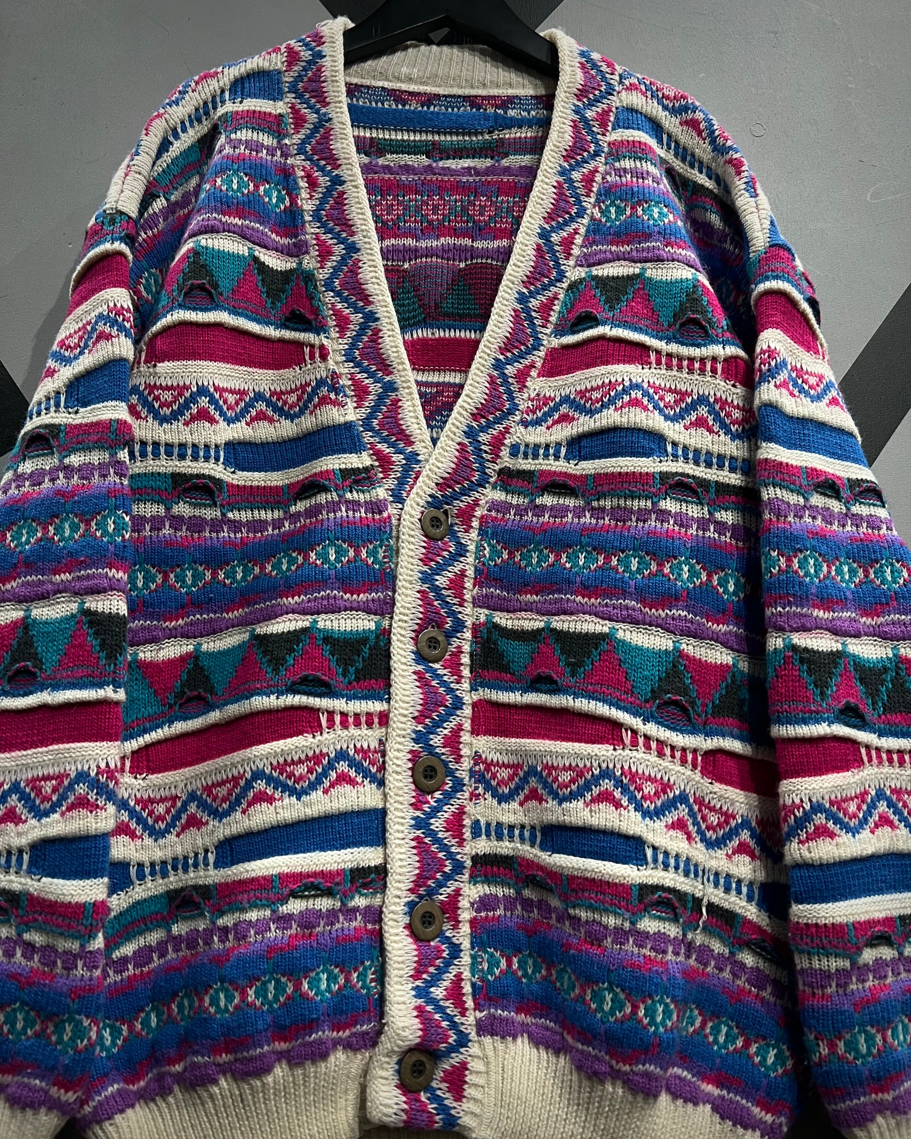 インパクト抜群のカラーリングと立体的な編み地が特徴の、イタリーメイドの3Dニットカーディガン。