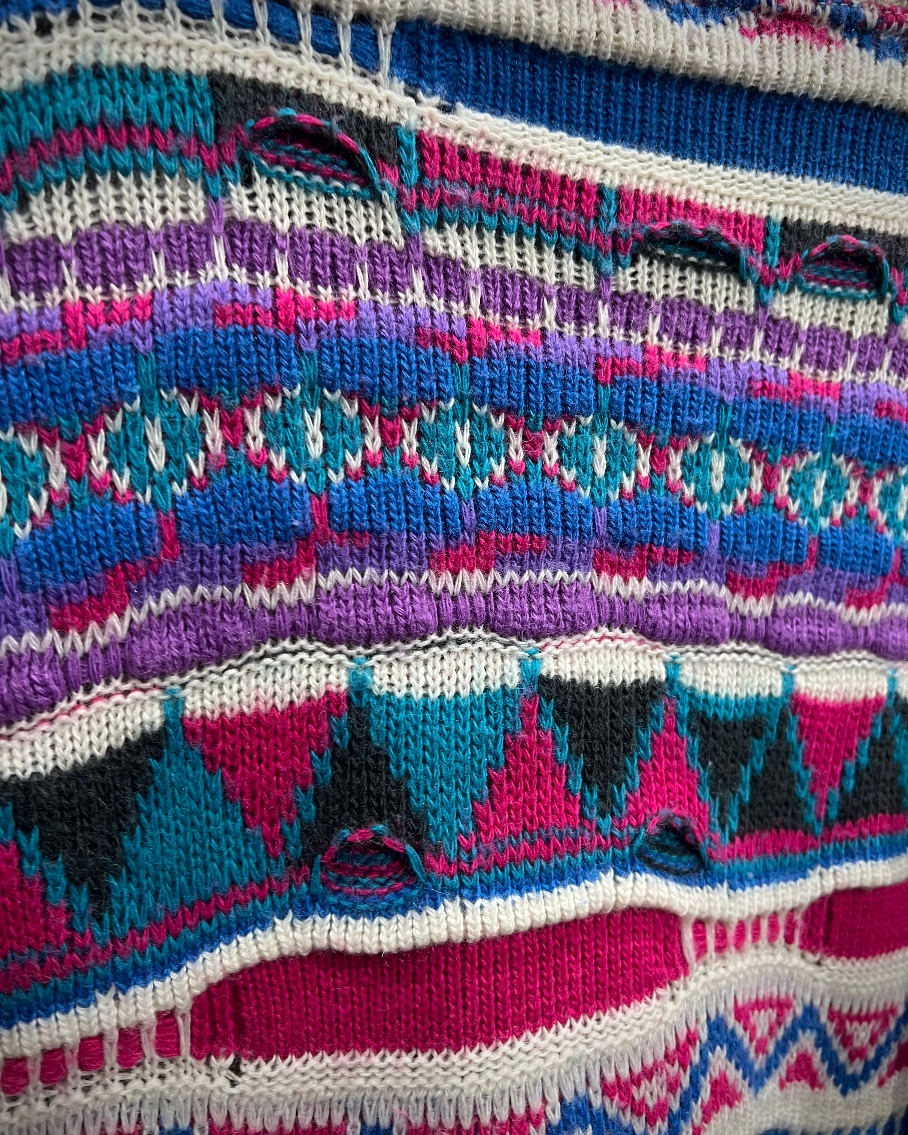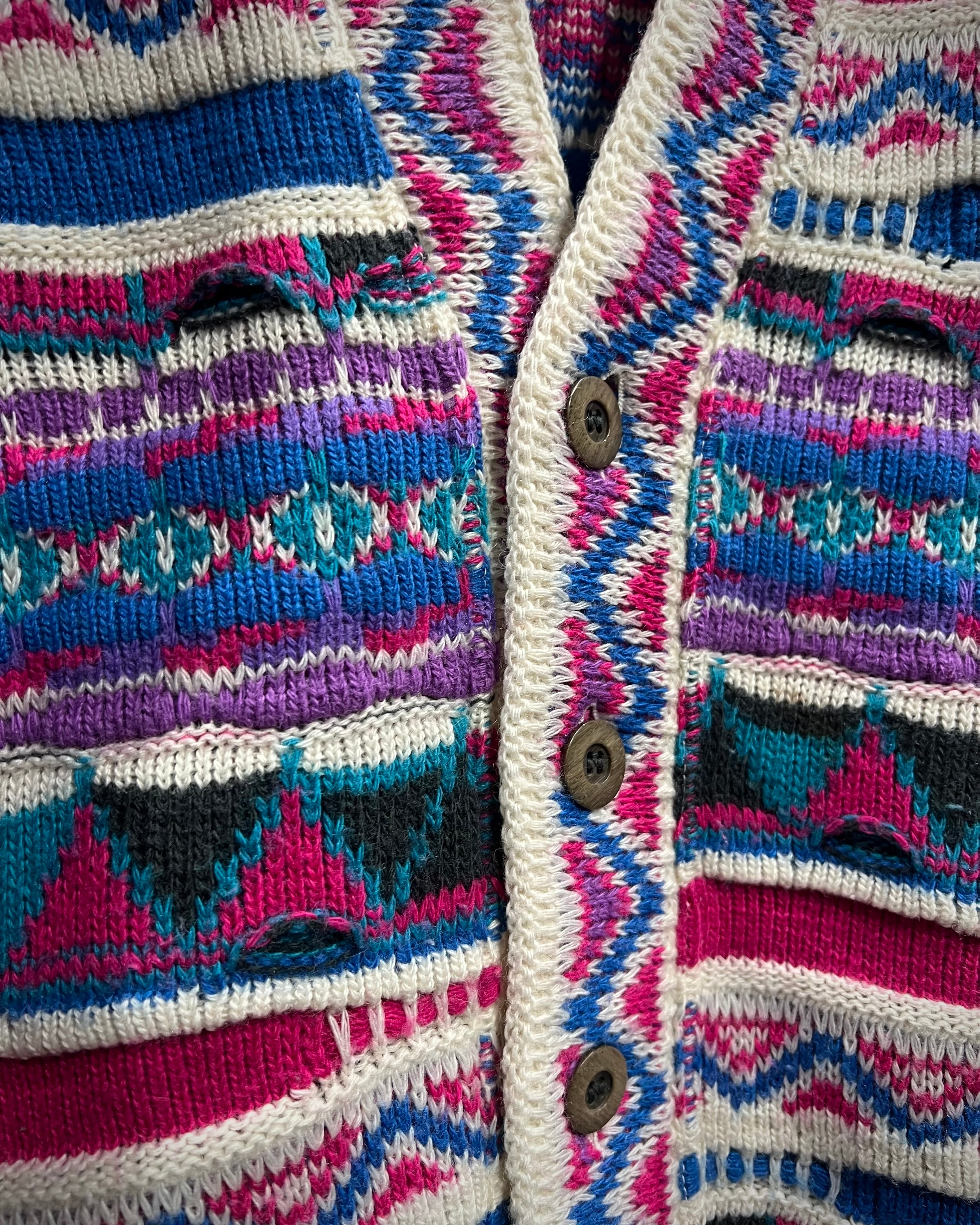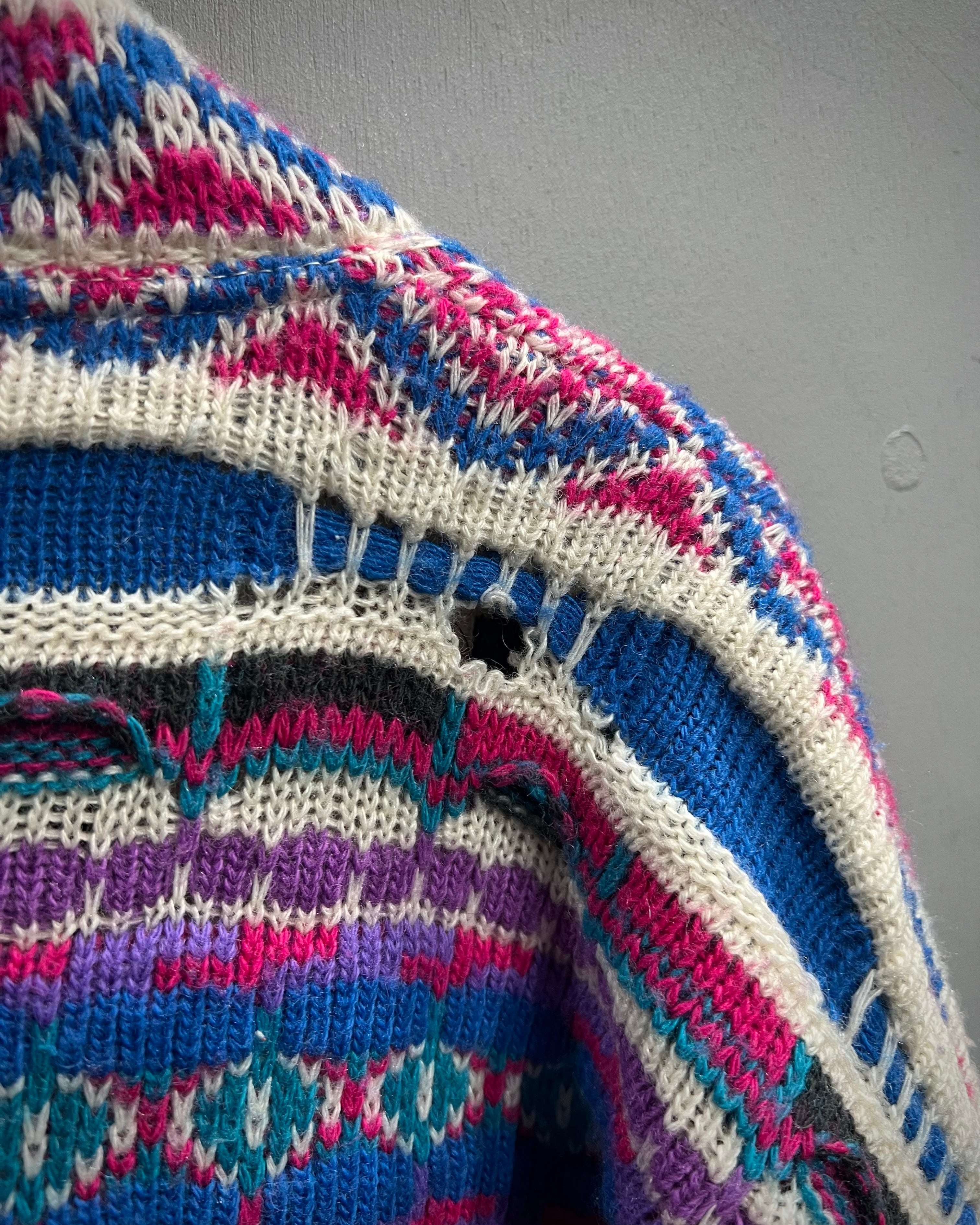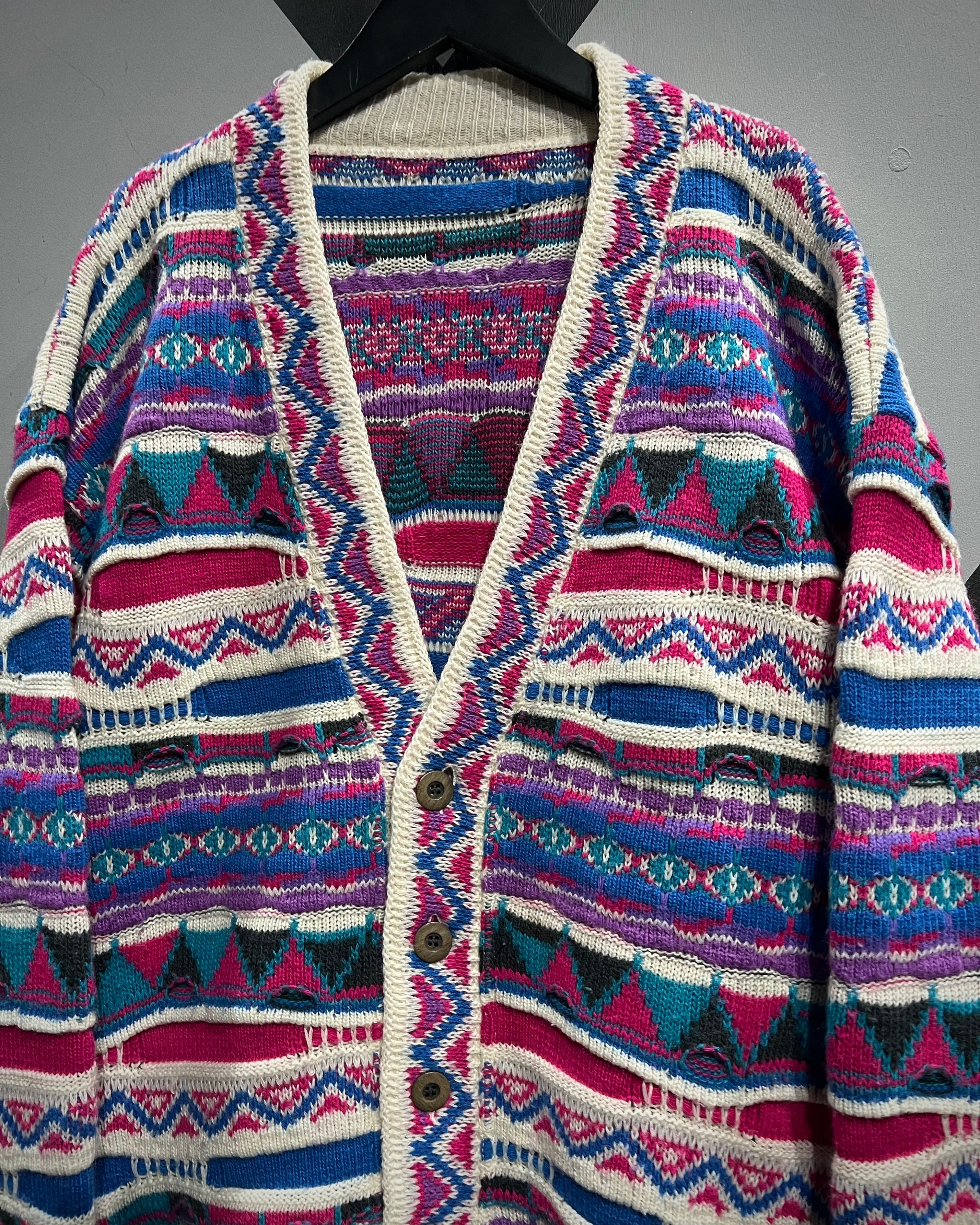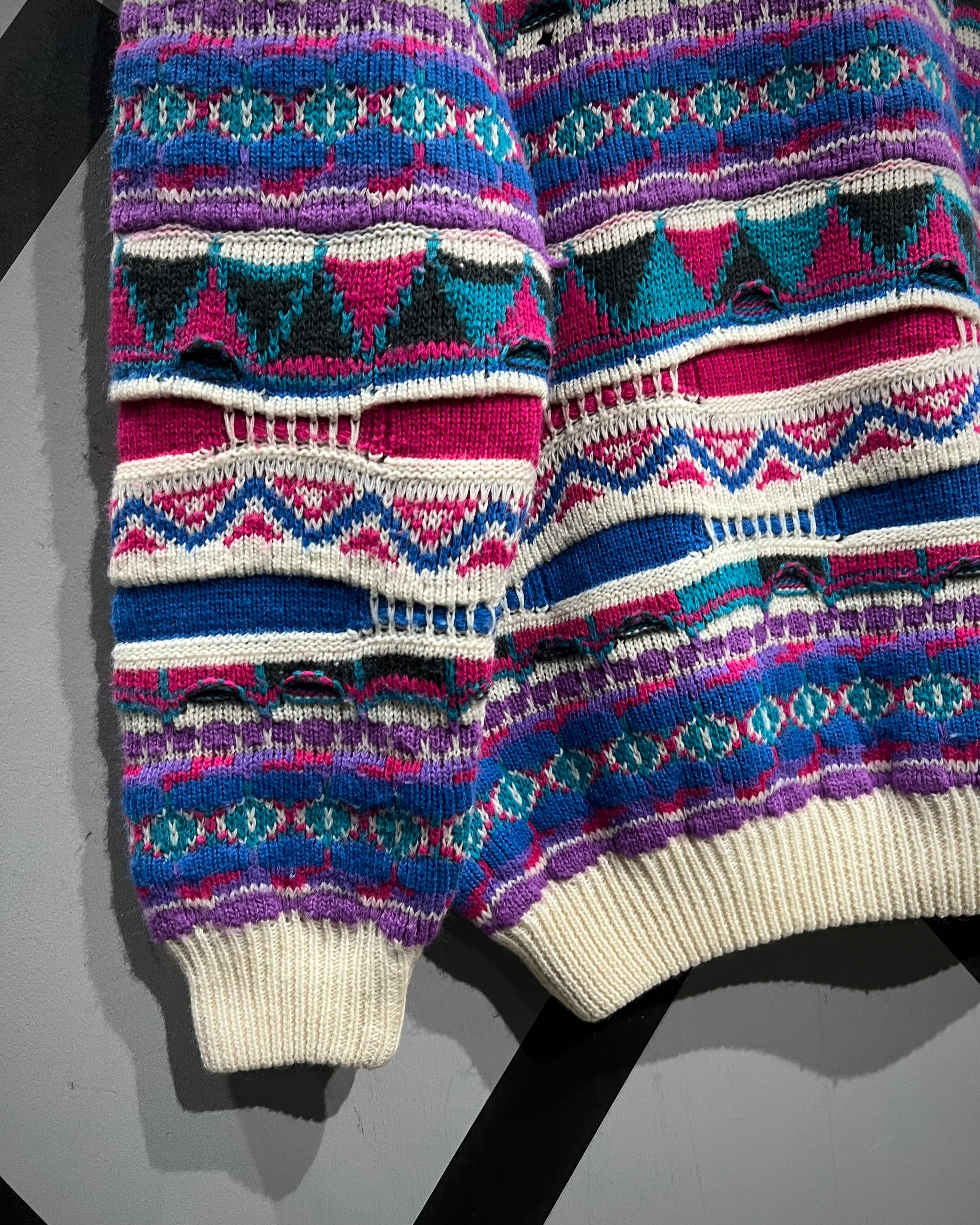 インパクト抜群のカラーリングと立体的な編み地が特徴の、イタリーメイドの3Dニットカーディガン。