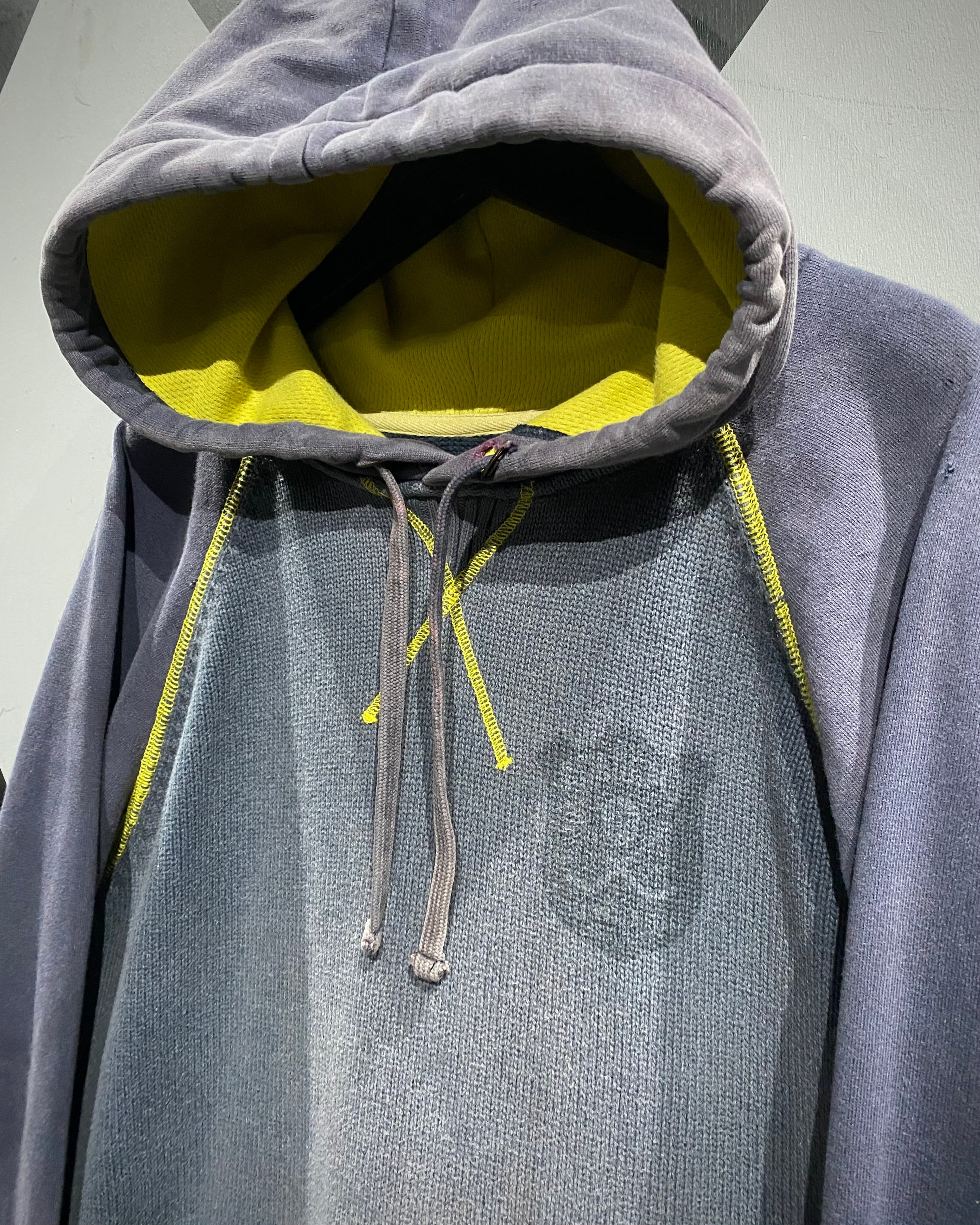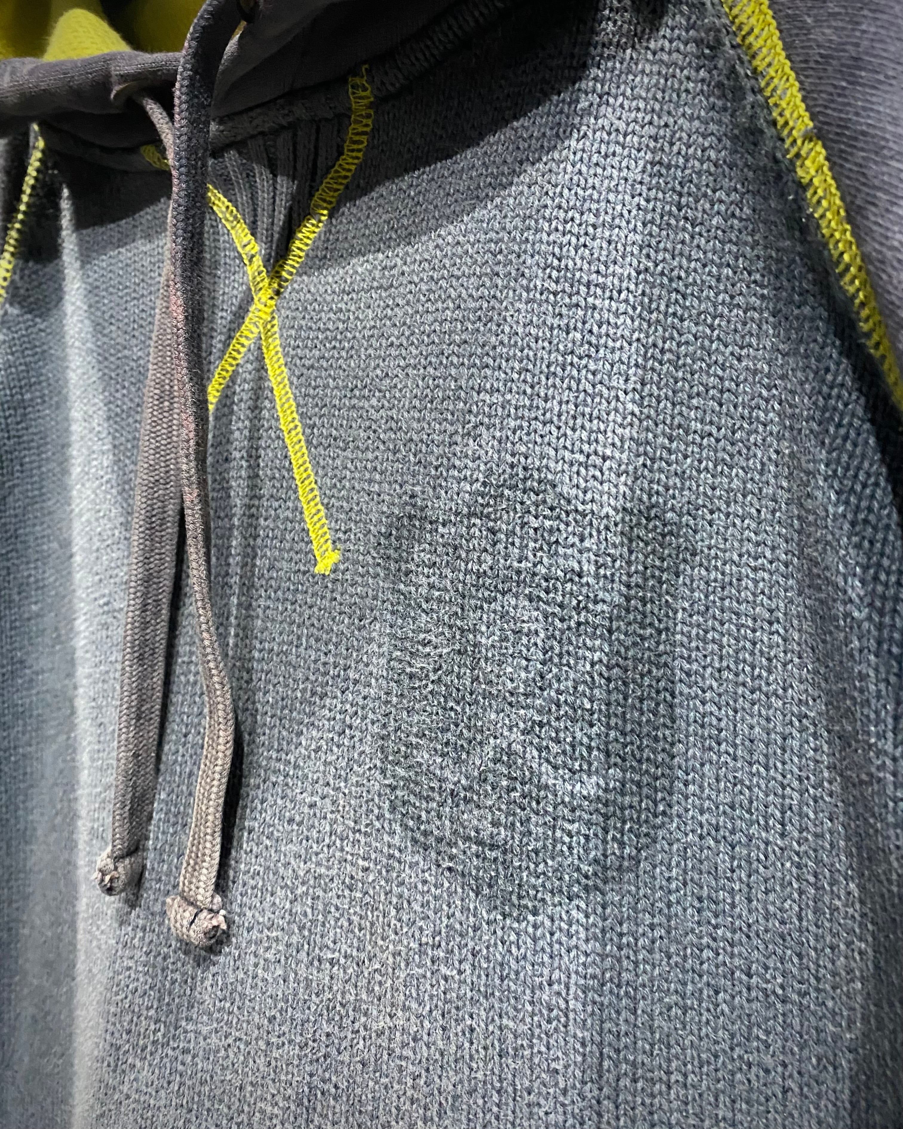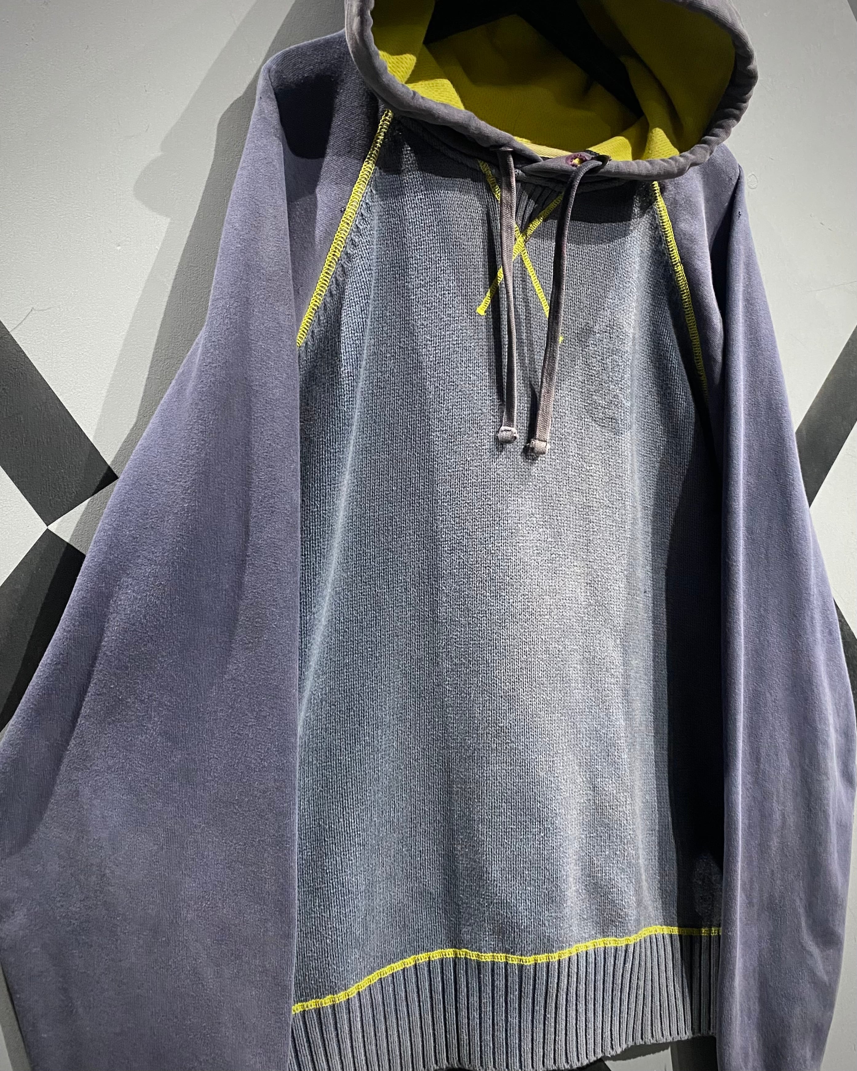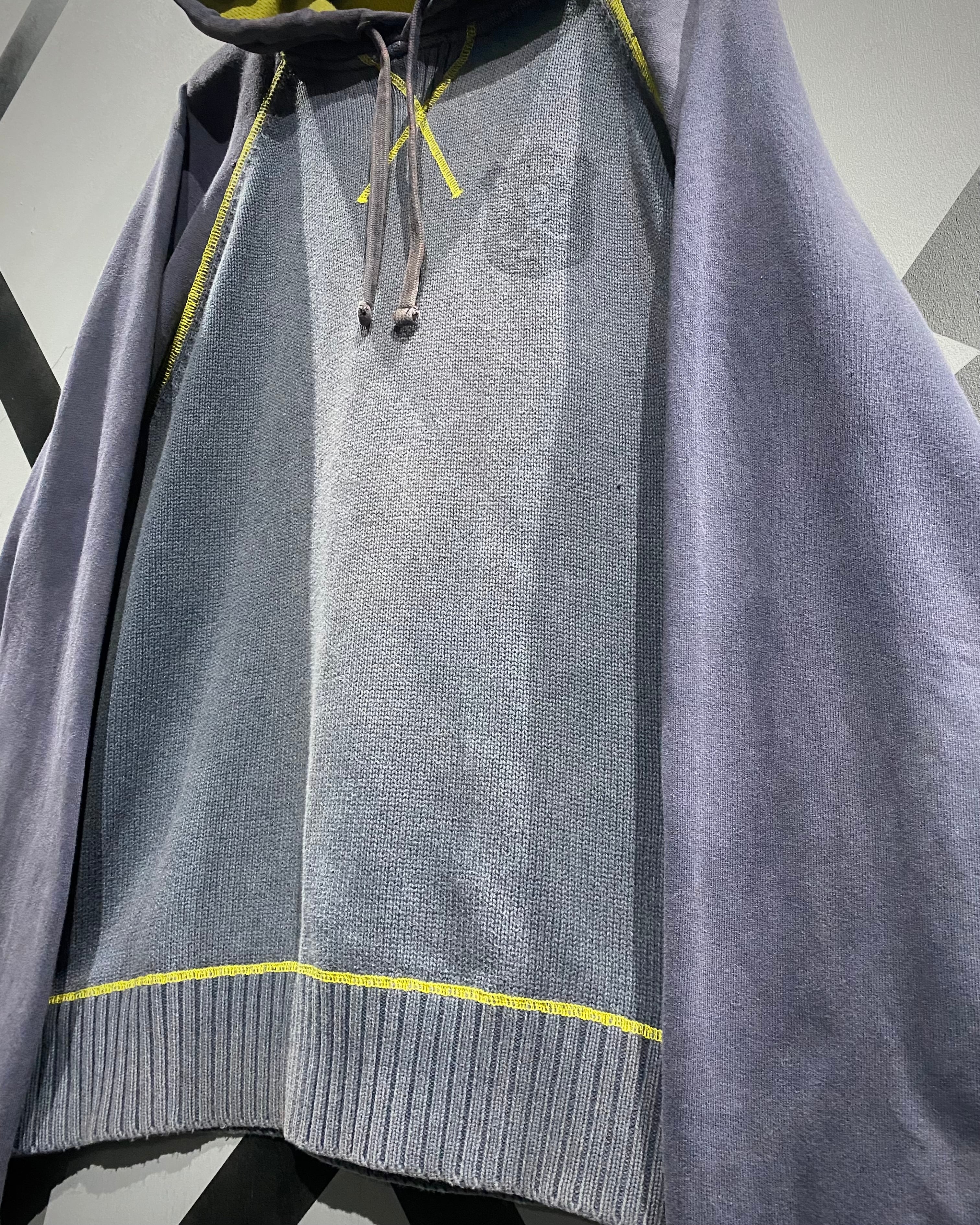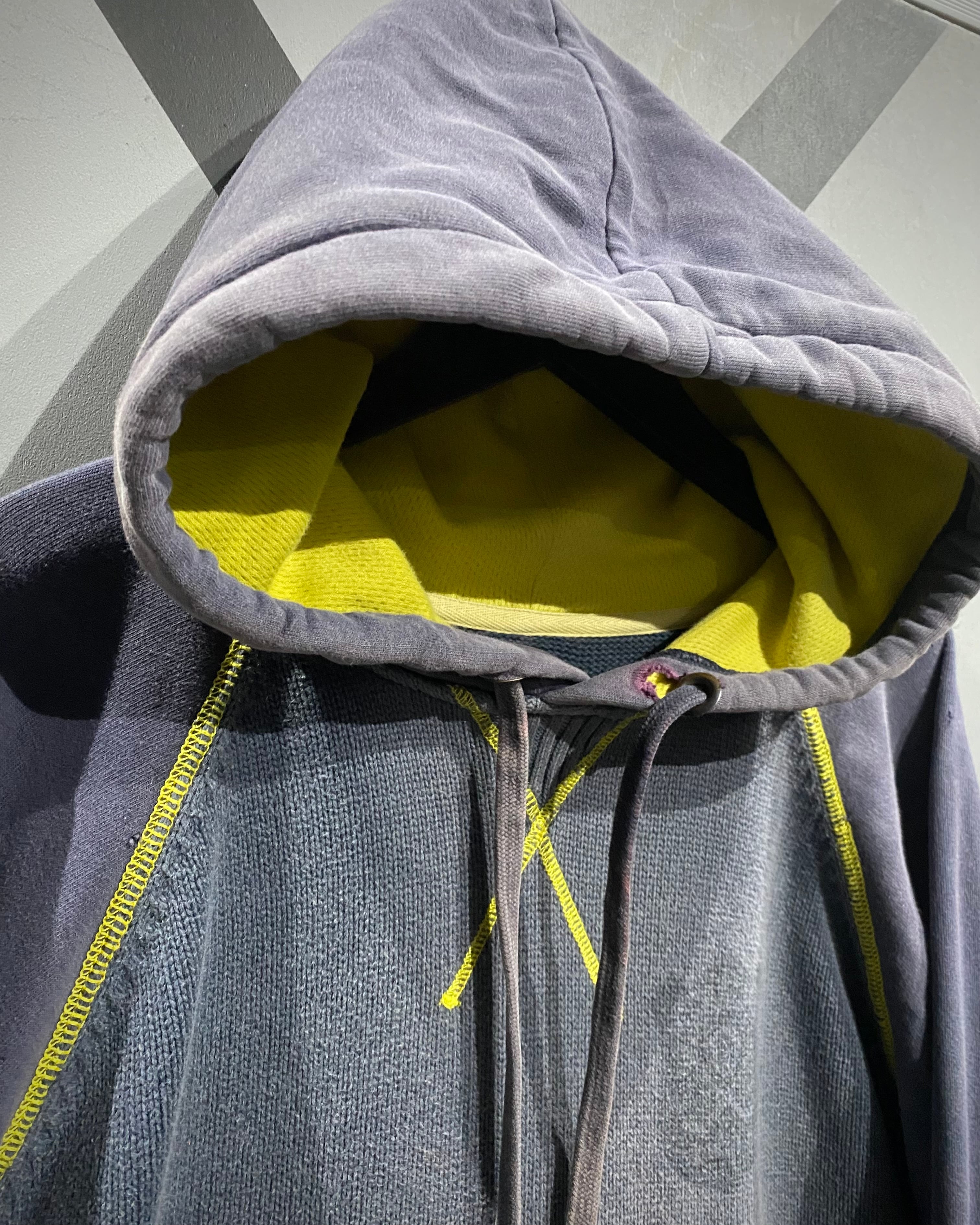 ボディ中央はざっくりとしたニット切り替え、スリーブはフェードしたスウェット地。そこへイエローのロックステッチを走らせ、スポーティさとモード感を絶妙にミックス。フード裏には通気性の良いメッシュを採用し、実用性も高い仕上がりに。