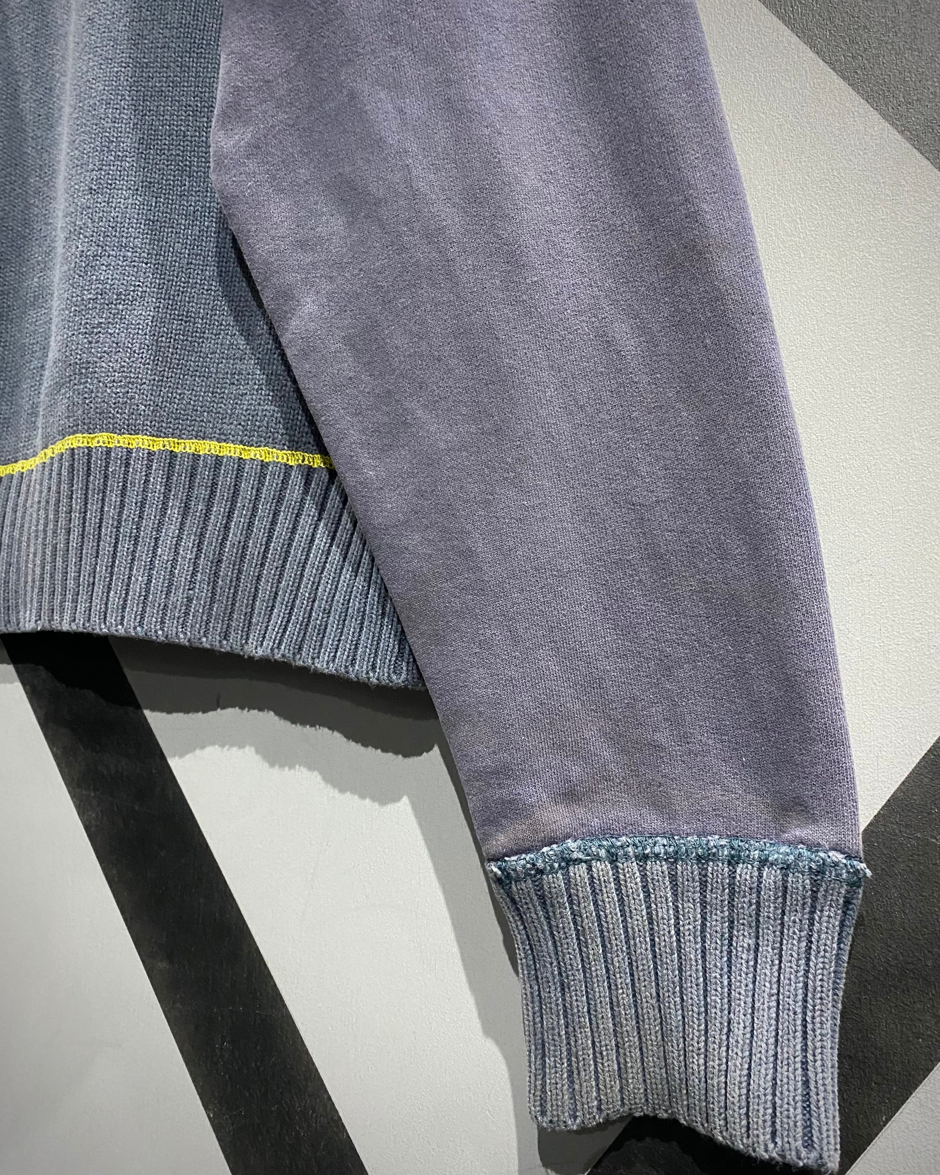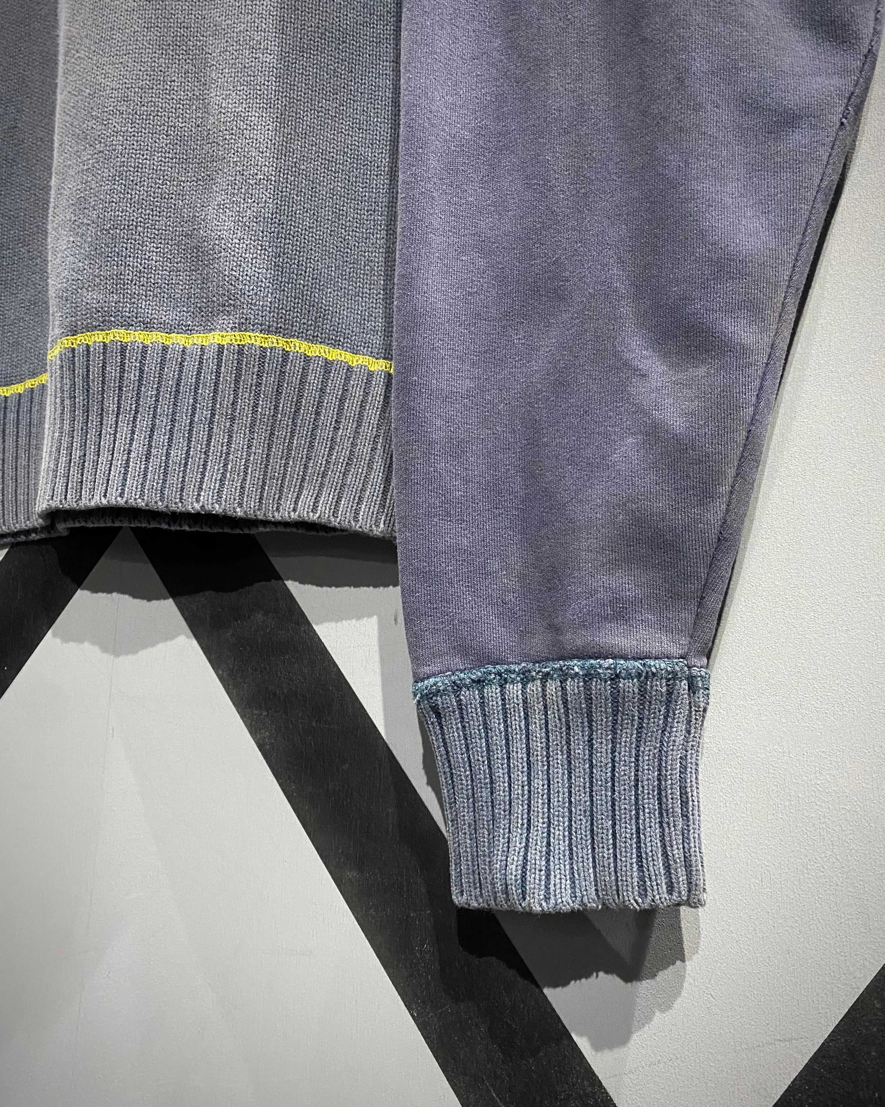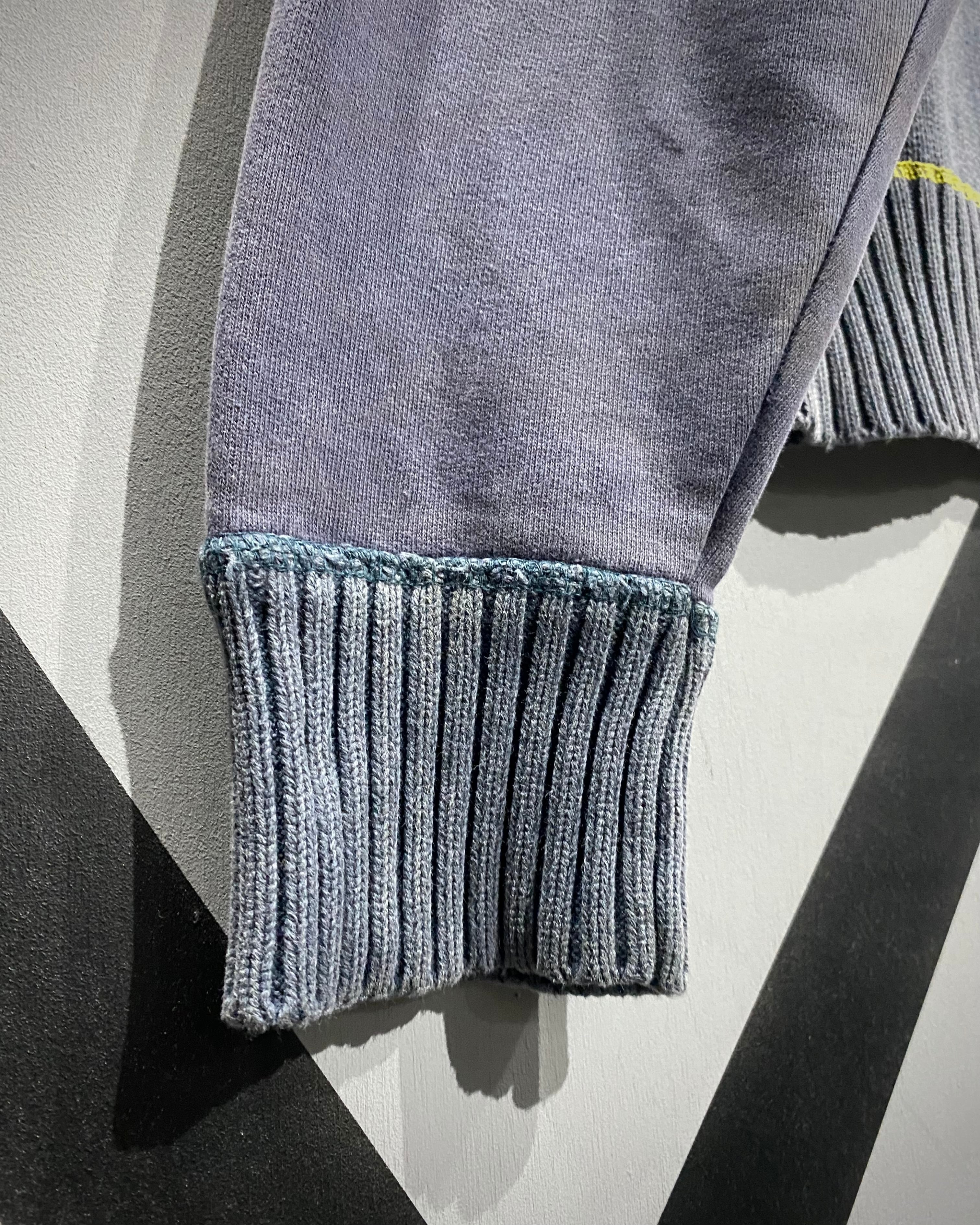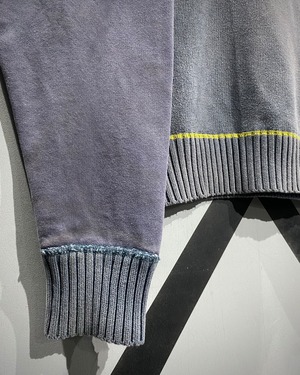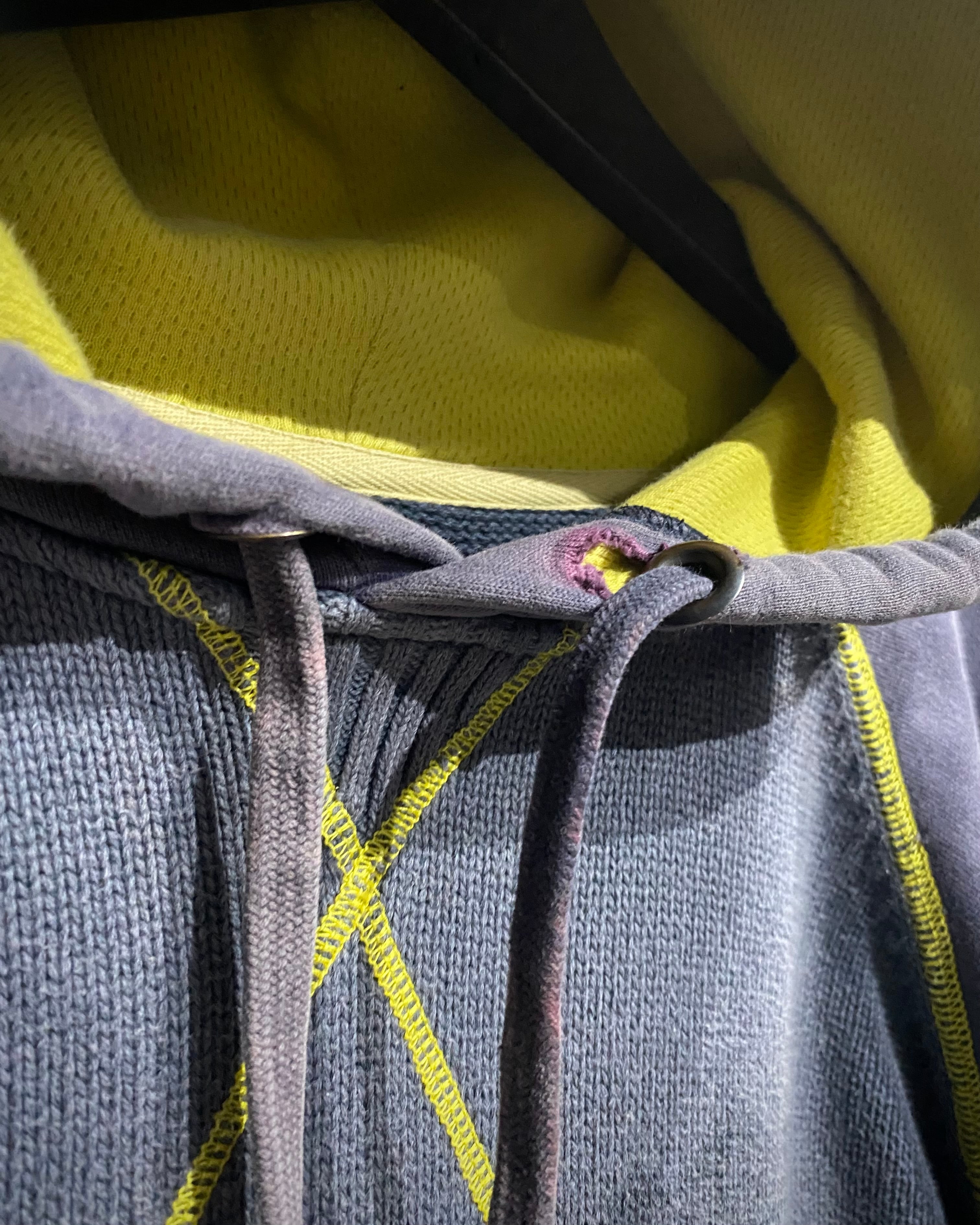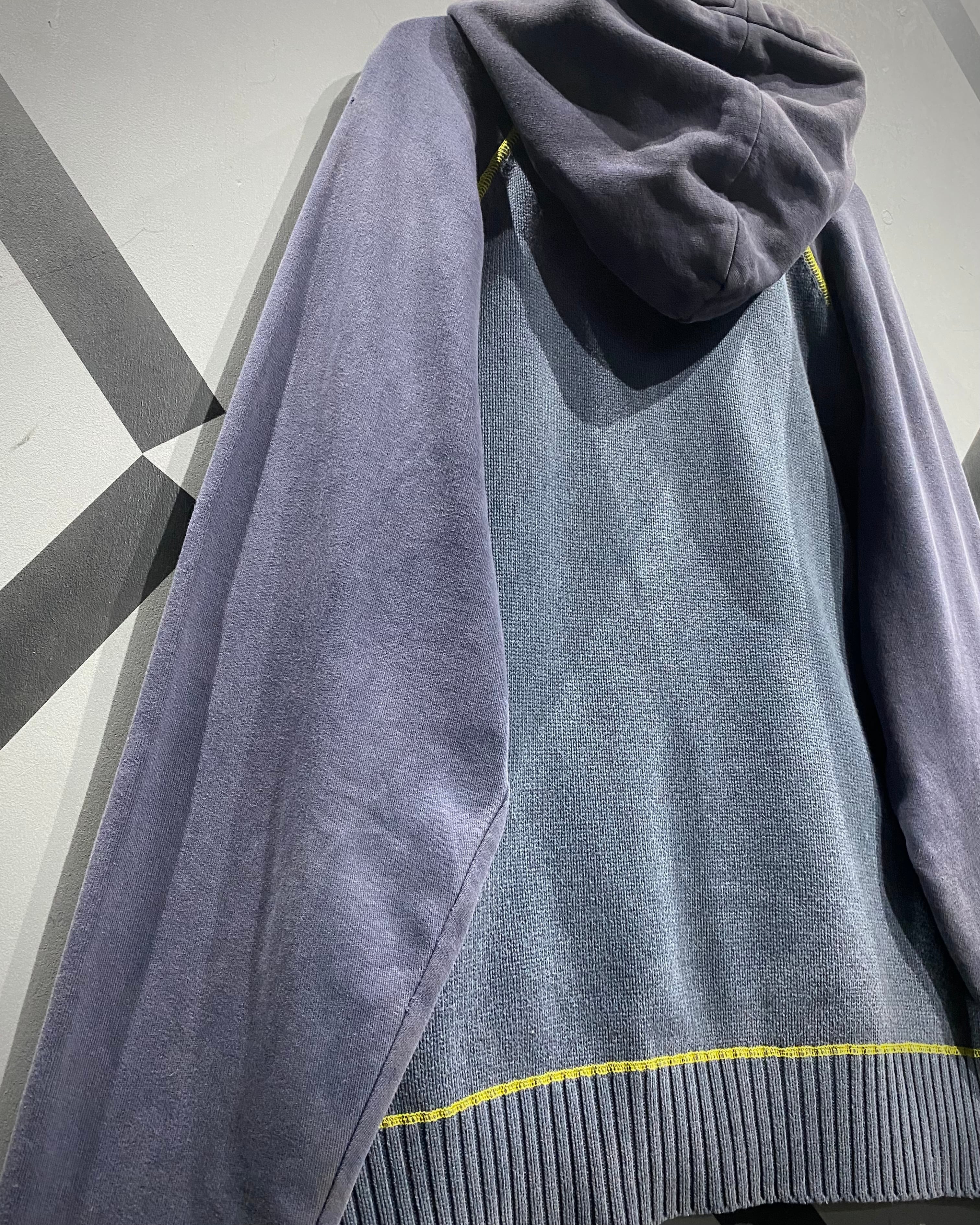ボディ中央はざっくりとしたニット切り替え、スリーブはフェードしたスウェット地。そこへイエローのロックステッチを走らせ、スポーティさとモード感を絶妙にミックス。フード裏には通気性の良いメッシュを採用し、実用性も高い仕上がりに。