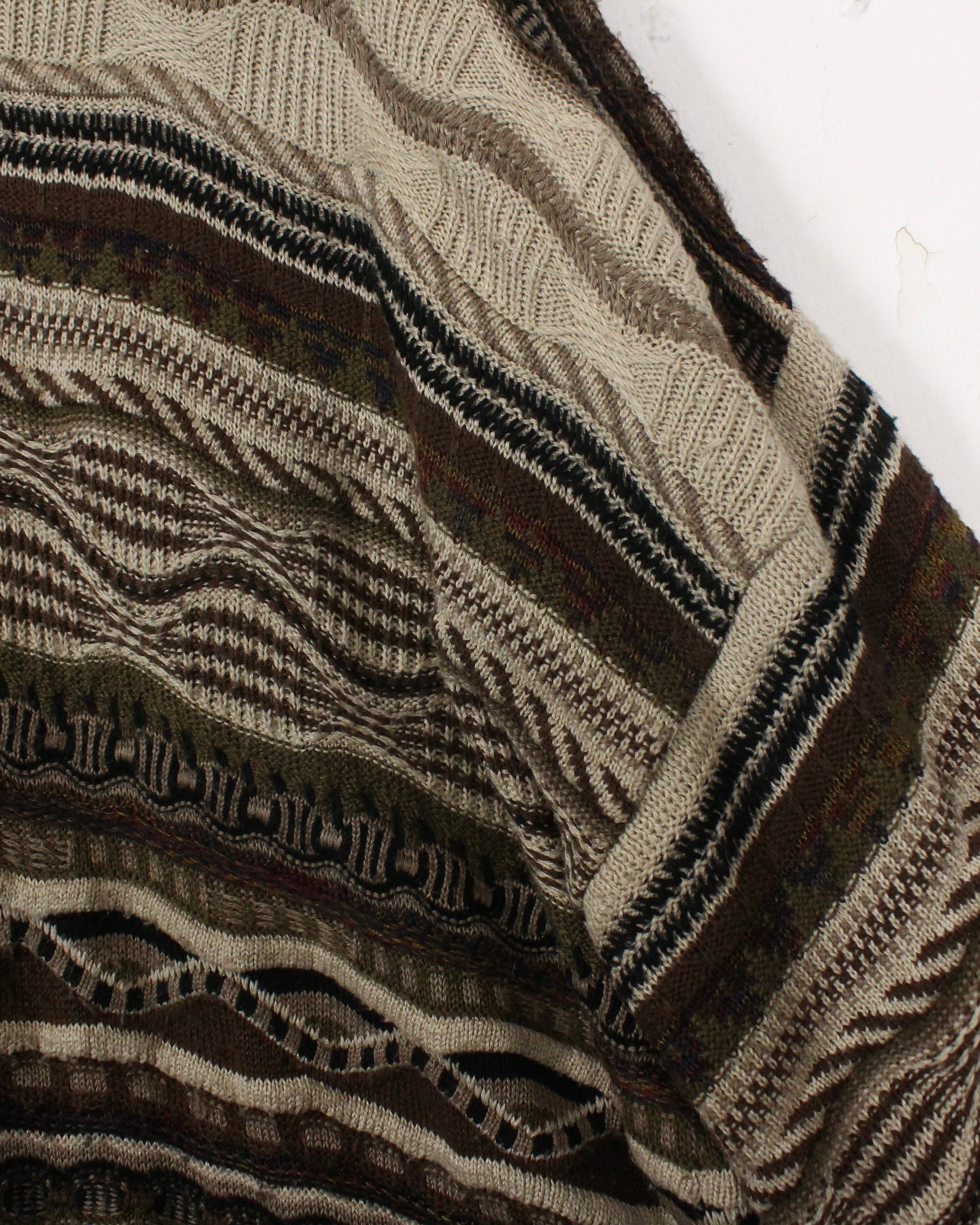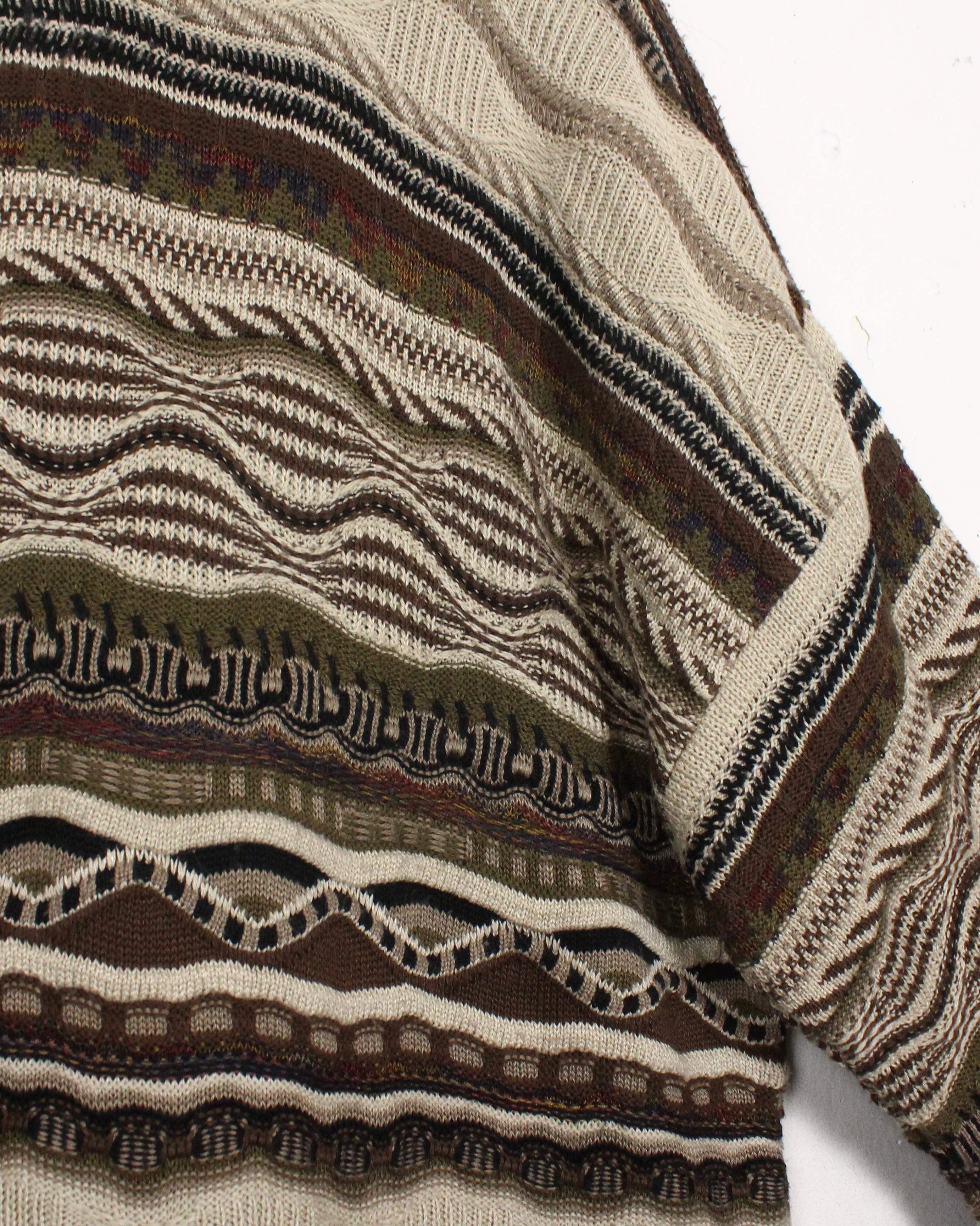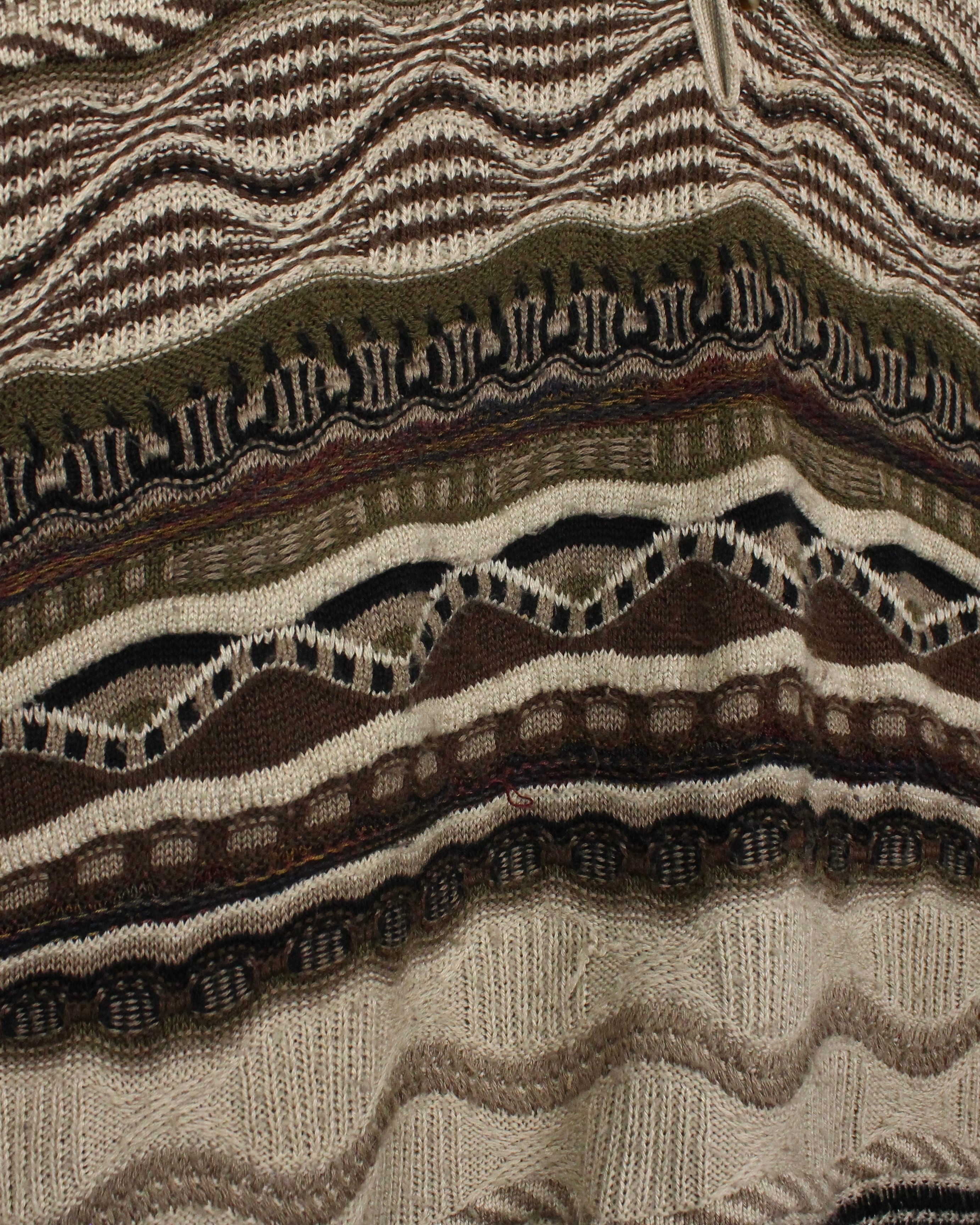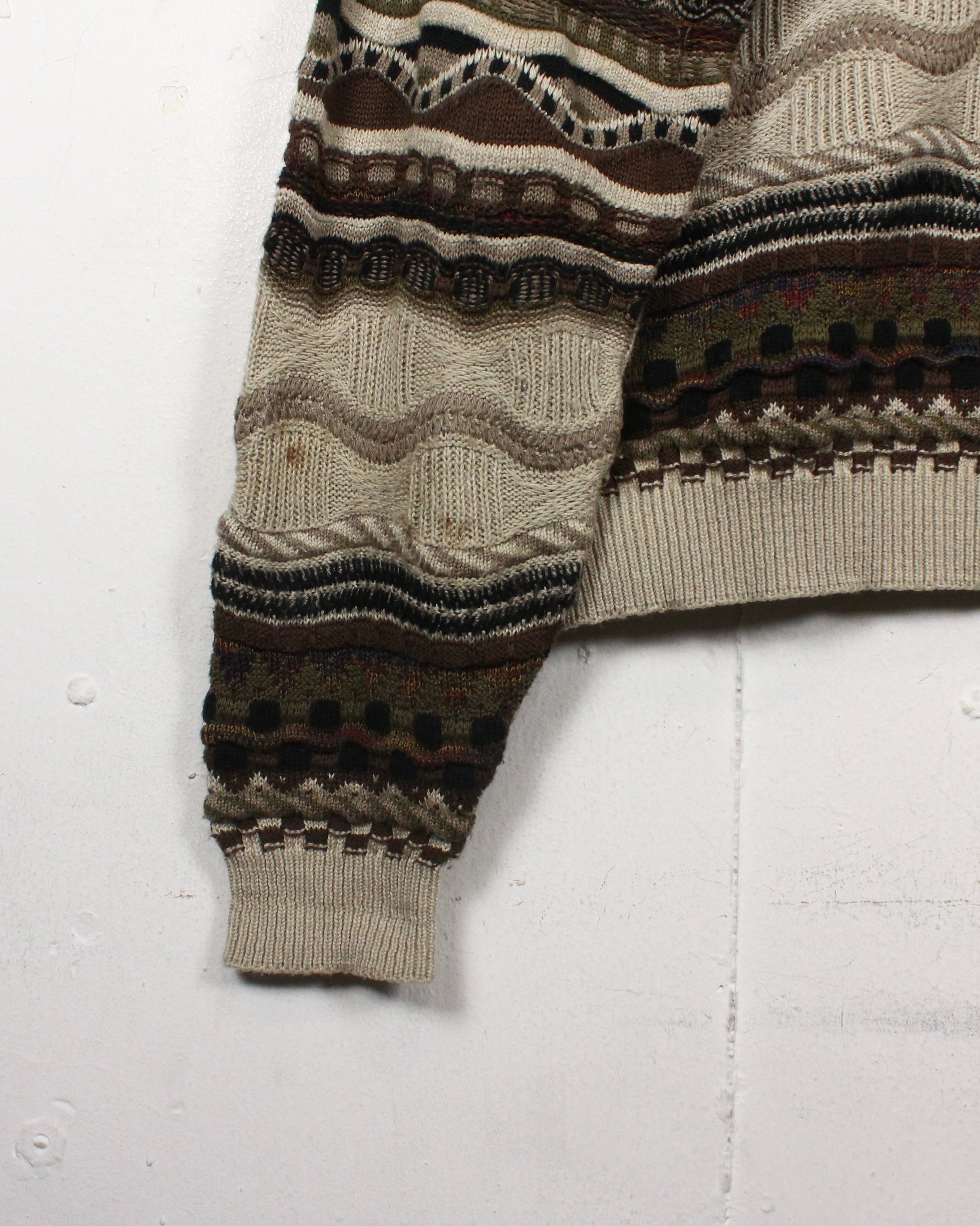 うねり、ジオメトリックパターン、ケーブル調の編みを複数重ねた贅沢仕様で、視覚的にも触感的にも抜群の存在感を放つ1着です。