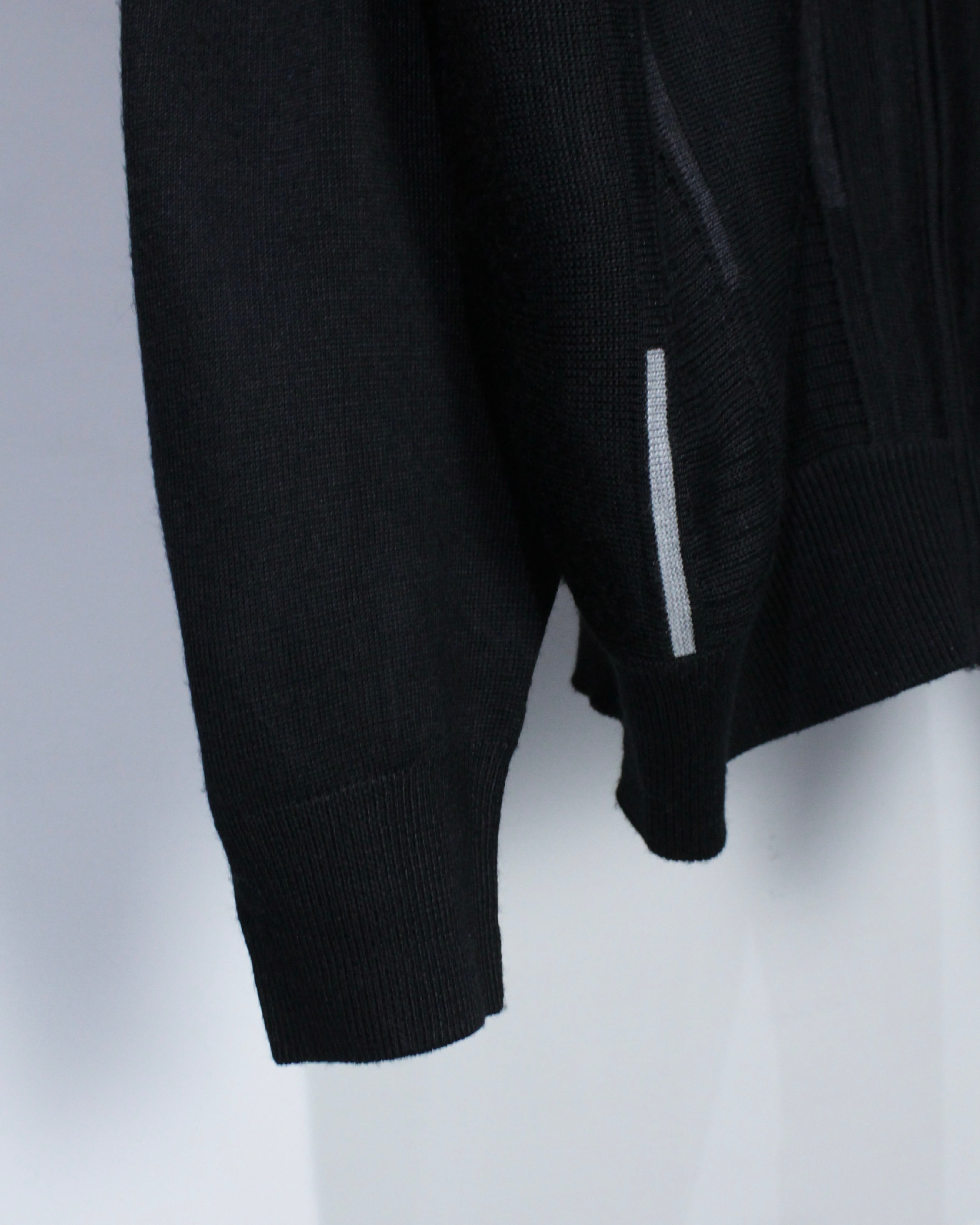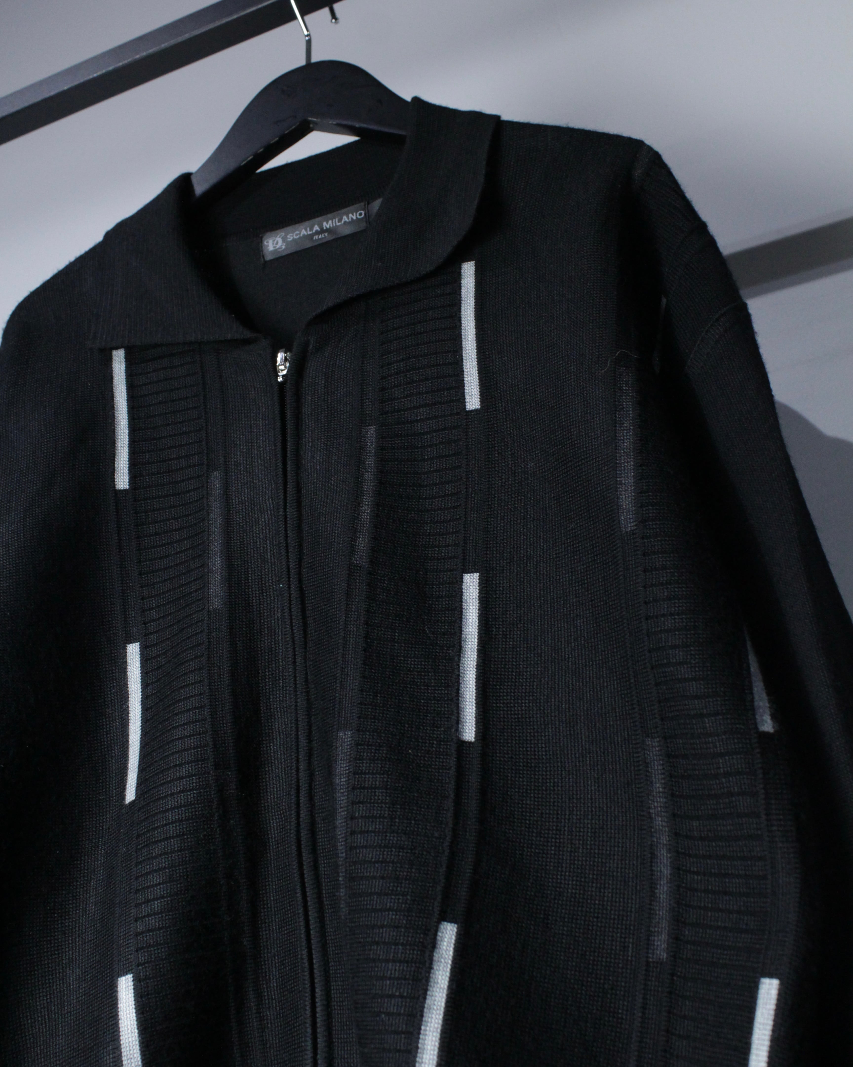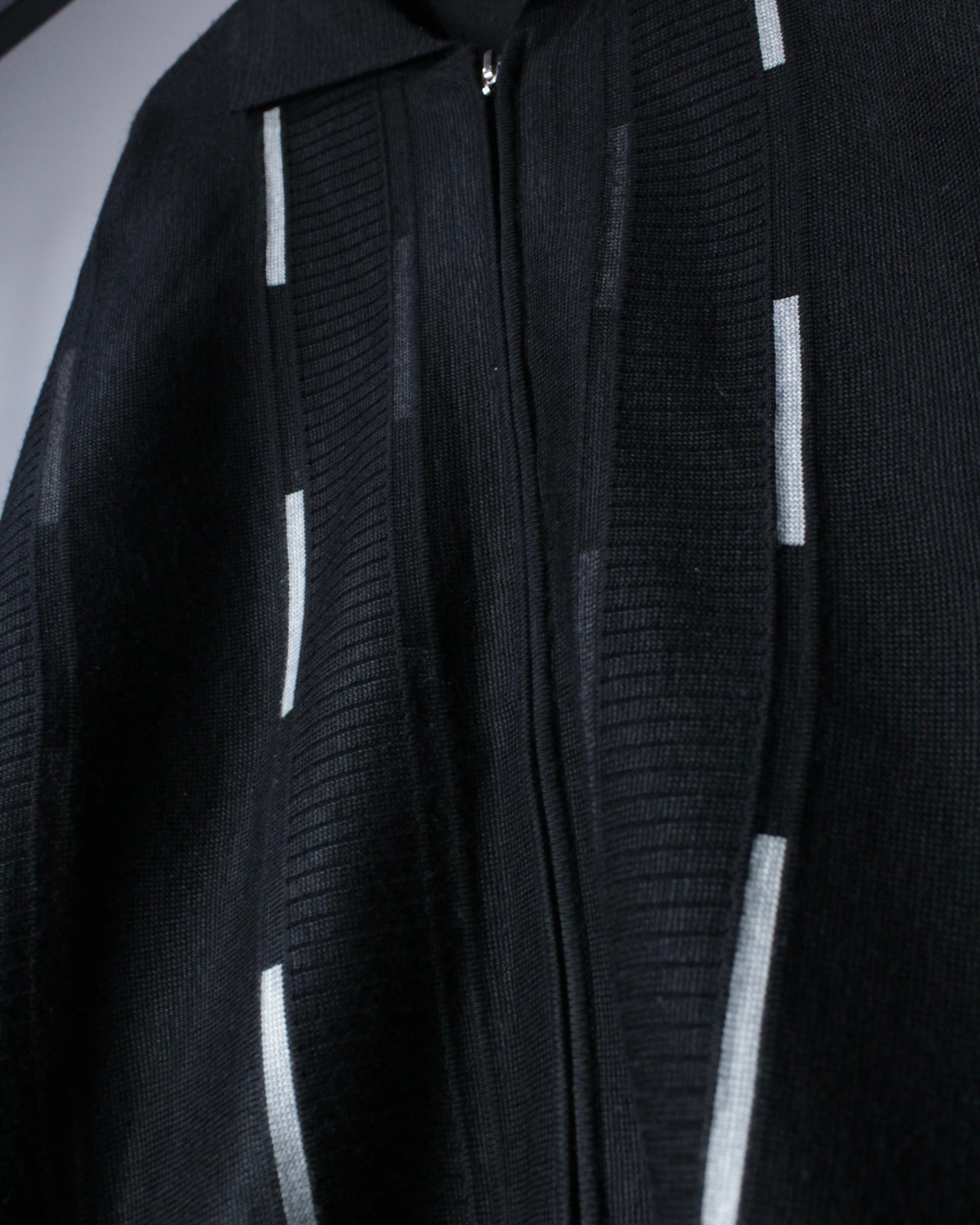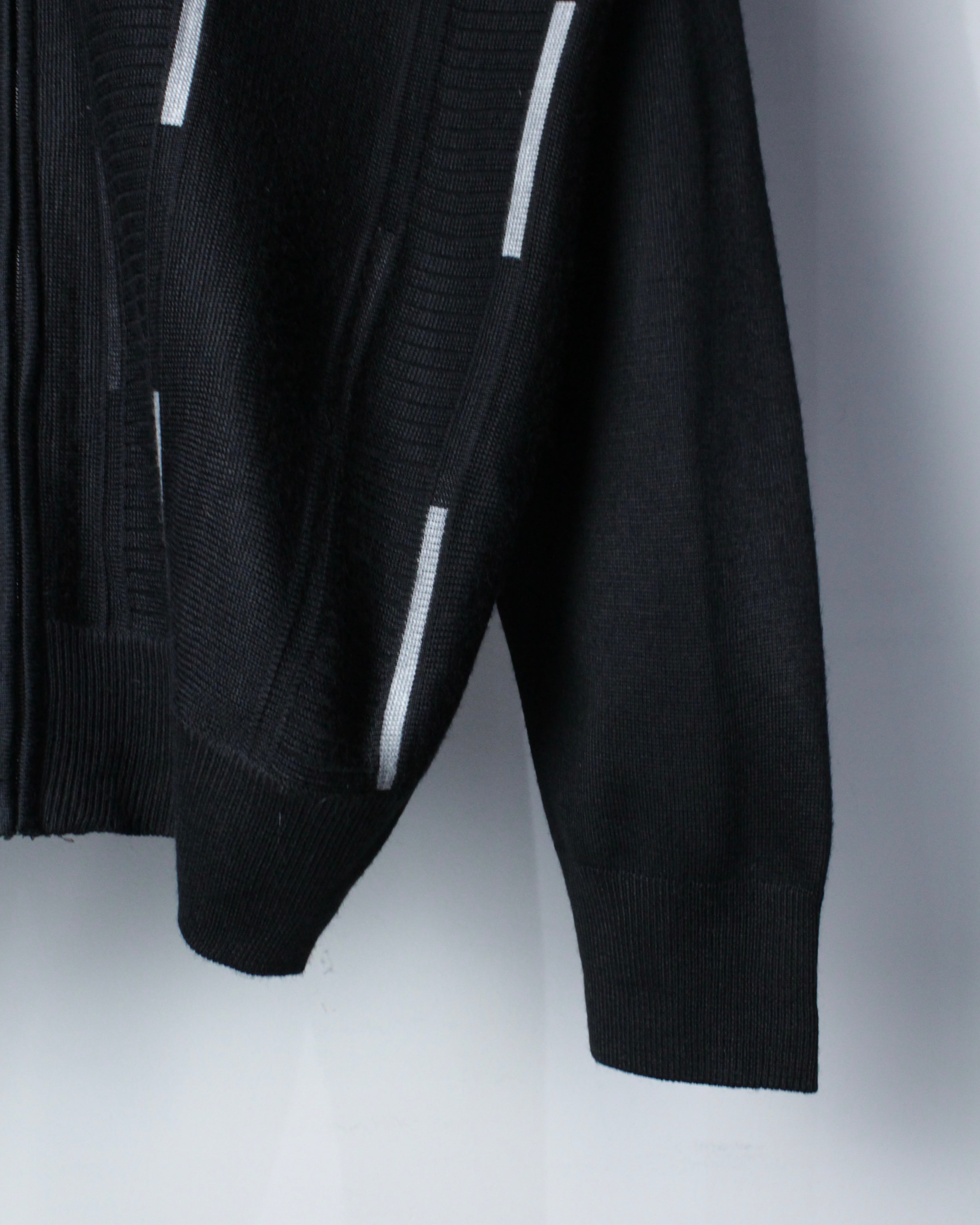 ブラックボディをベースに、フロントへ縦に走るラインパターンを配したジップアップニットジャケット。