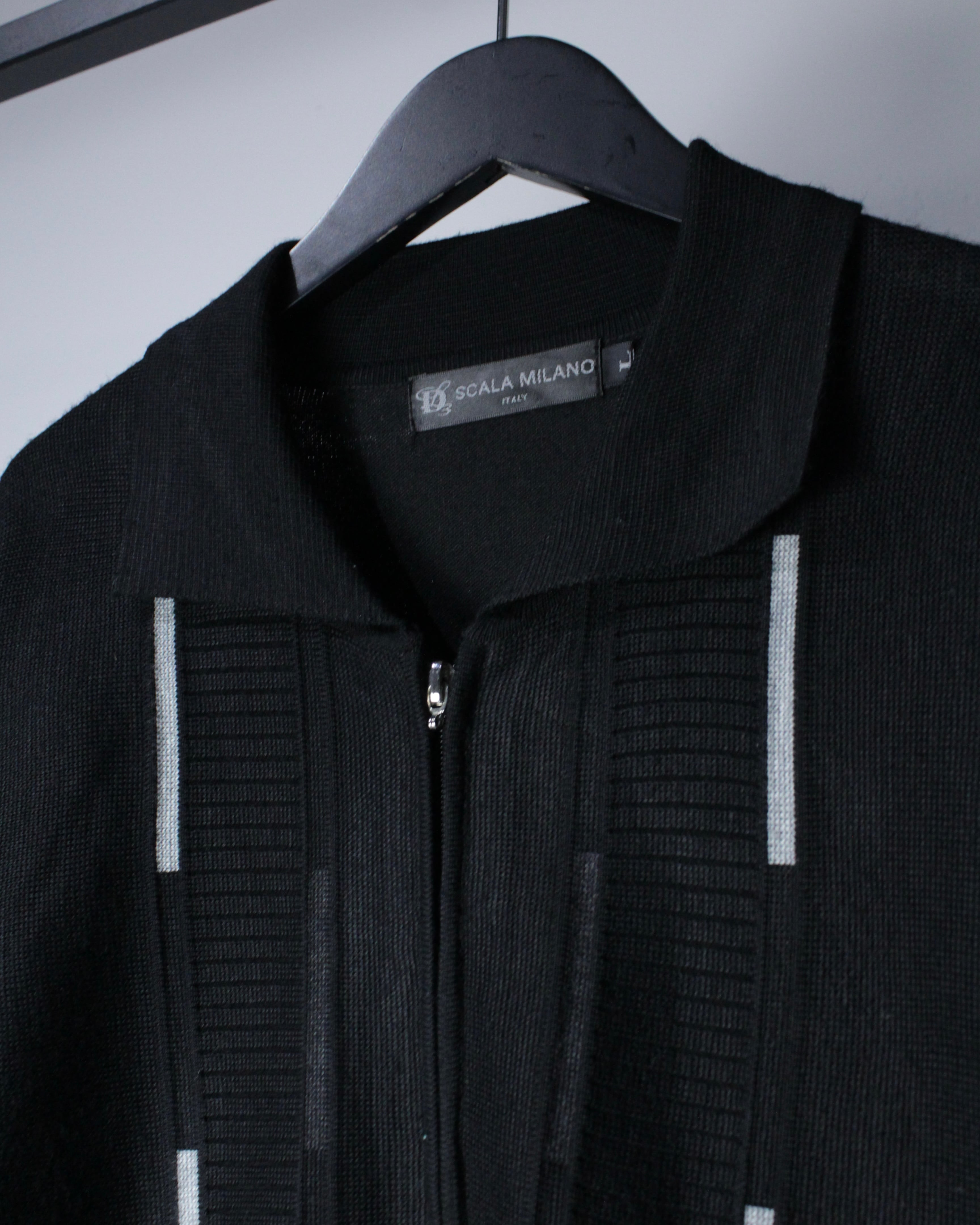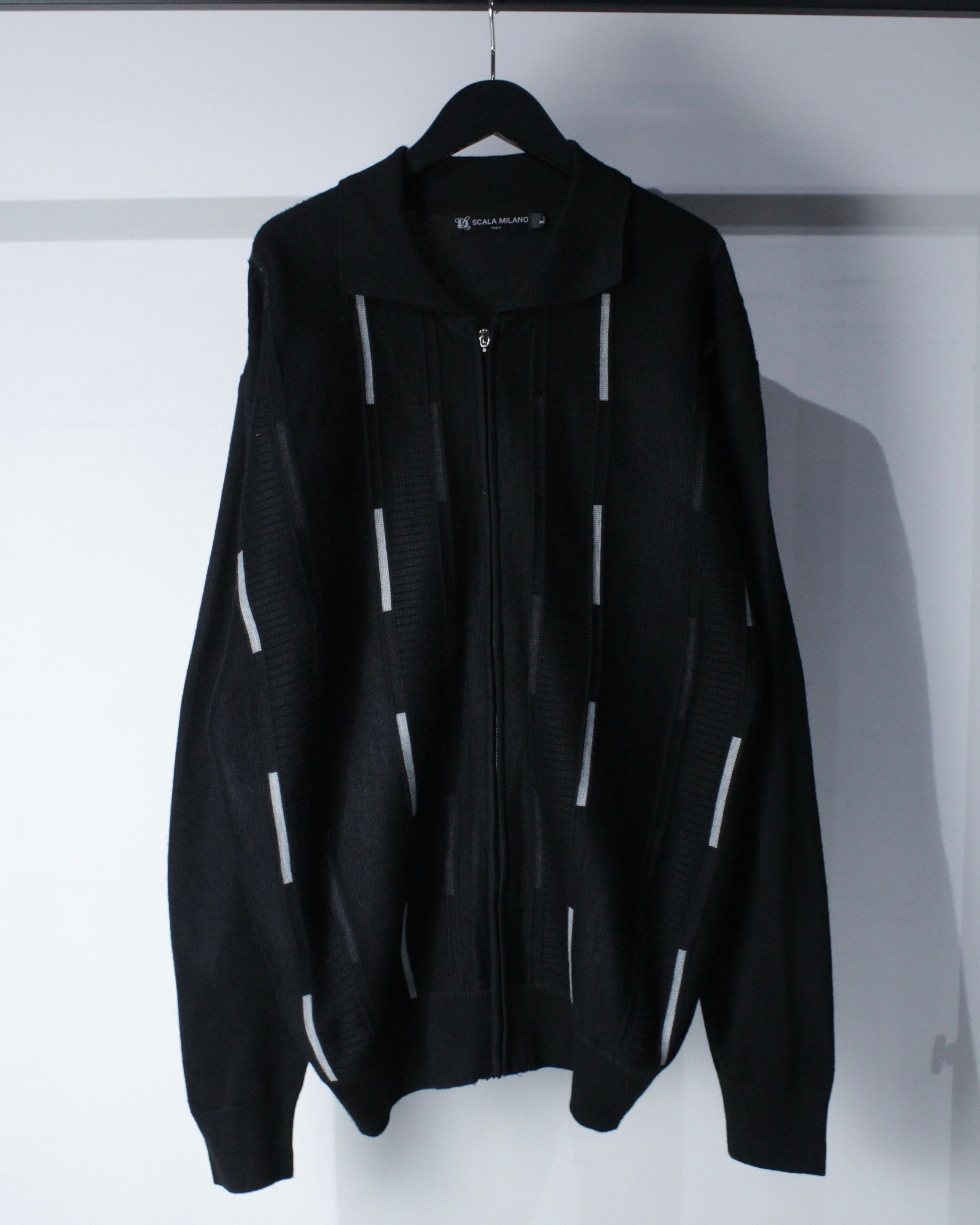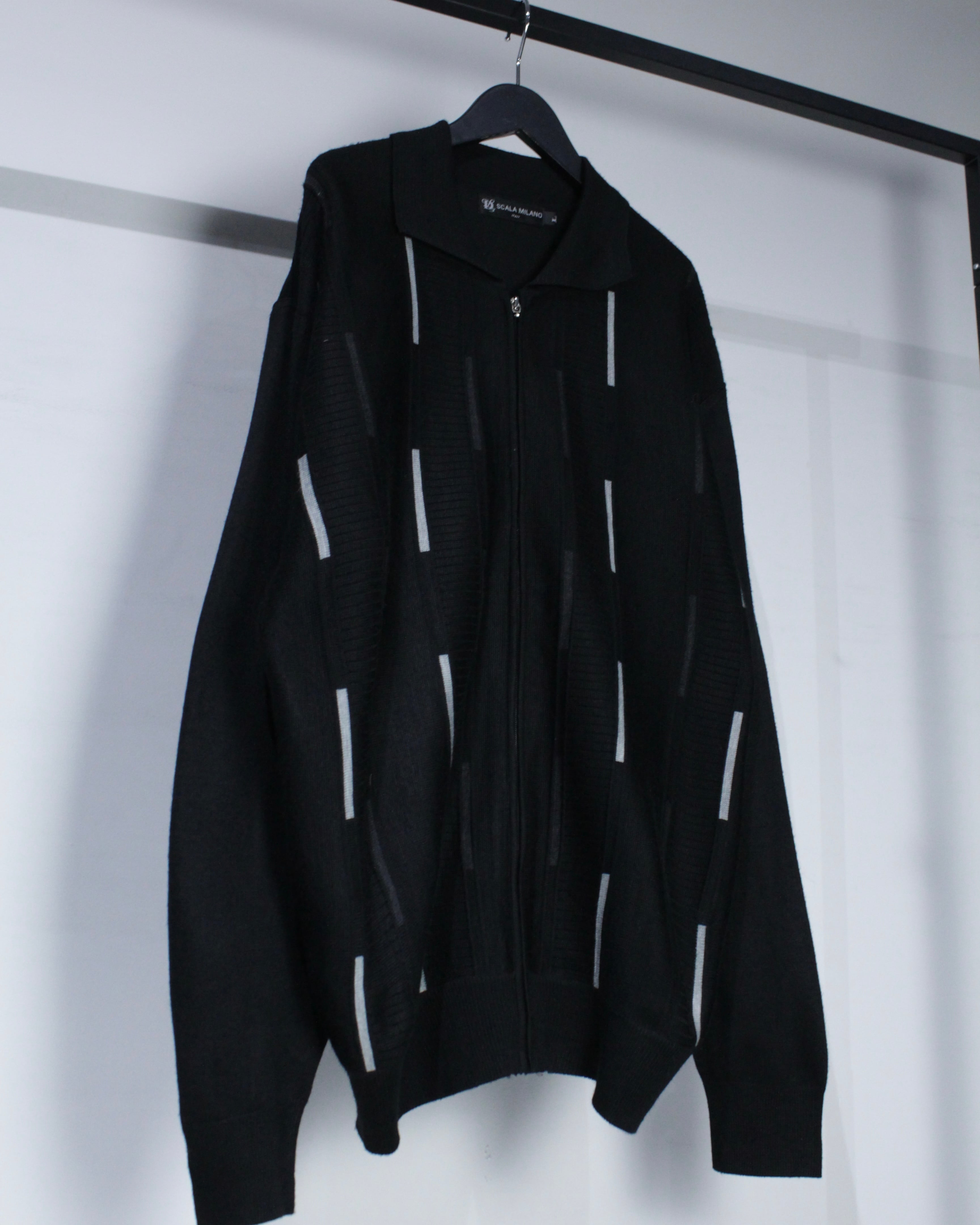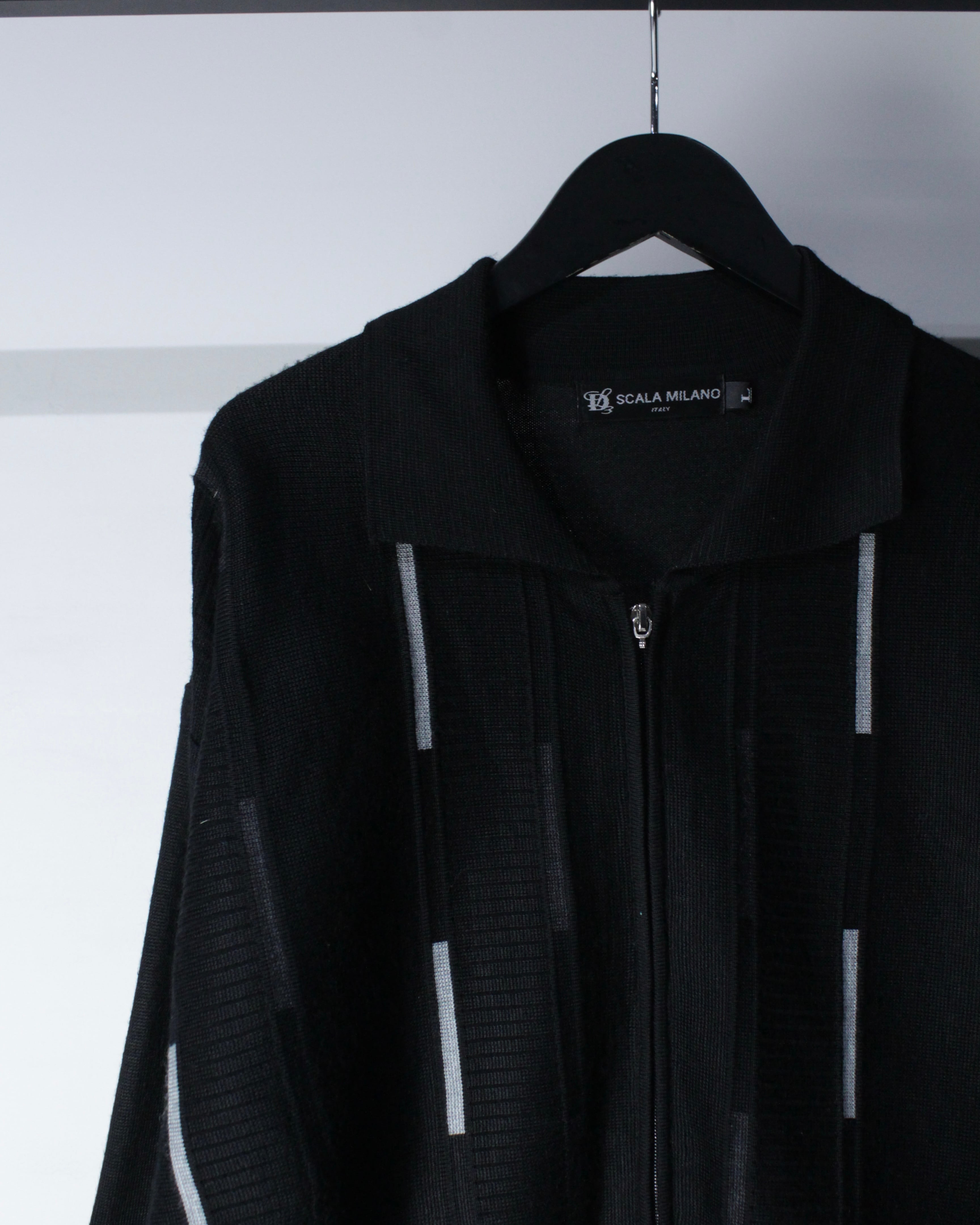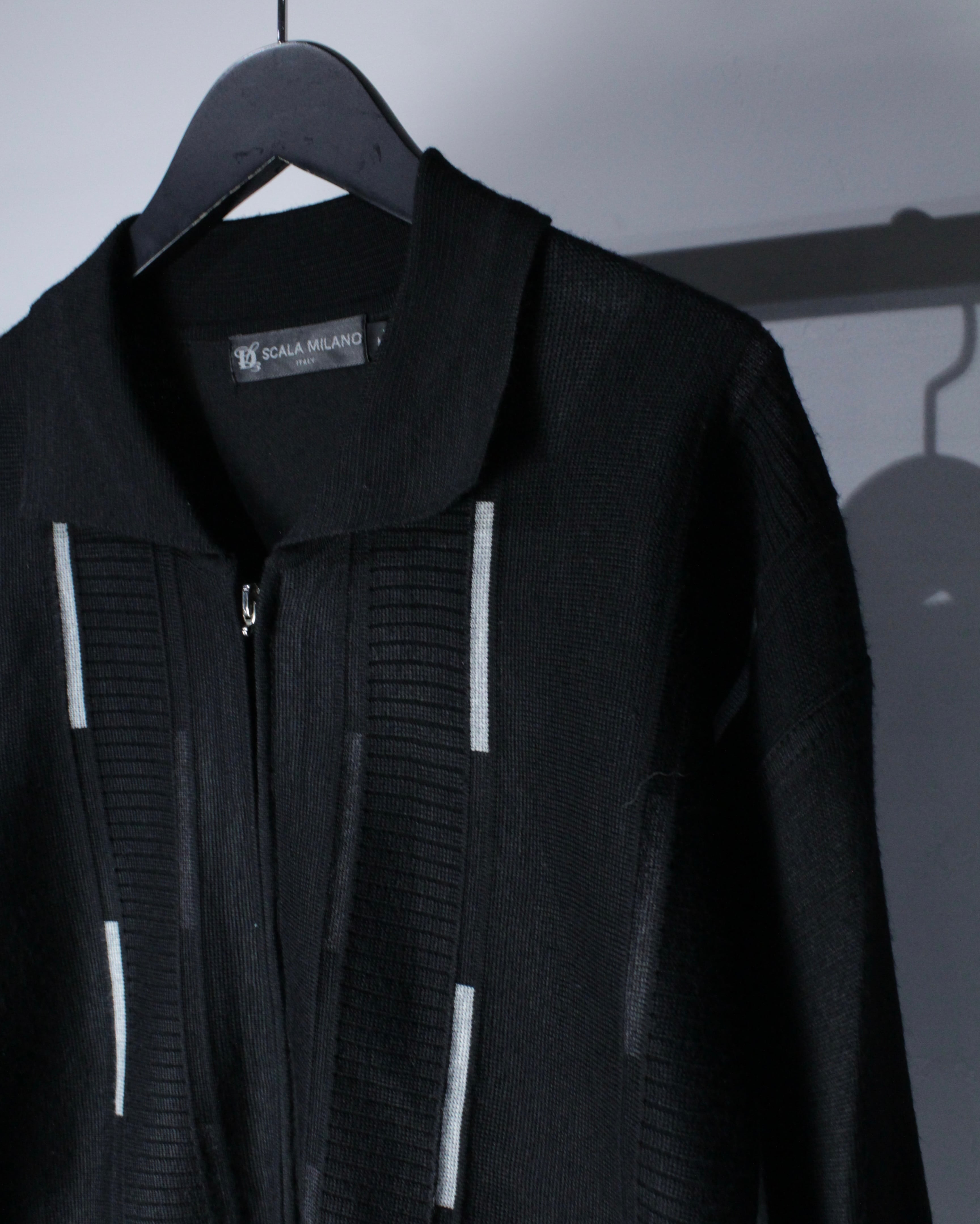 ブラックボディをベースに、フロントへ縦に走るラインパターンを配したジップアップニットジャケット。