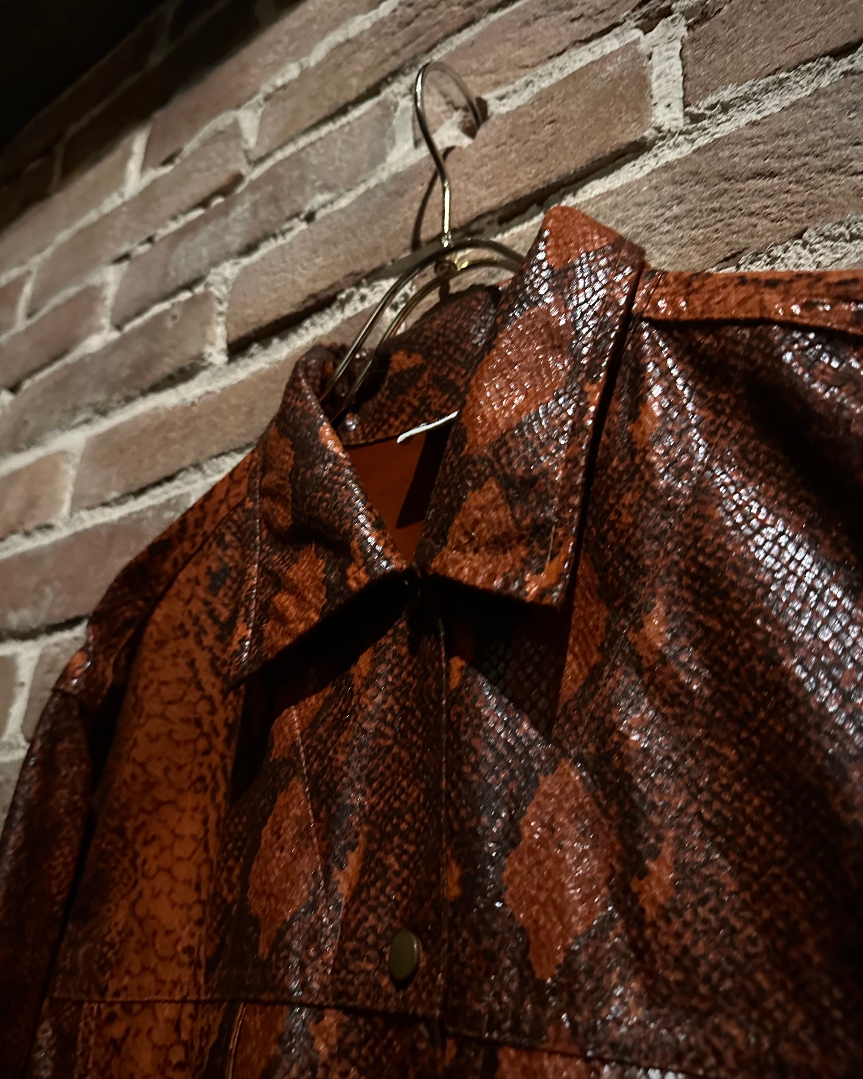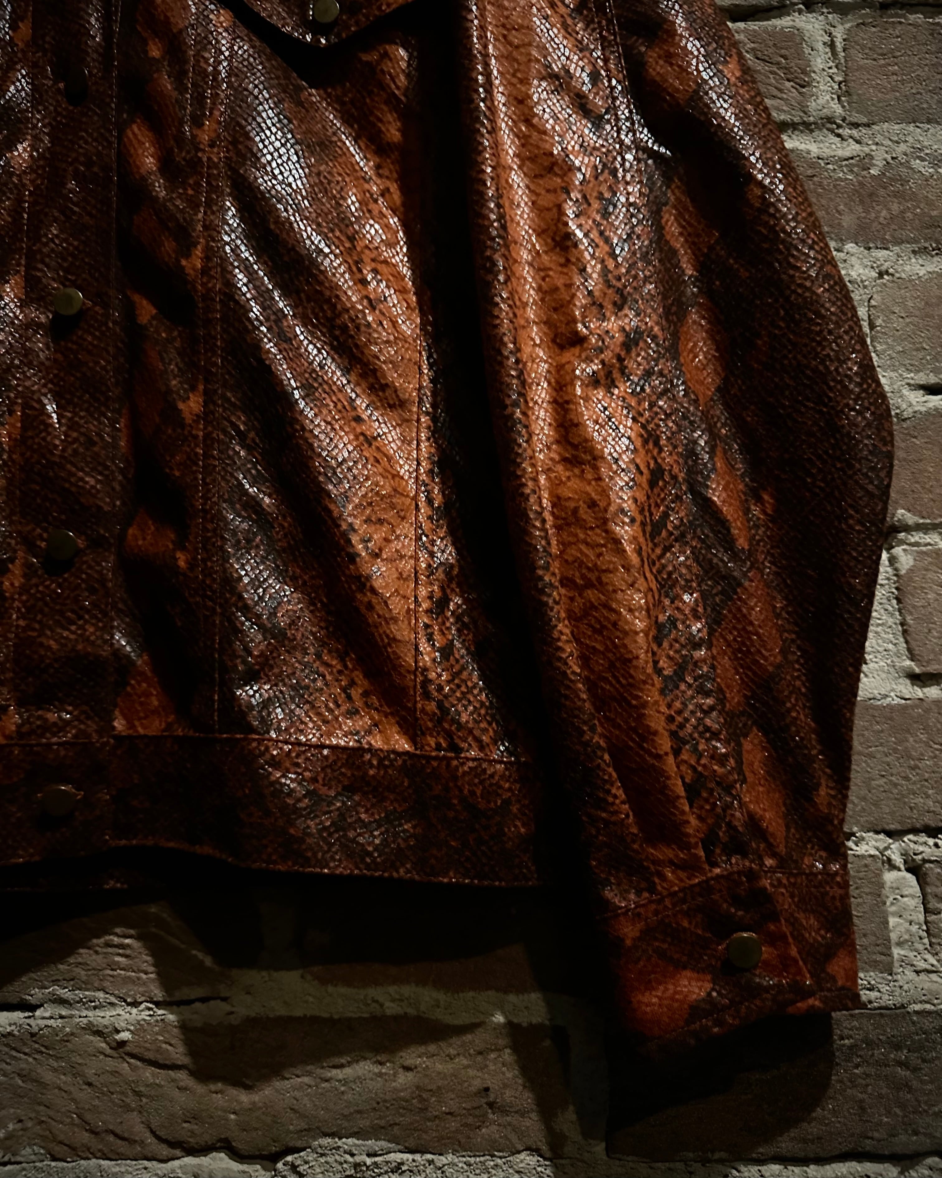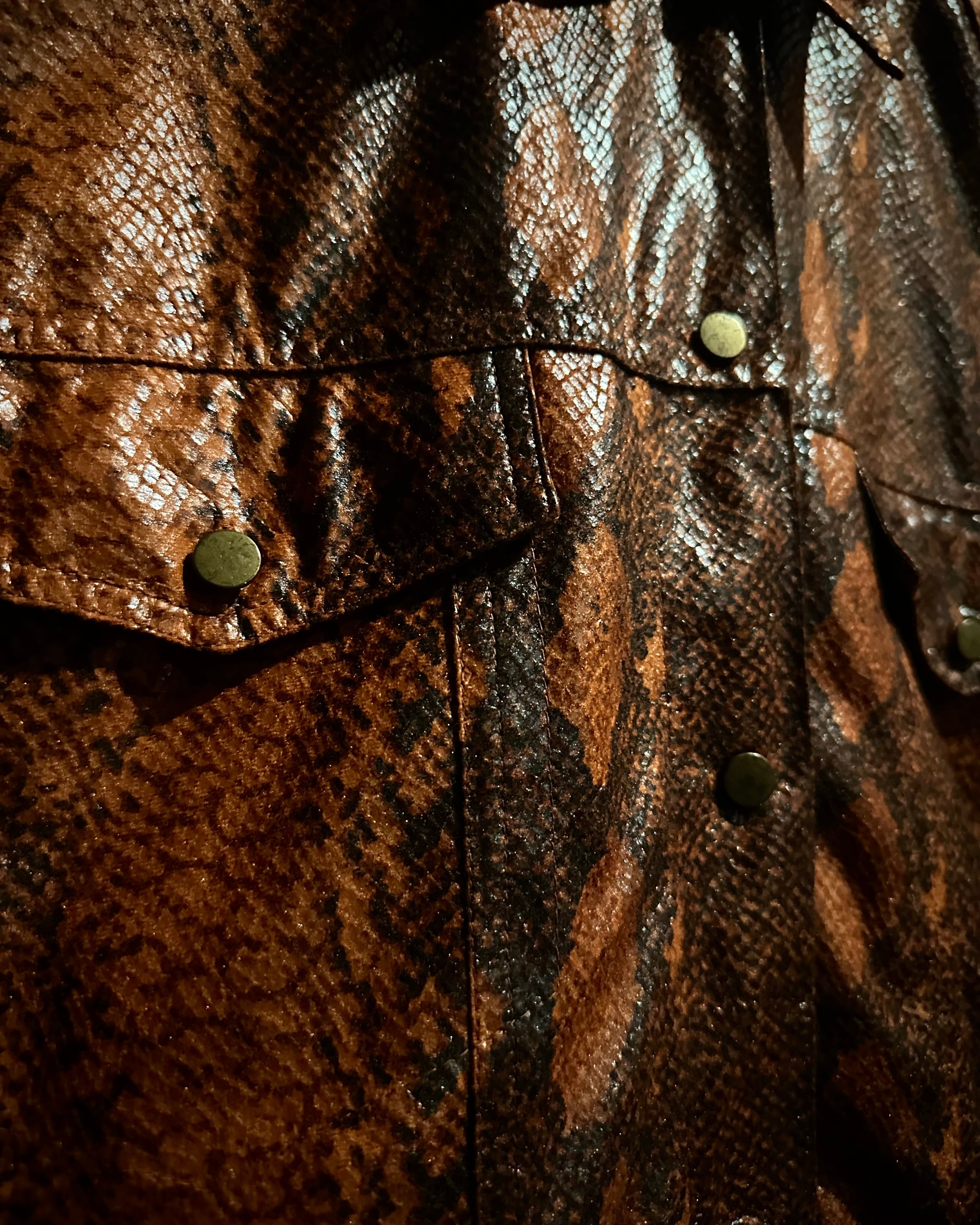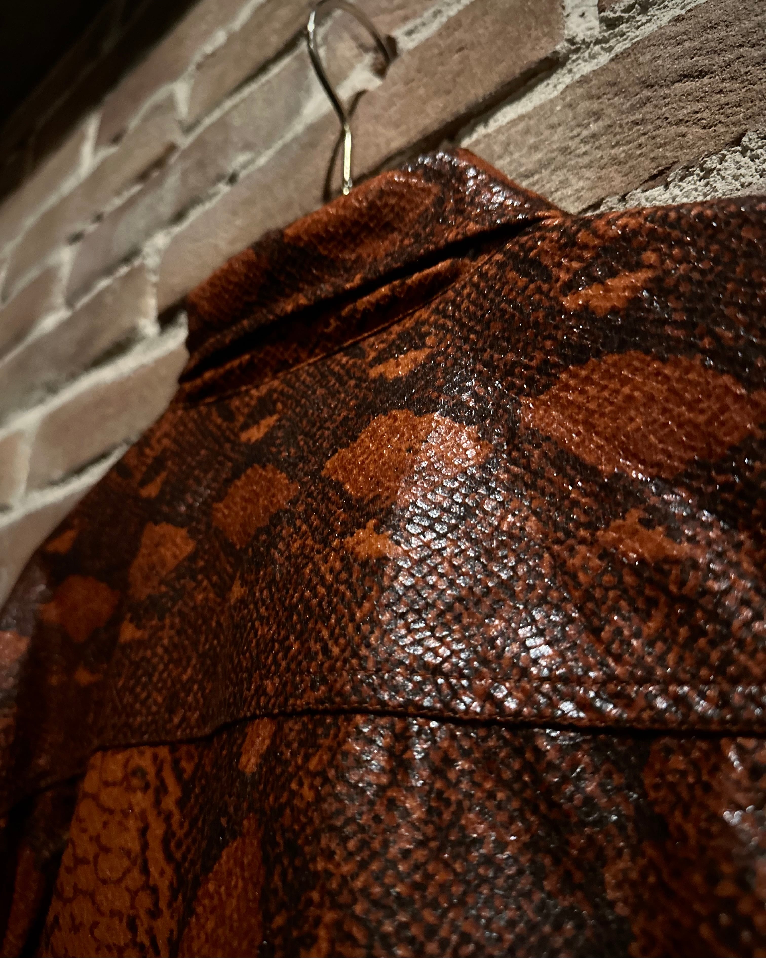 ディテールは王道トラッカージャケット型を踏襲。パイソン柄のラグジュアリーさと、トラッカー型特有のラフな空気感が絶妙に交差し、唯一無二の存在感を放ちます。