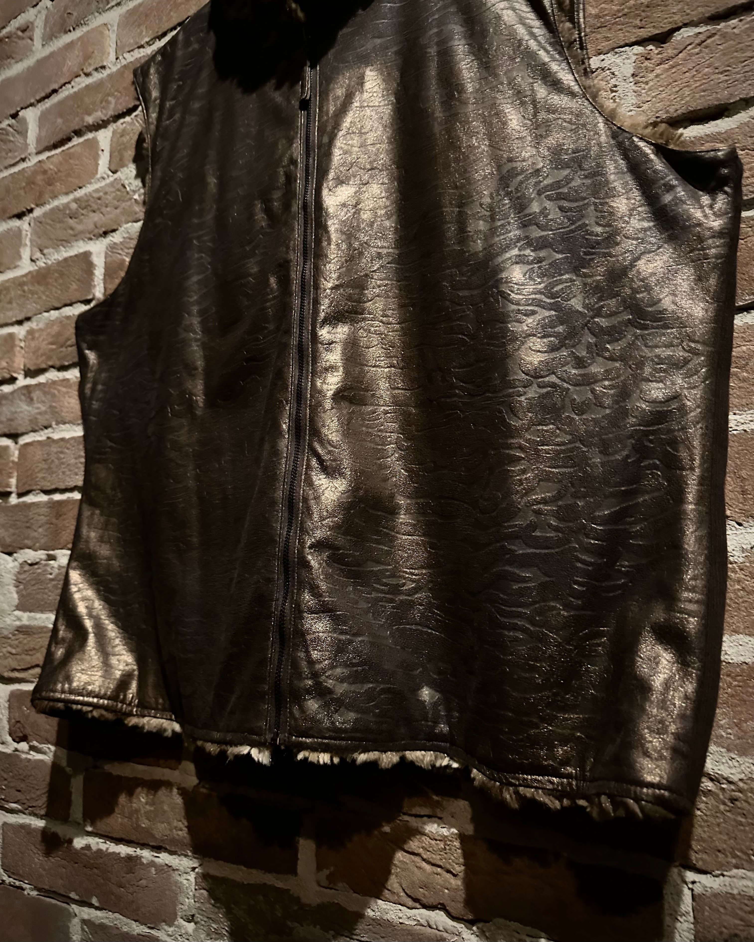 ゼブラ調の型押しレザーのような表情を持つブラウンゴールドのボディと、濃淡の効いたフェイクファーを切り替えた、リバーシブル仕様のベスト。