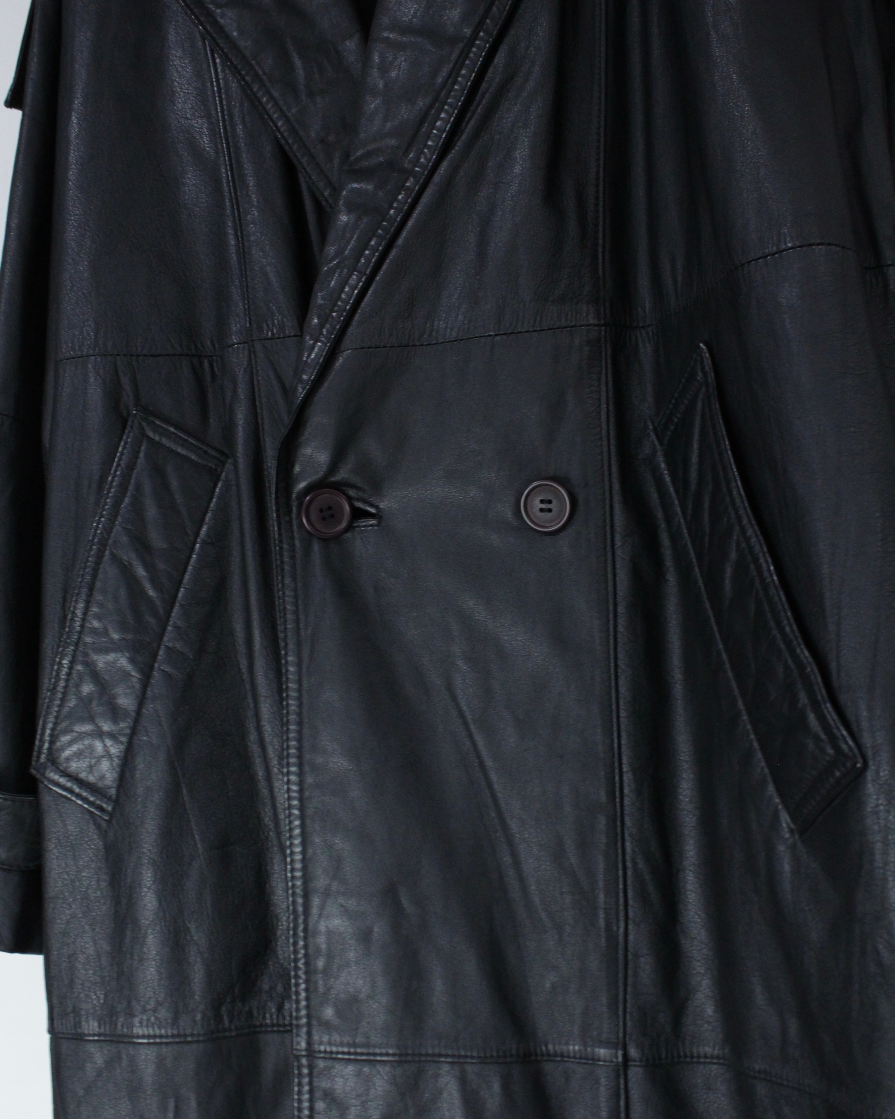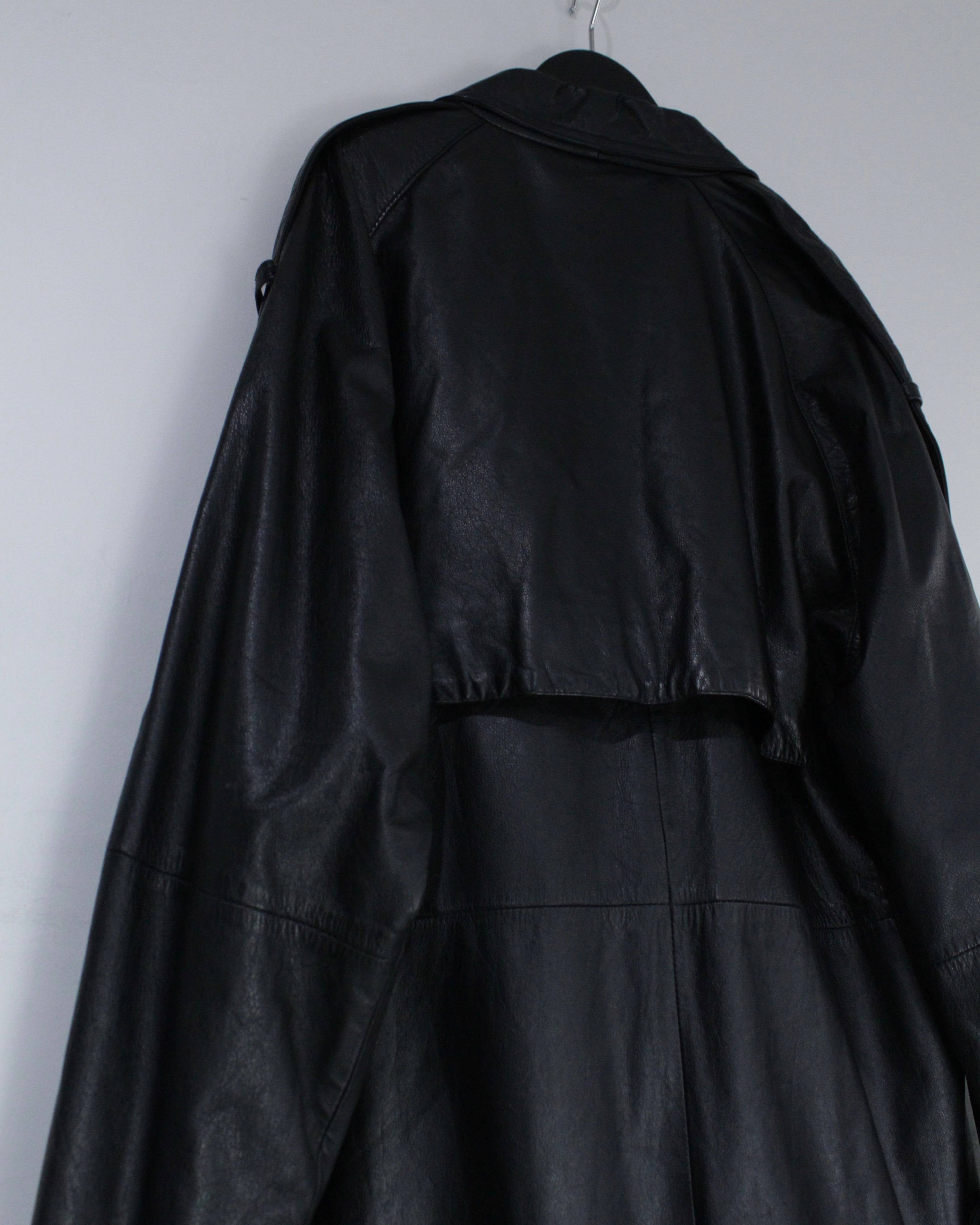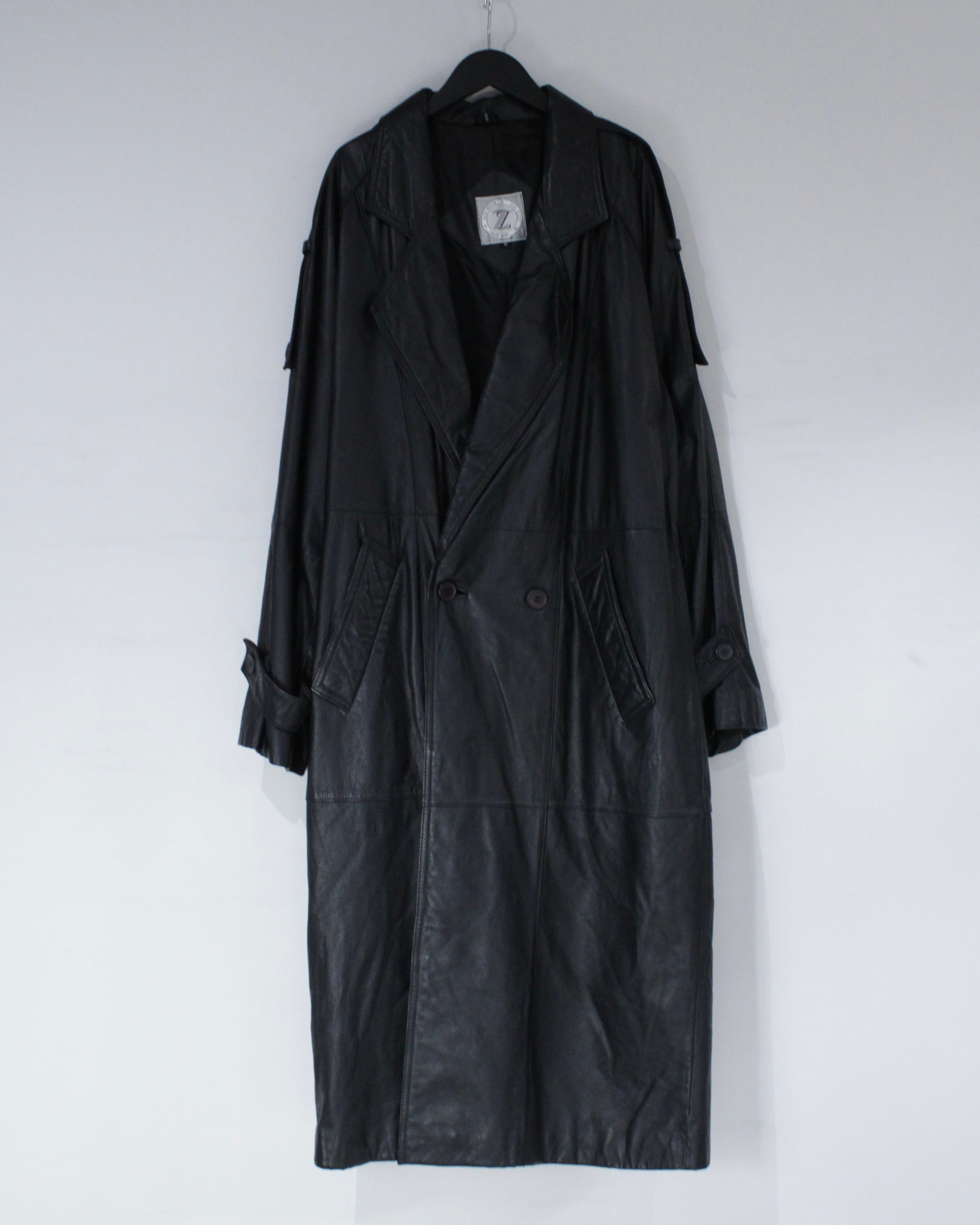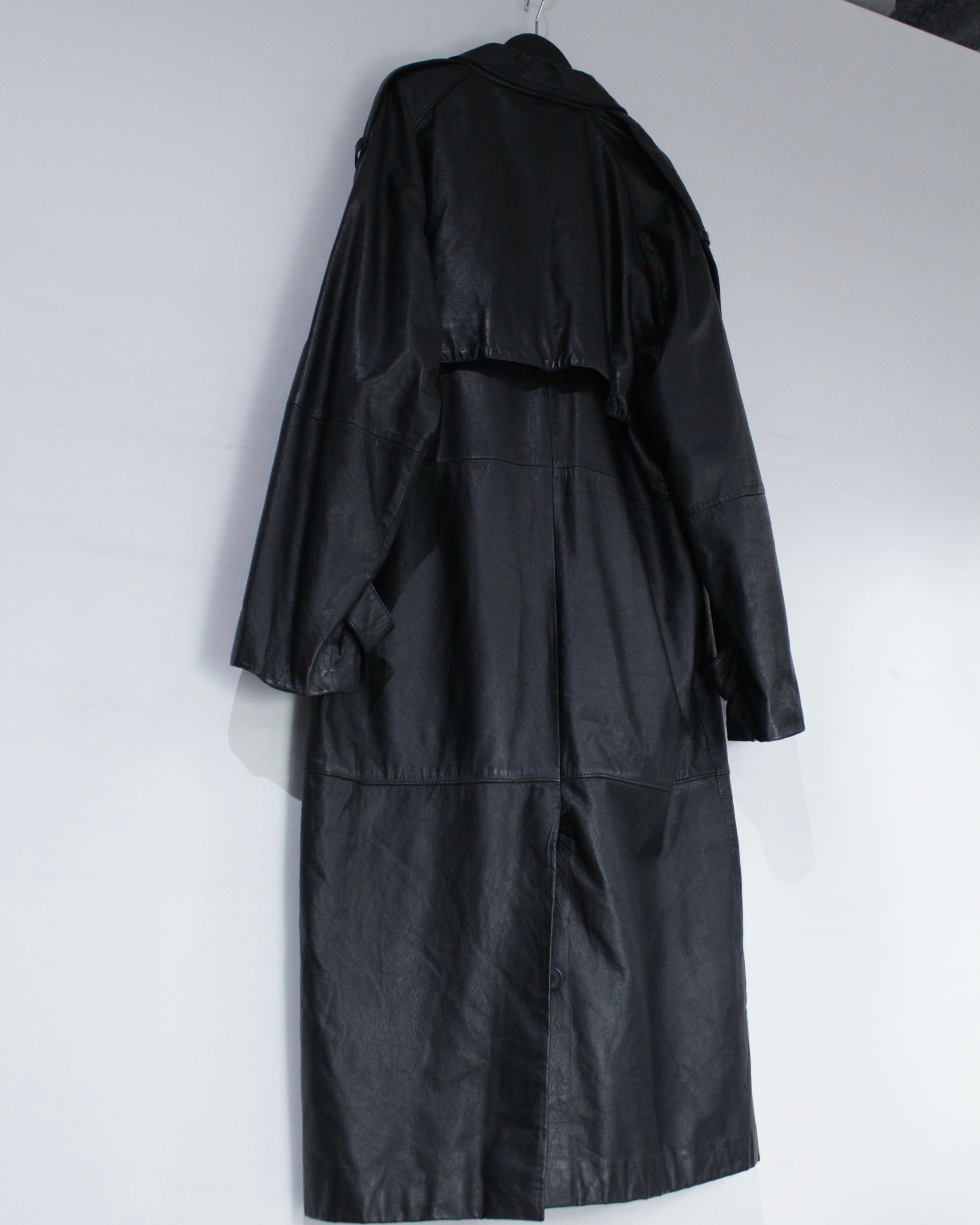 たっぷりとレングスを確保したロング丈が圧巻の存在感を放つ、レザートレンチコート。