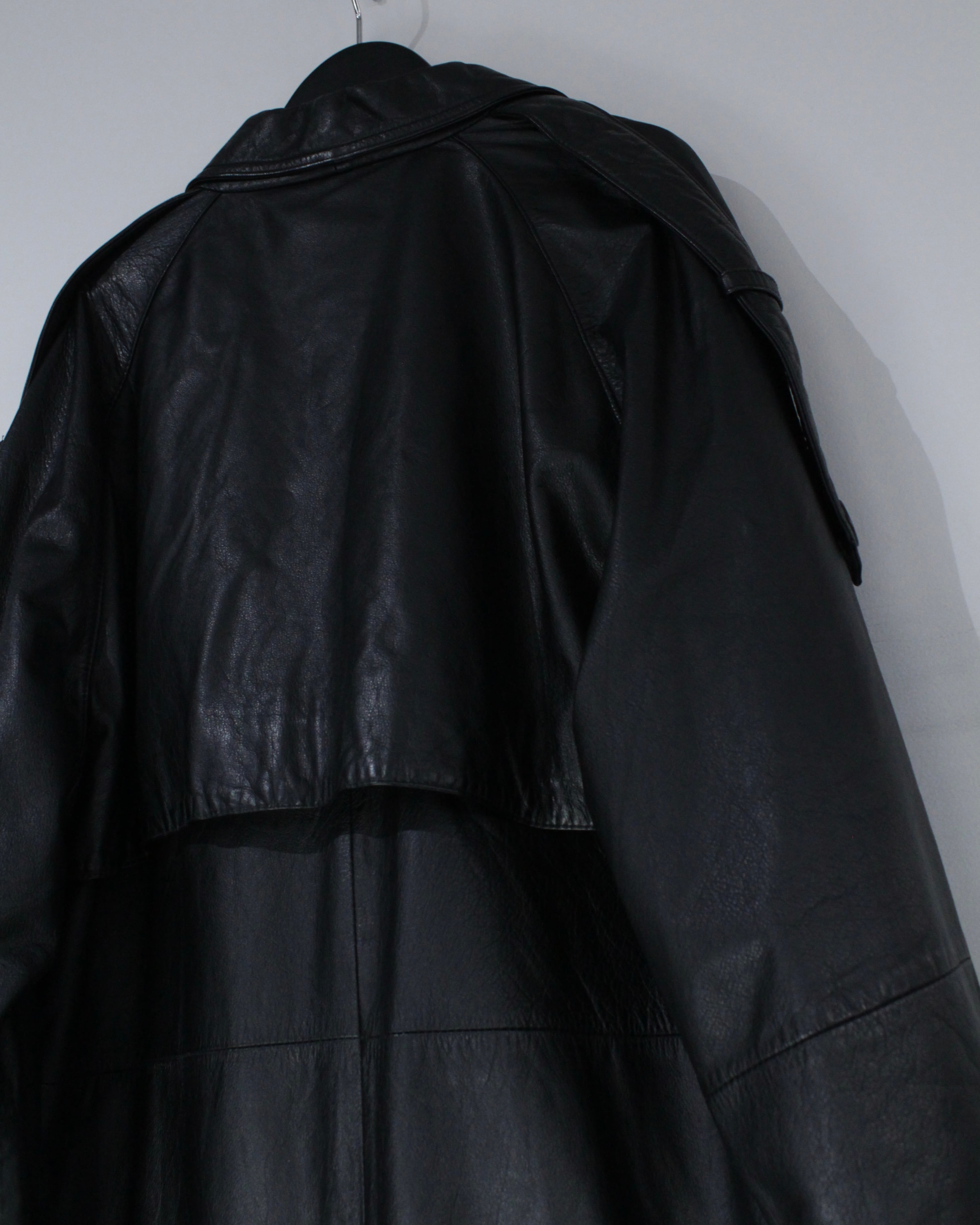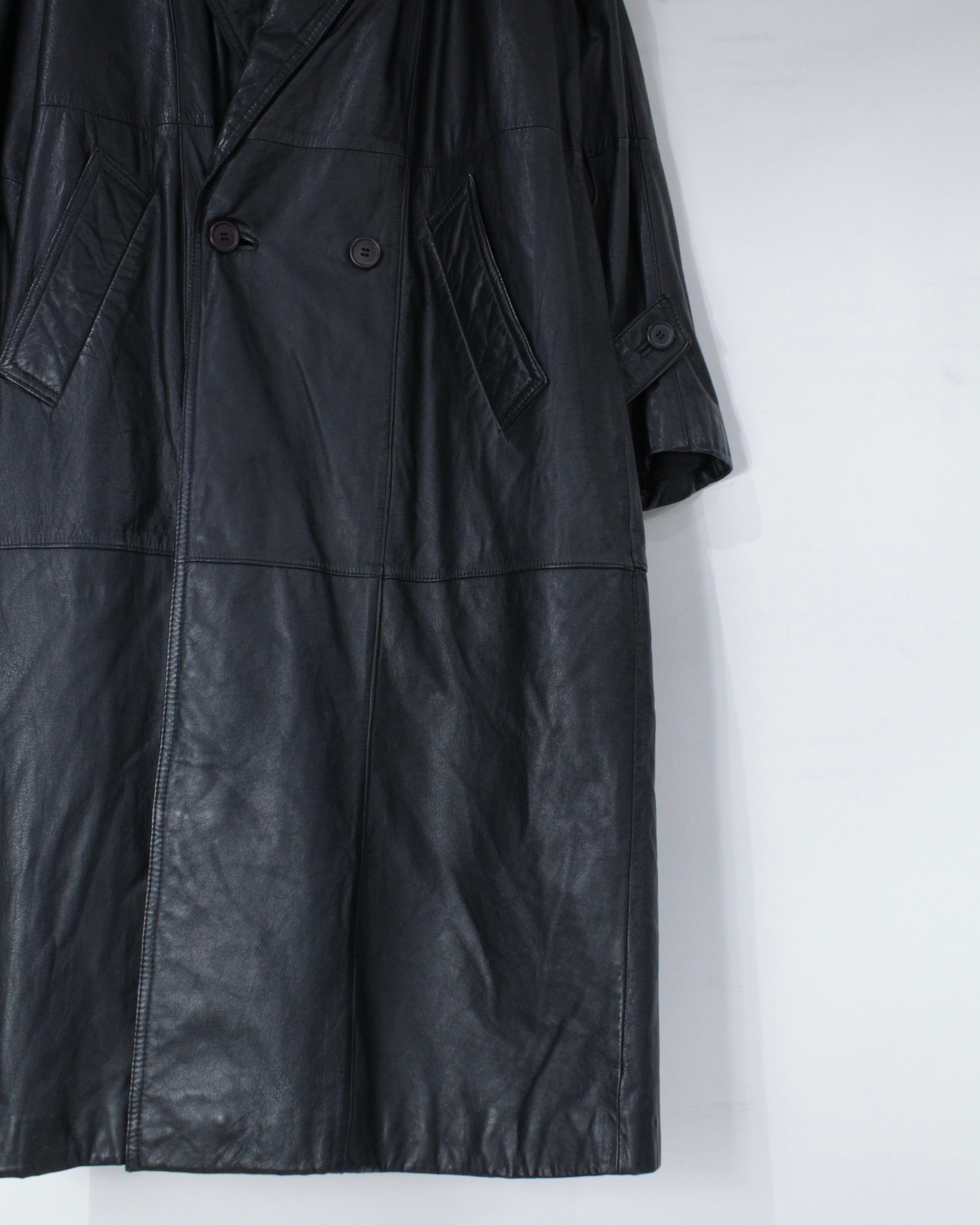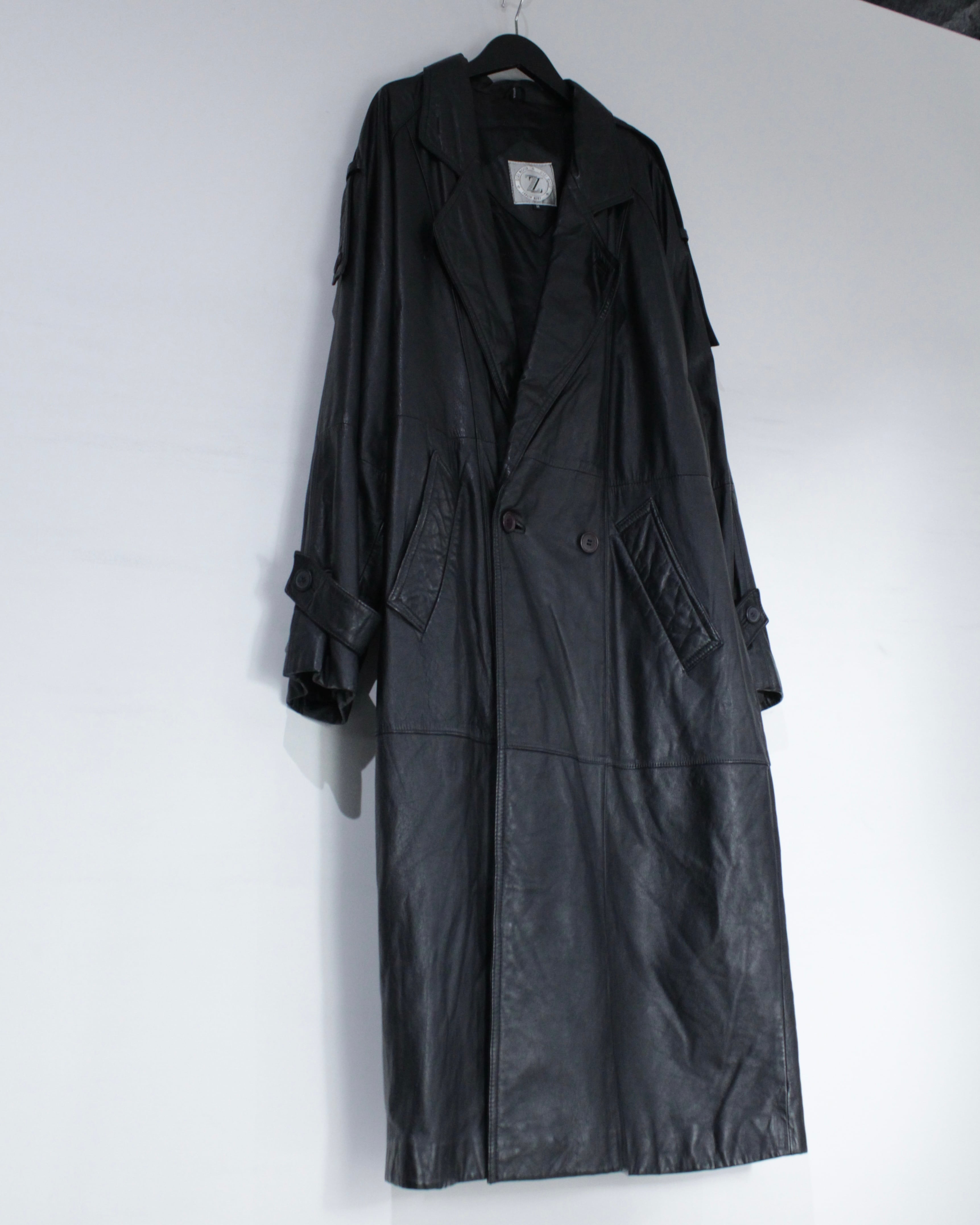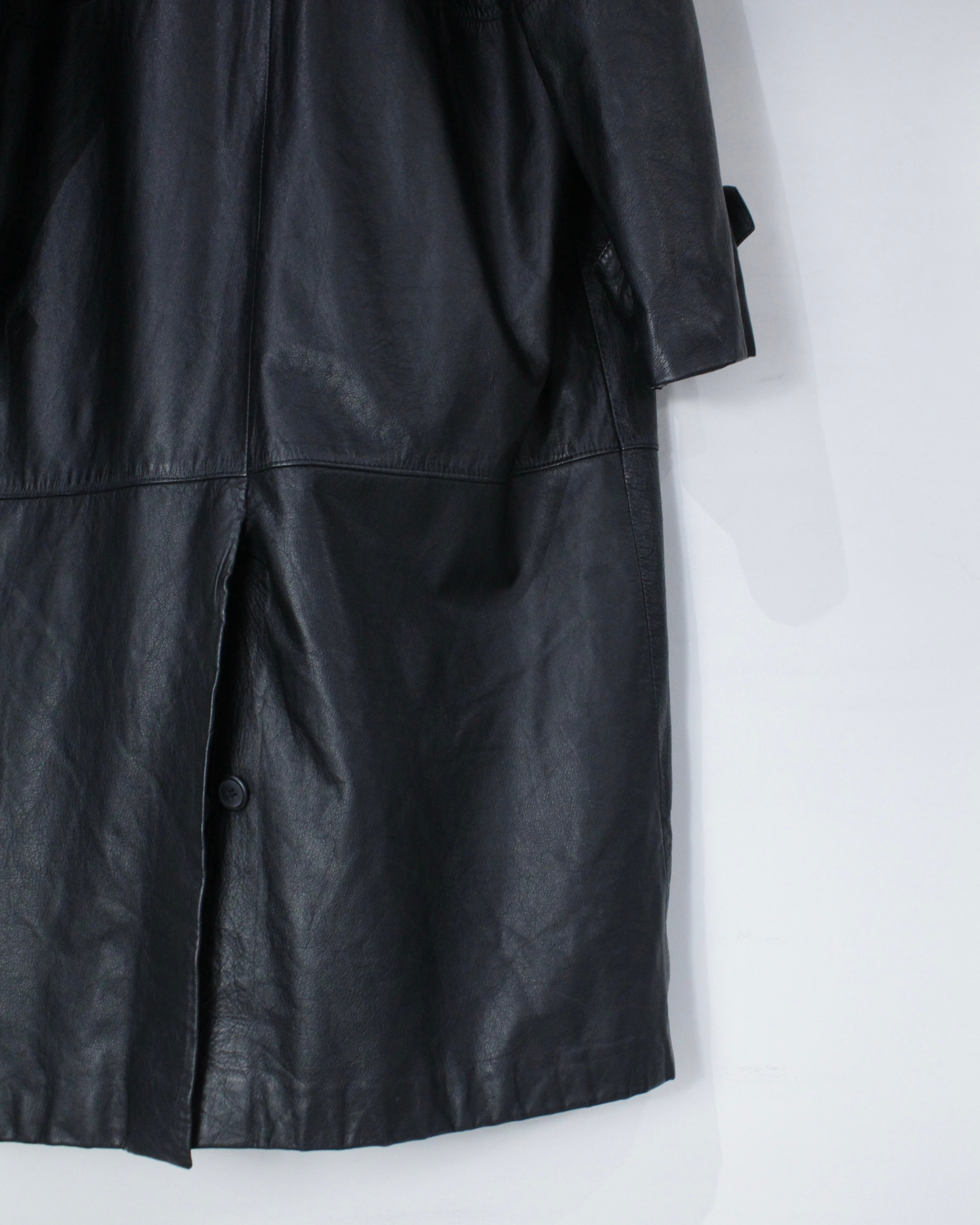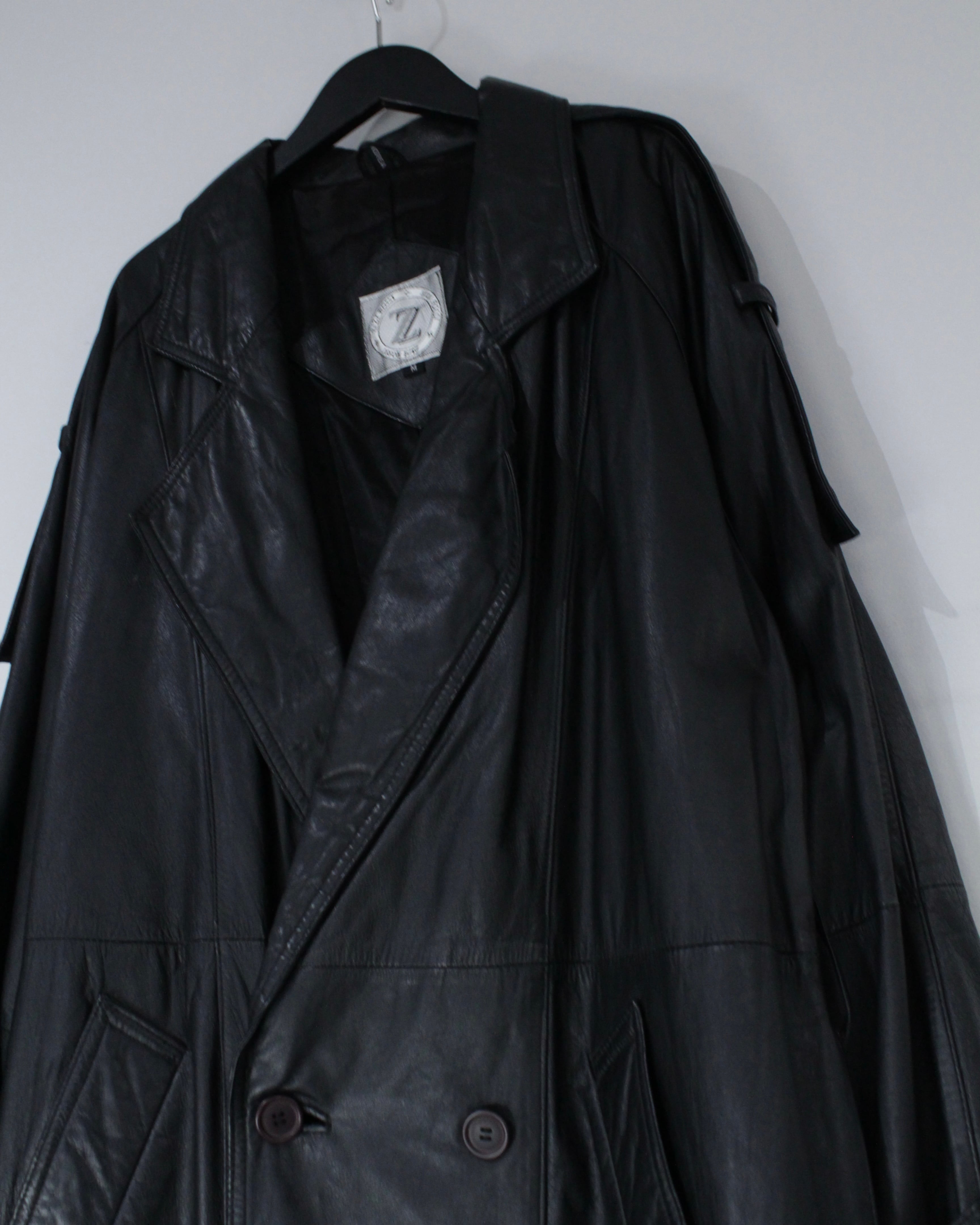 たっぷりとレングスを確保したロング丈が圧巻の存在感を放つ、レザートレンチコート。