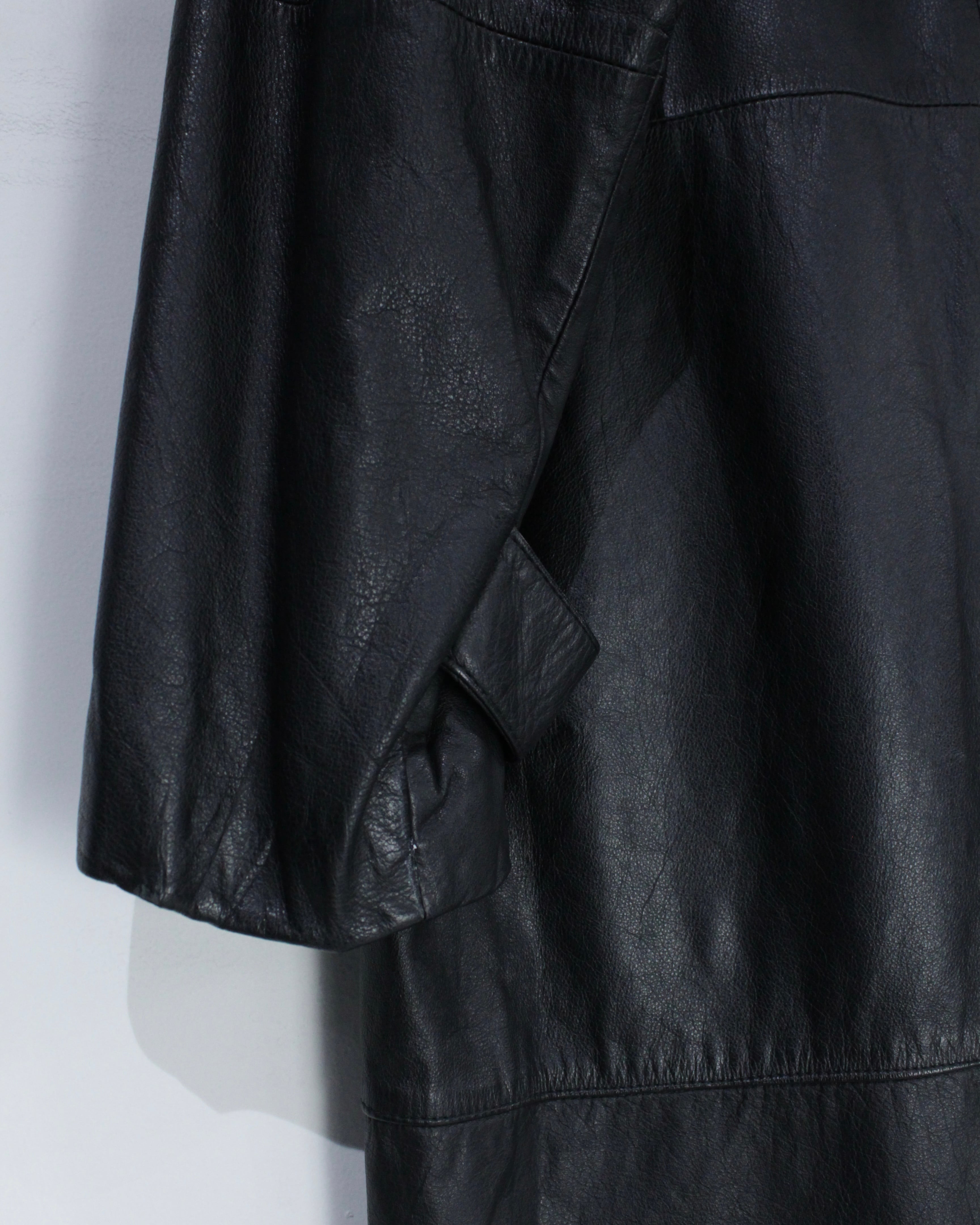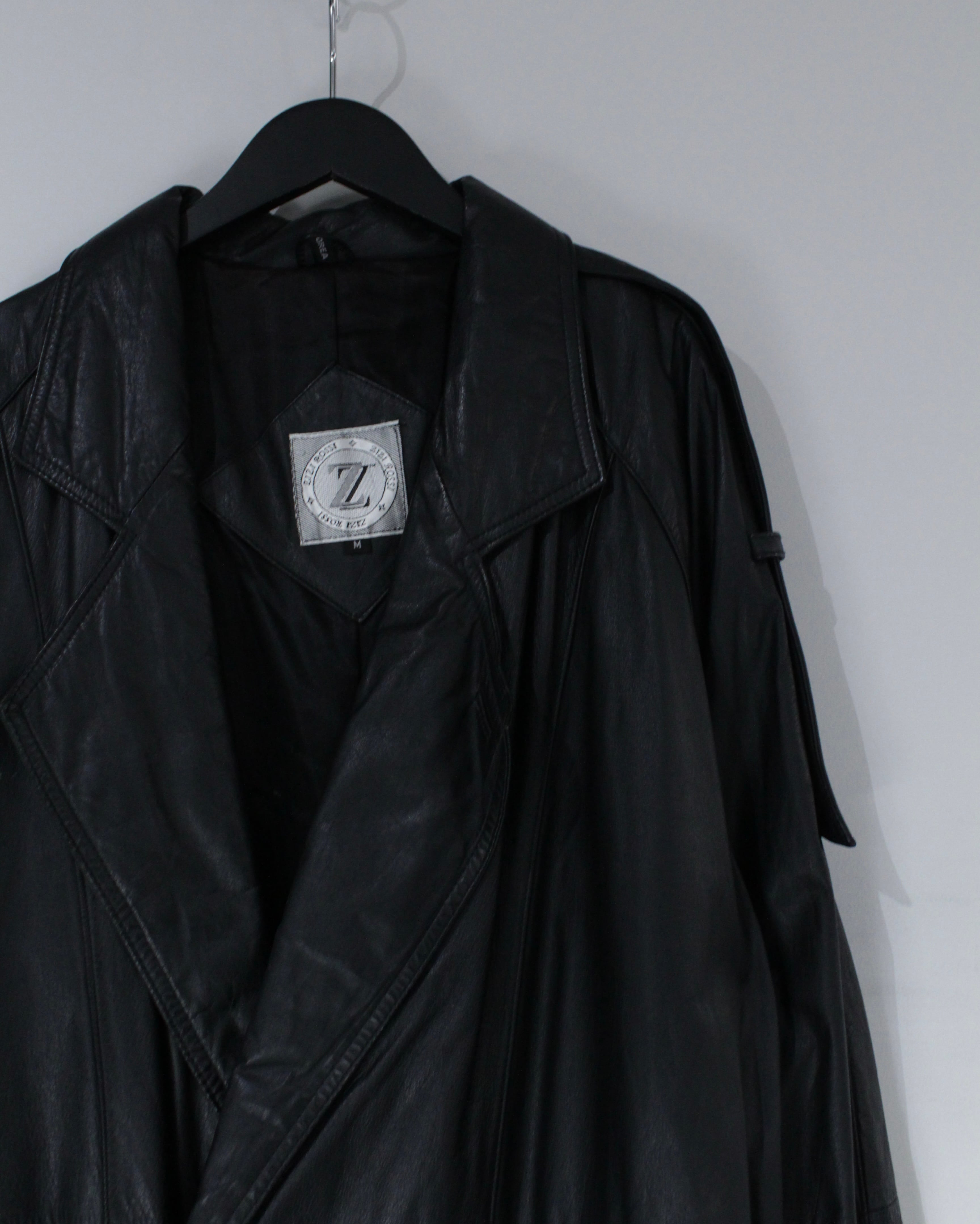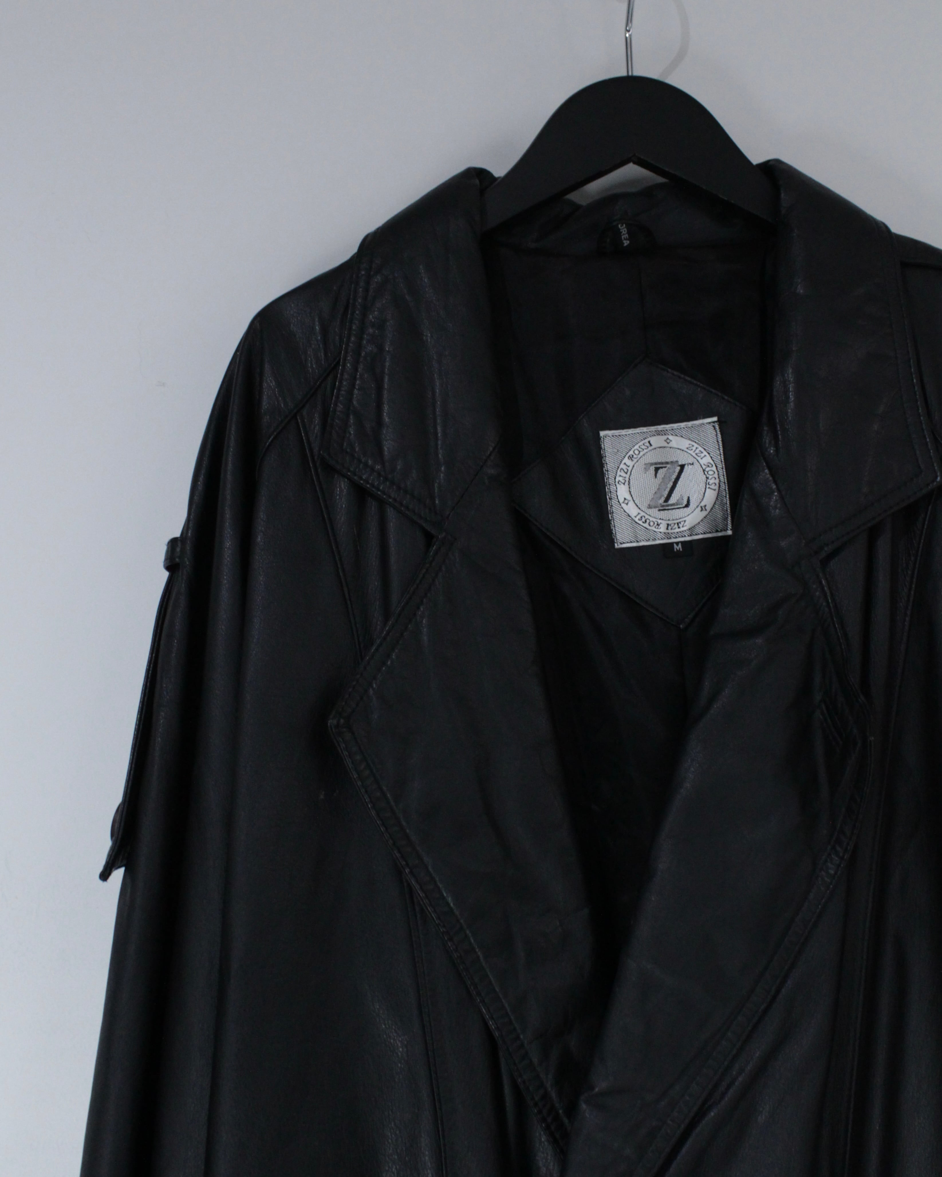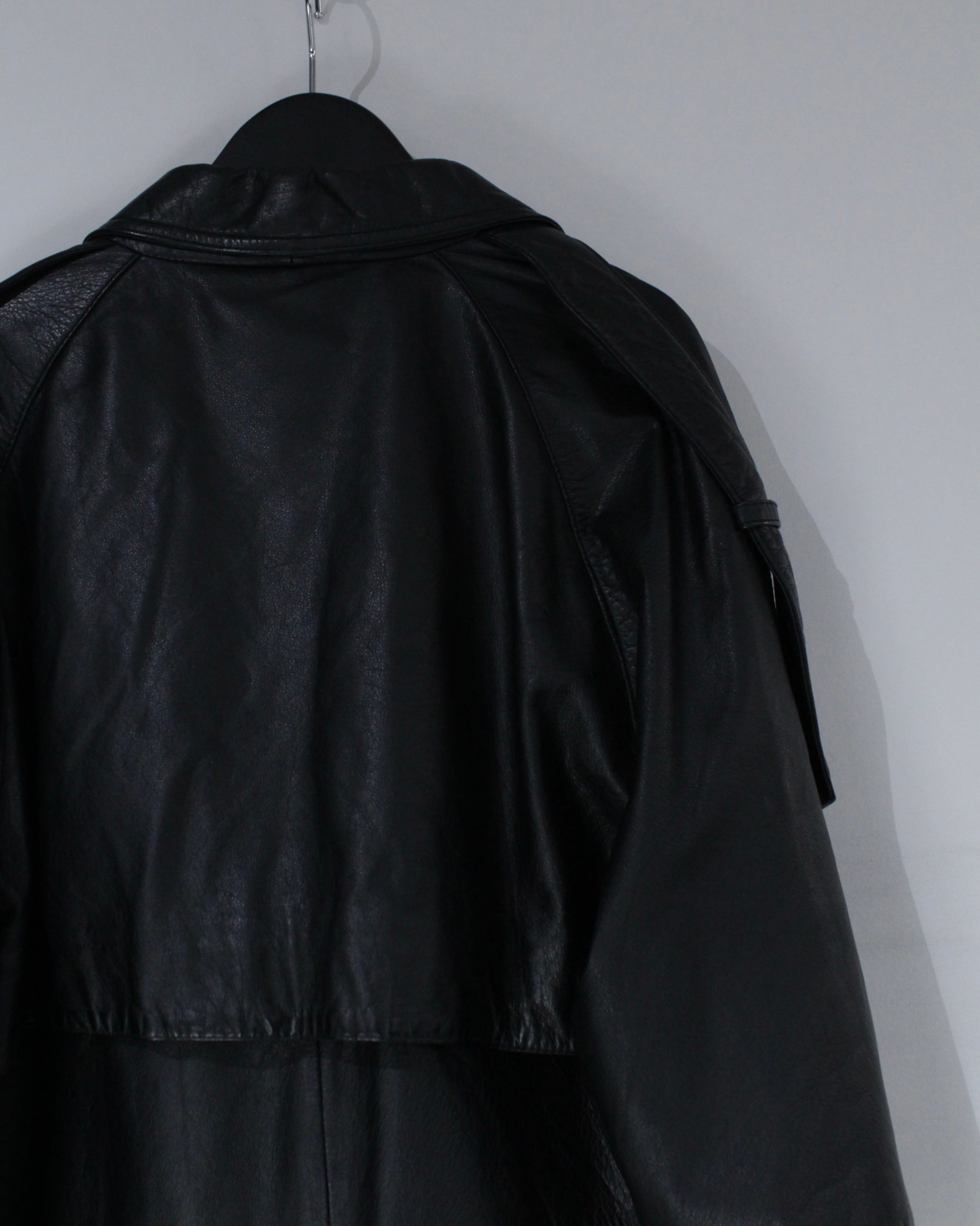たっぷりとレングスを確保したロング丈が圧巻の存在感を放つ、レザートレンチコート。