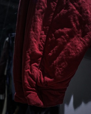 鮮烈な赤色に仕上げられた、ショート丈のパデットジャケット。