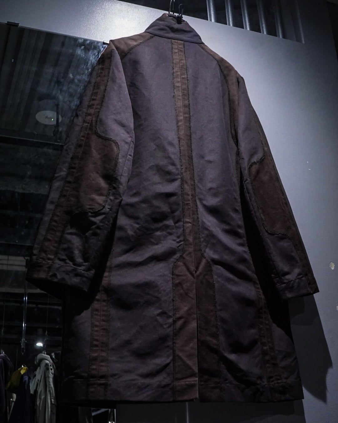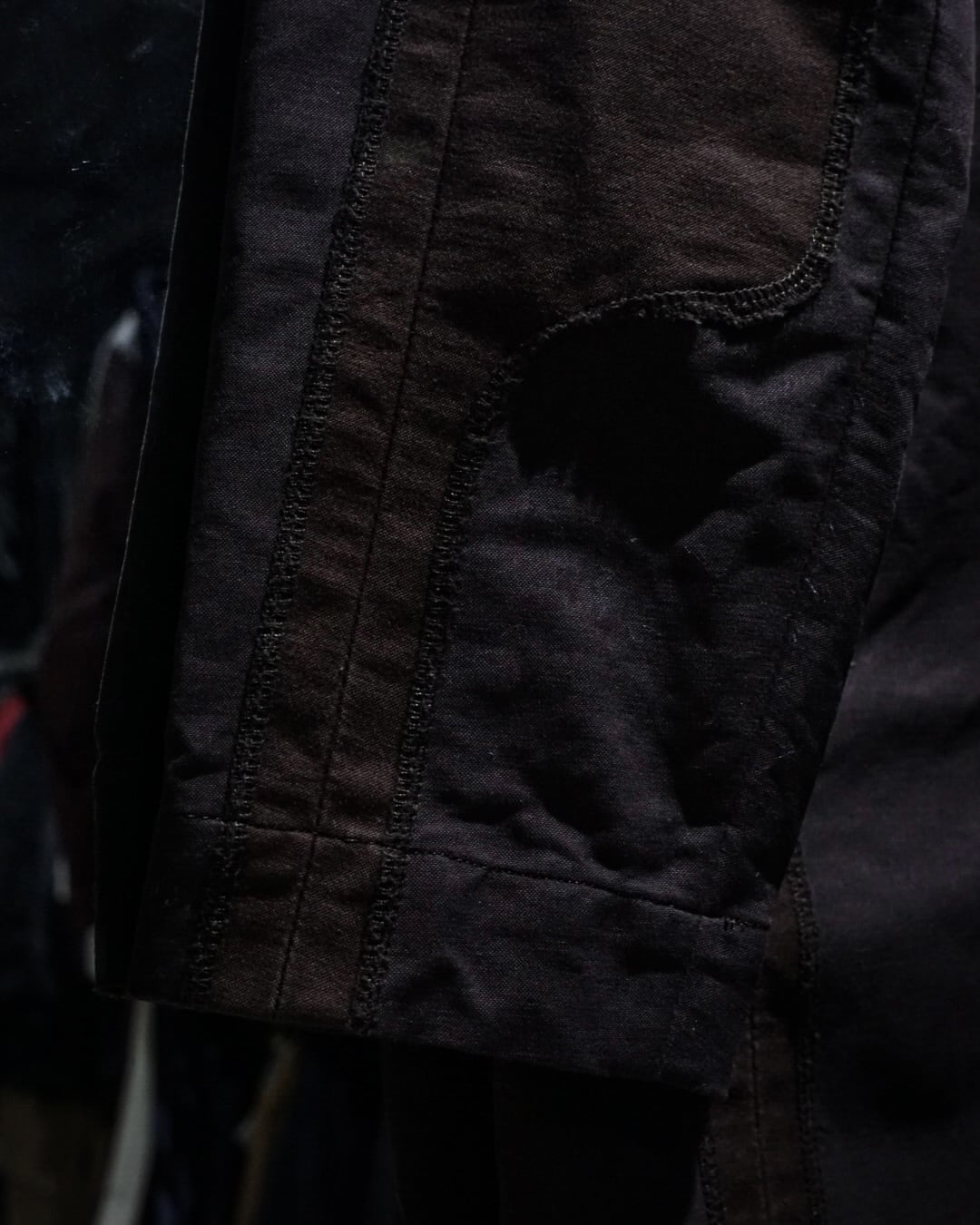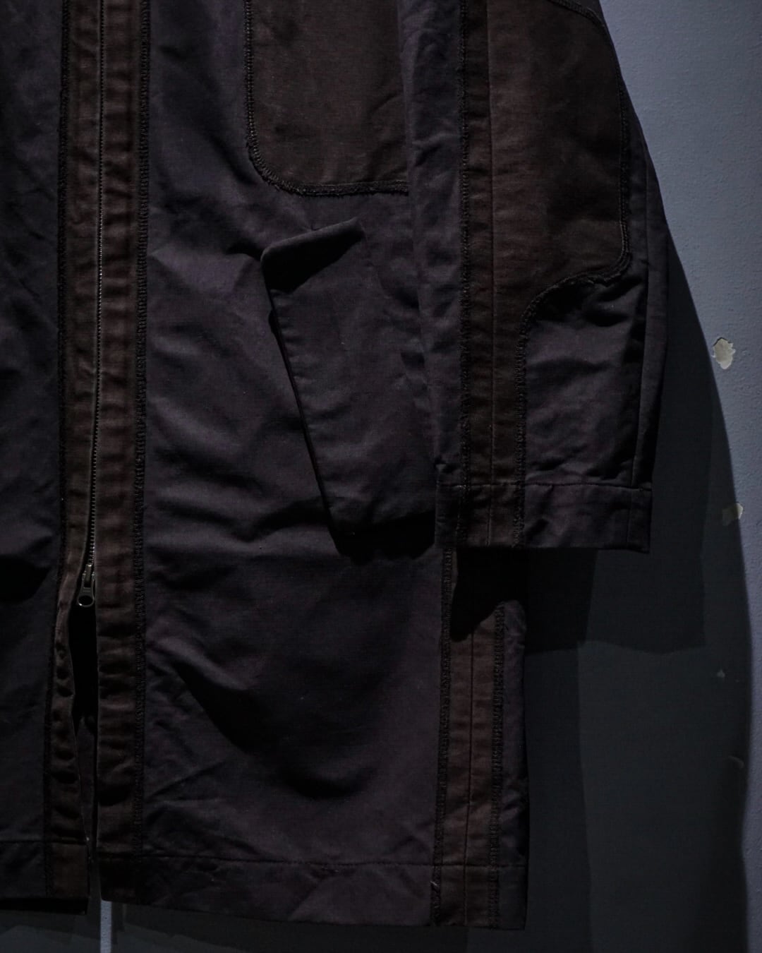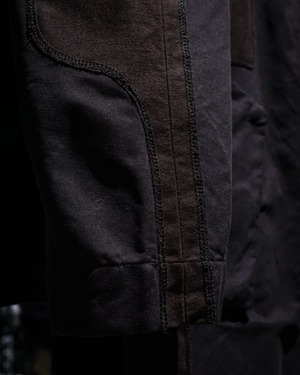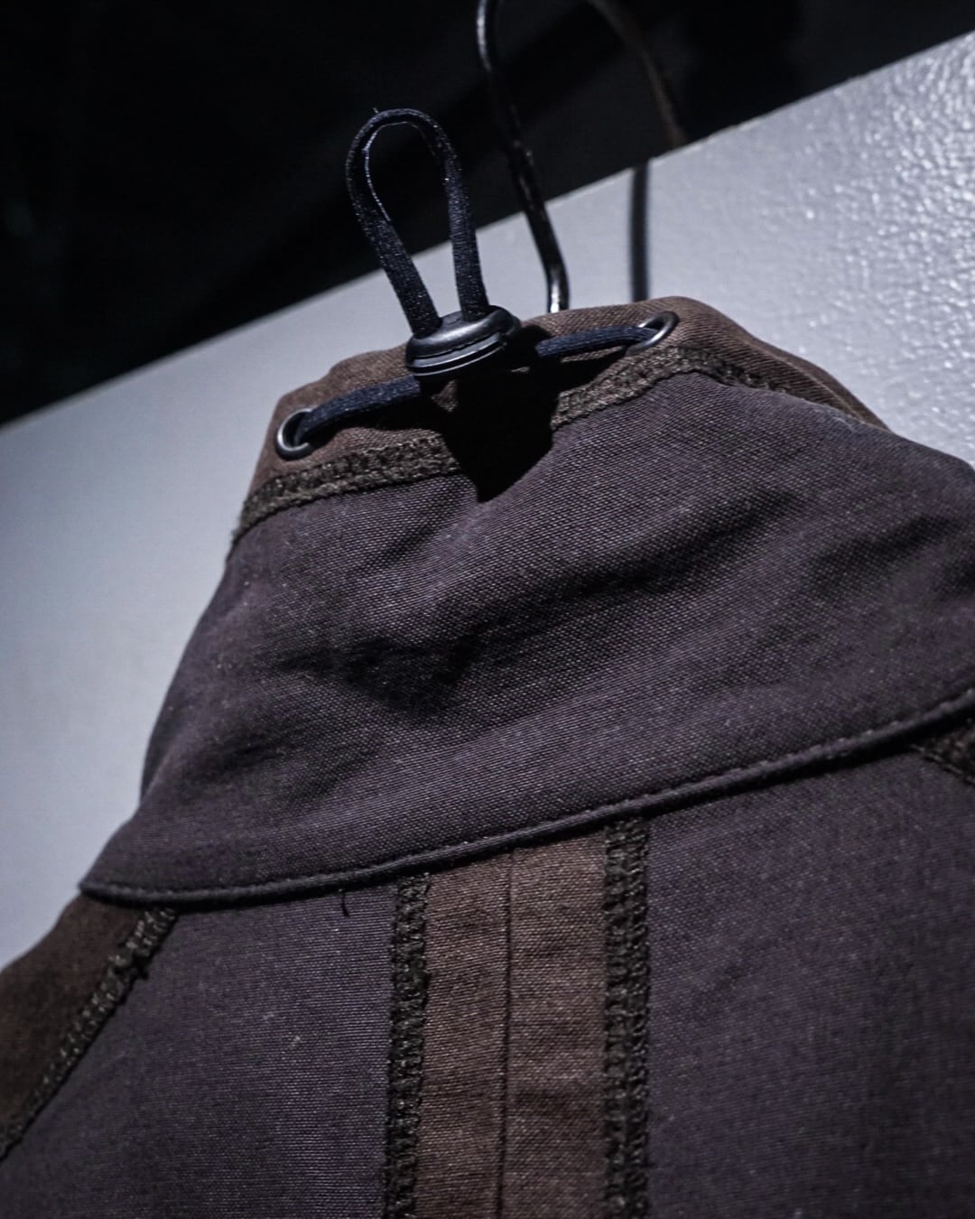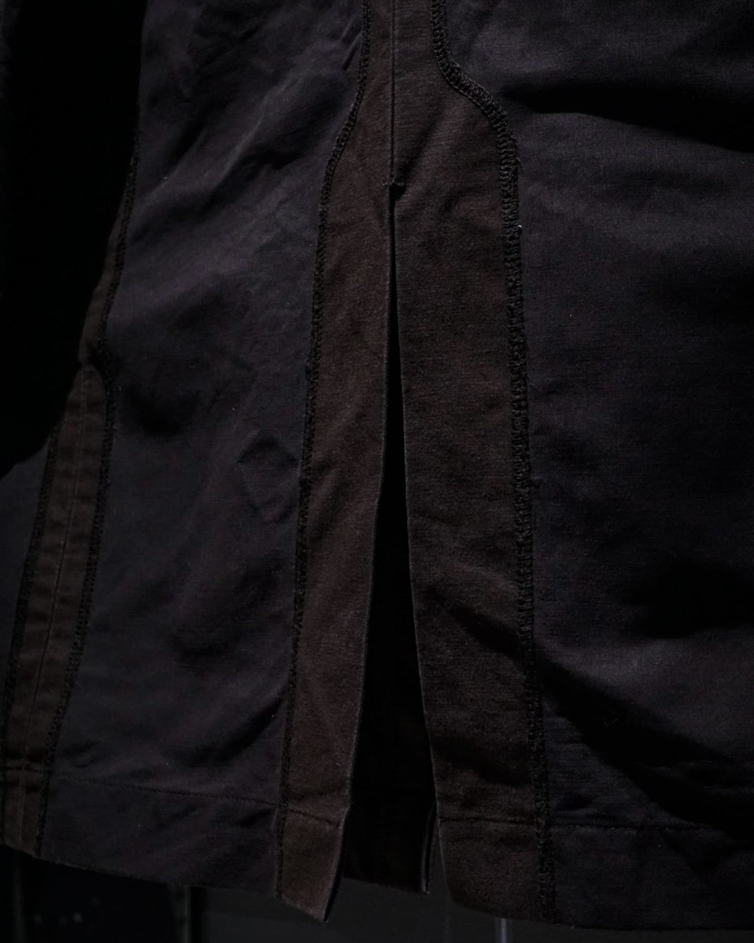 深いダークブラウンのコットンボディをベースに、左右対称に配置された複数のパネル切り替えが均整の取れたバランスを生み出しています。