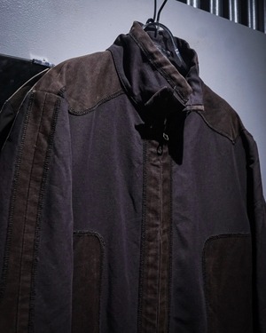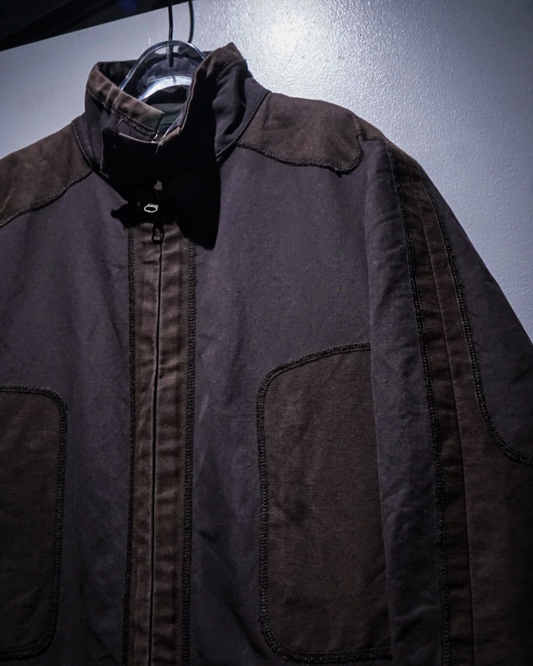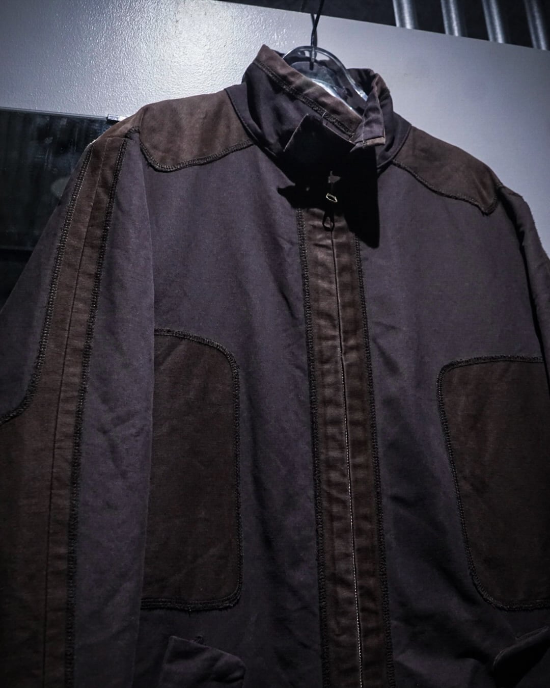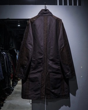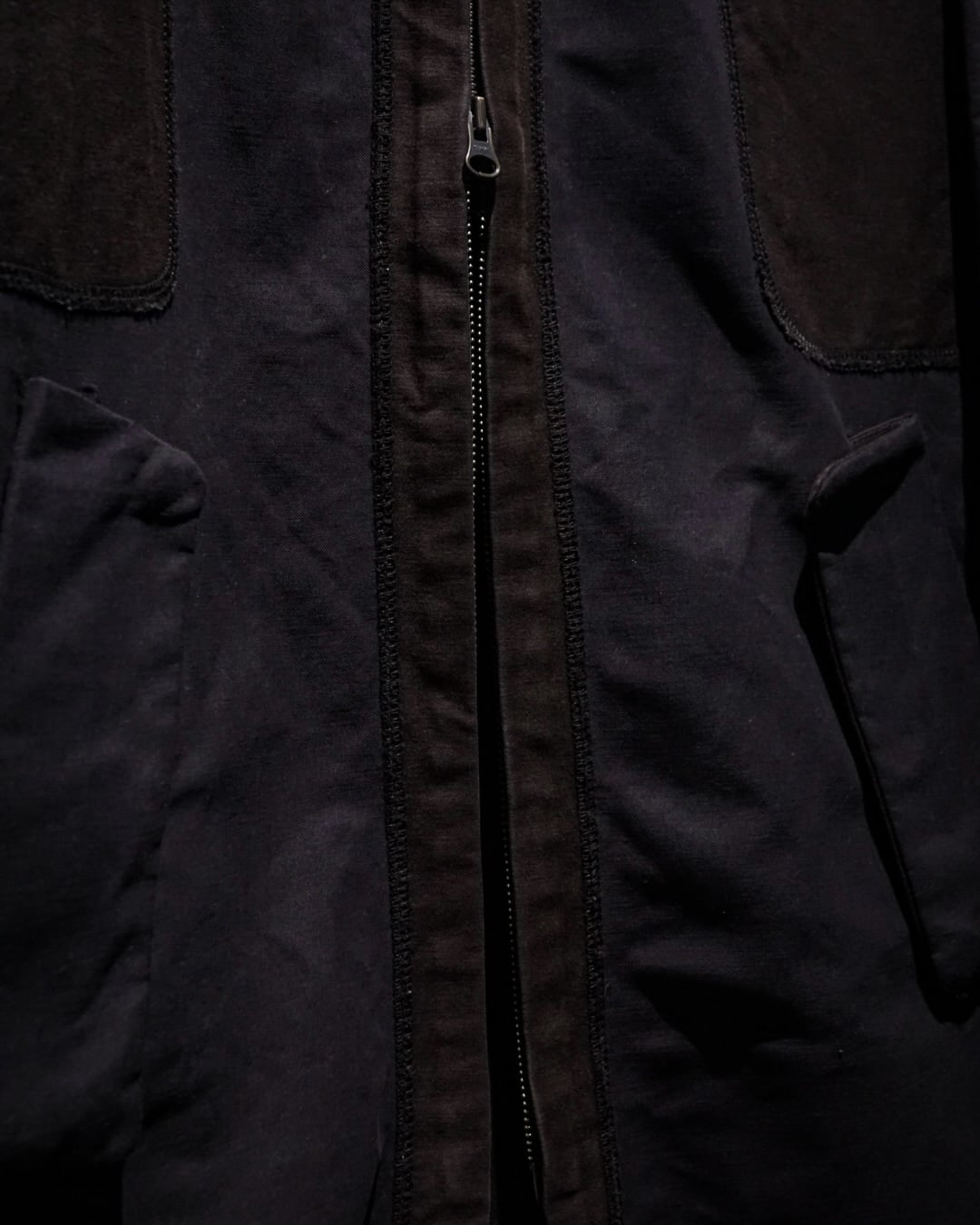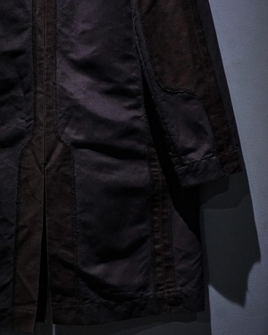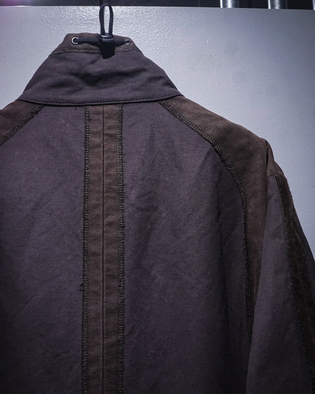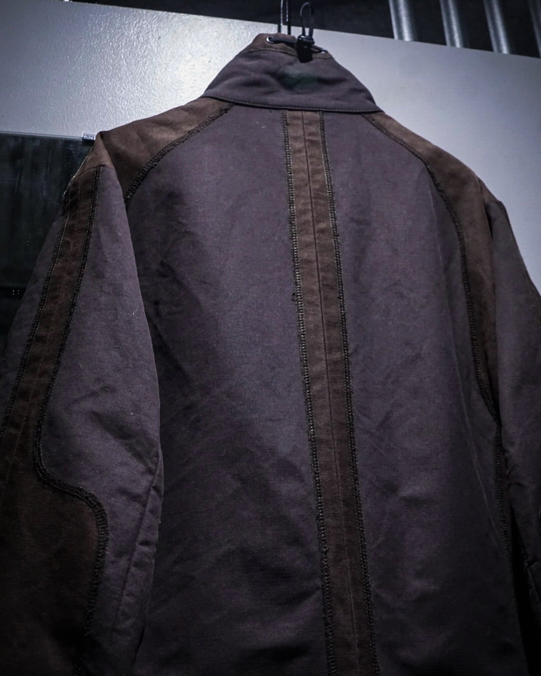 深いダークブラウンのコットンボディをベースに、左右対称に配置された複数のパネル切り替えが均整の取れたバランスを生み出しています。