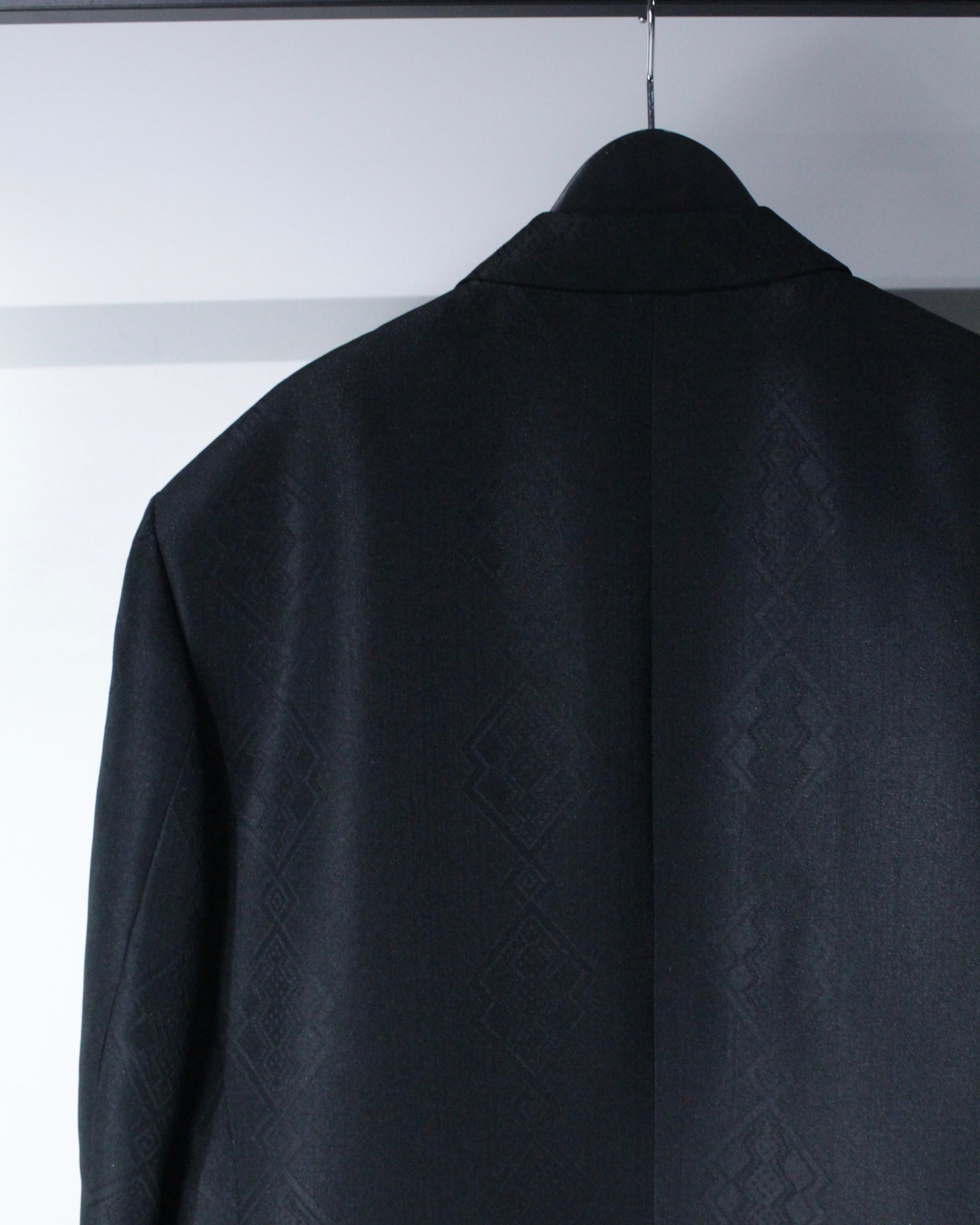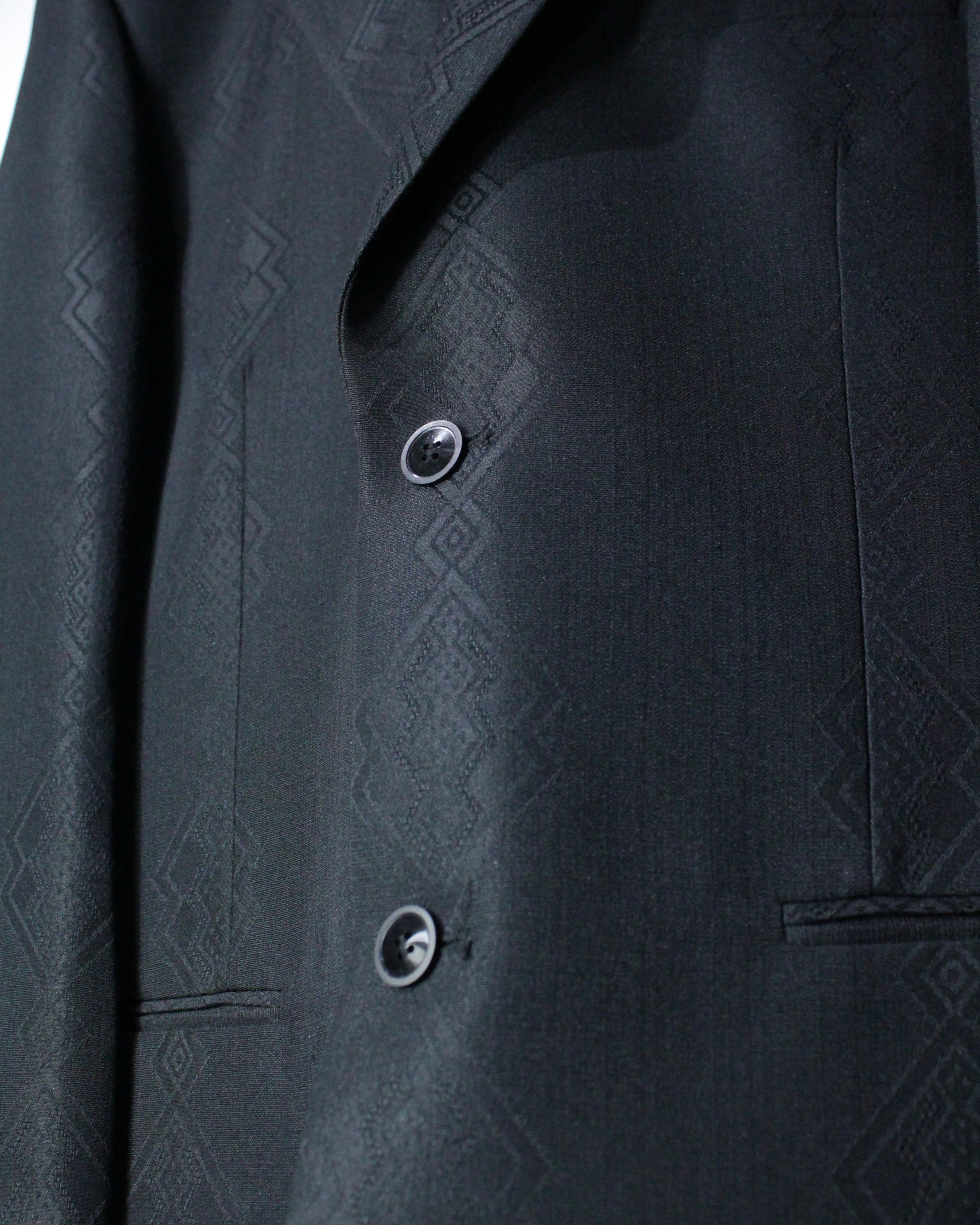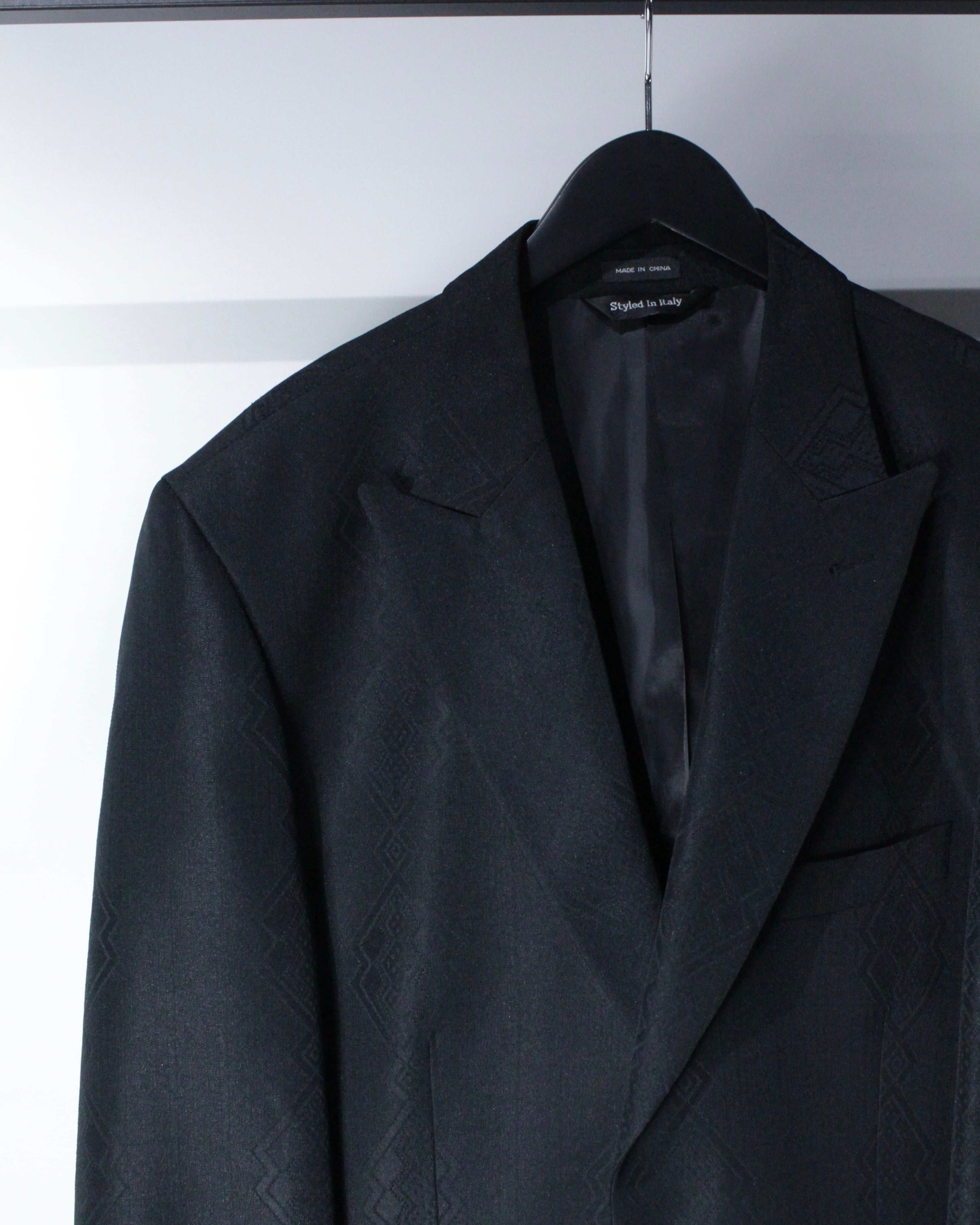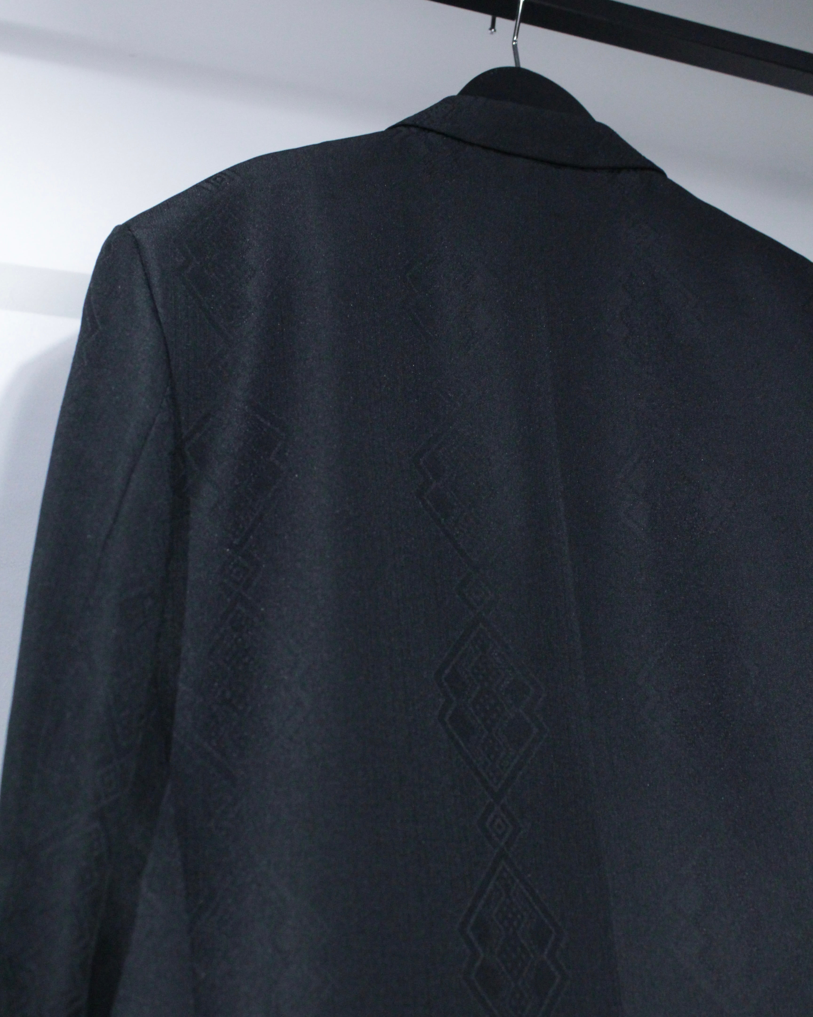 微光沢のあるブラックのボディをベースに、ジャガード織で幾何学調の柄模様を載せたイタリーメイドのテーラードジャケット。