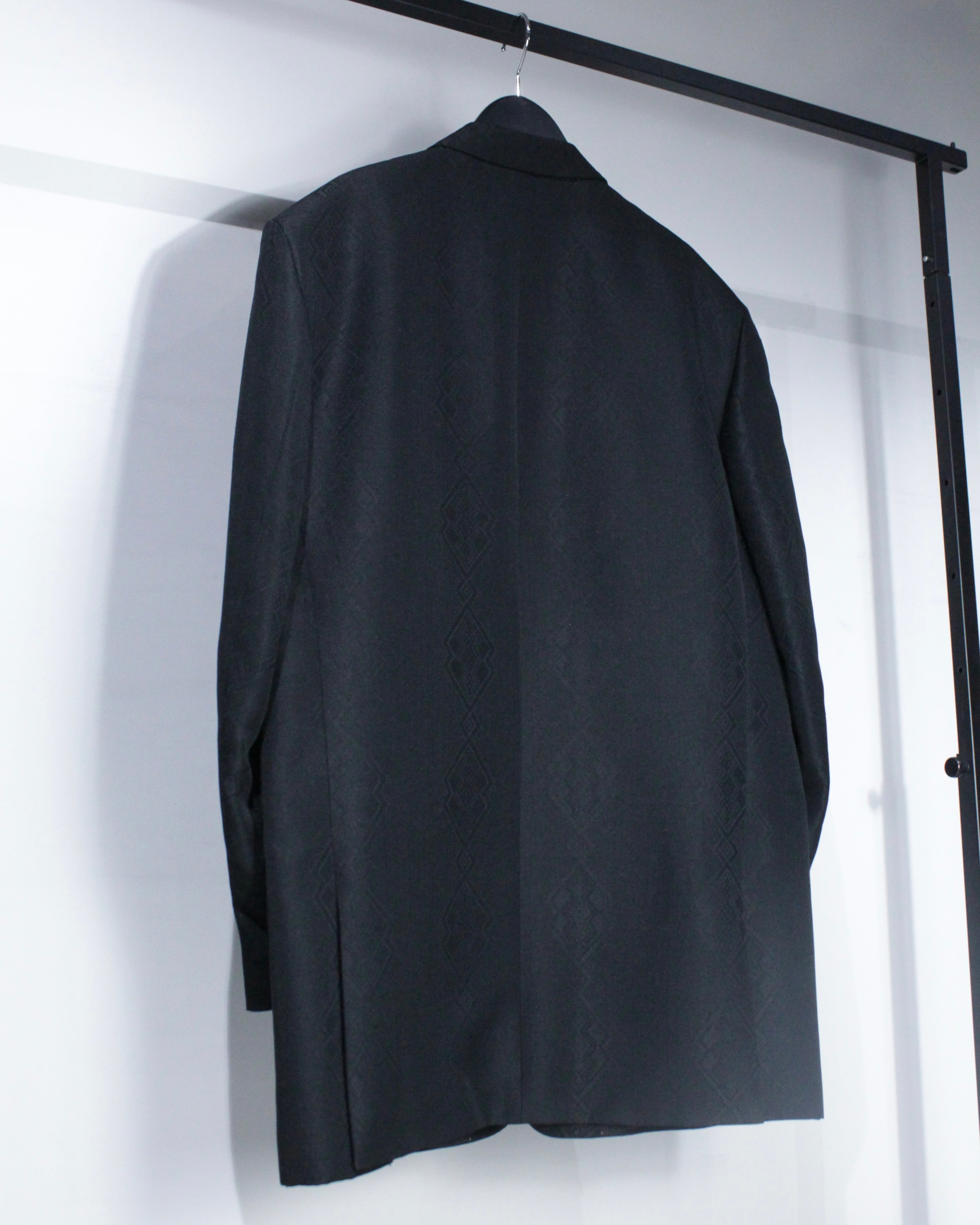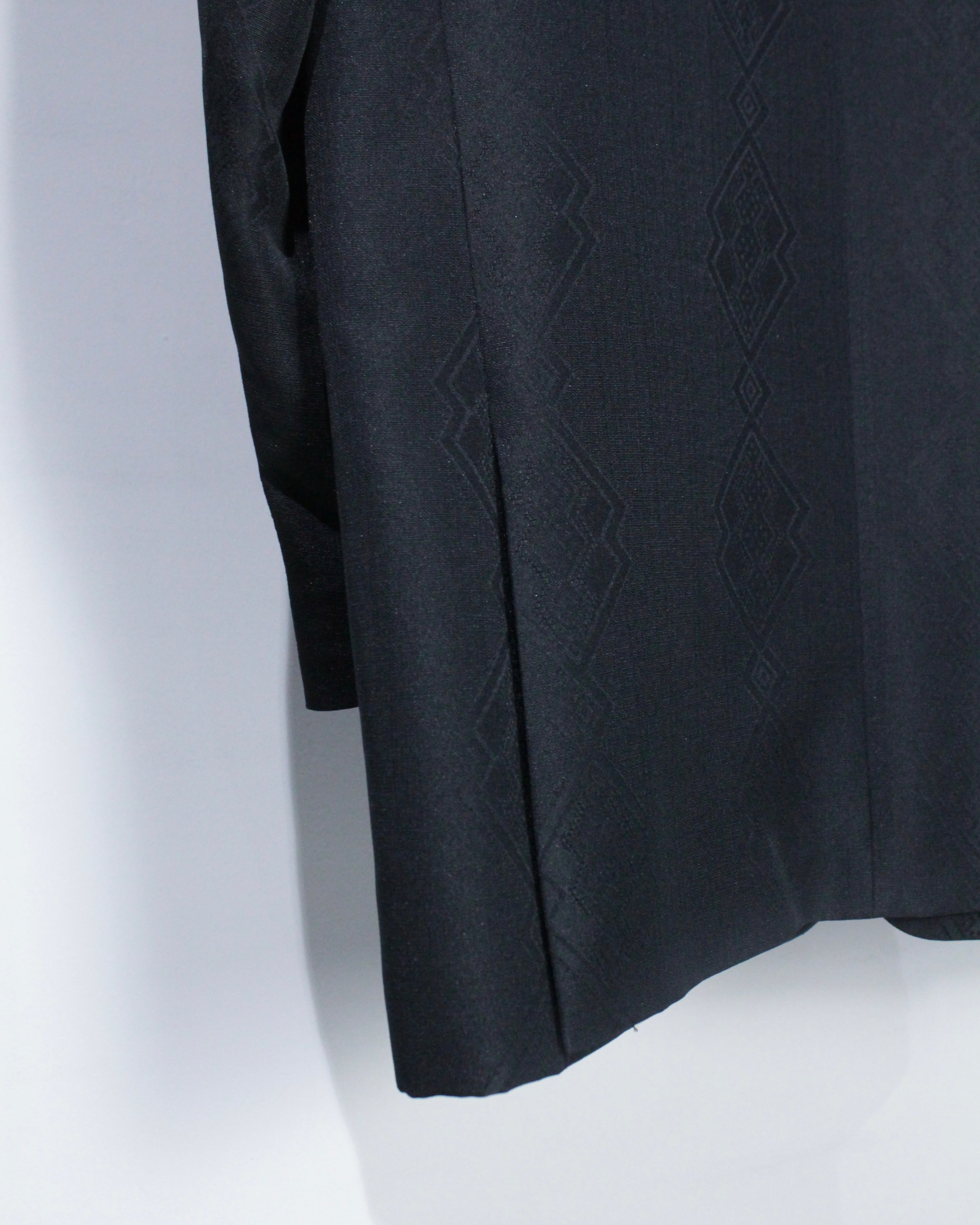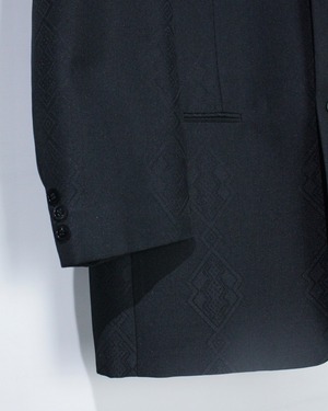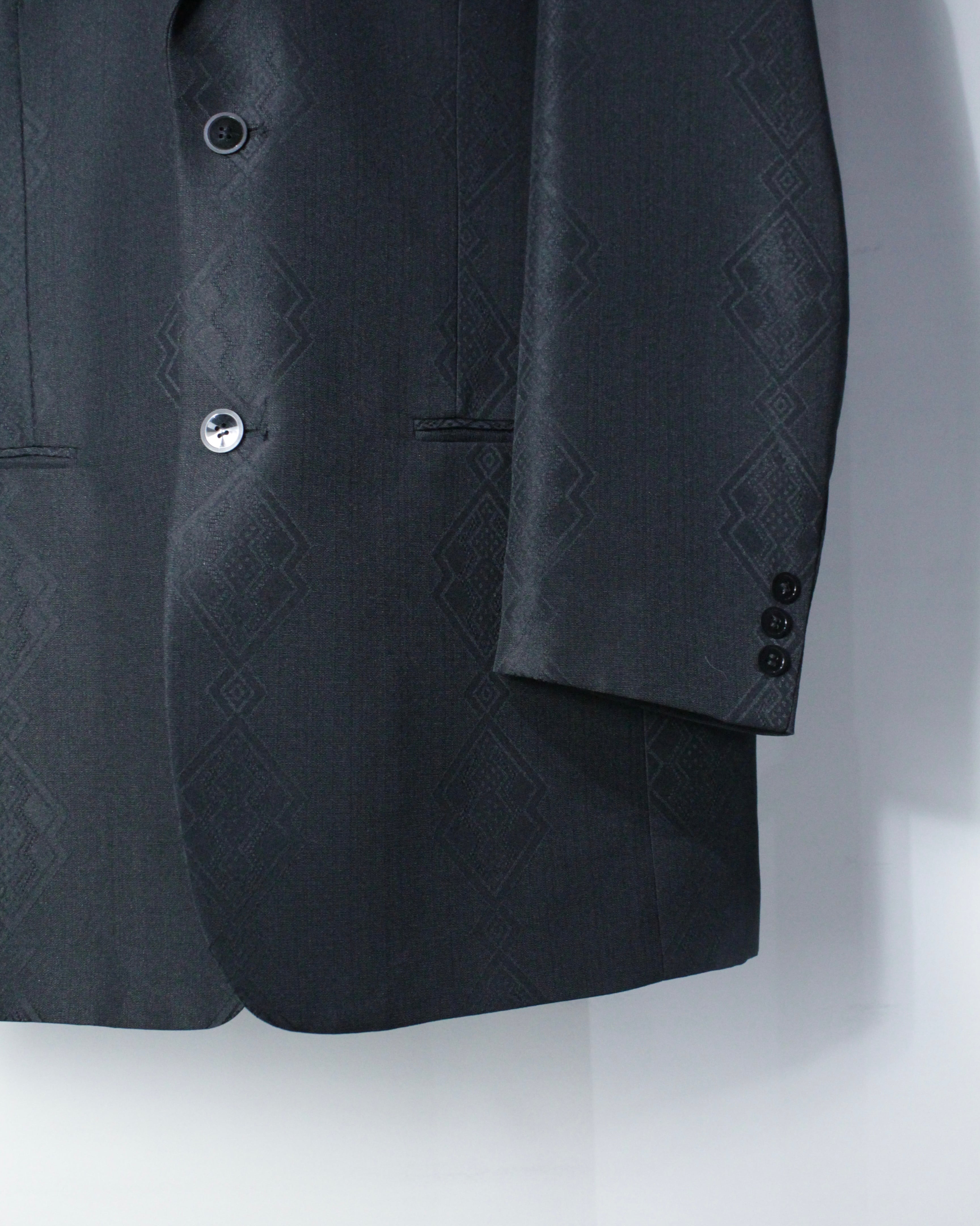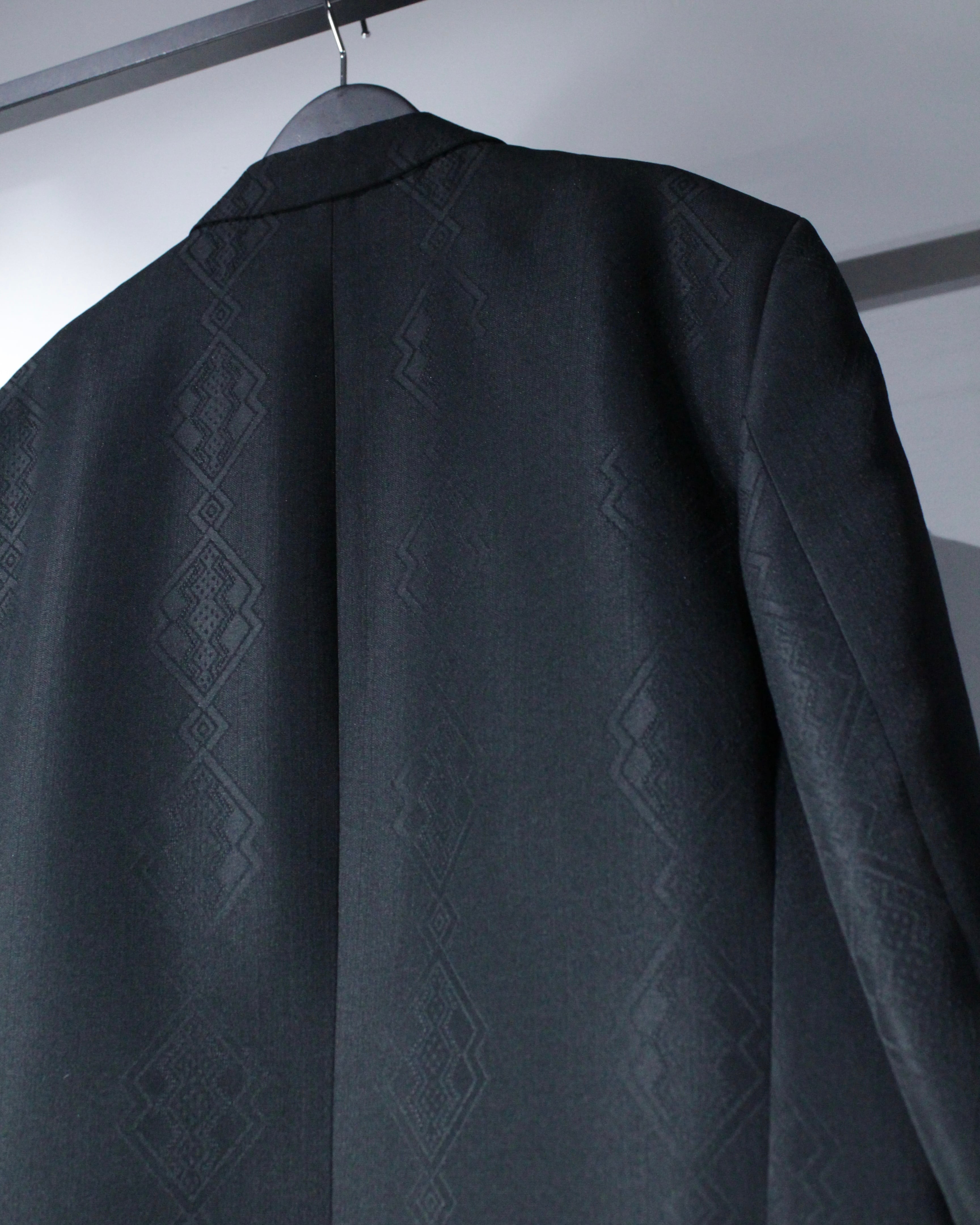 微光沢のあるブラックのボディをベースに、ジャガード織で幾何学調の柄模様を載せたイタリーメイドのテーラードジャケット。