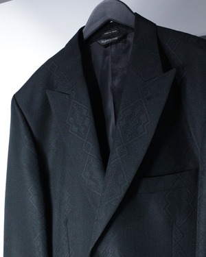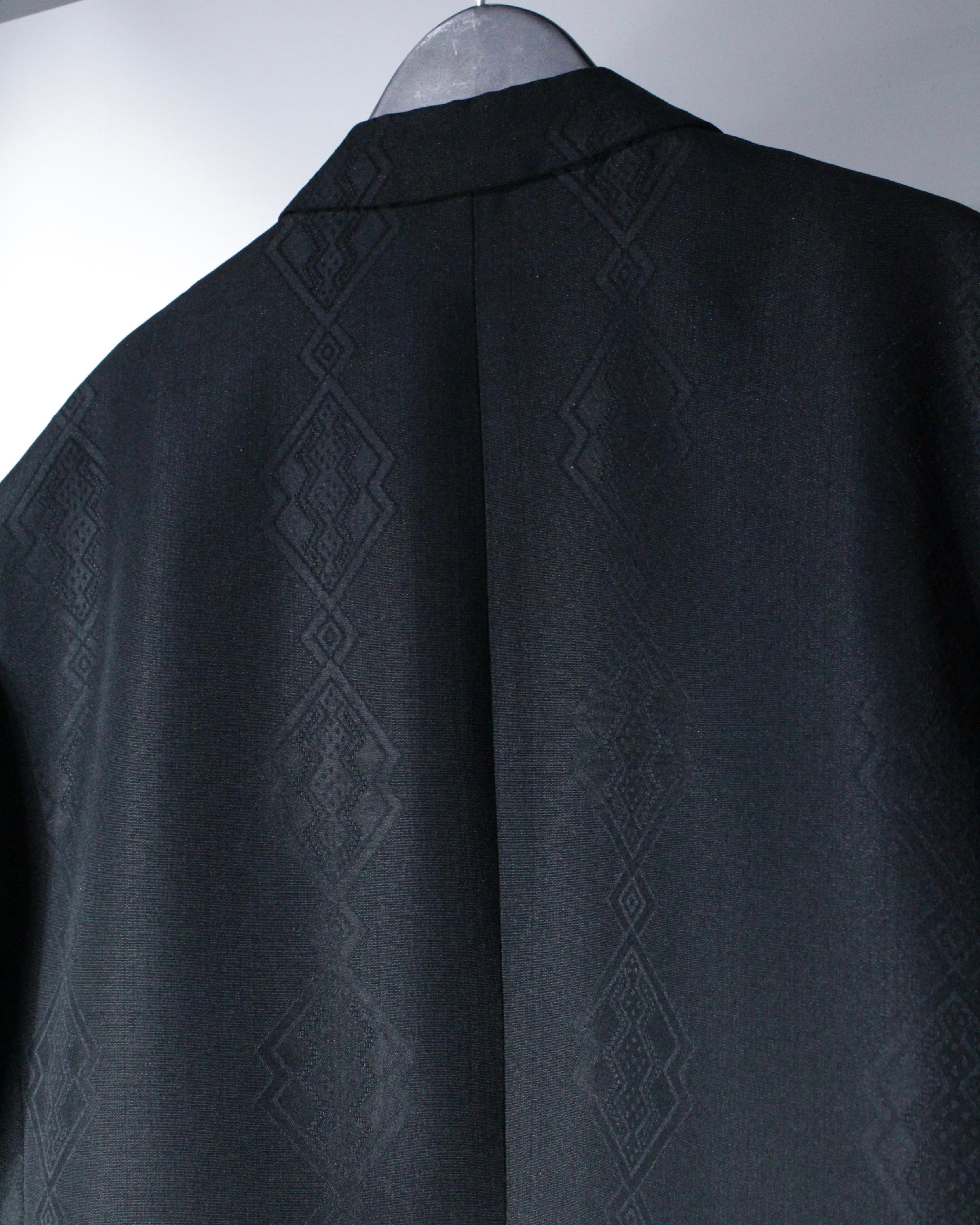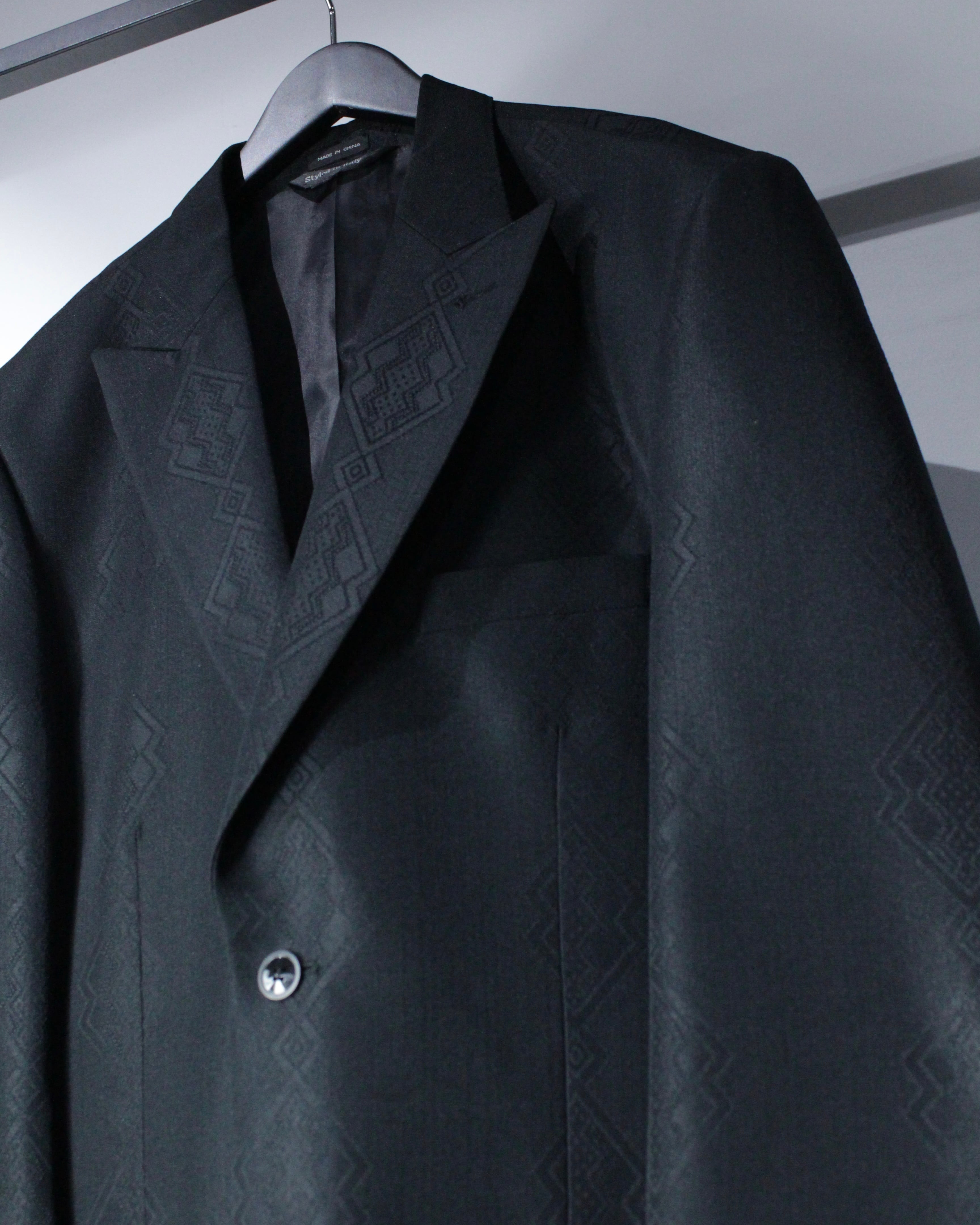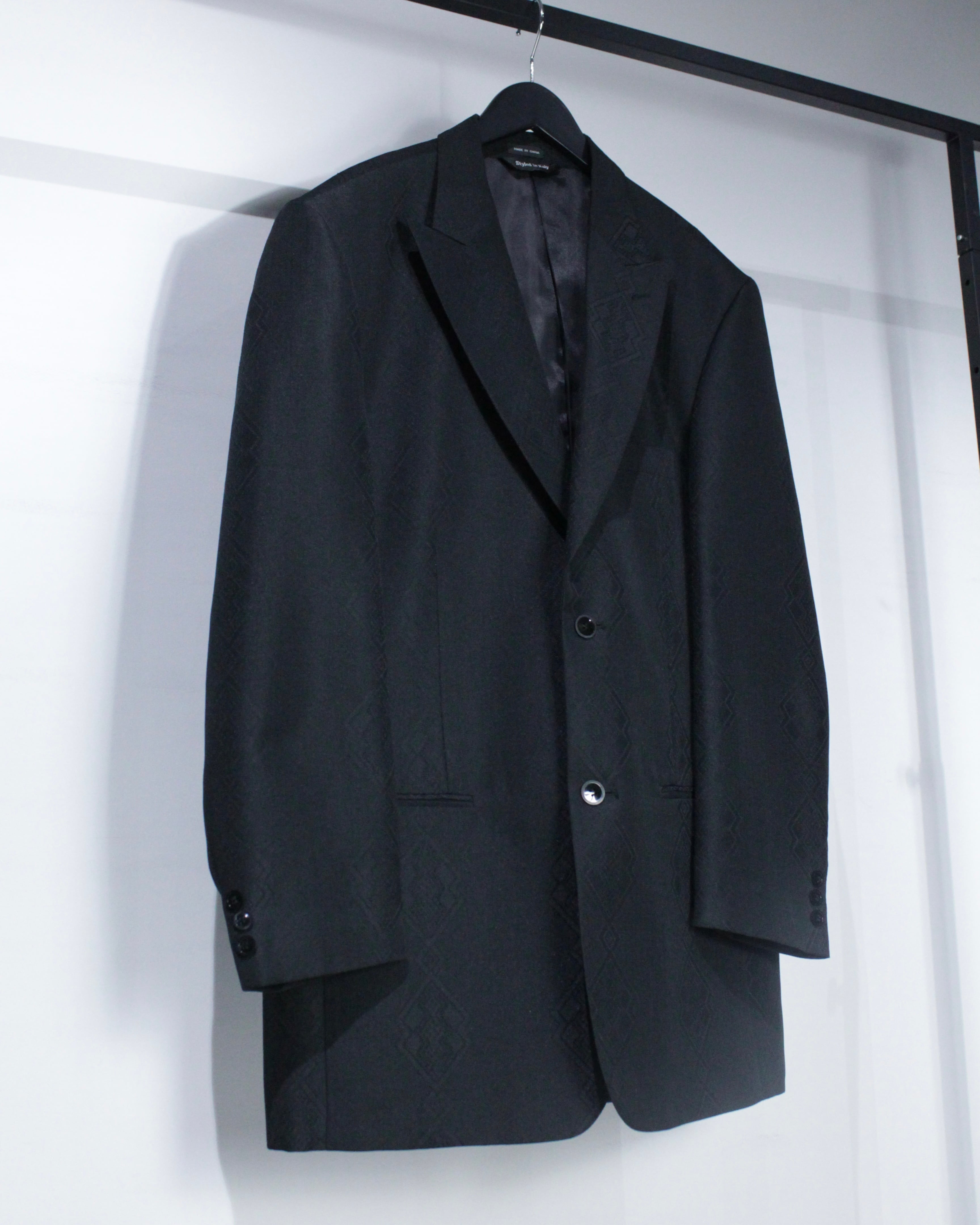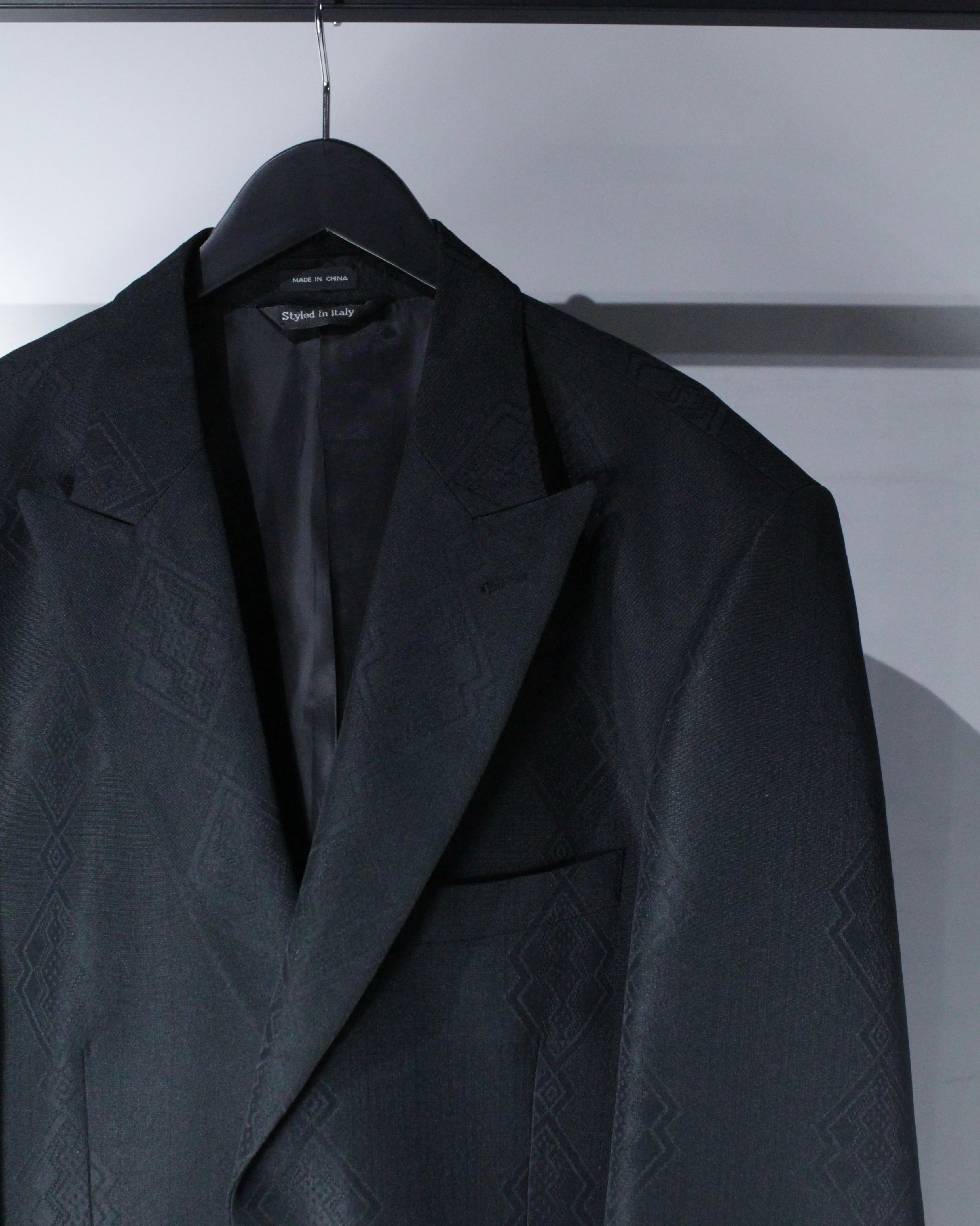 微光沢のあるブラックのボディをベースに、ジャガード織で幾何学調の柄模様を載せたイタリーメイドのテーラードジャケット。