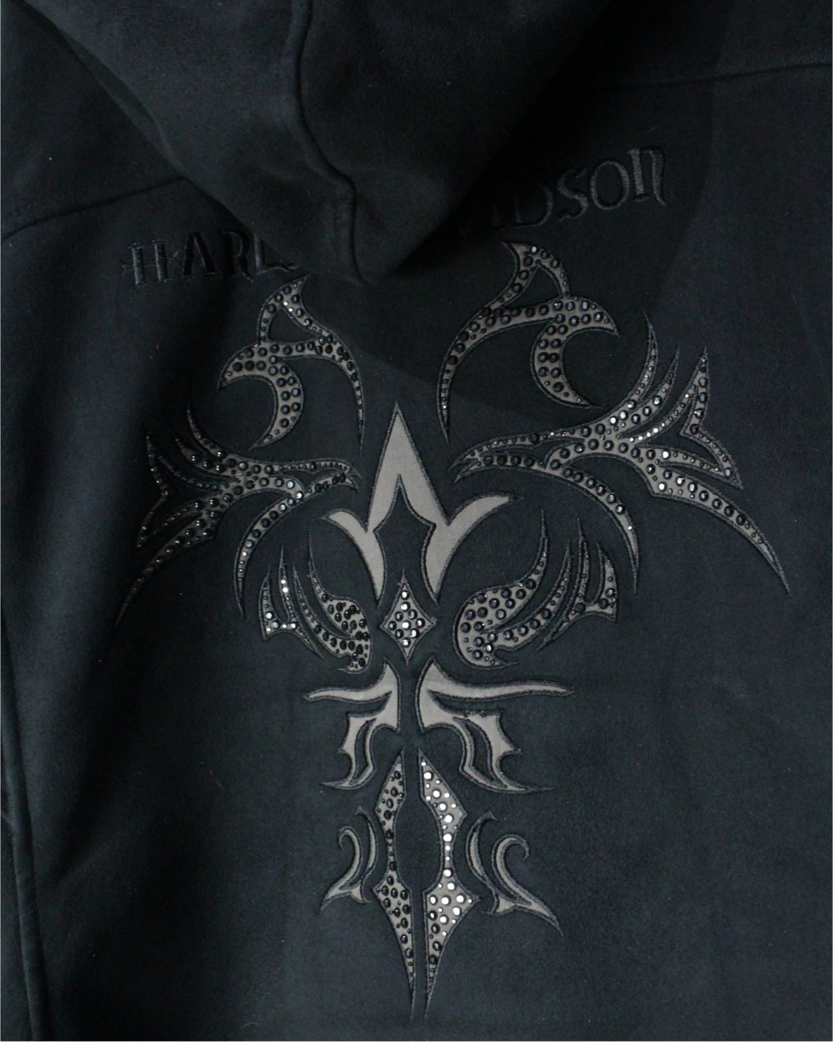 黒の陰影の中でキラリと浮かび上がる装飾がハーレーらしい反骨と色気を象徴しつつ、現代的なフレーバーも纏わせています。ジップトップのアクセントも◎