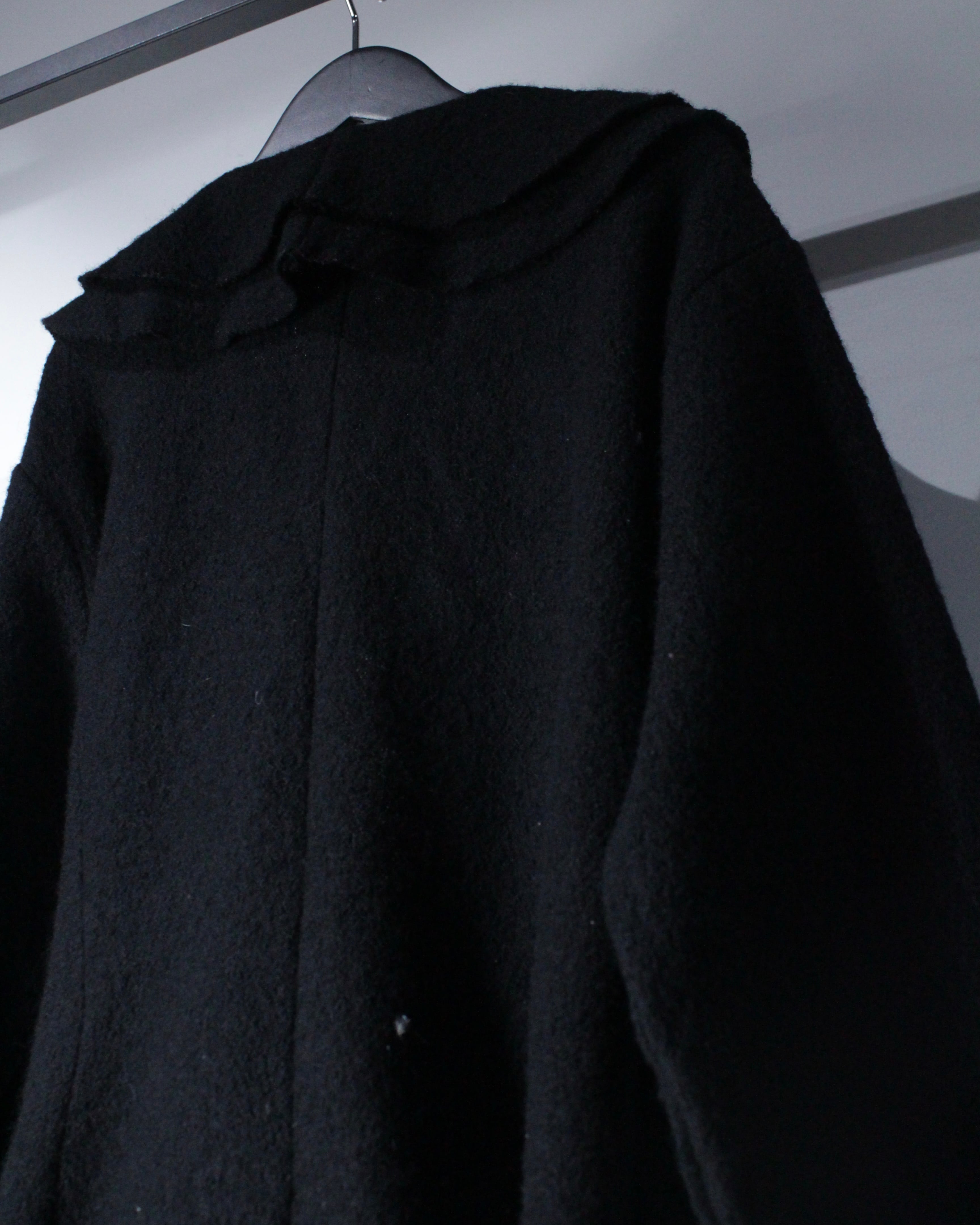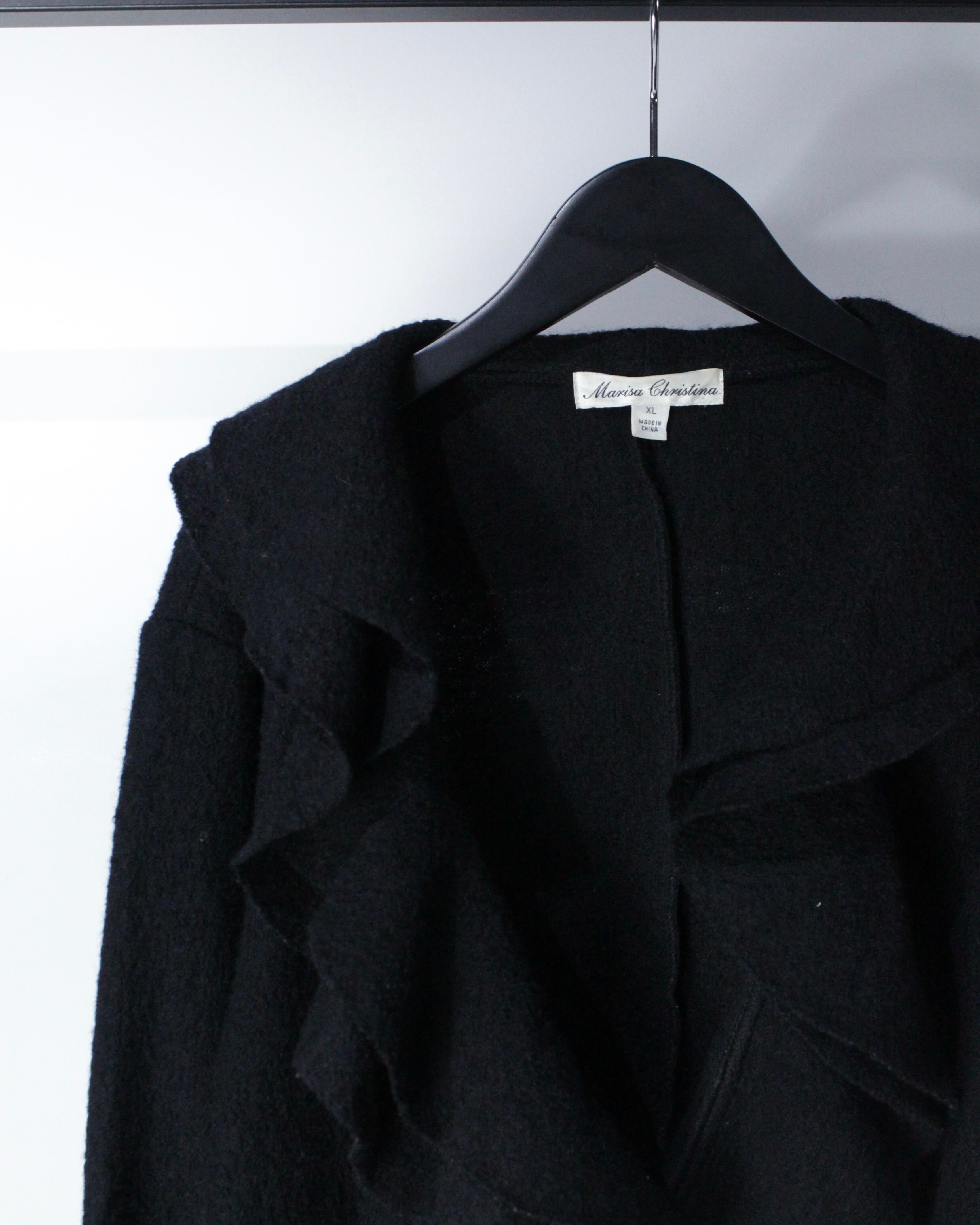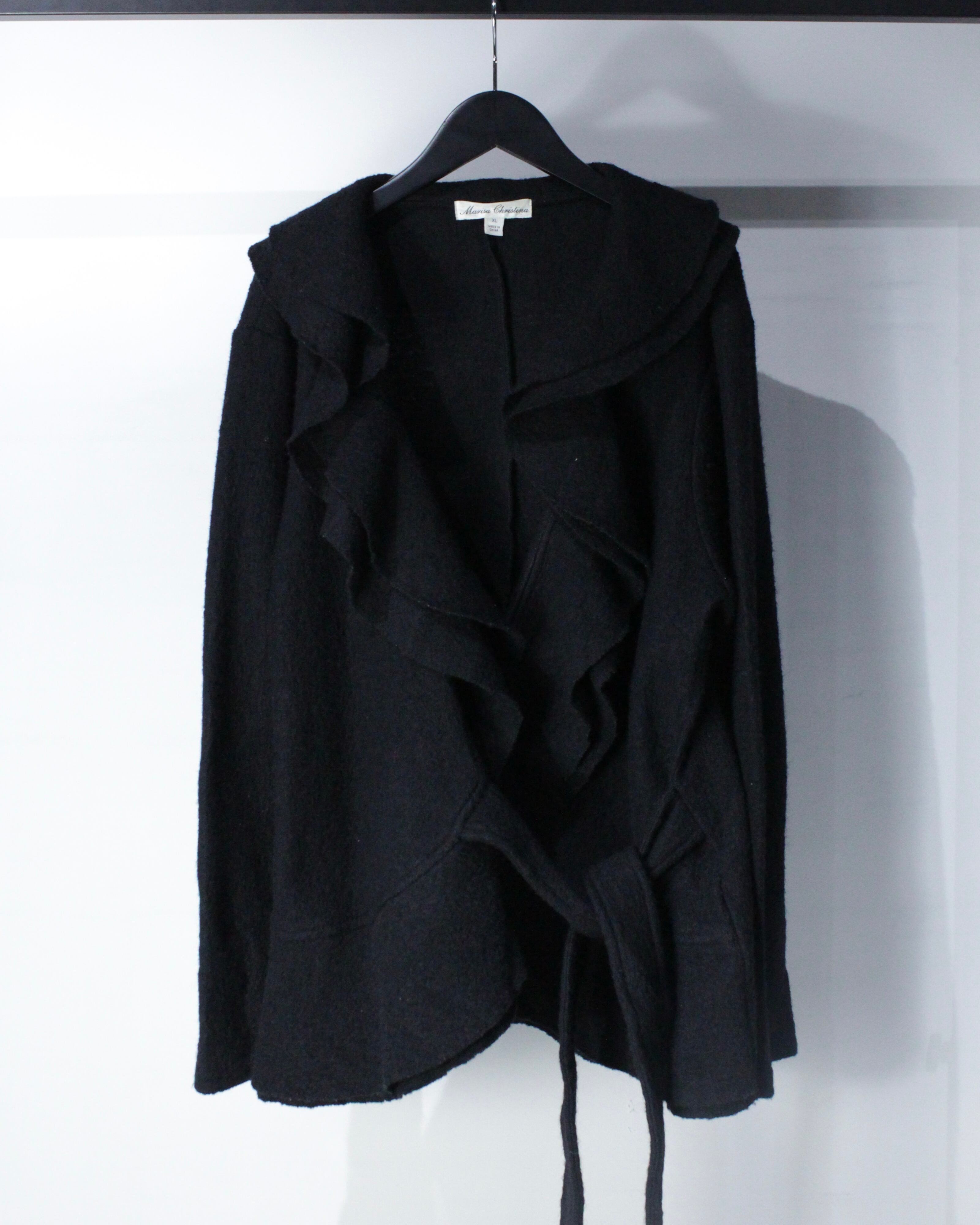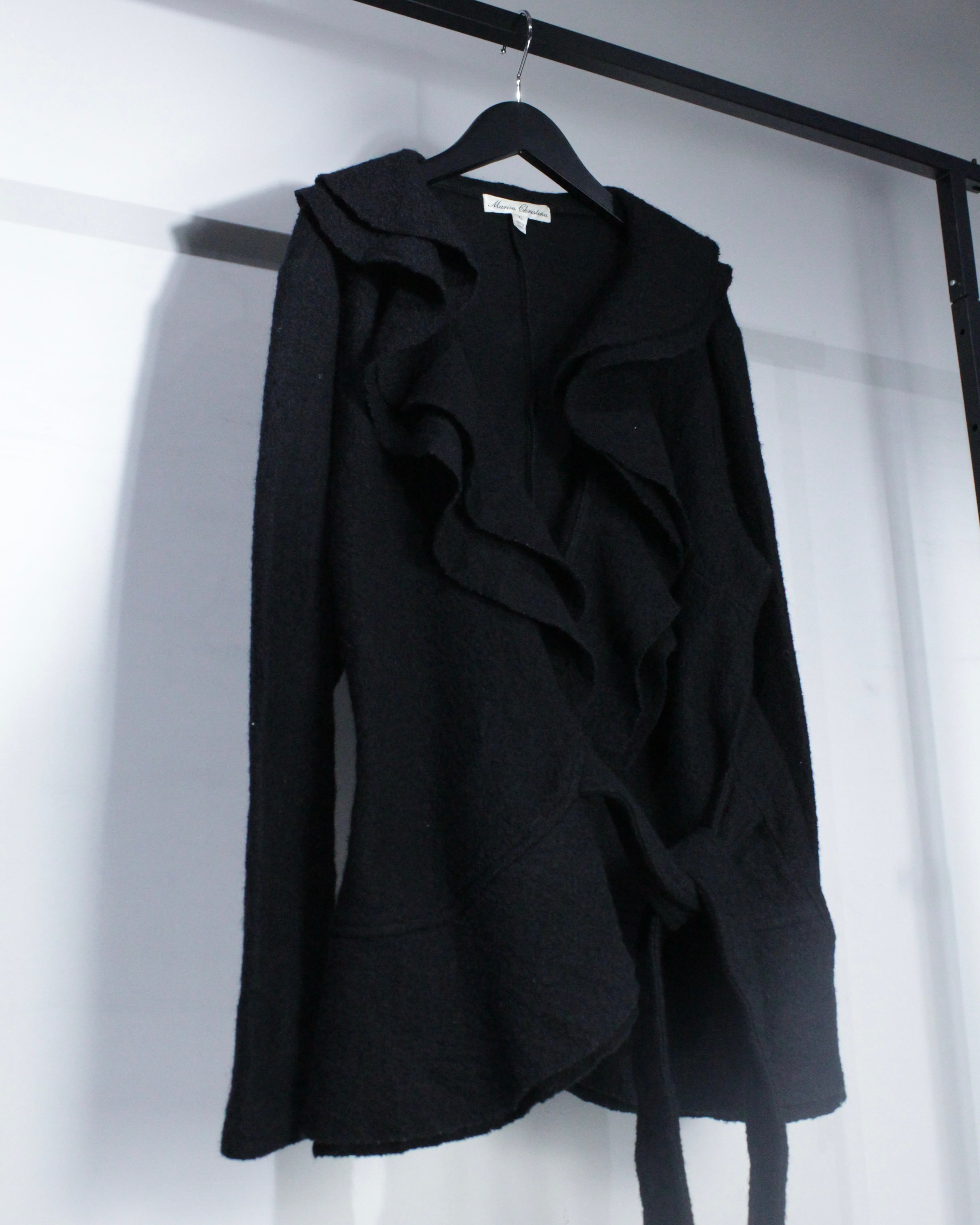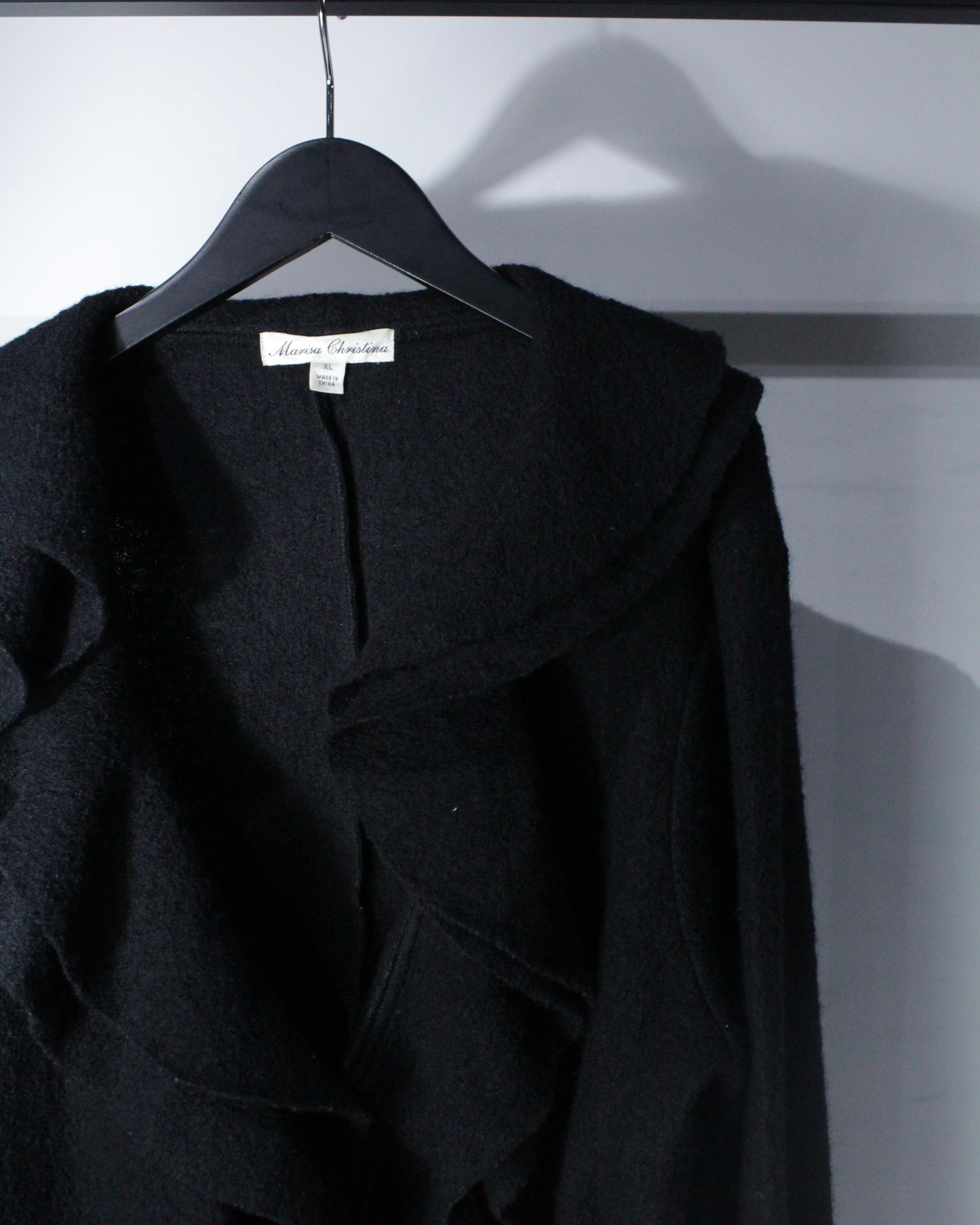 柔らかなウールを贅沢に使用した、フリル×ドレープが美しいブラックウールガウンジャケット。