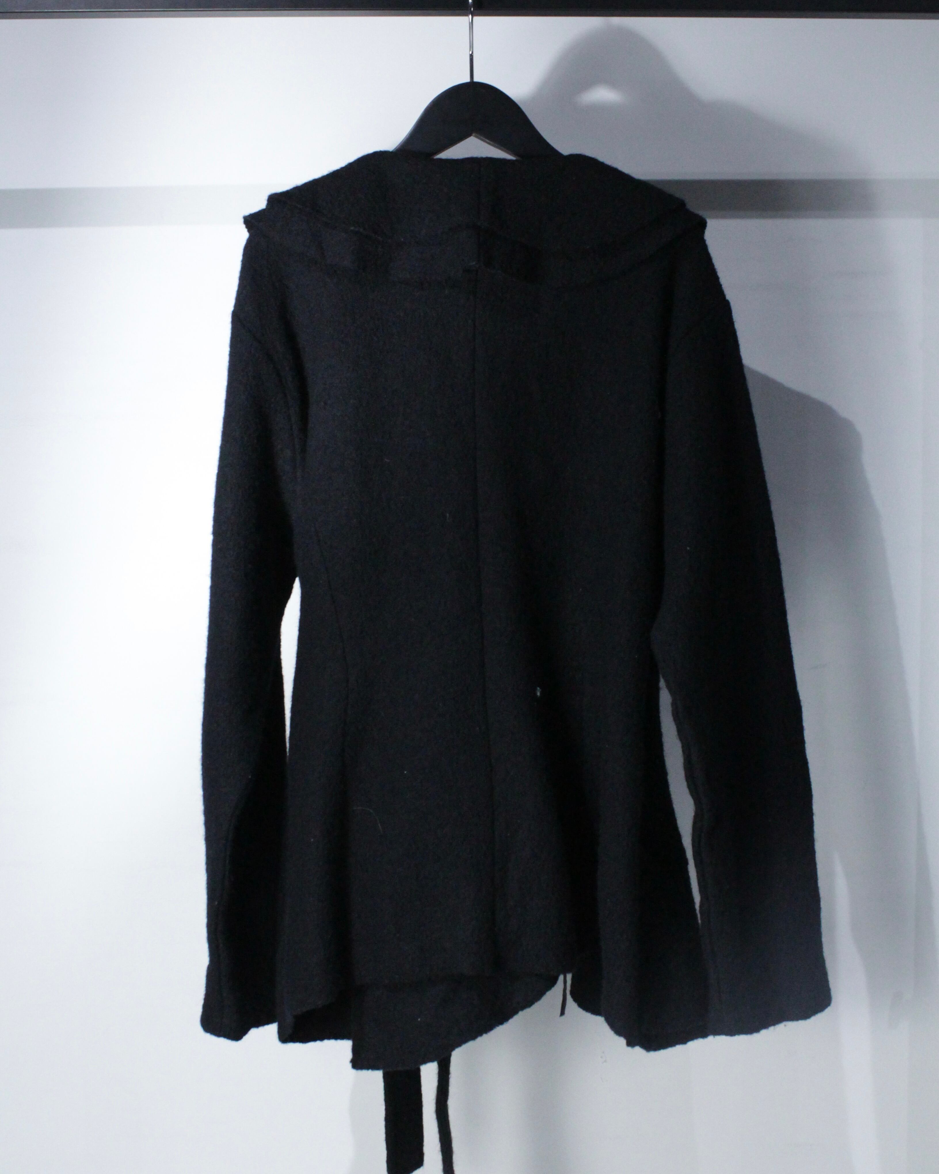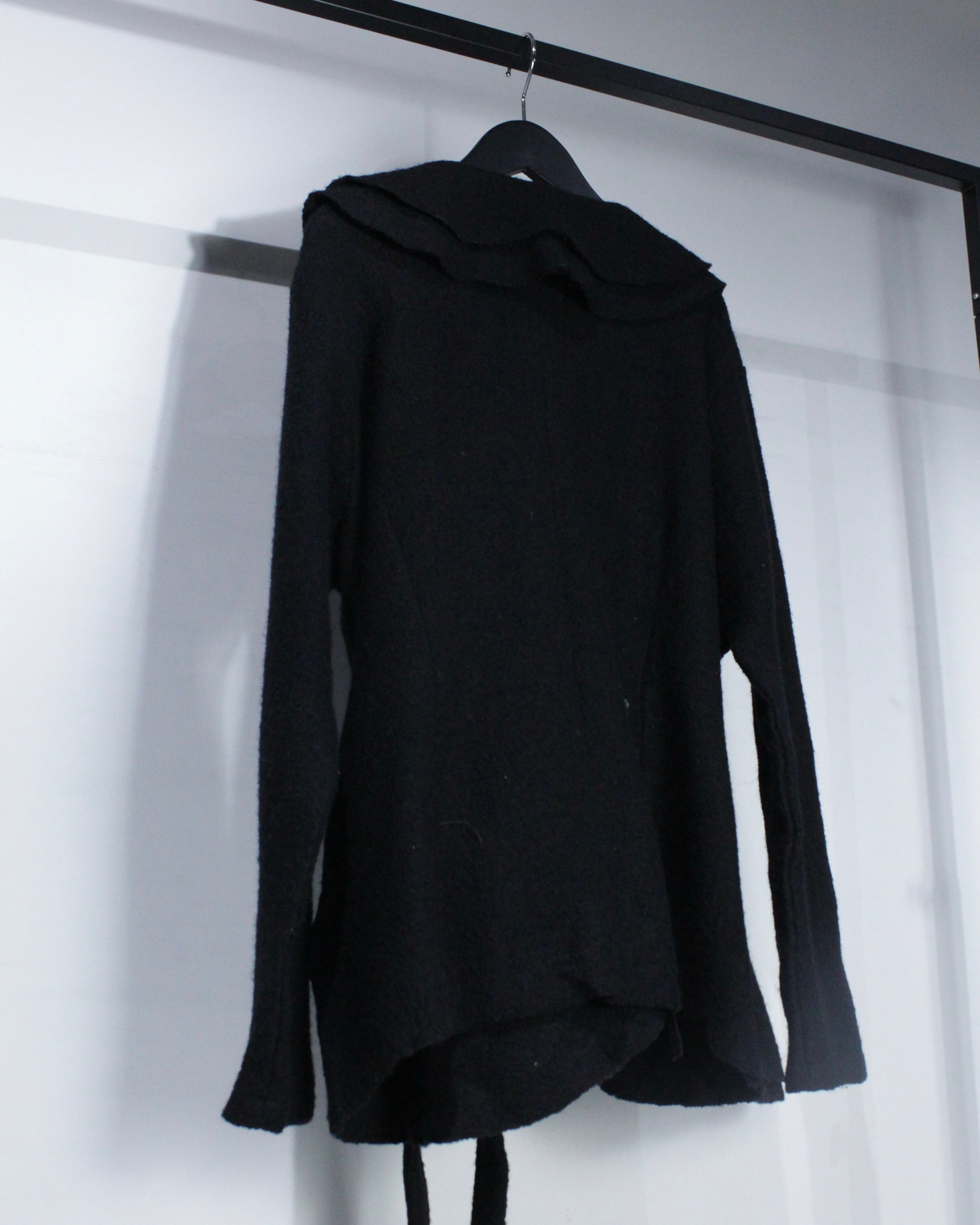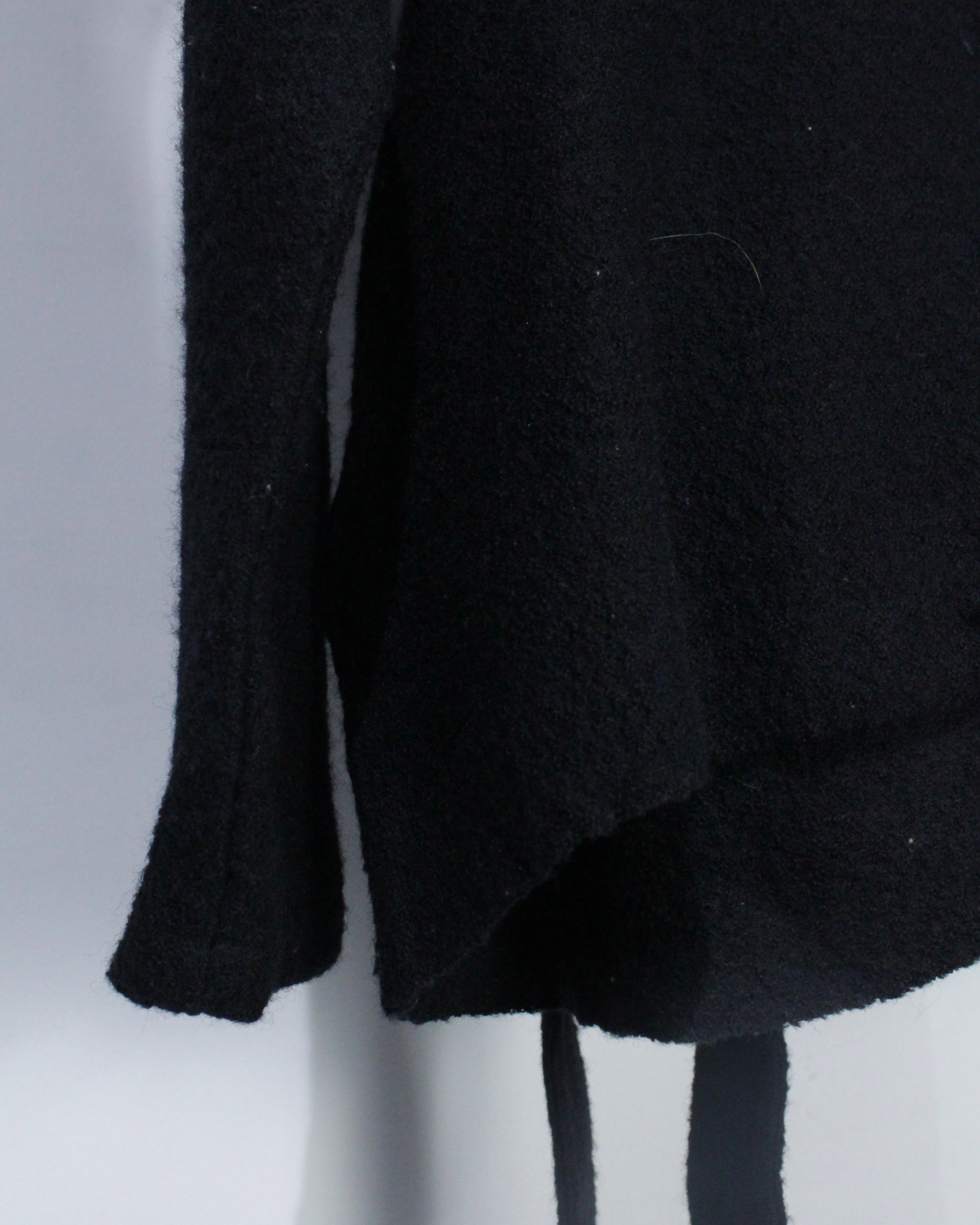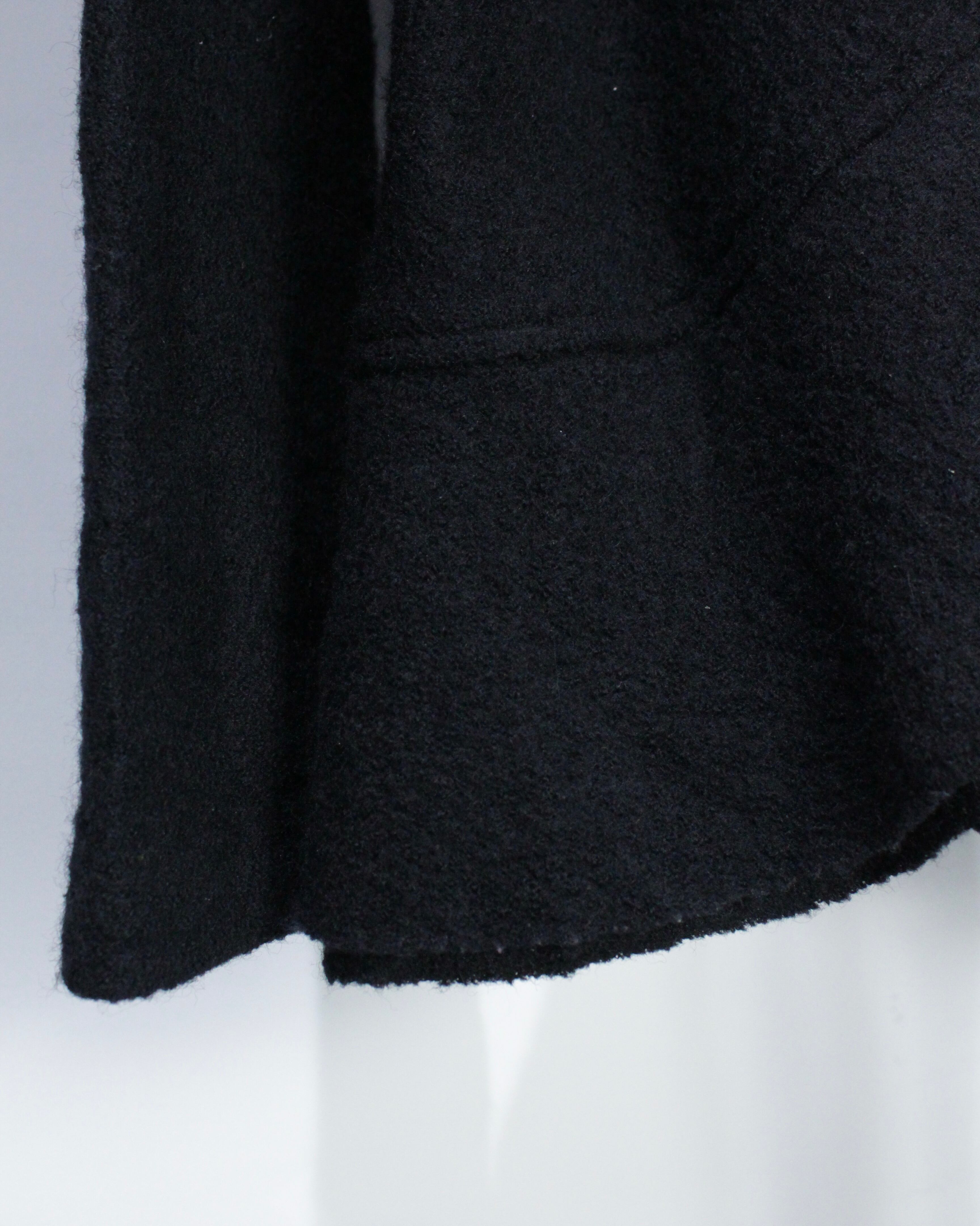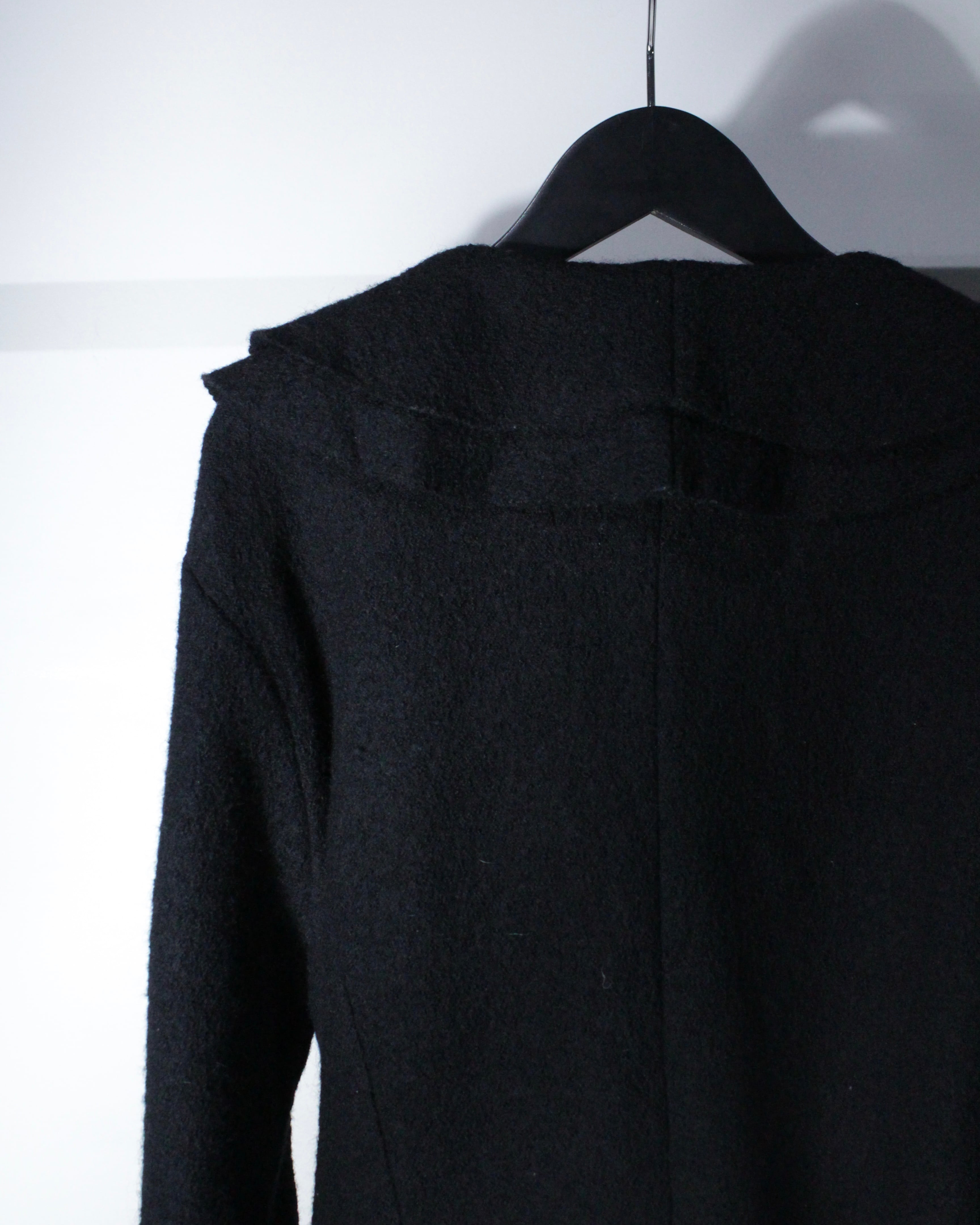 柔らかなウールを贅沢に使用した、フリル×ドレープが美しいブラックウールガウンジャケット。