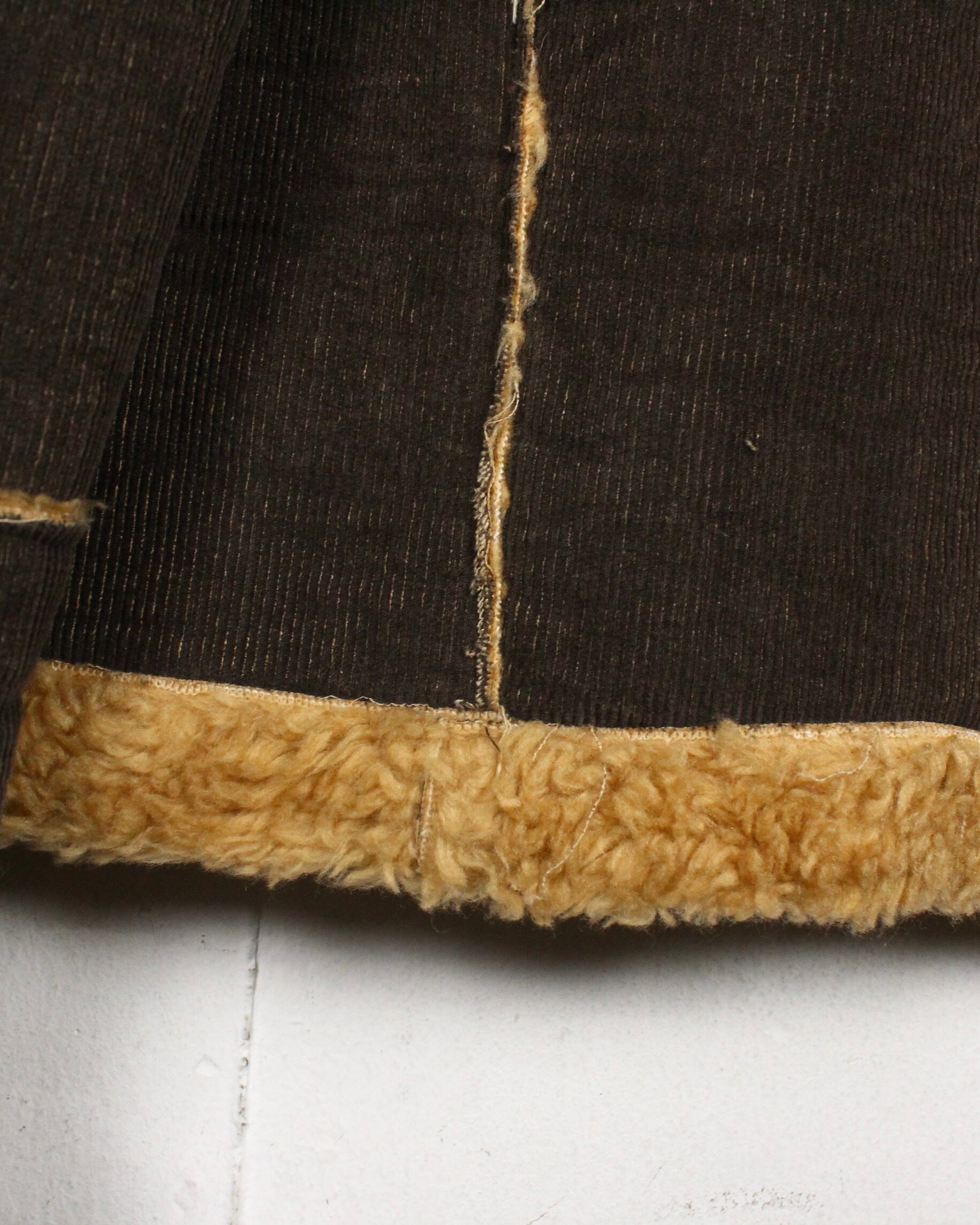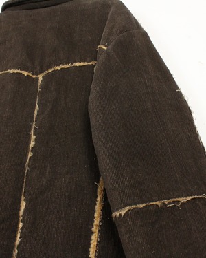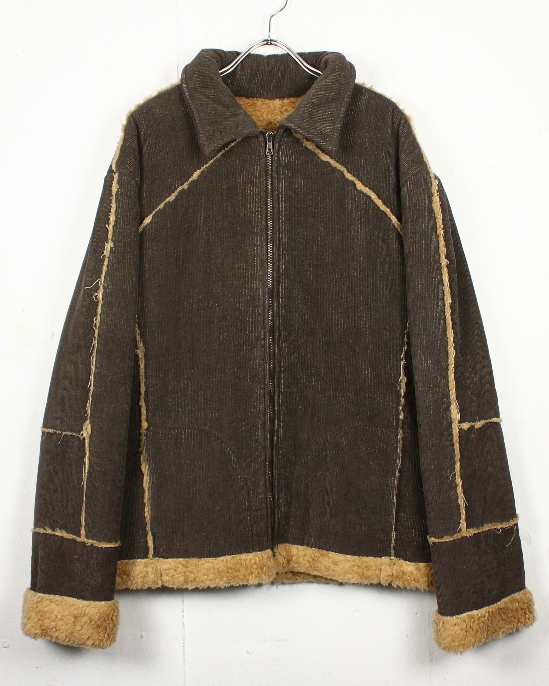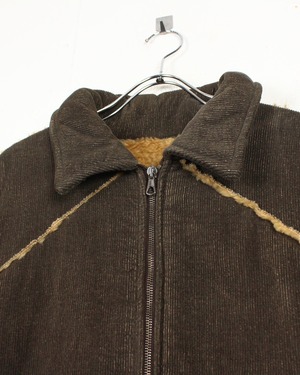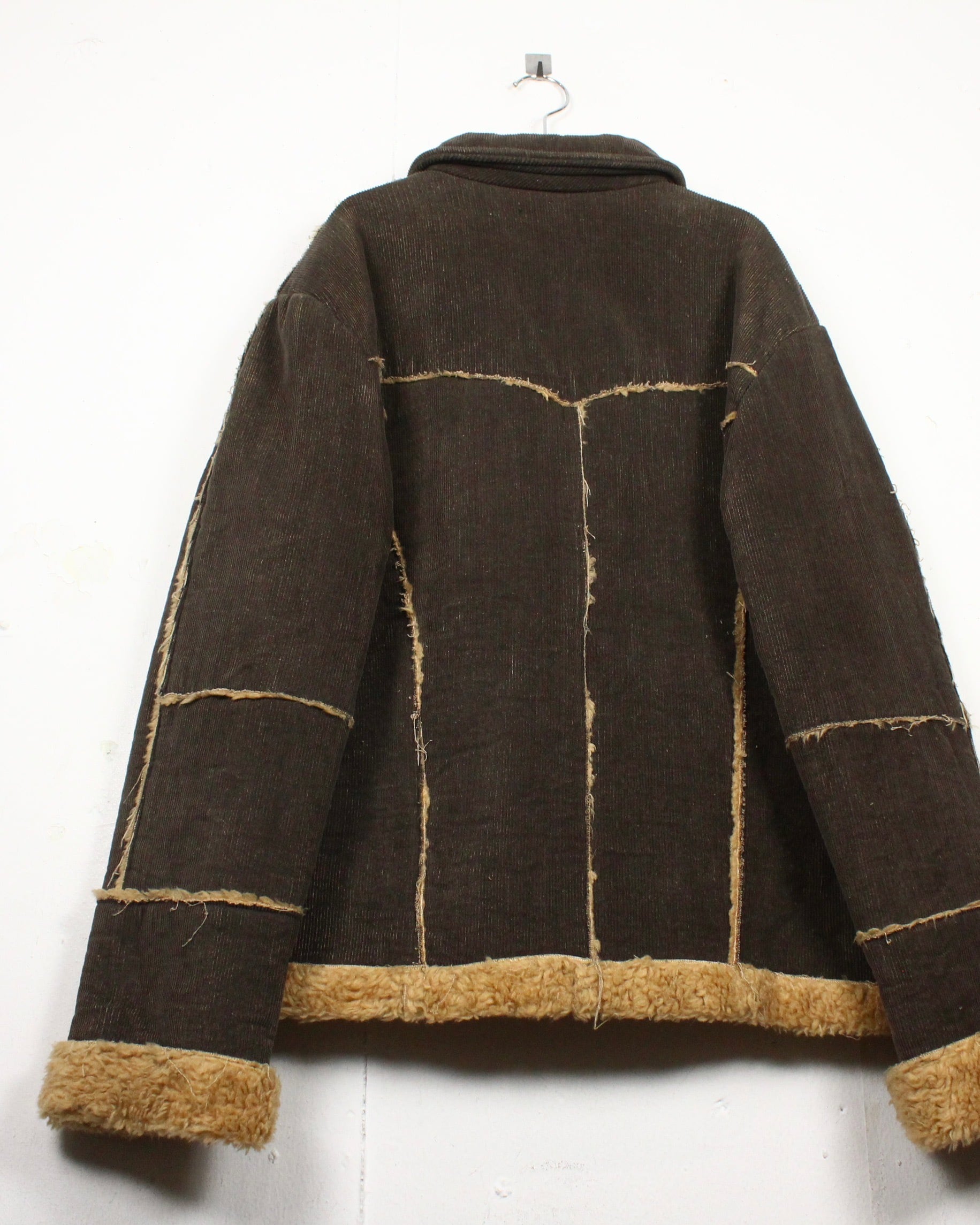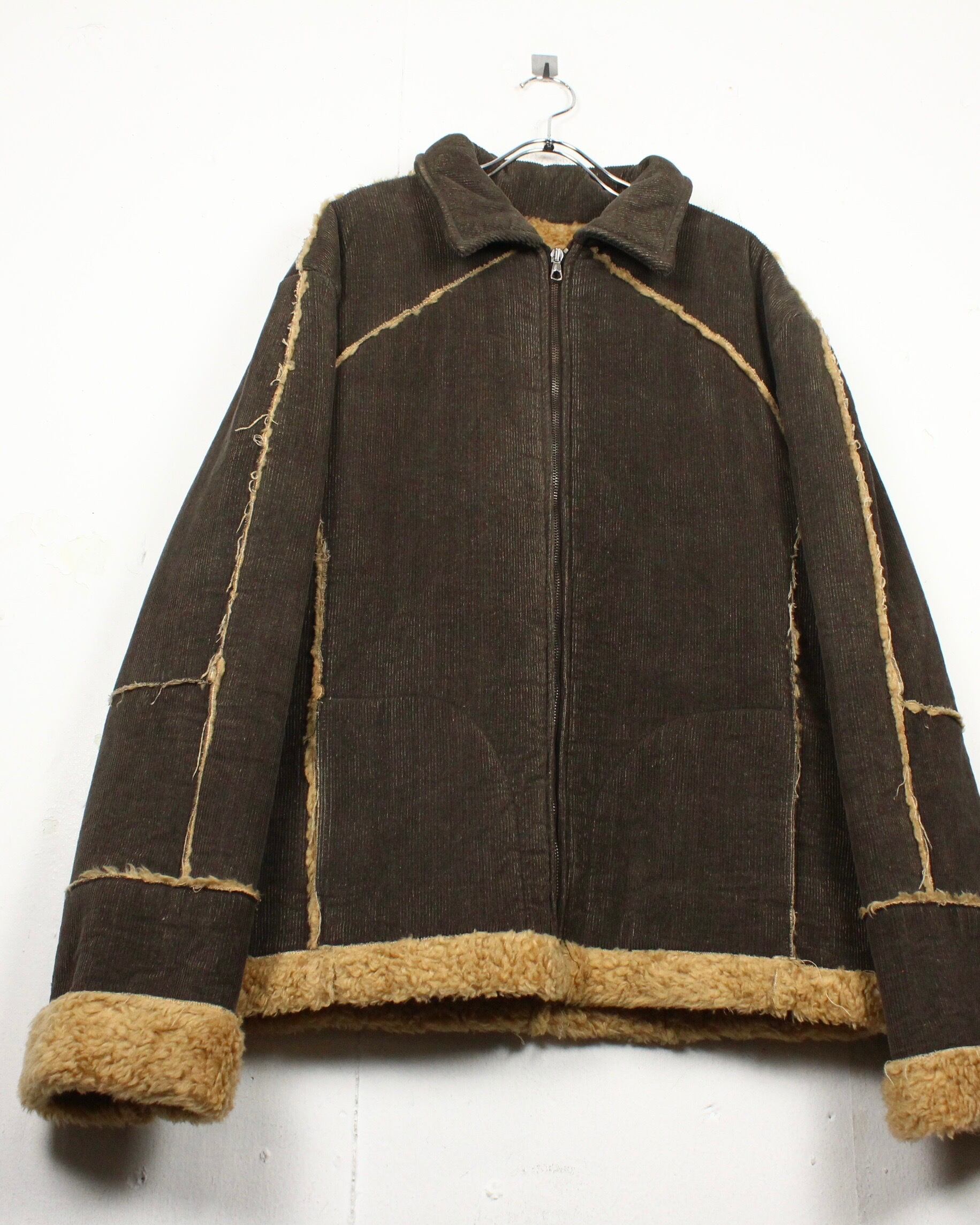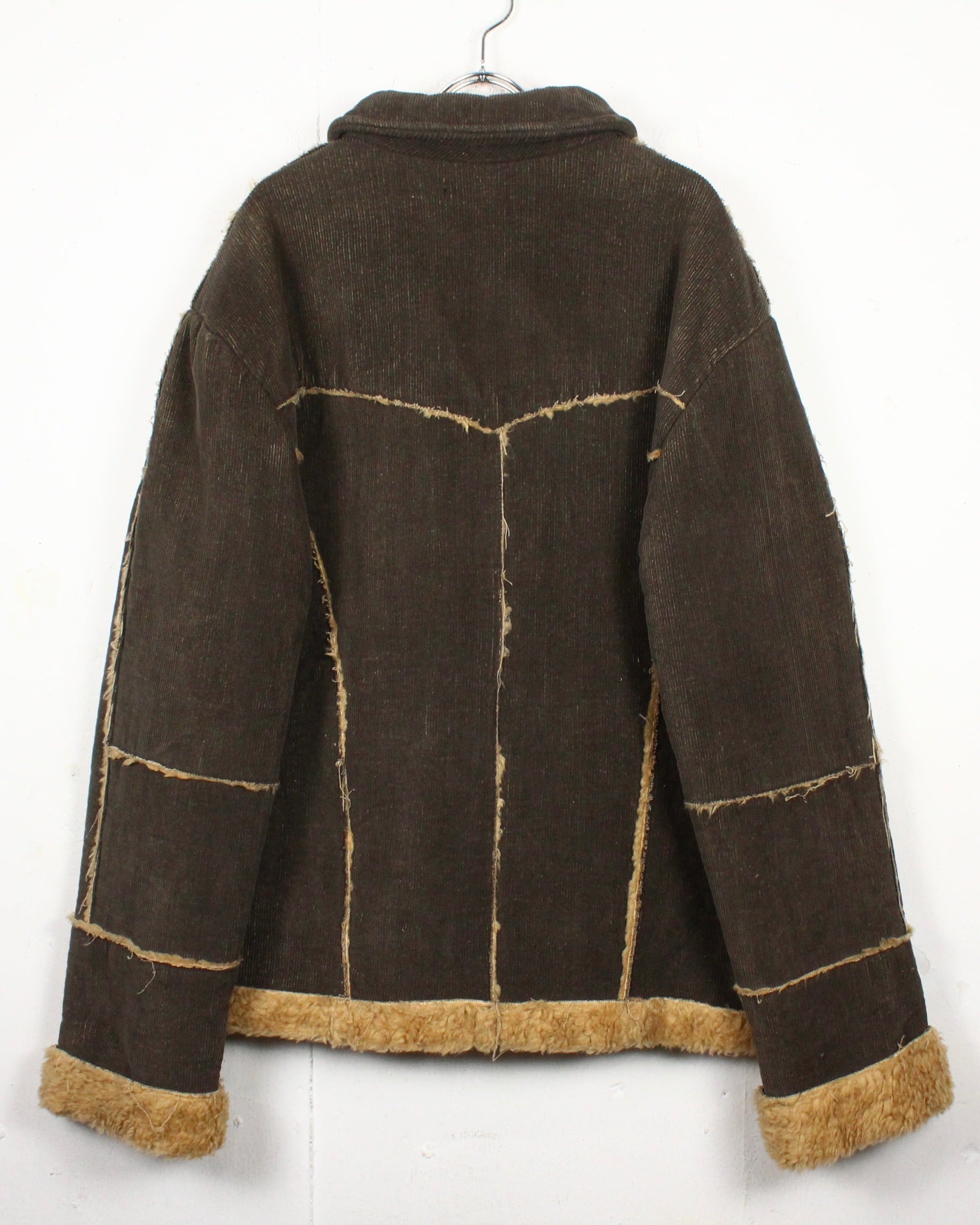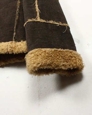 深いブラウンのコーデュロイボディに、断ち切り仕様でボアを覗かせた大胆な切り替えが映える1着。
